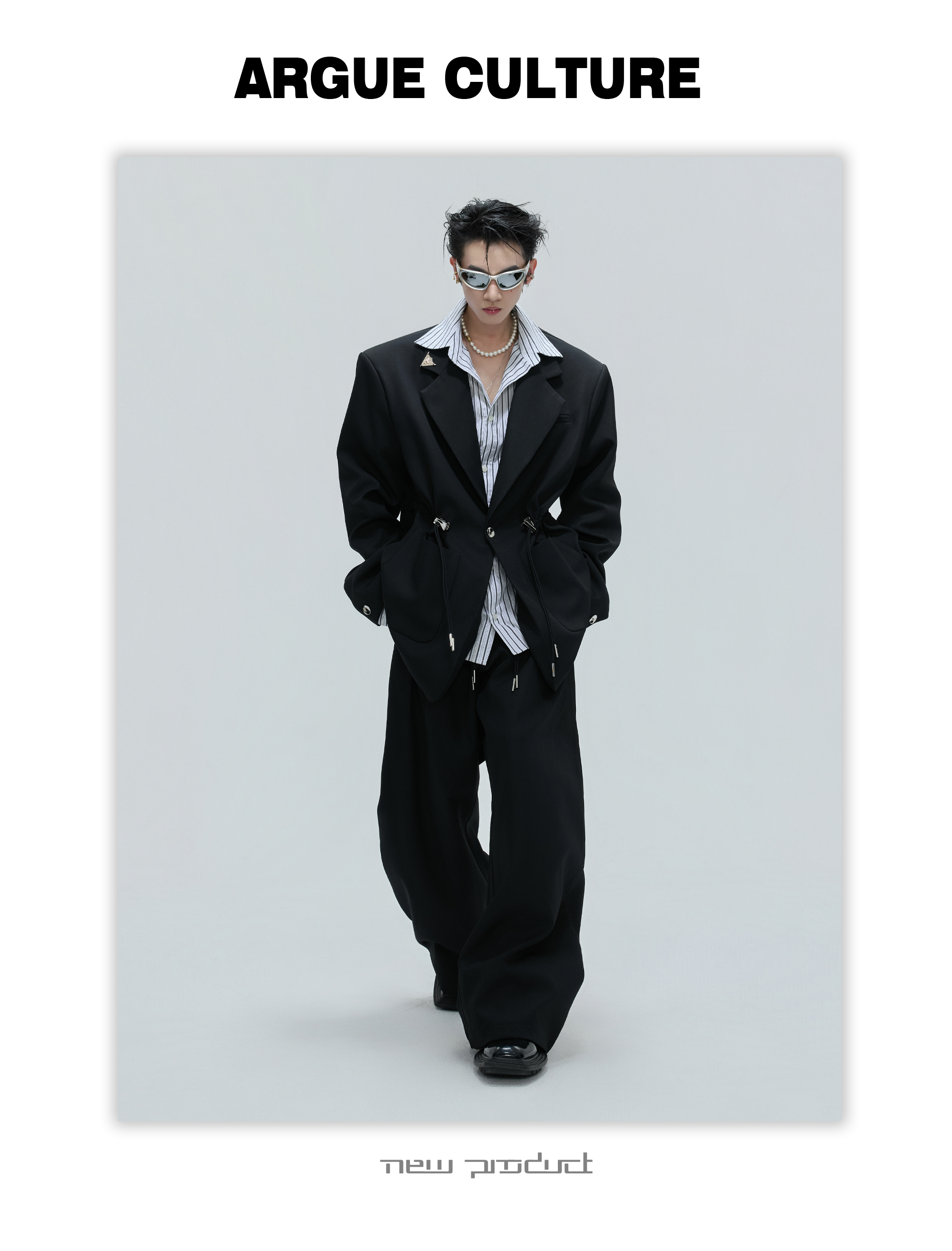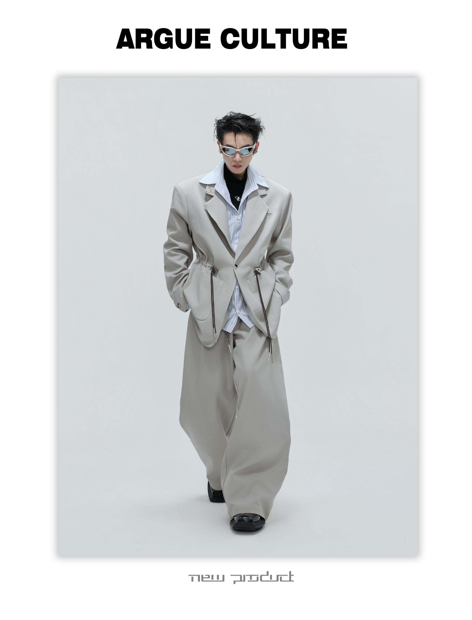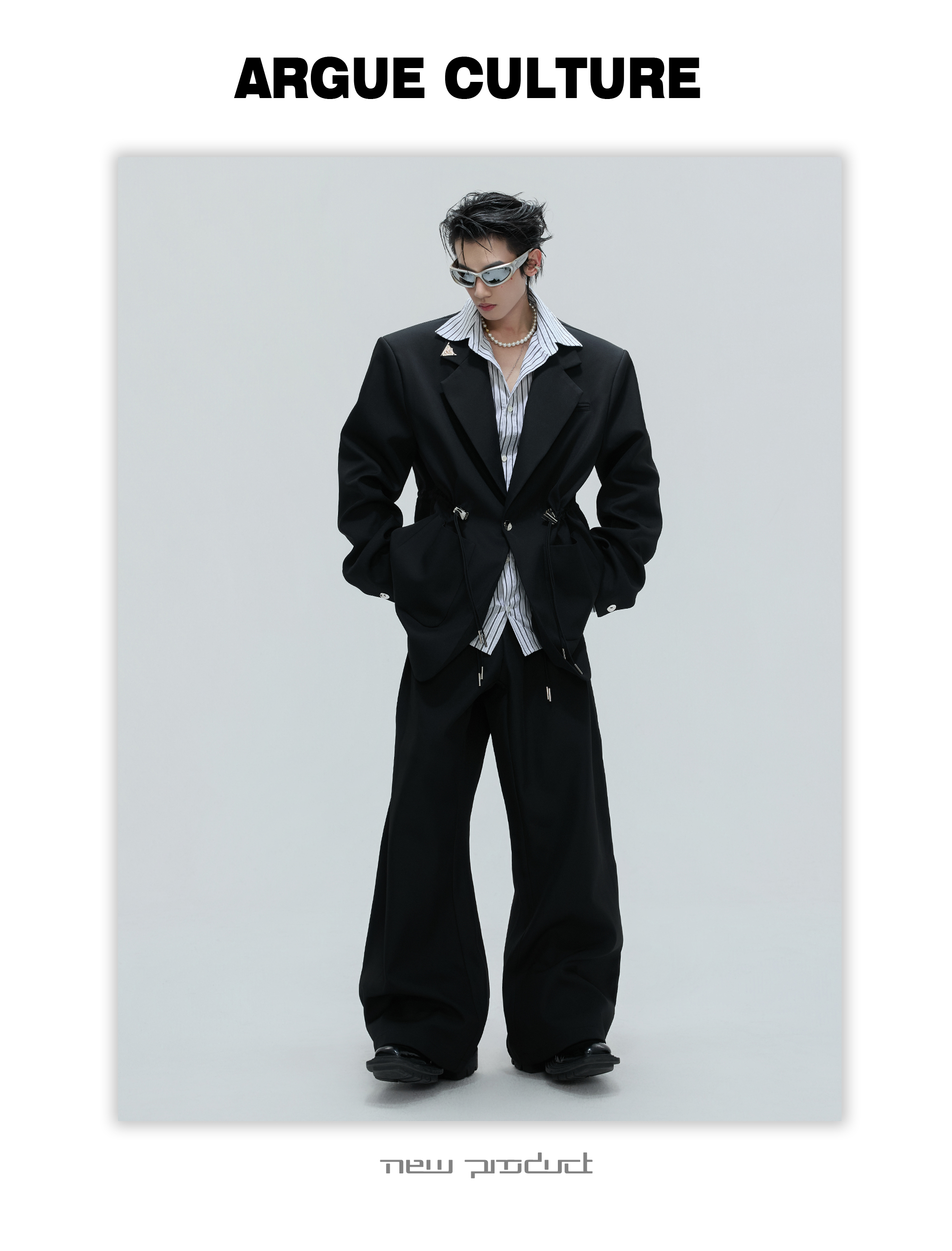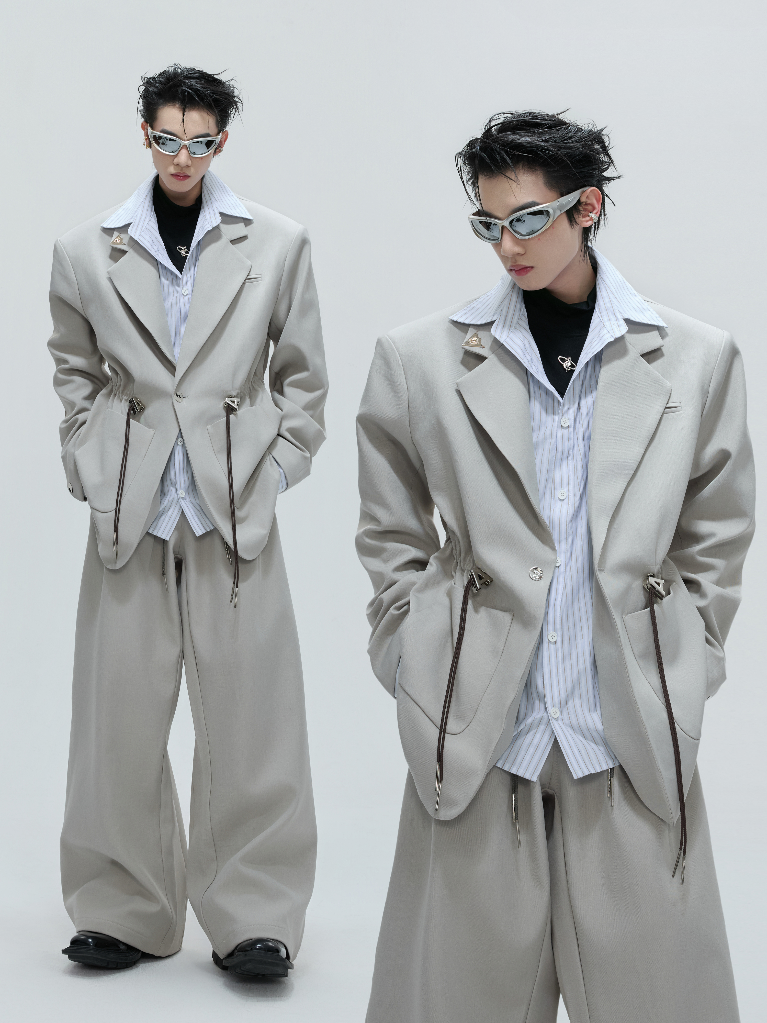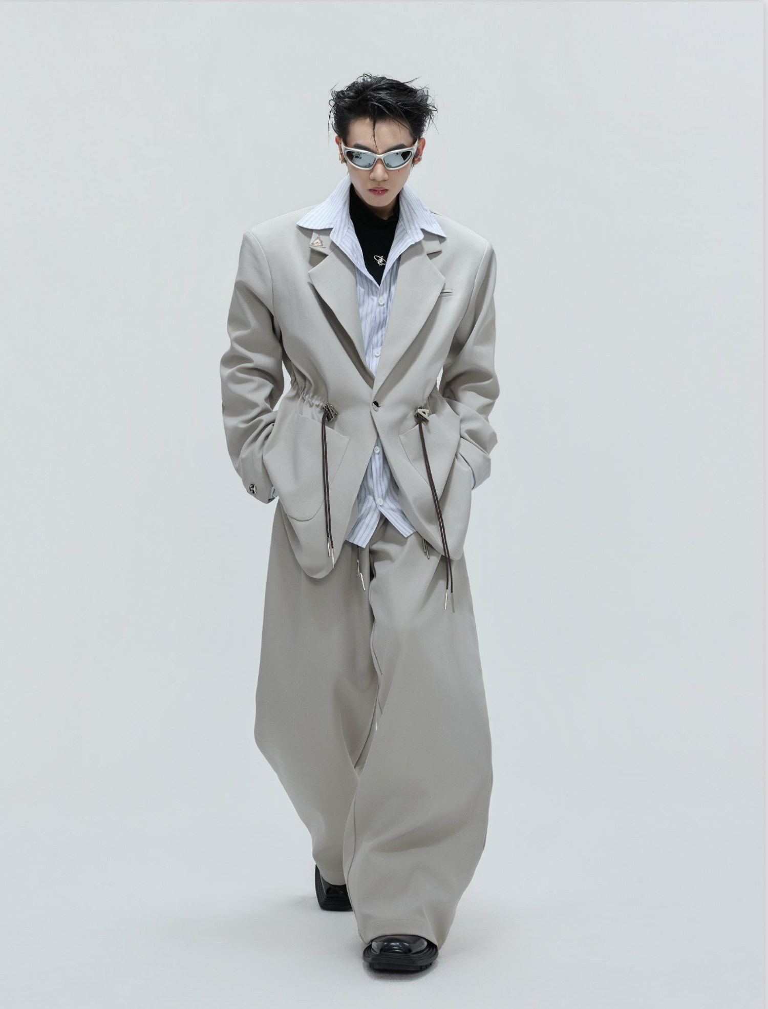 Stripe Shirt Fake Layered Drawstring Waist Shoulder-Pad Tailored Jacket & Trousers Setup WN21731