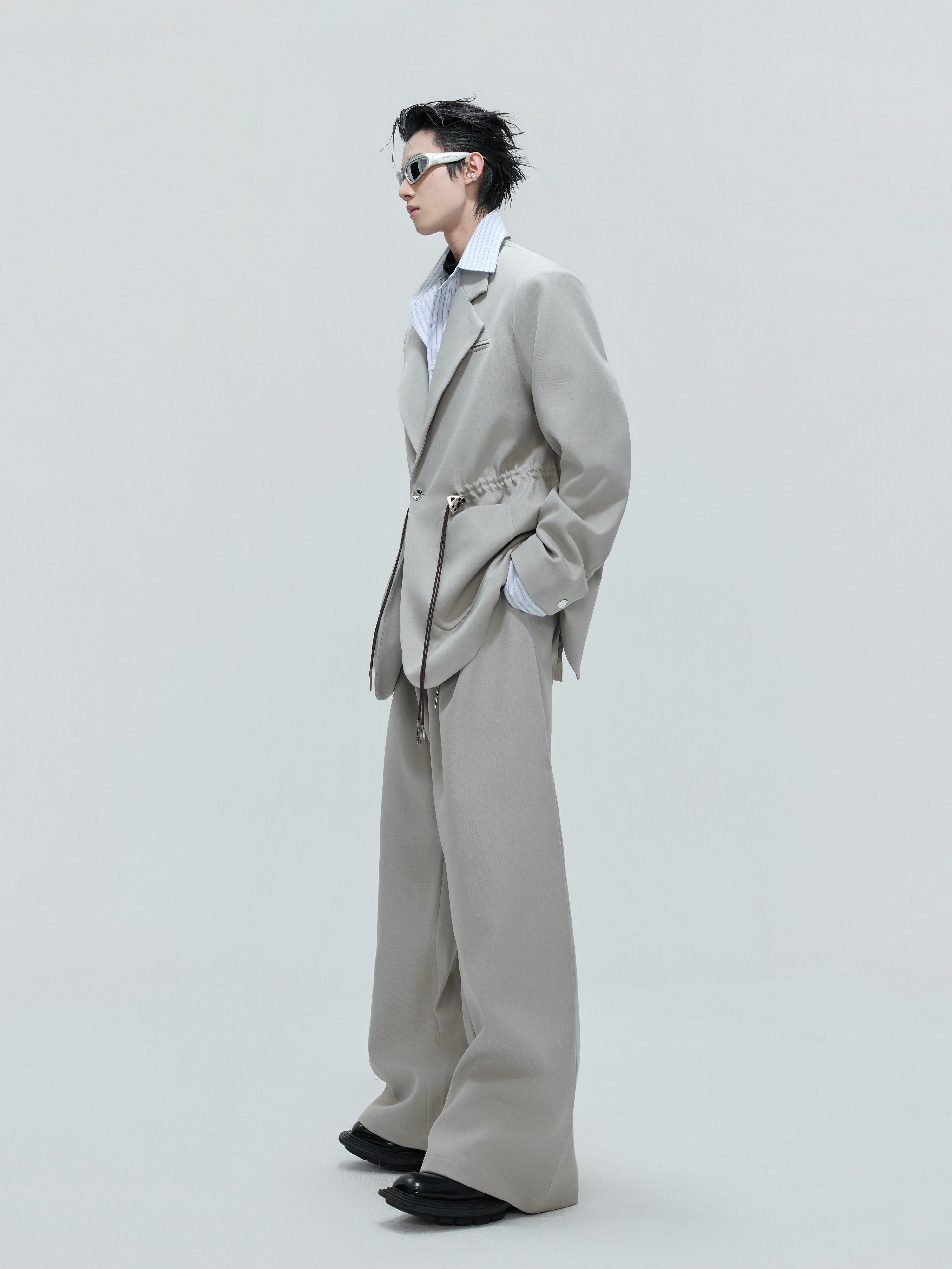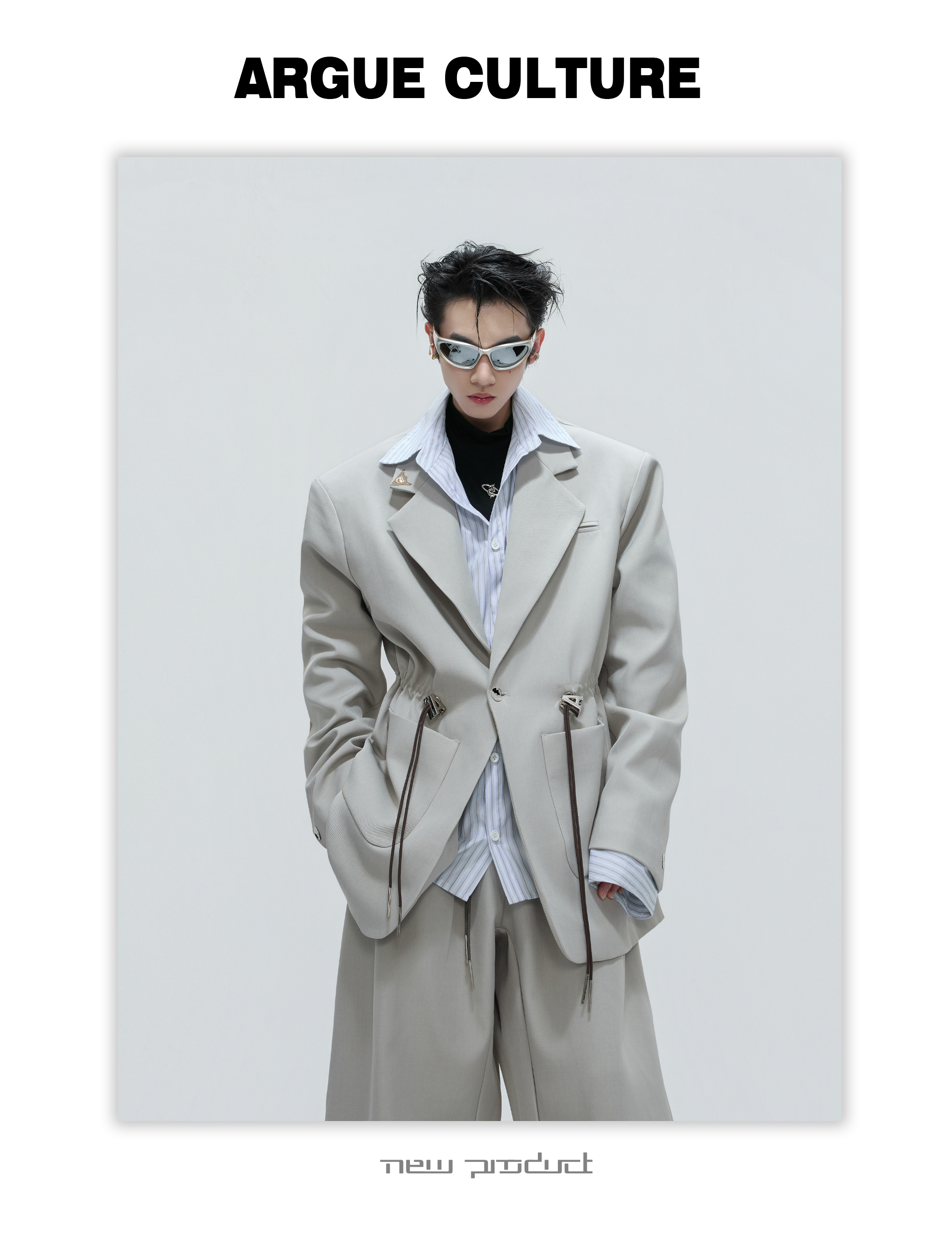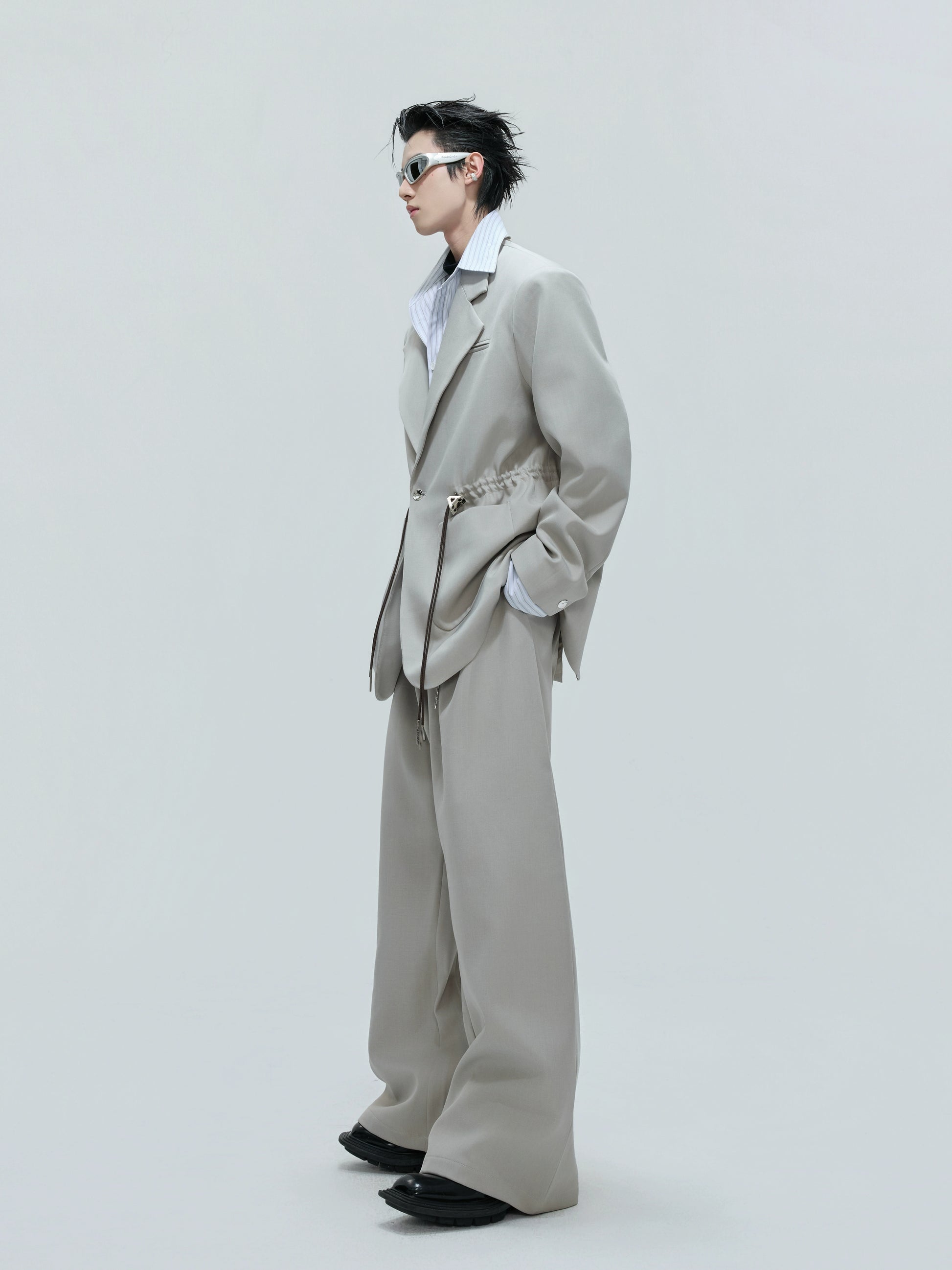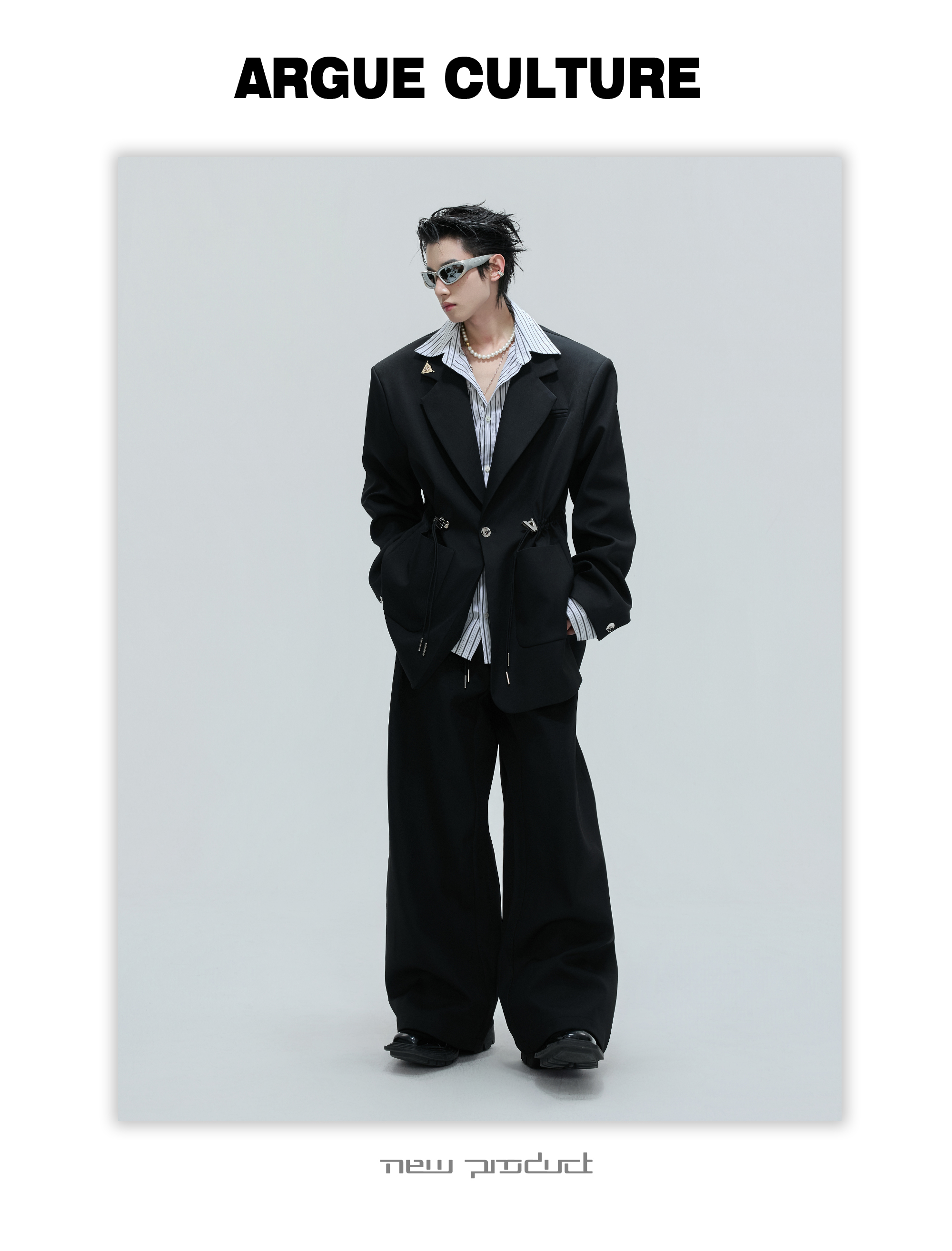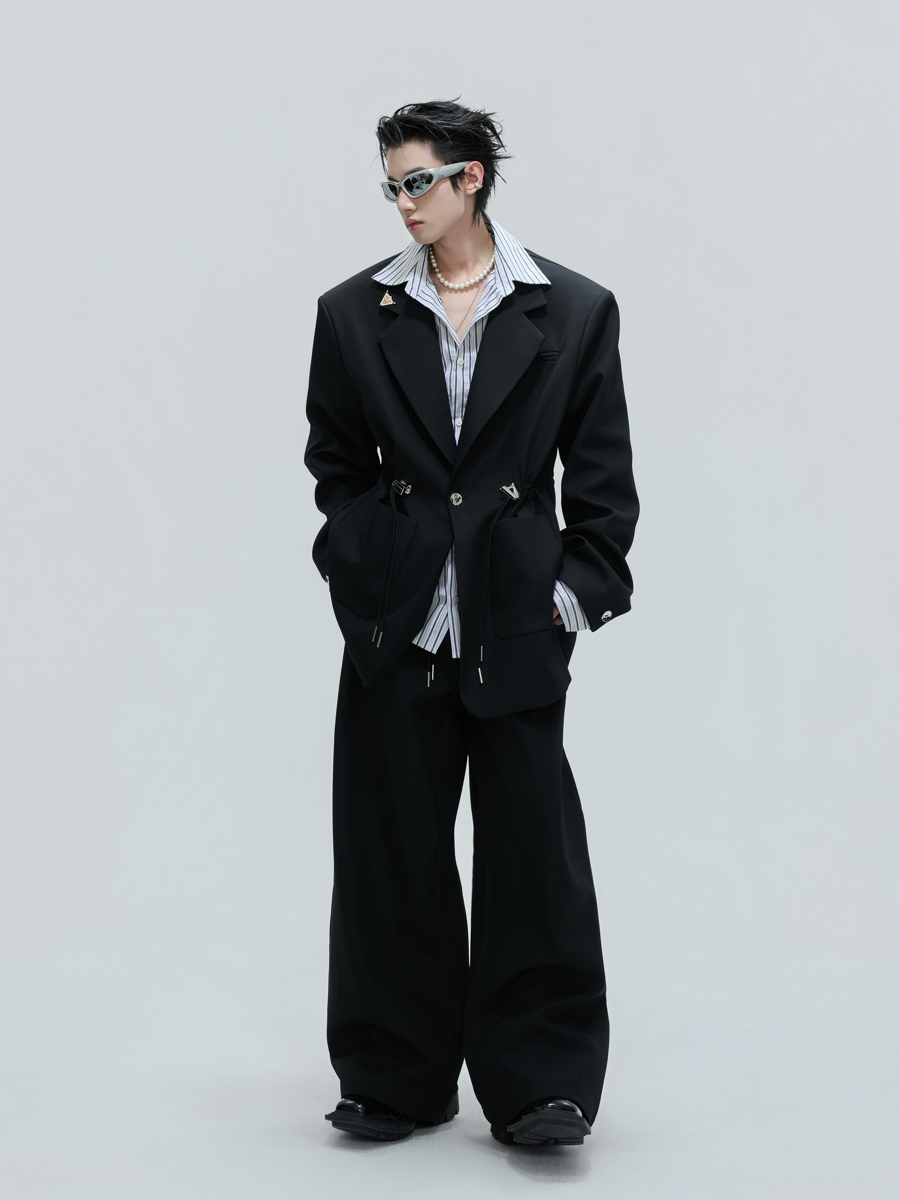 Stripe Shirt Fake Layered Drawstring Waist Shoulder-Pad Tailored Jacket & Trousers Setup WN21731