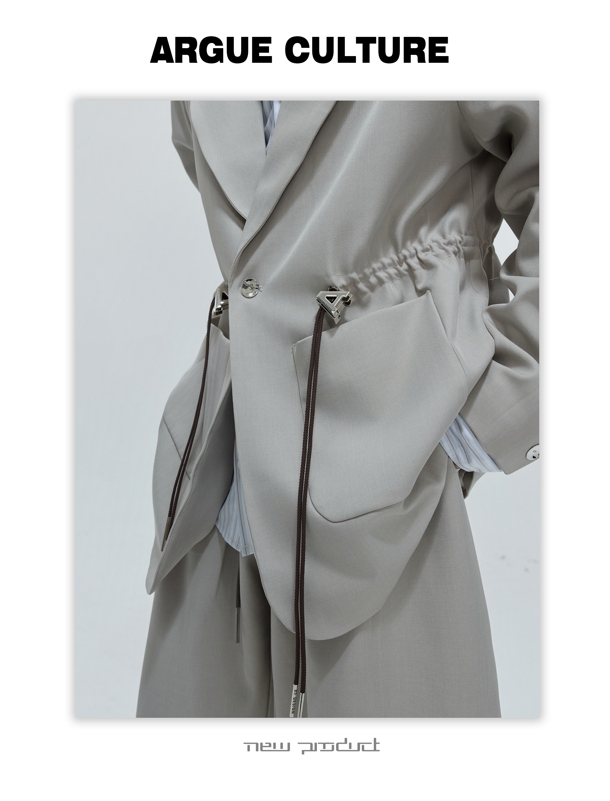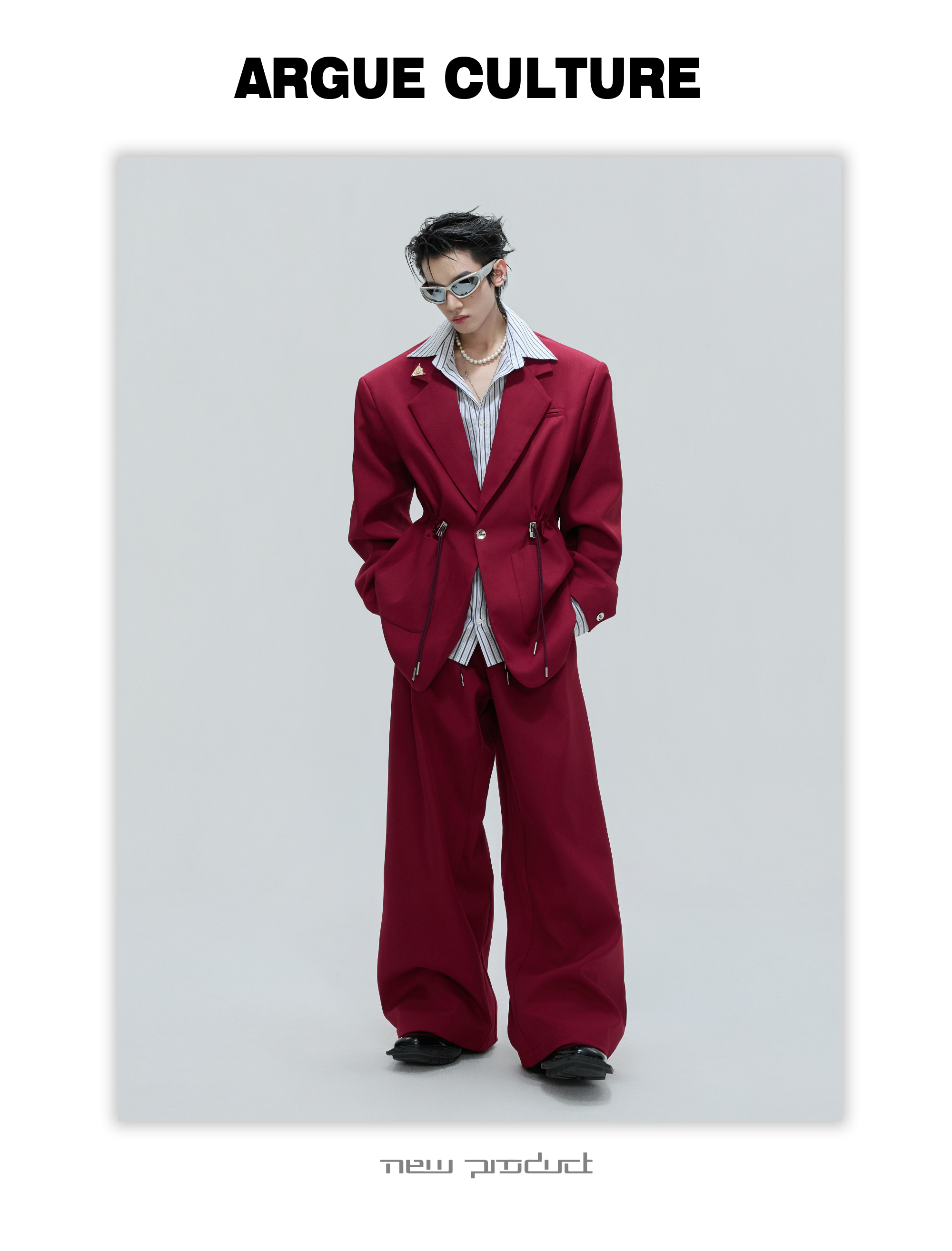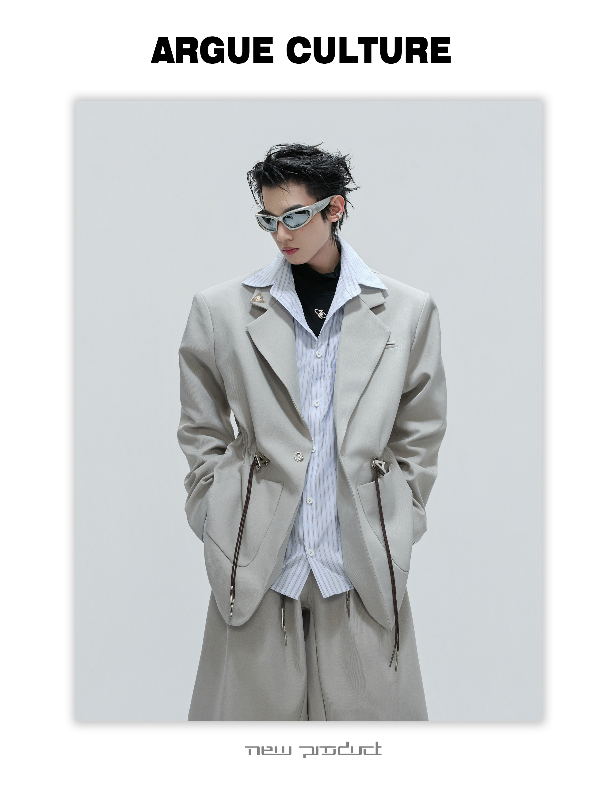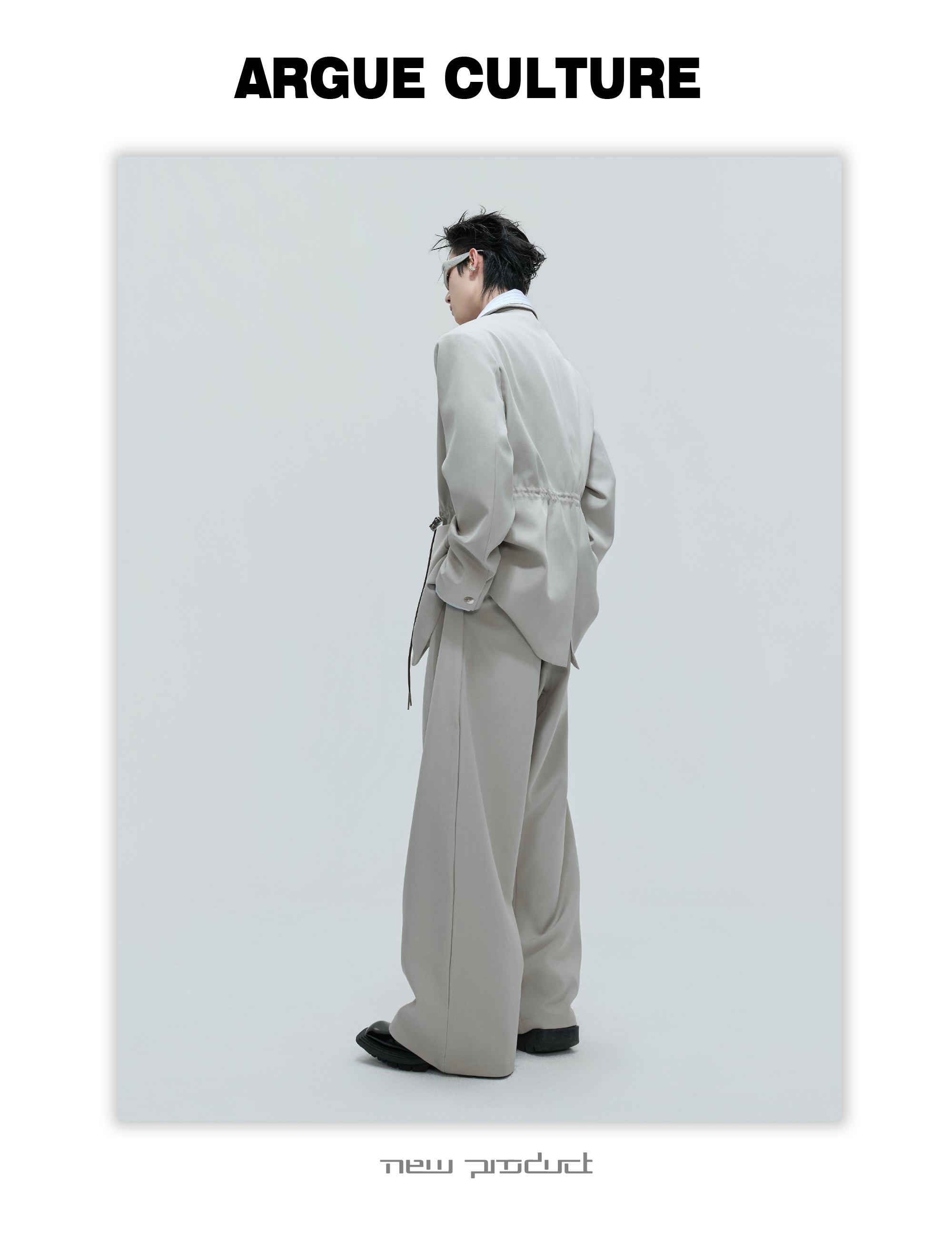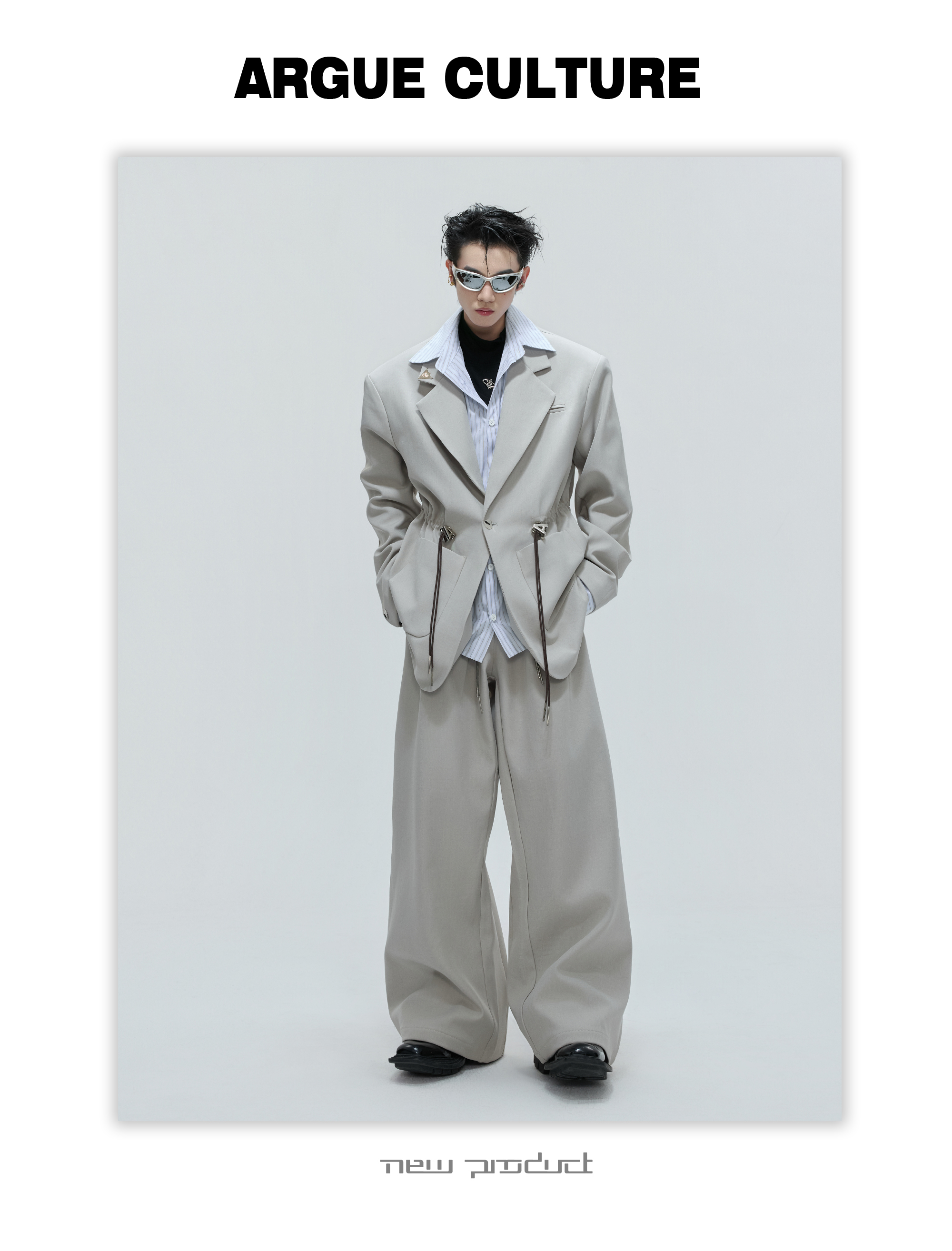 Stripe Shirt Fake Layered Drawstring Waist Shoulder-Pad Tailored Jacket & Trousers Setup WN21731