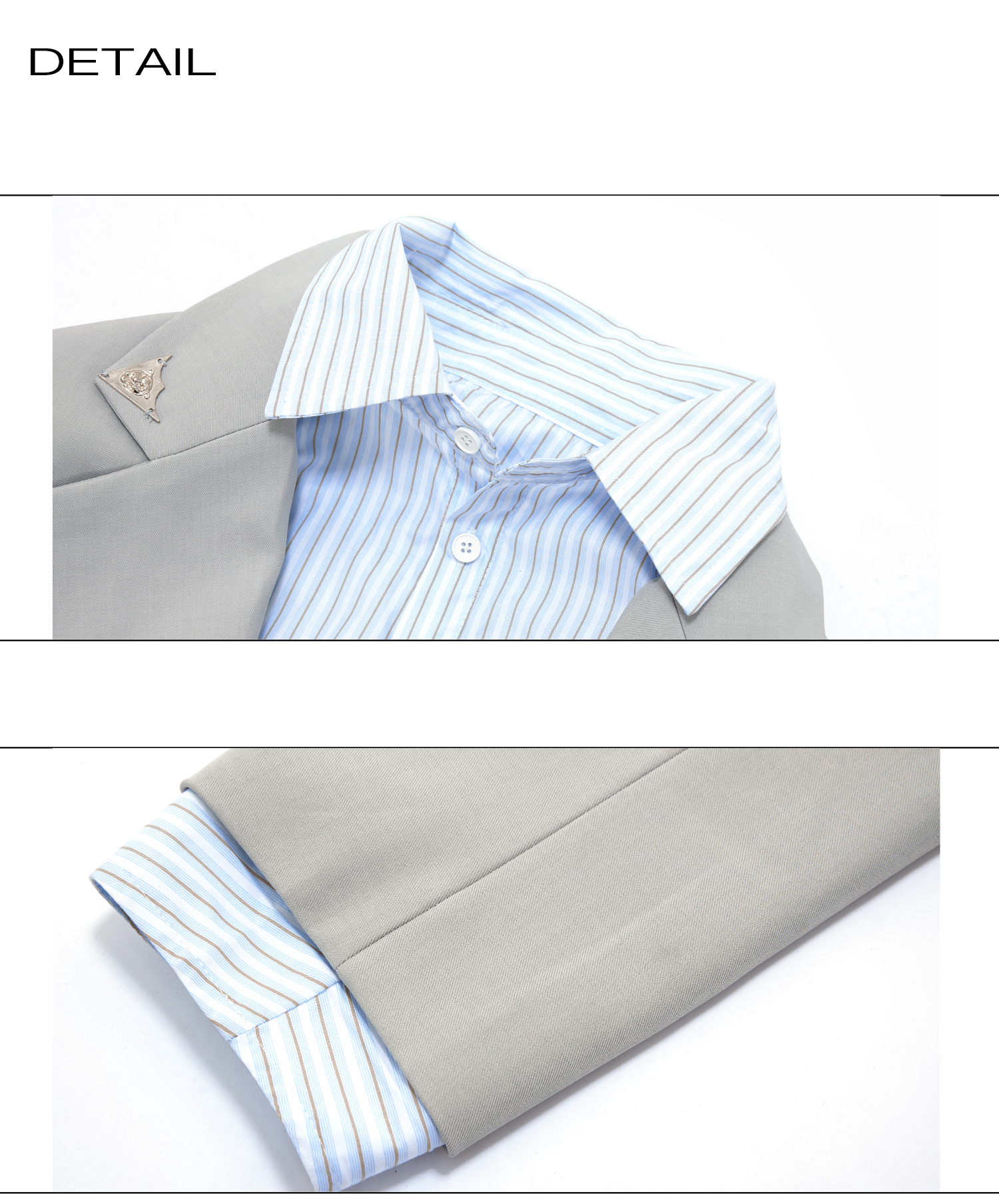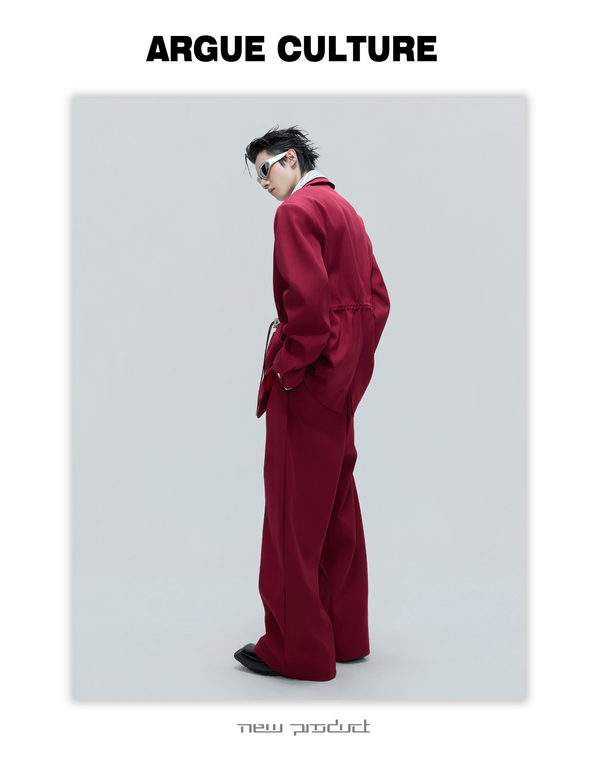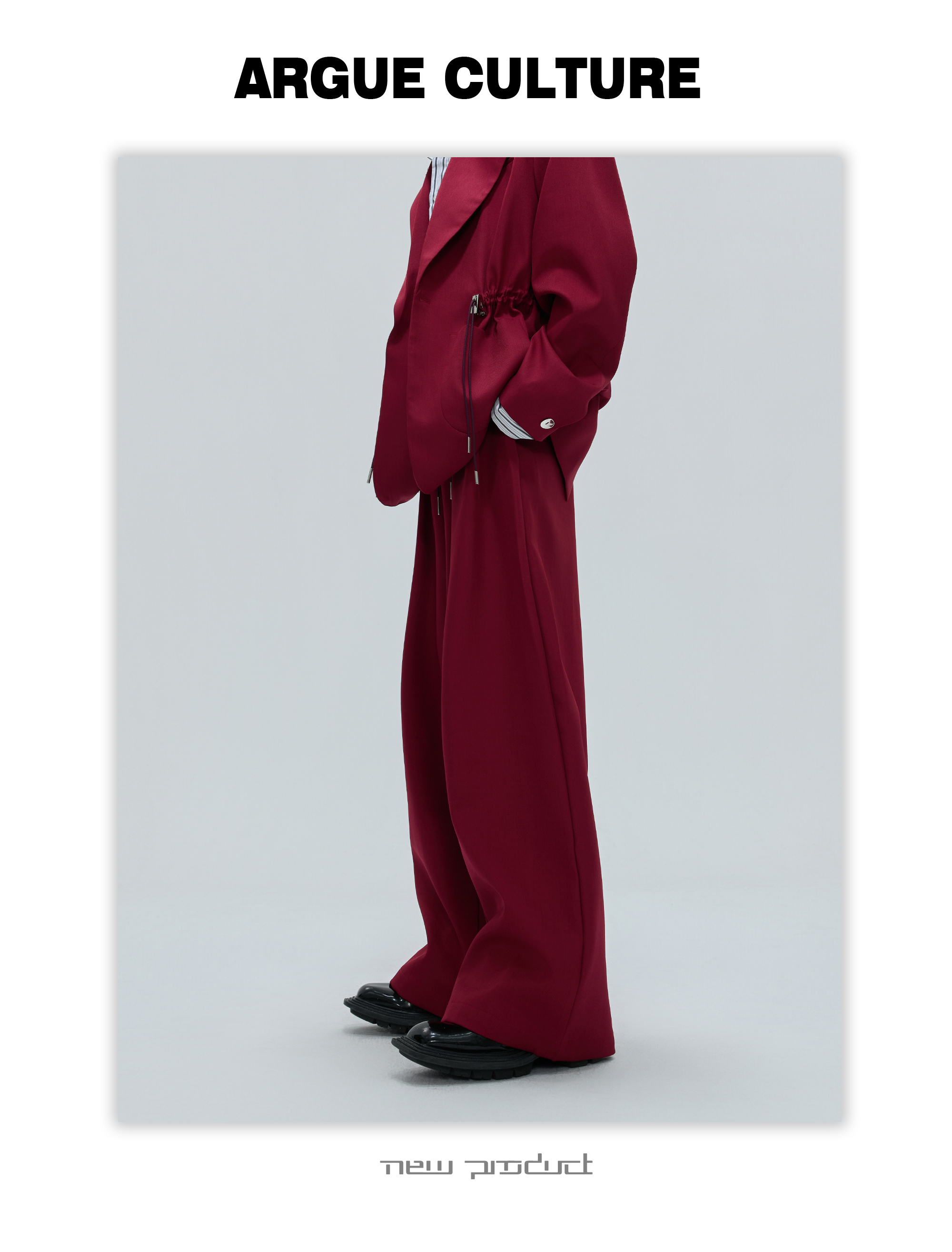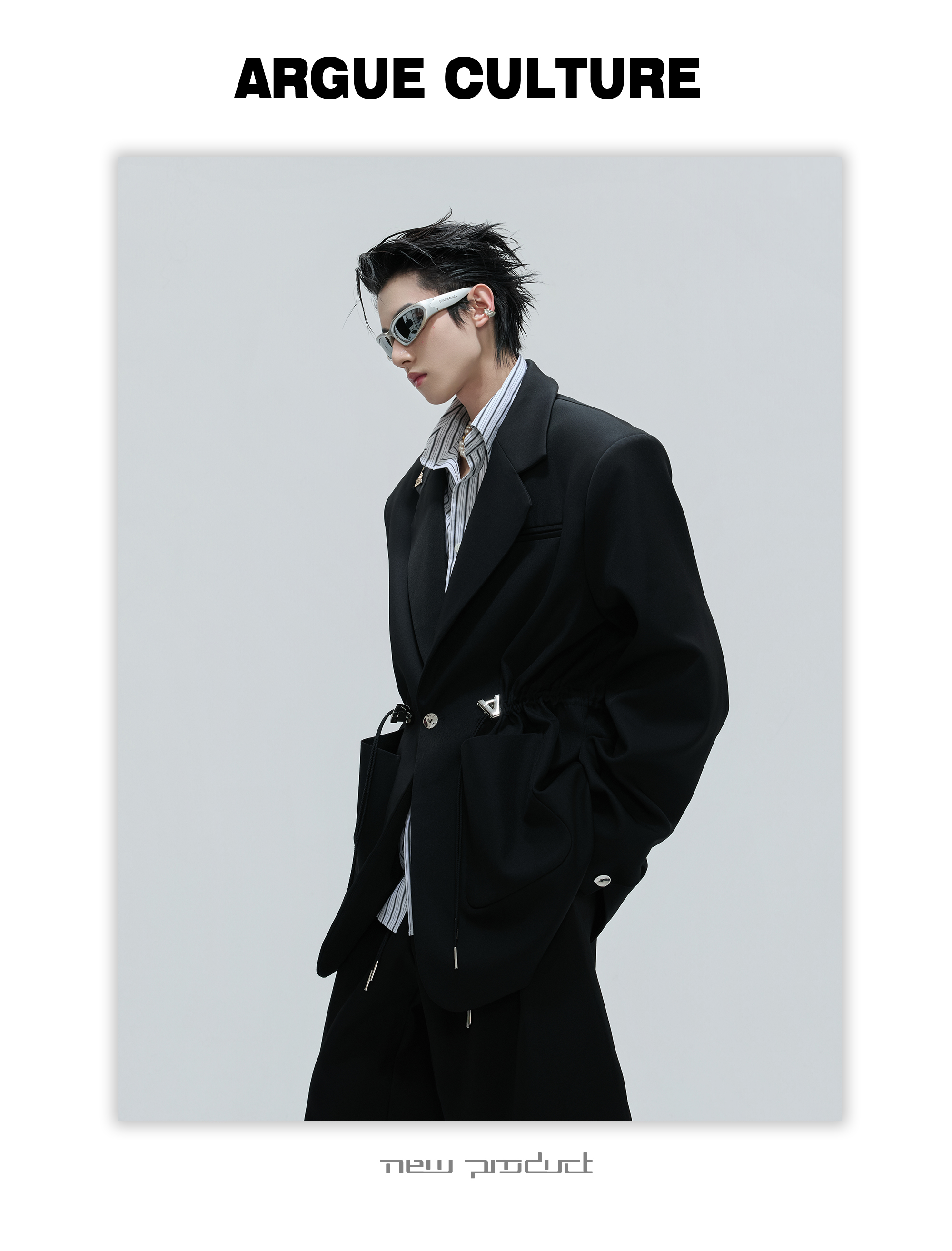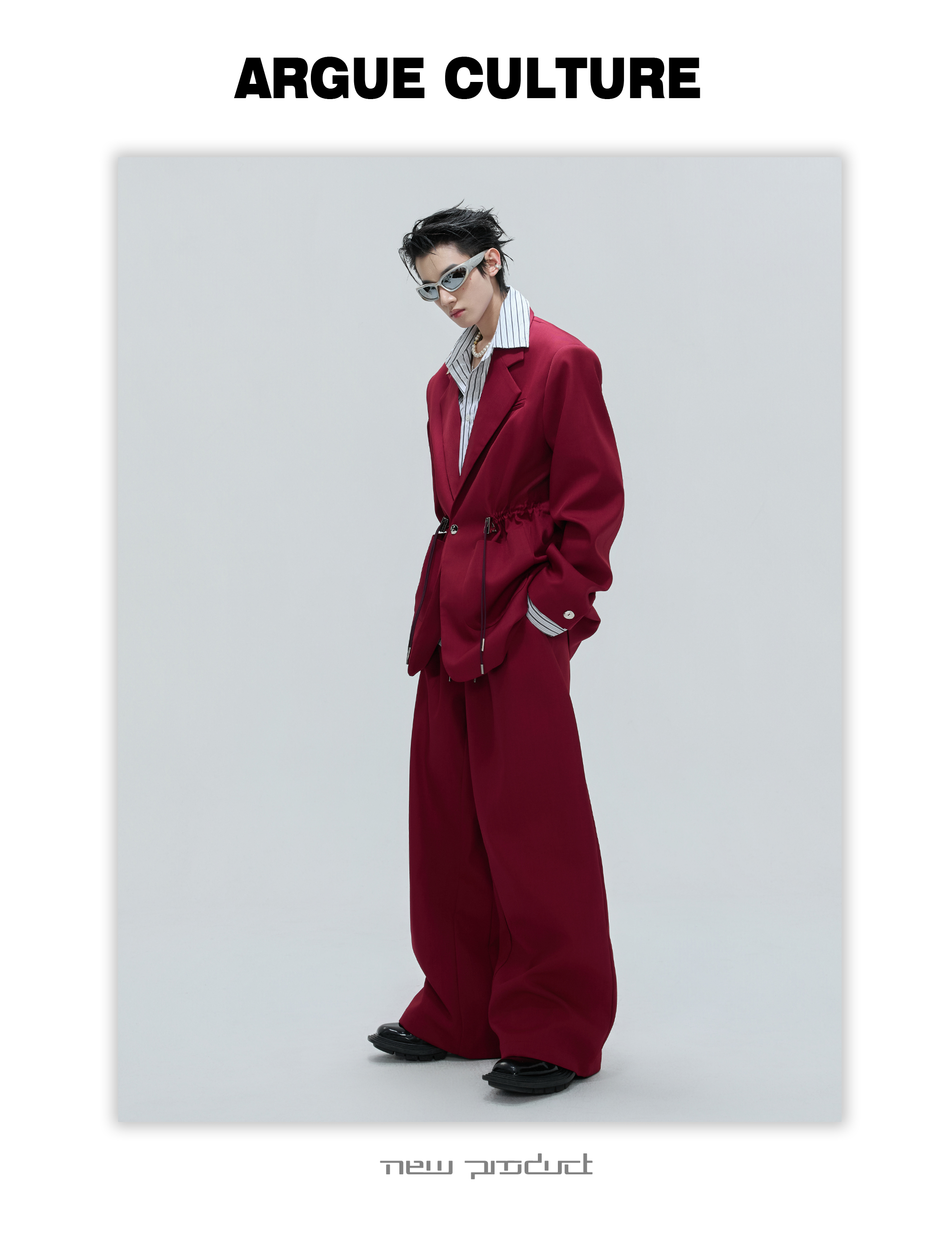 Stripe Shirt Fake Layered Drawstring Waist Shoulder-Pad Tailored Jacket & Trousers Setup WN21731