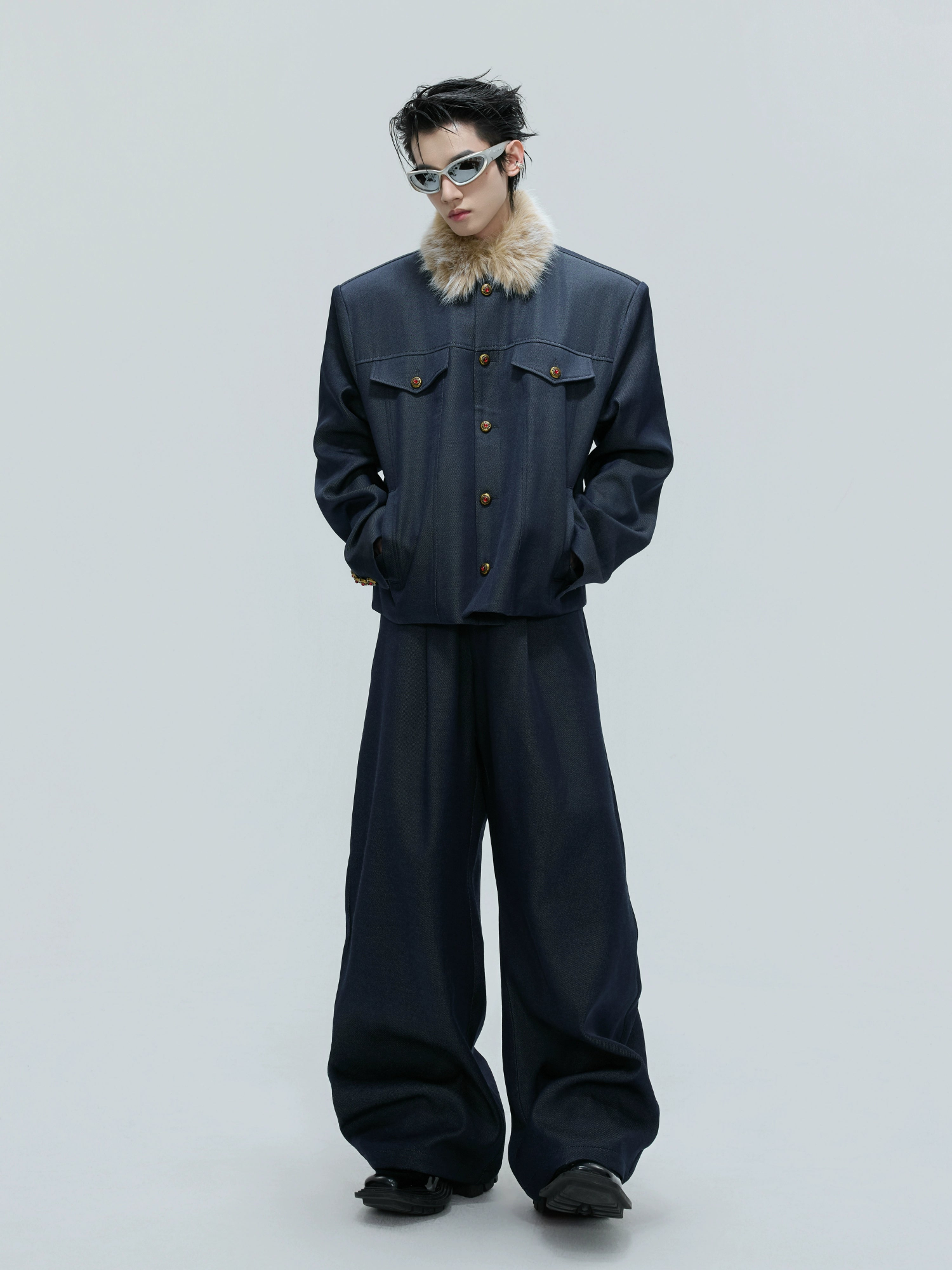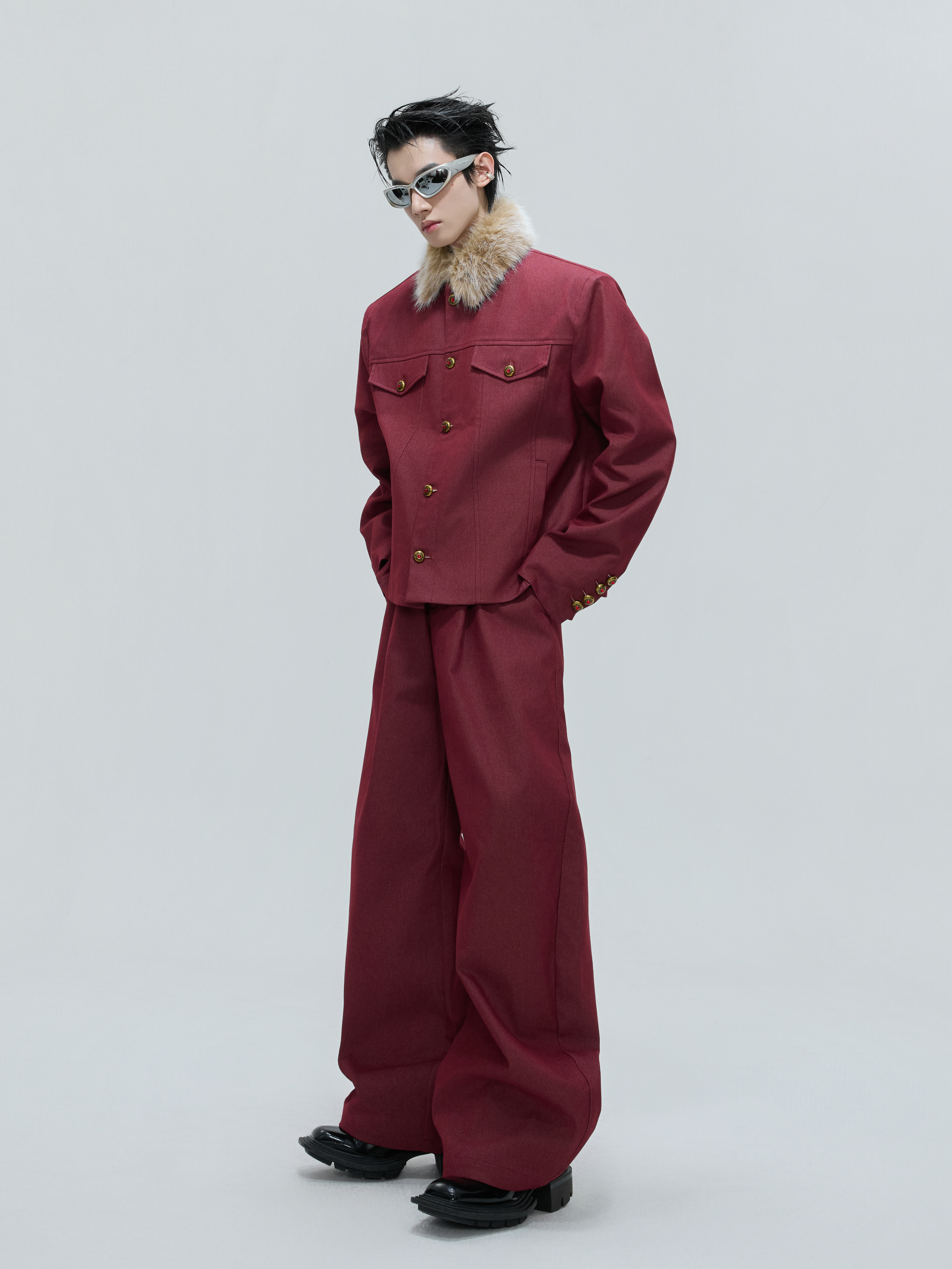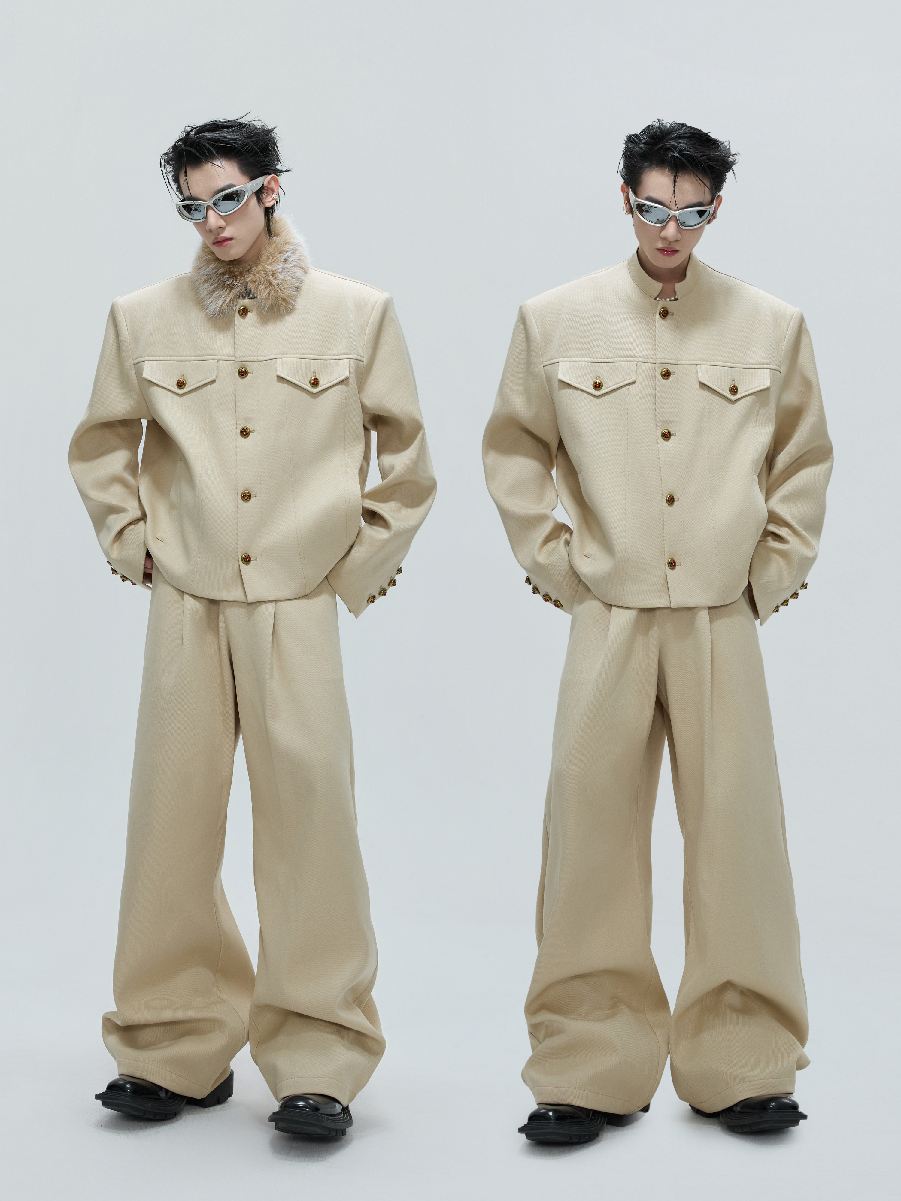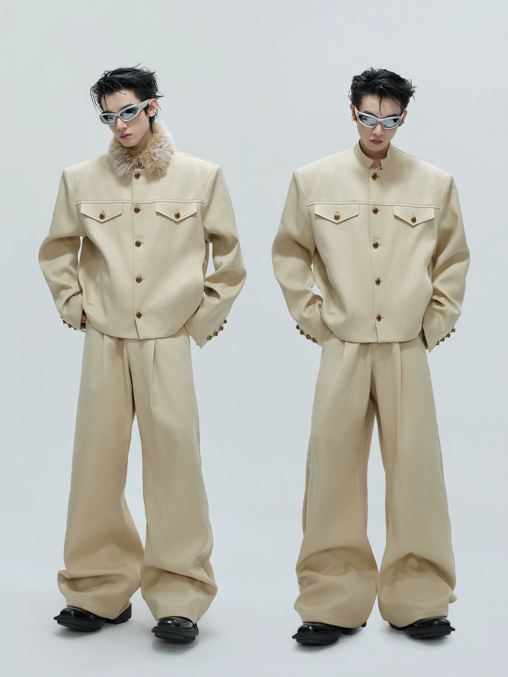 Fur Collar Gem Button Standing-Collar Short Jacket & Trousers Setup WN21733