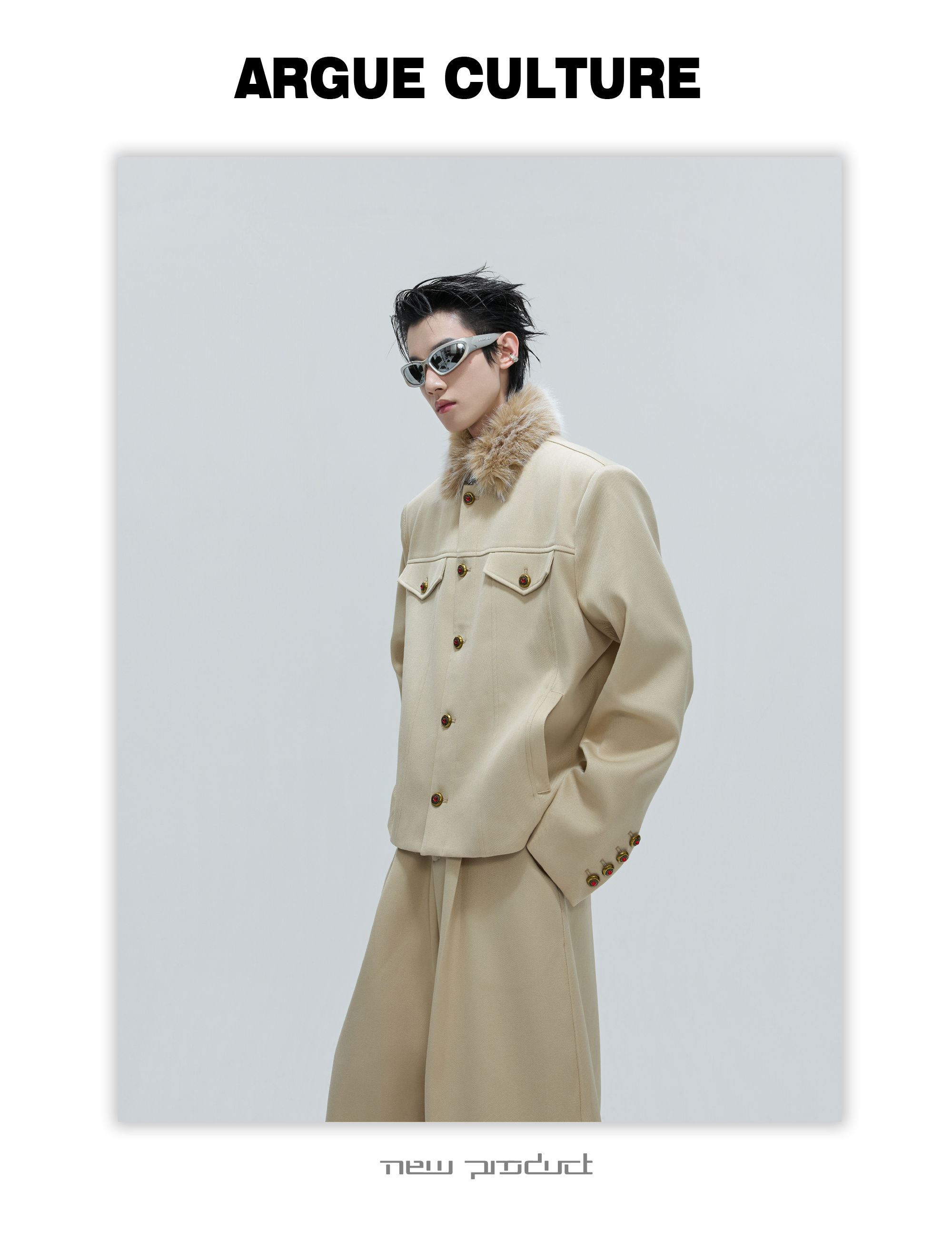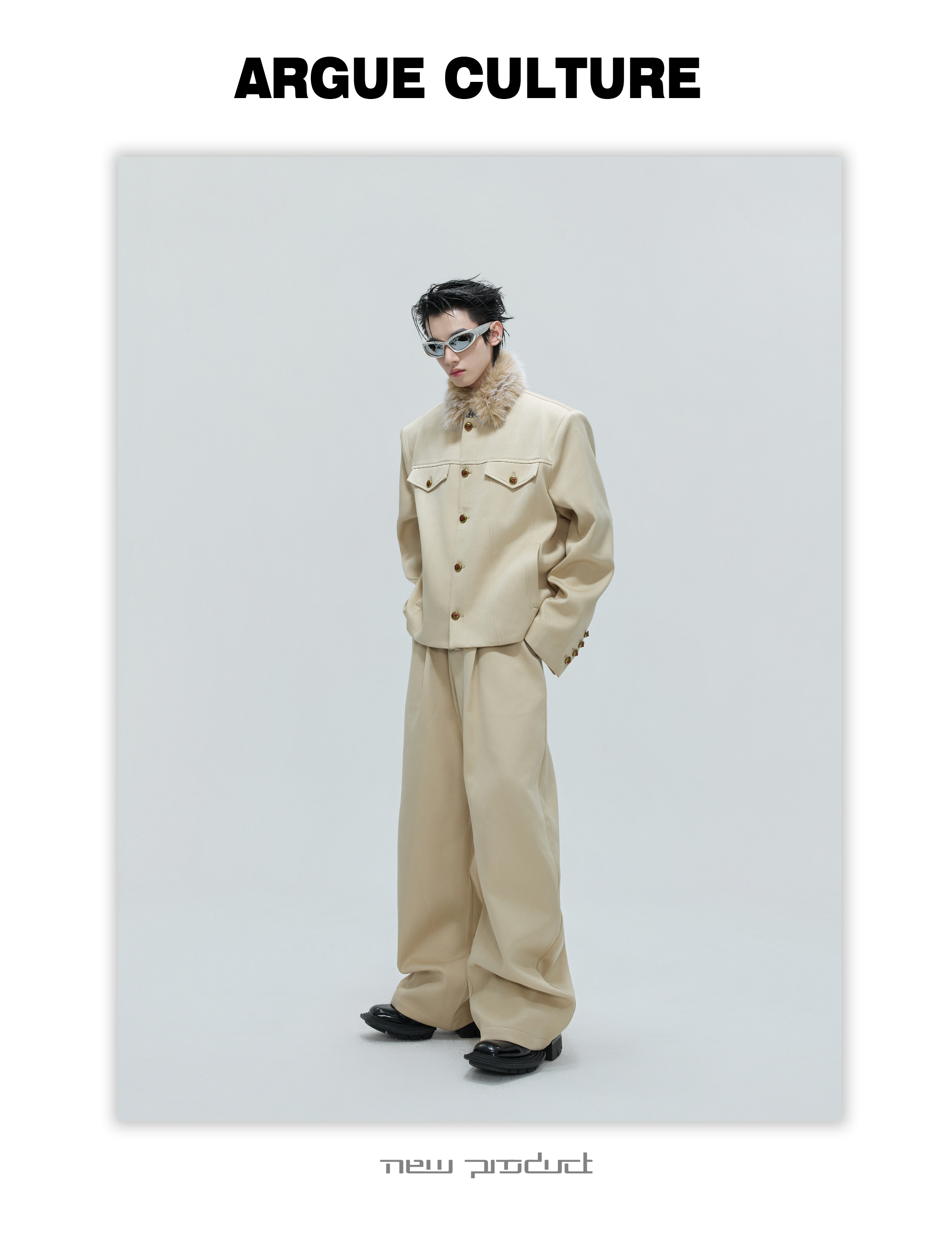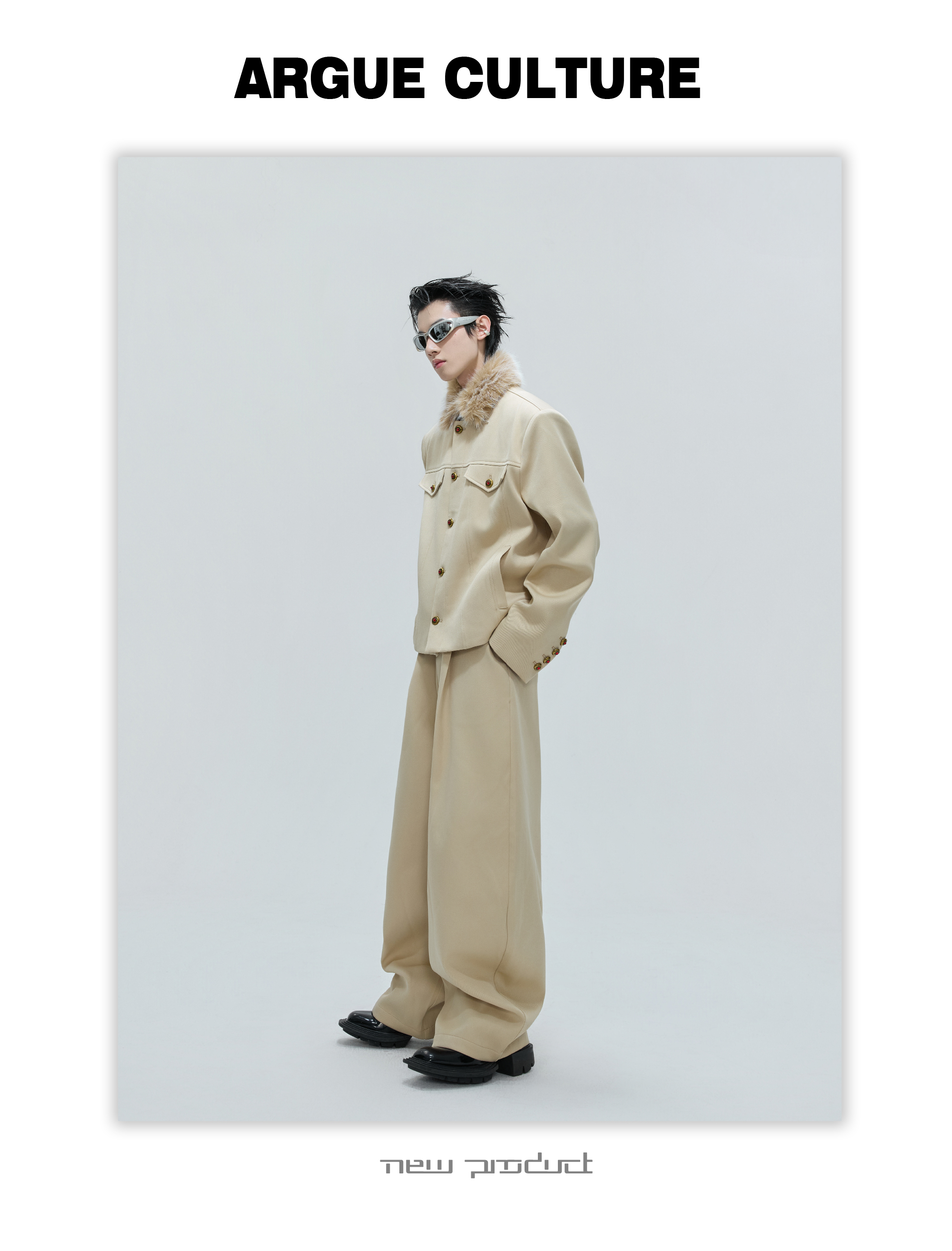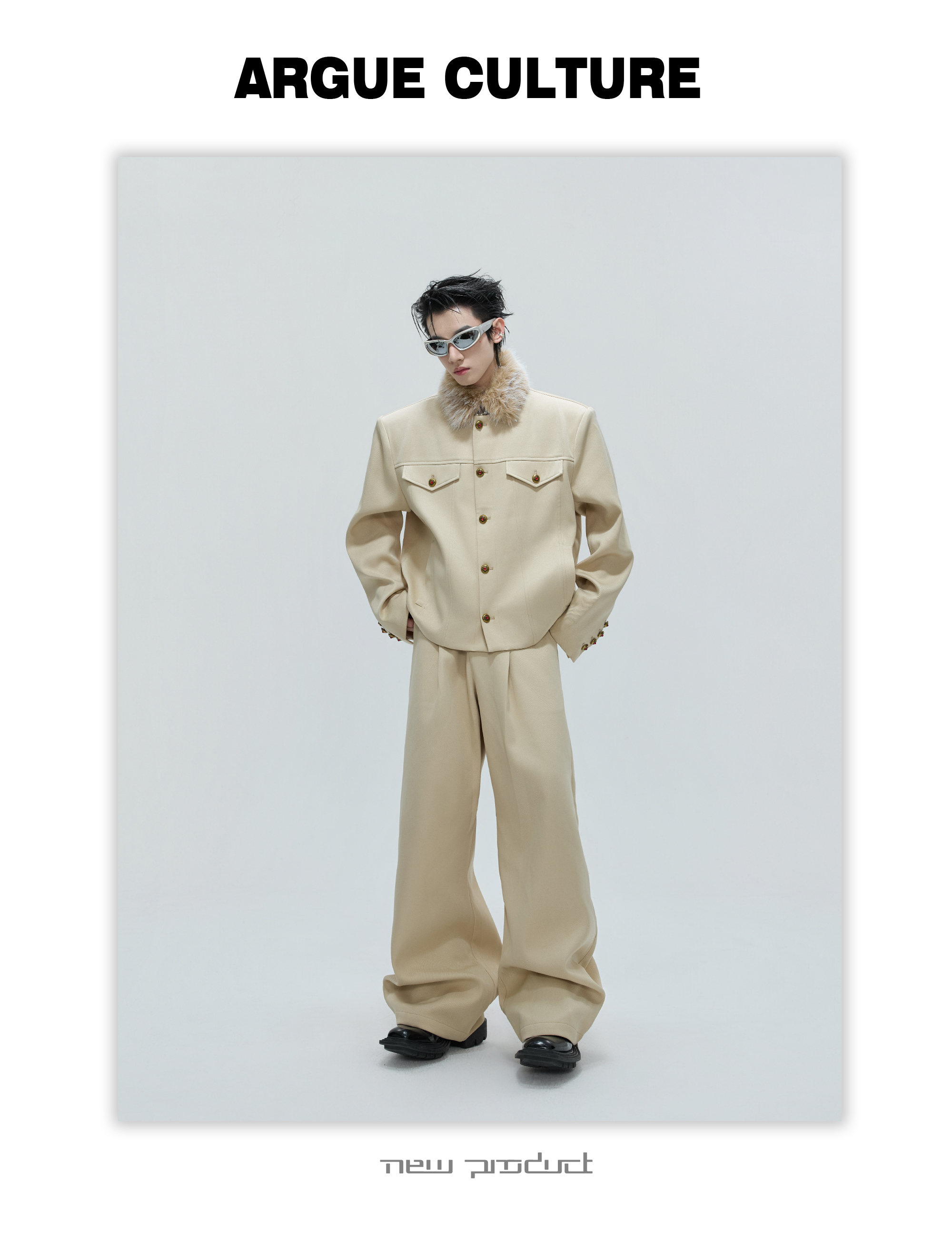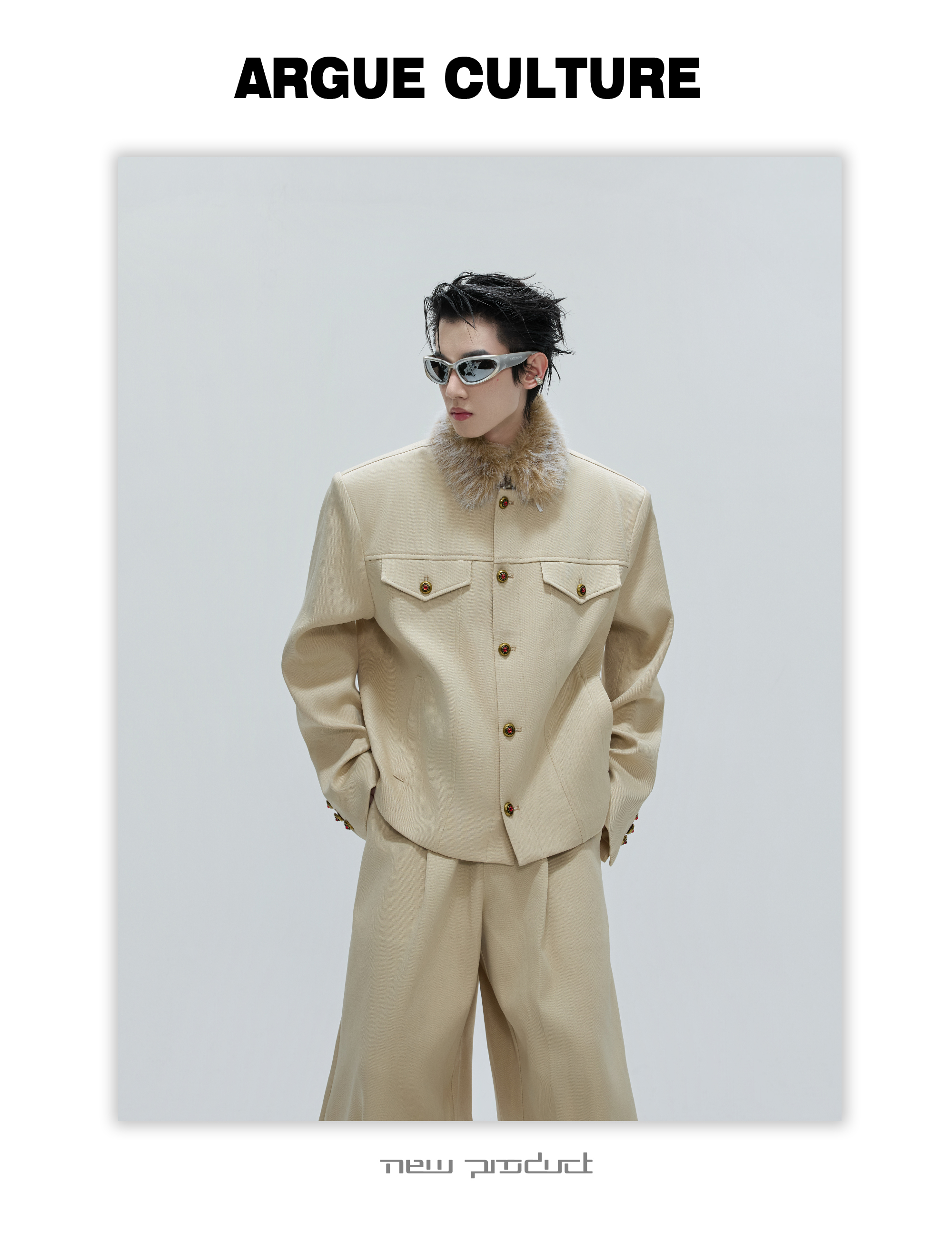 Fur Collar Gem Button Standing-Collar Short Jacket & Trousers Setup WN21733