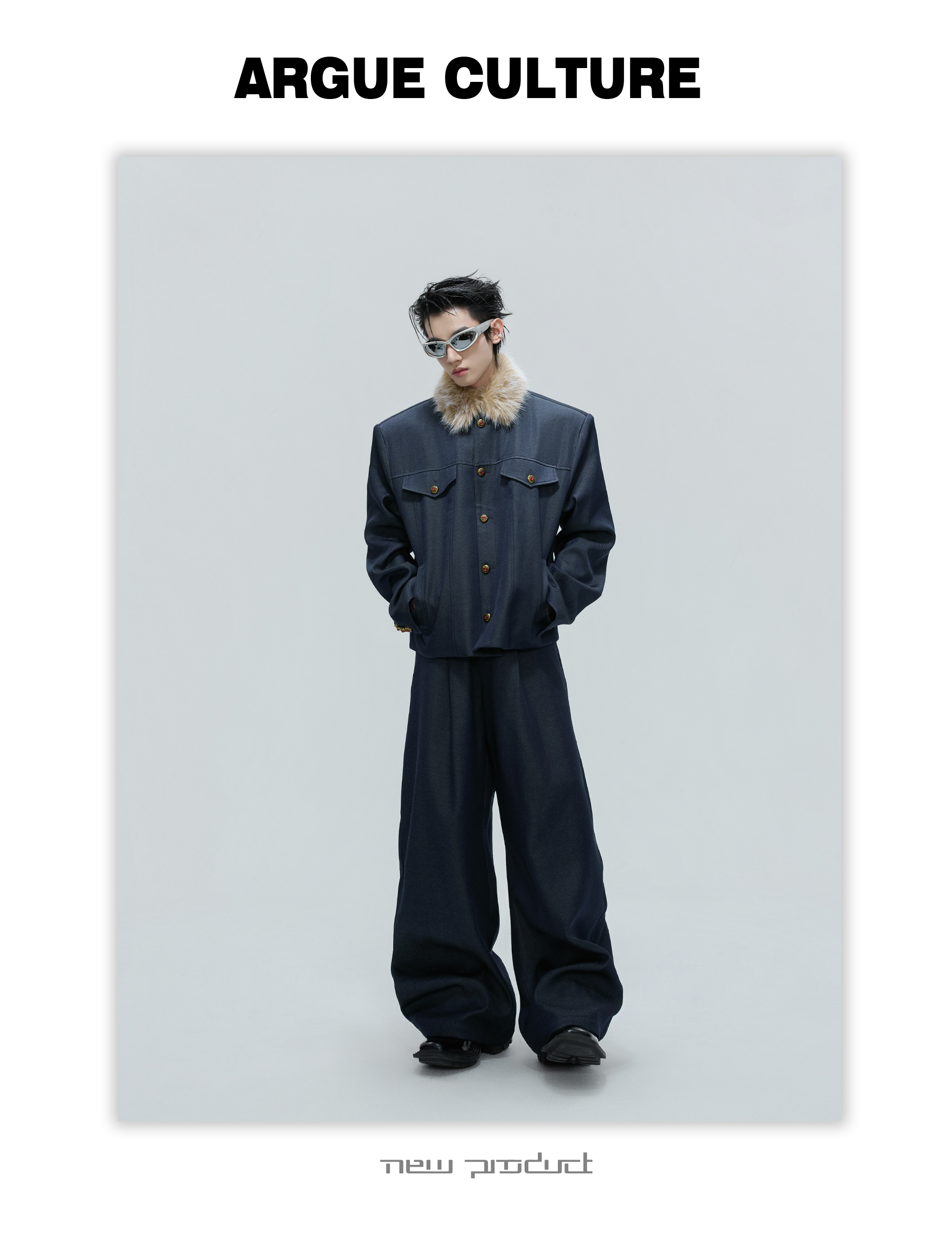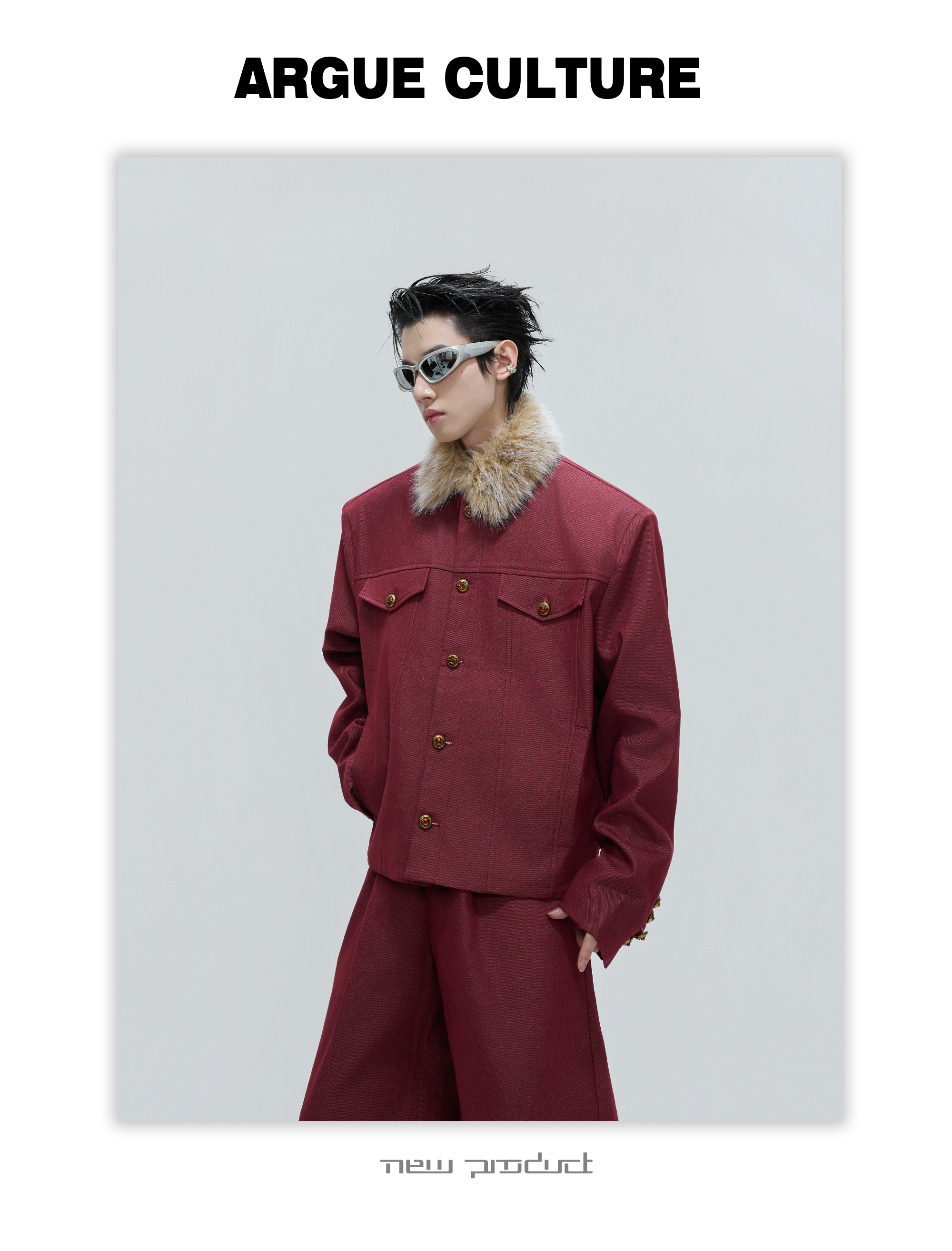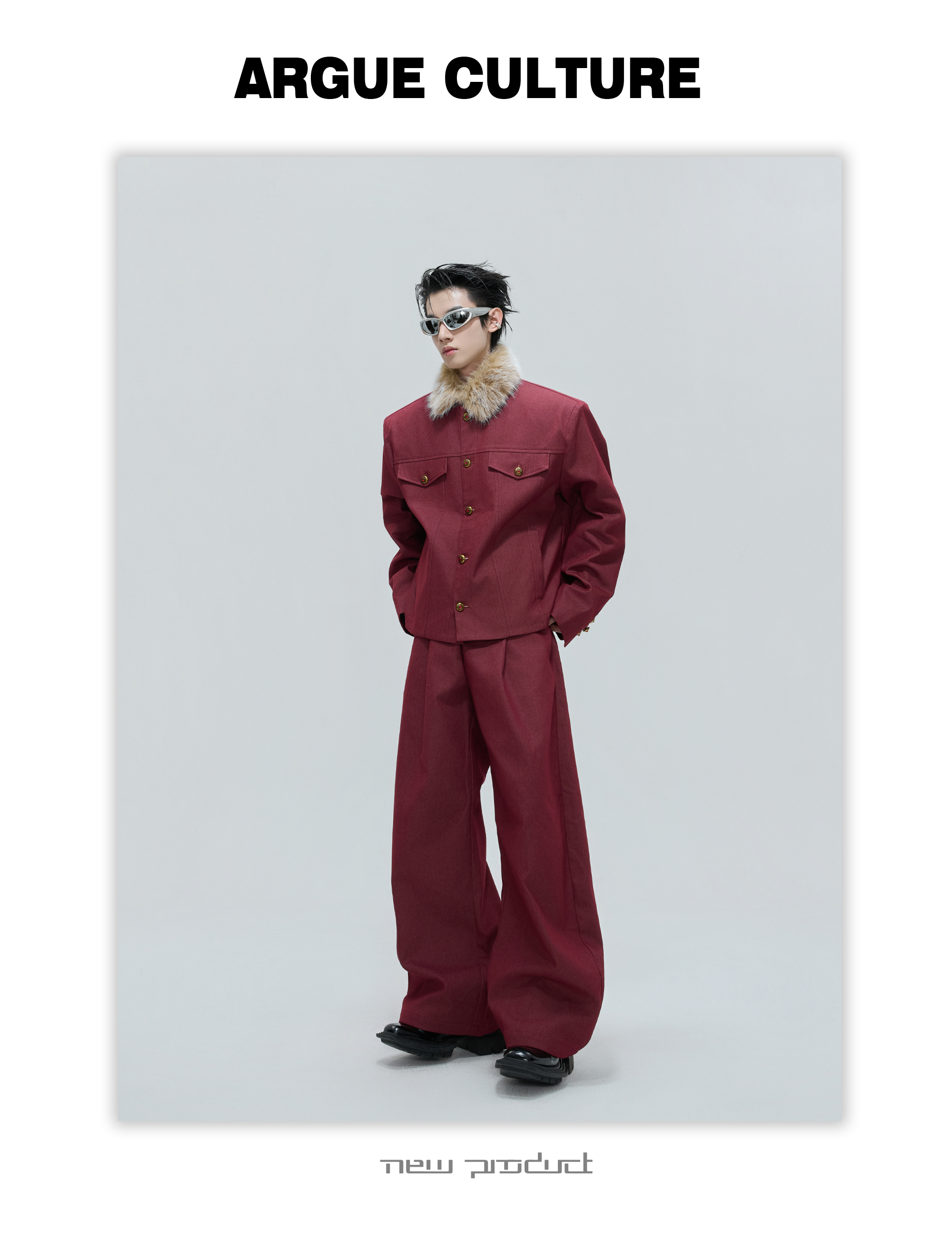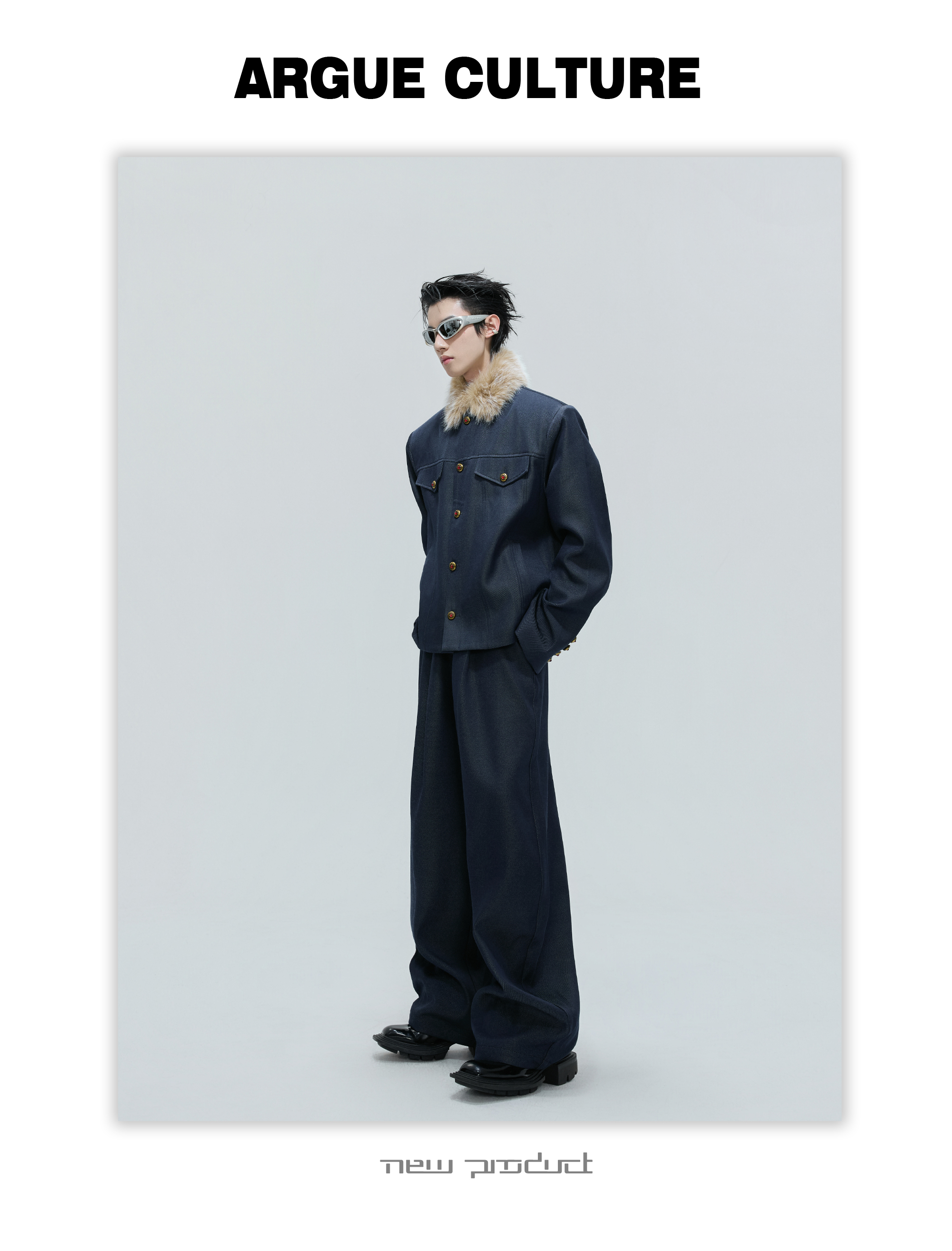 Fur Collar Gem Button Standing-Collar Short Jacket & Trousers Setup WN21733