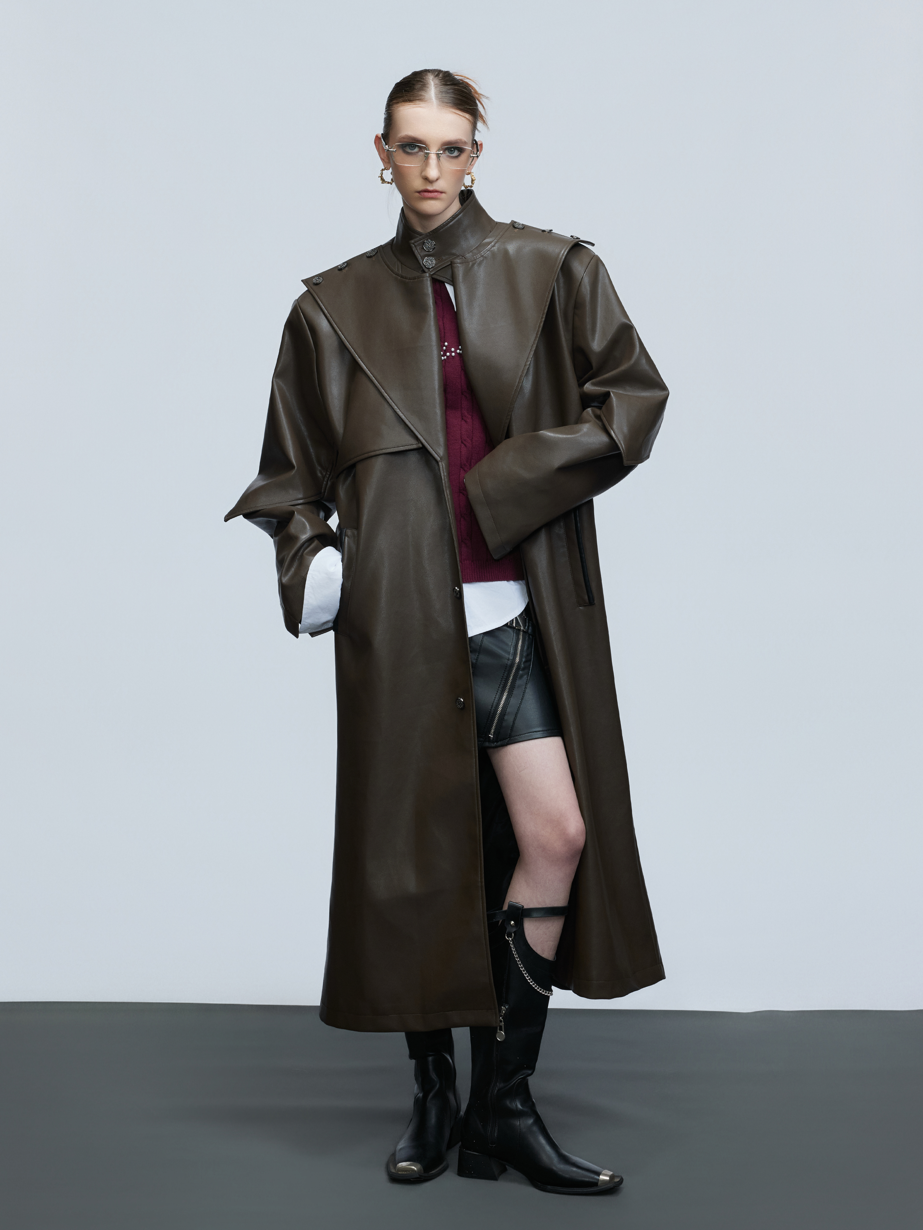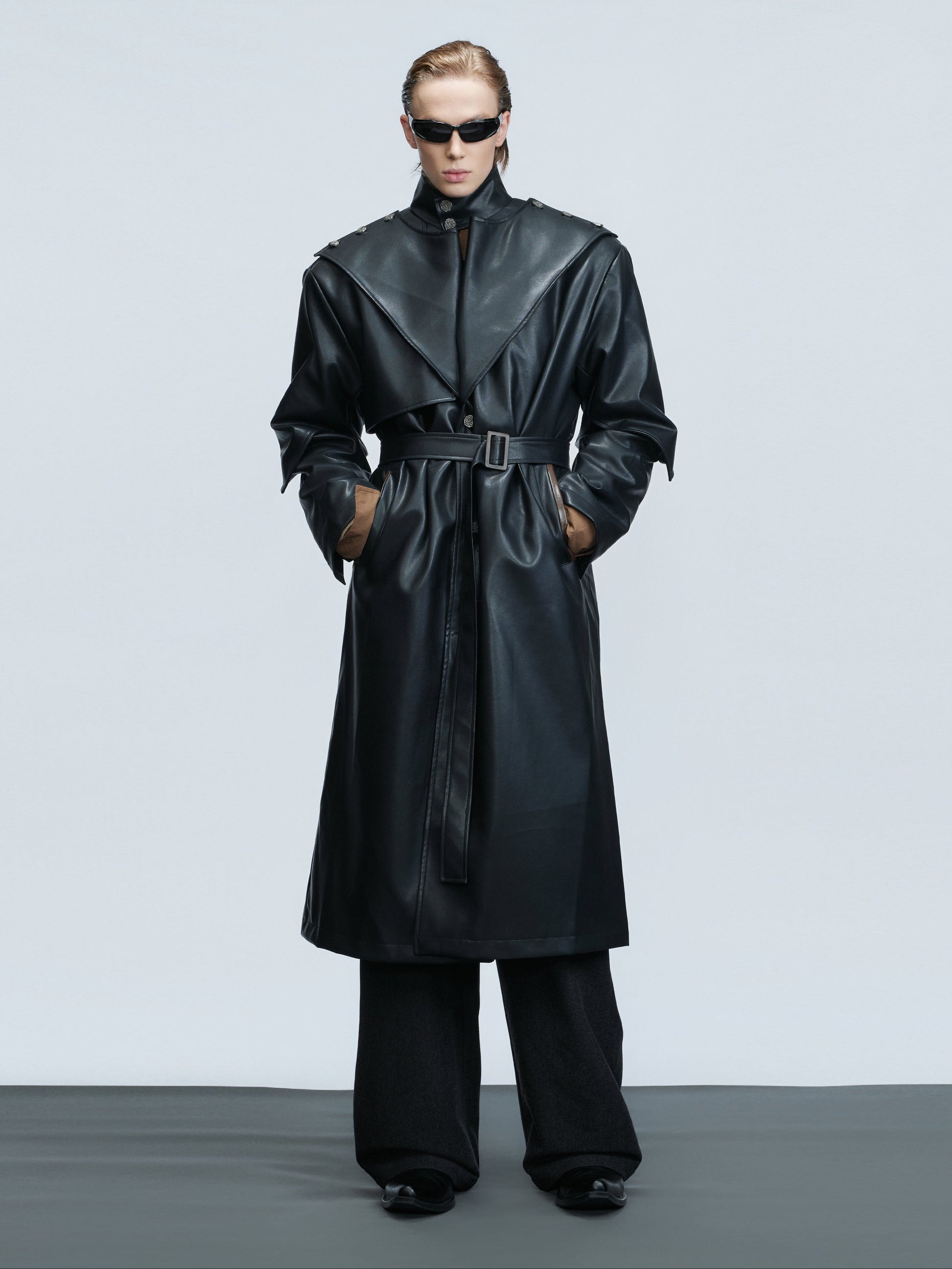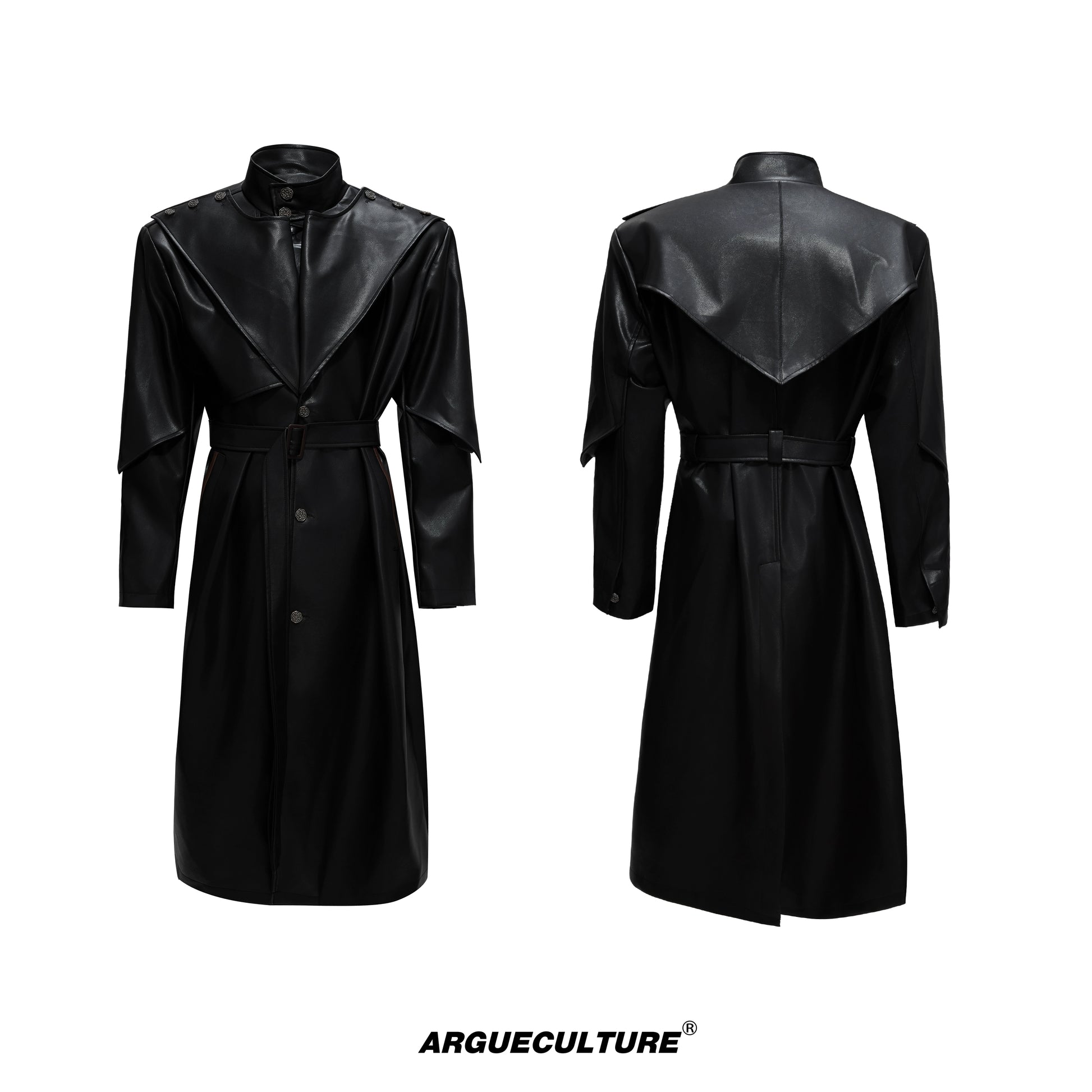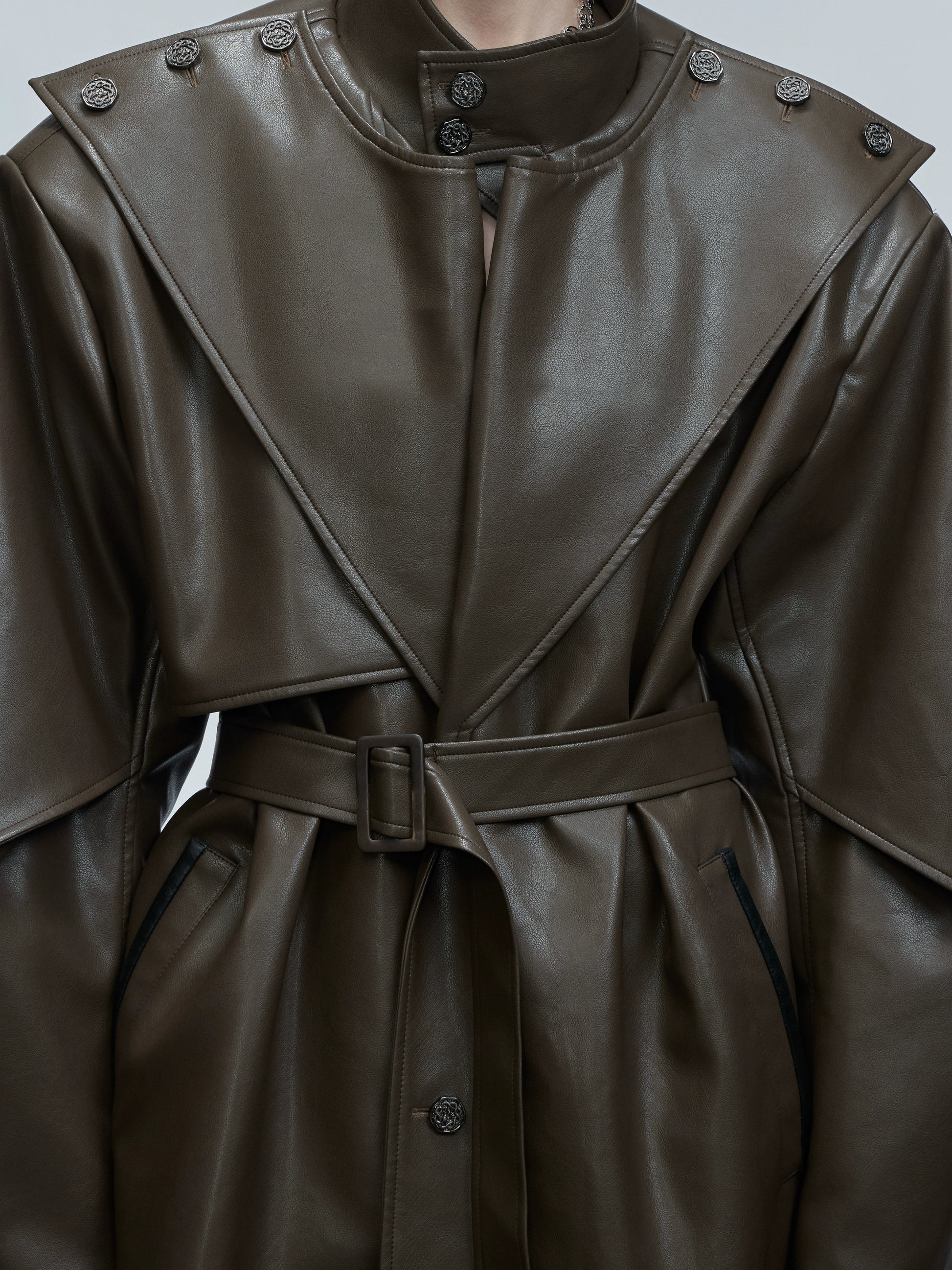 Standing-Collar Belted PU Leather Long Coat WN21748