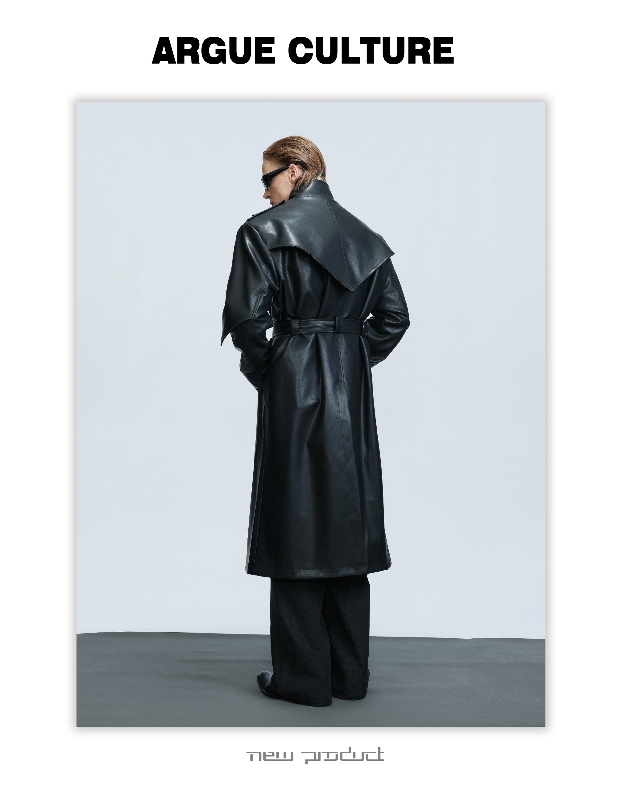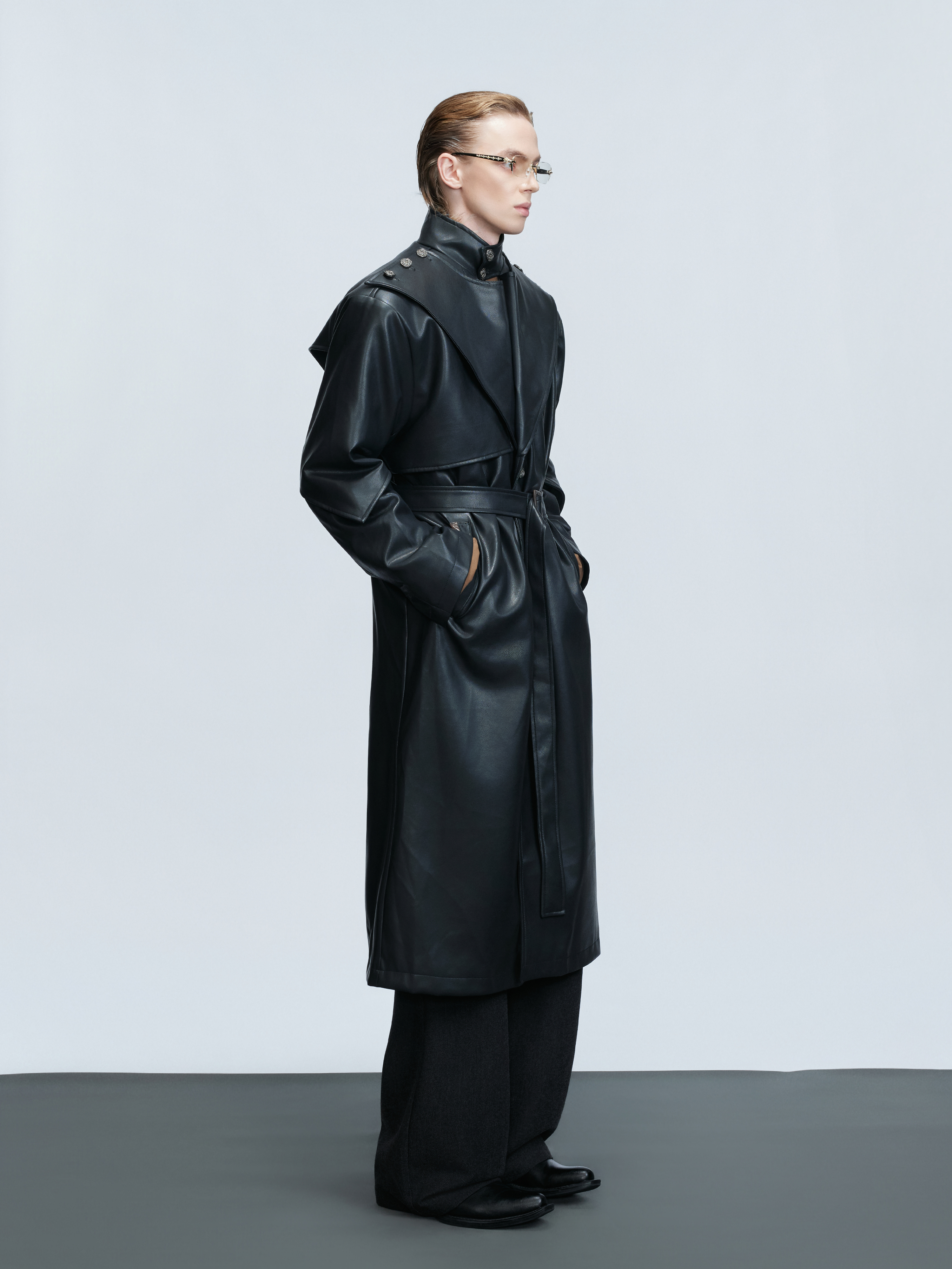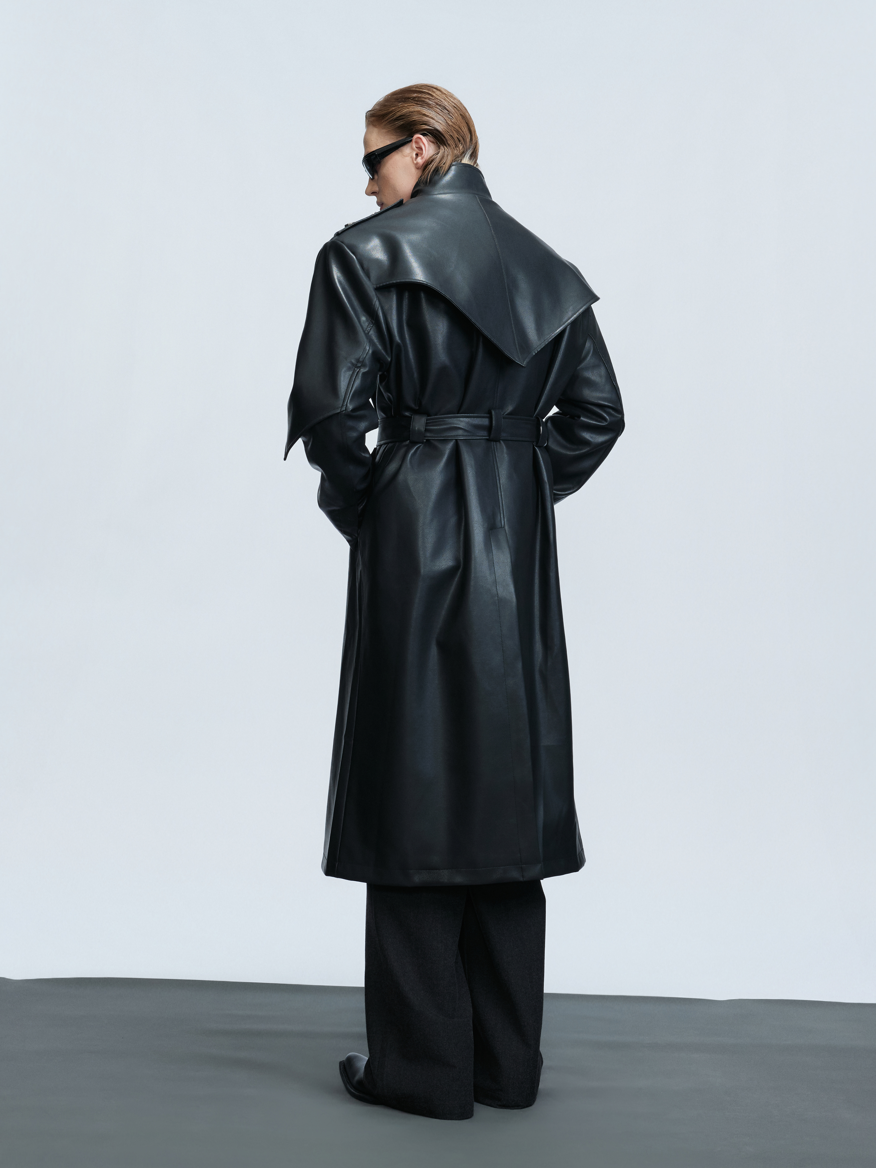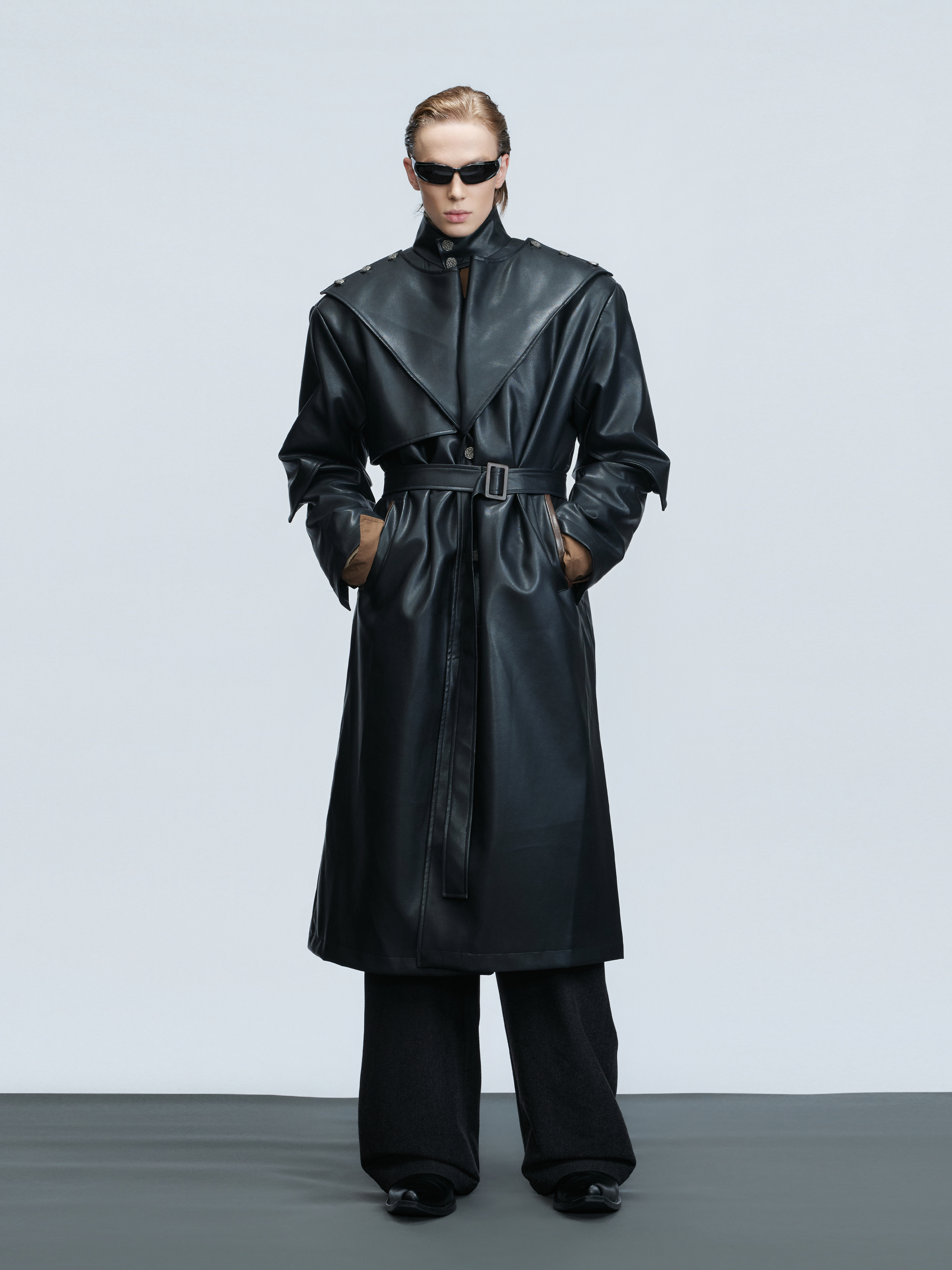 Standing-Collar Belted PU Leather Long Coat WN21748