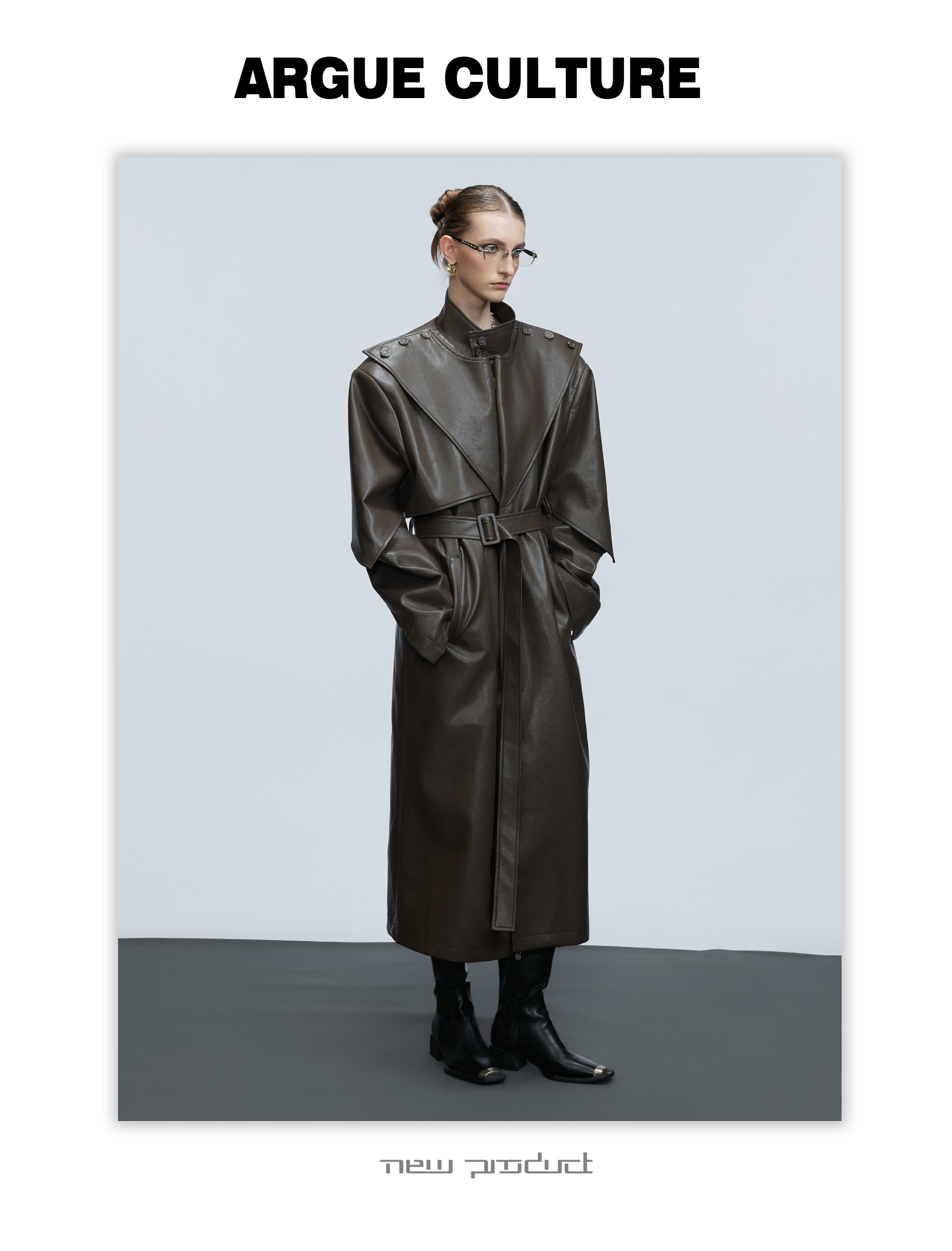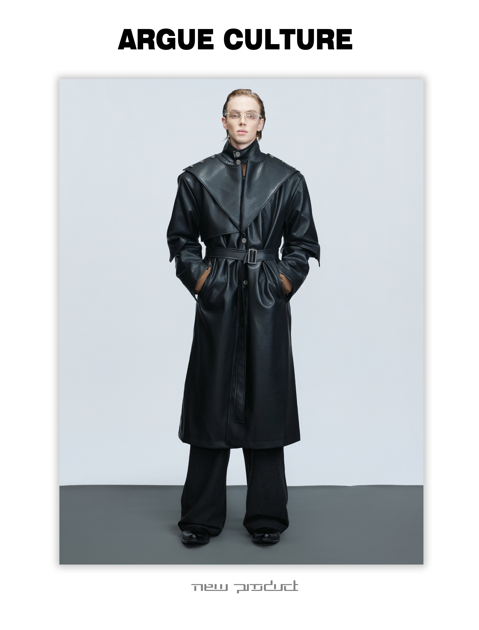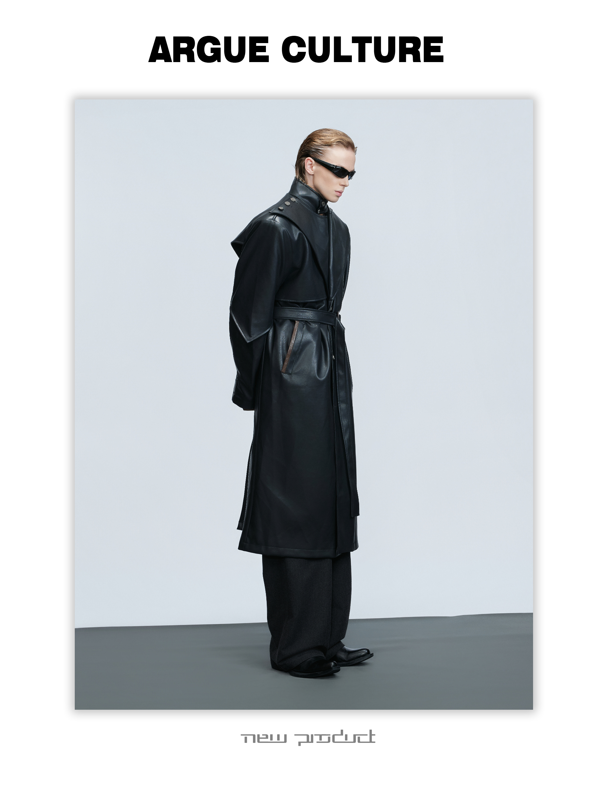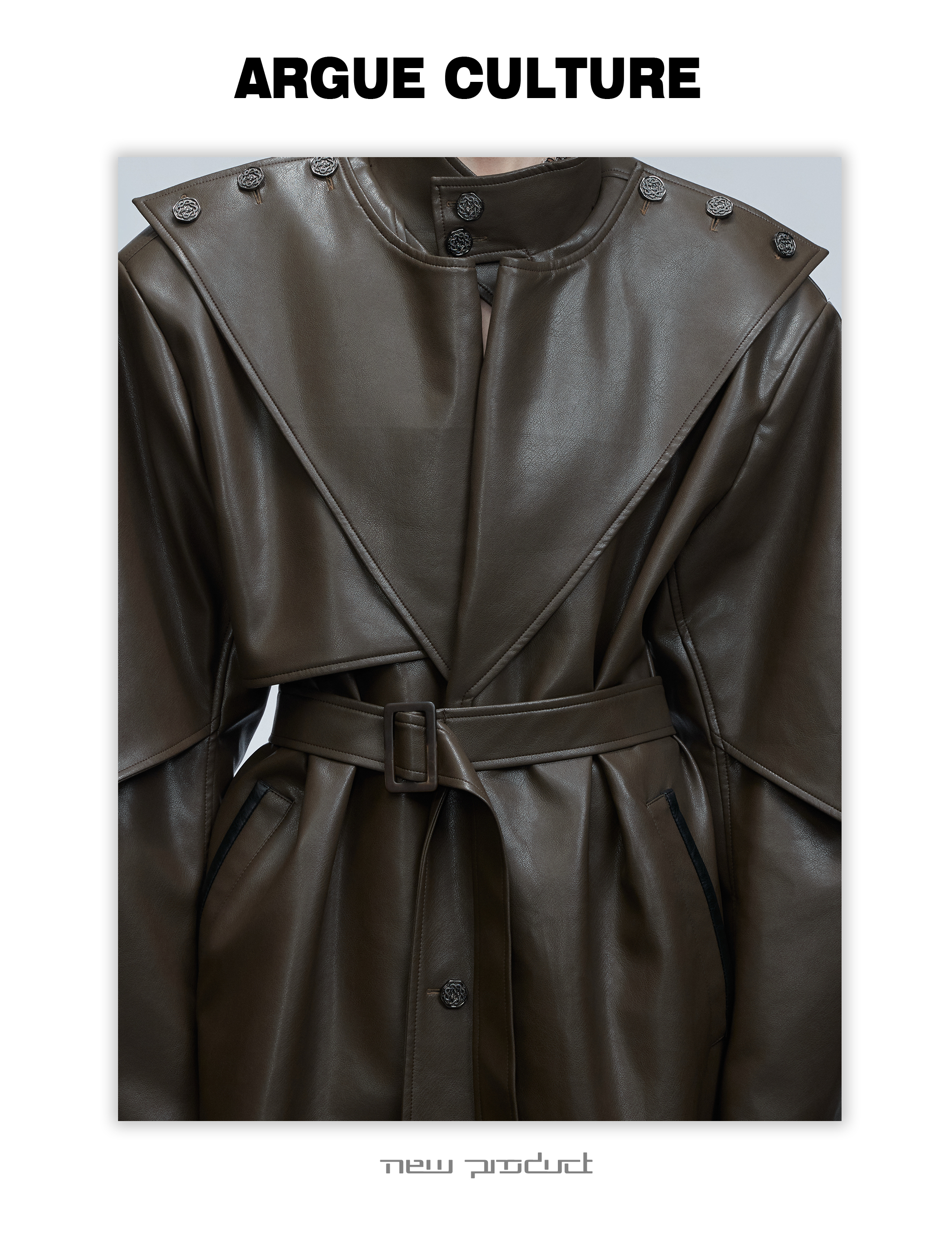 Standing-Collar Belted PU Leather Long Coat WN21748