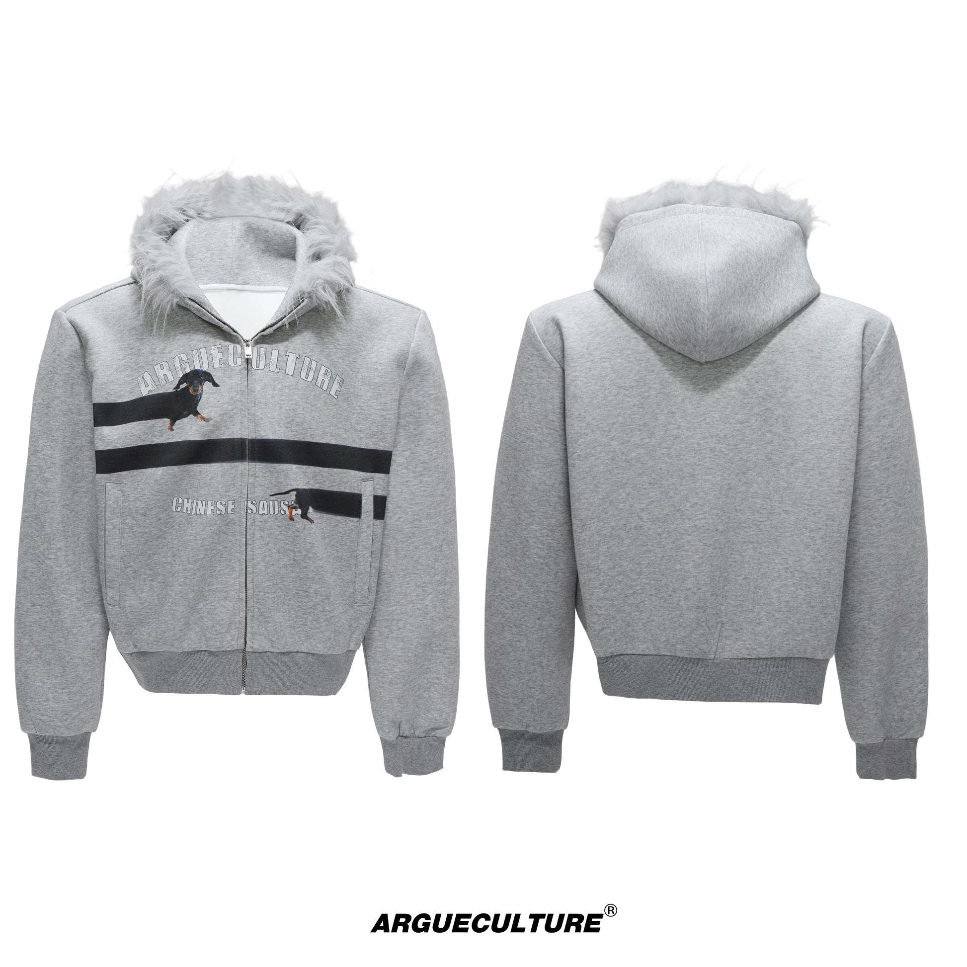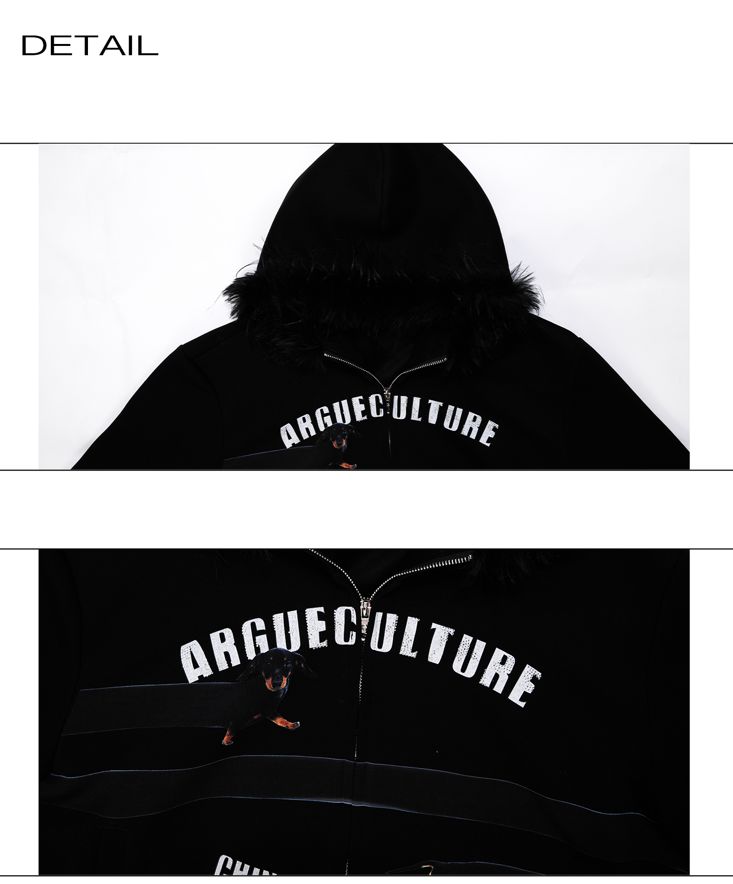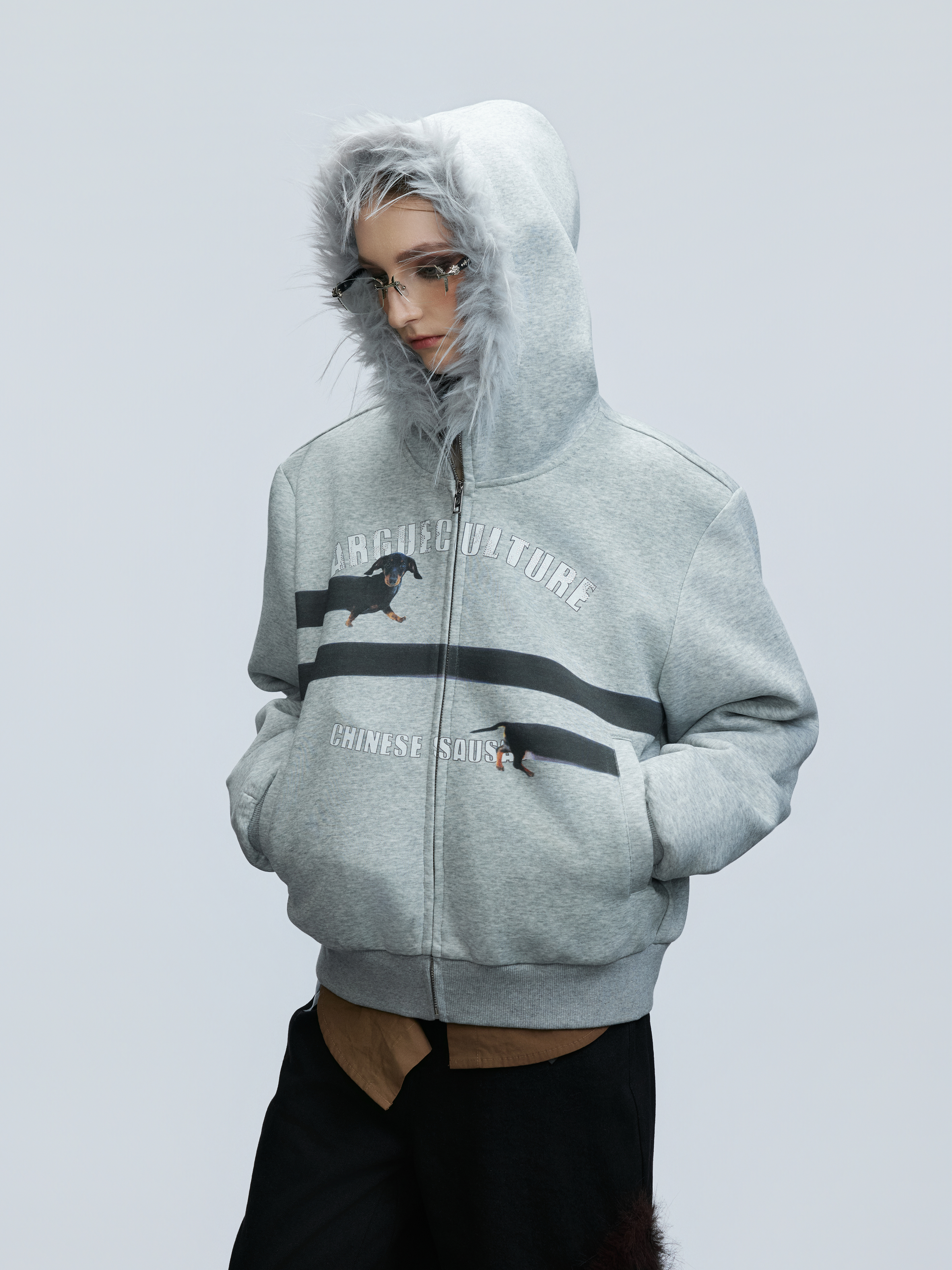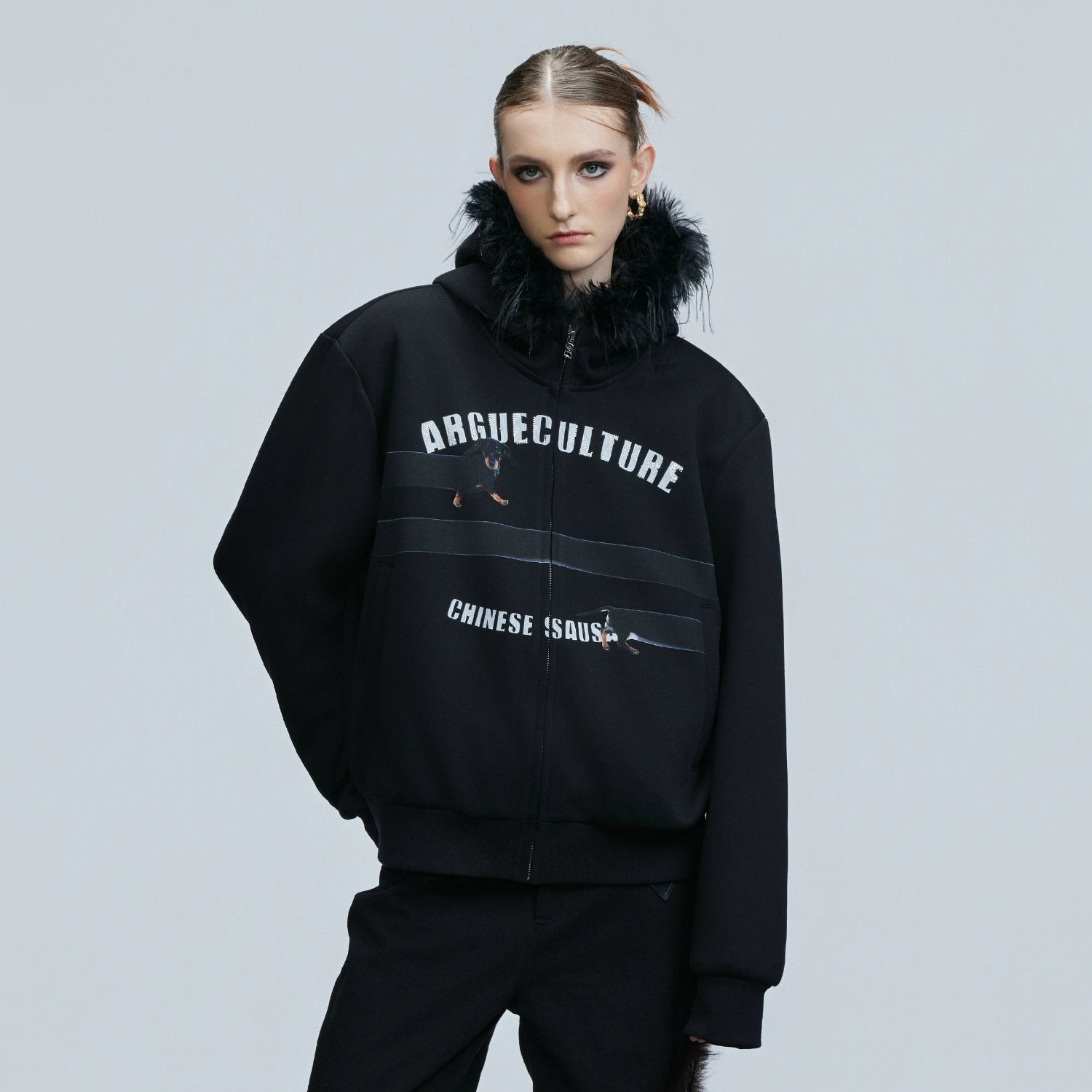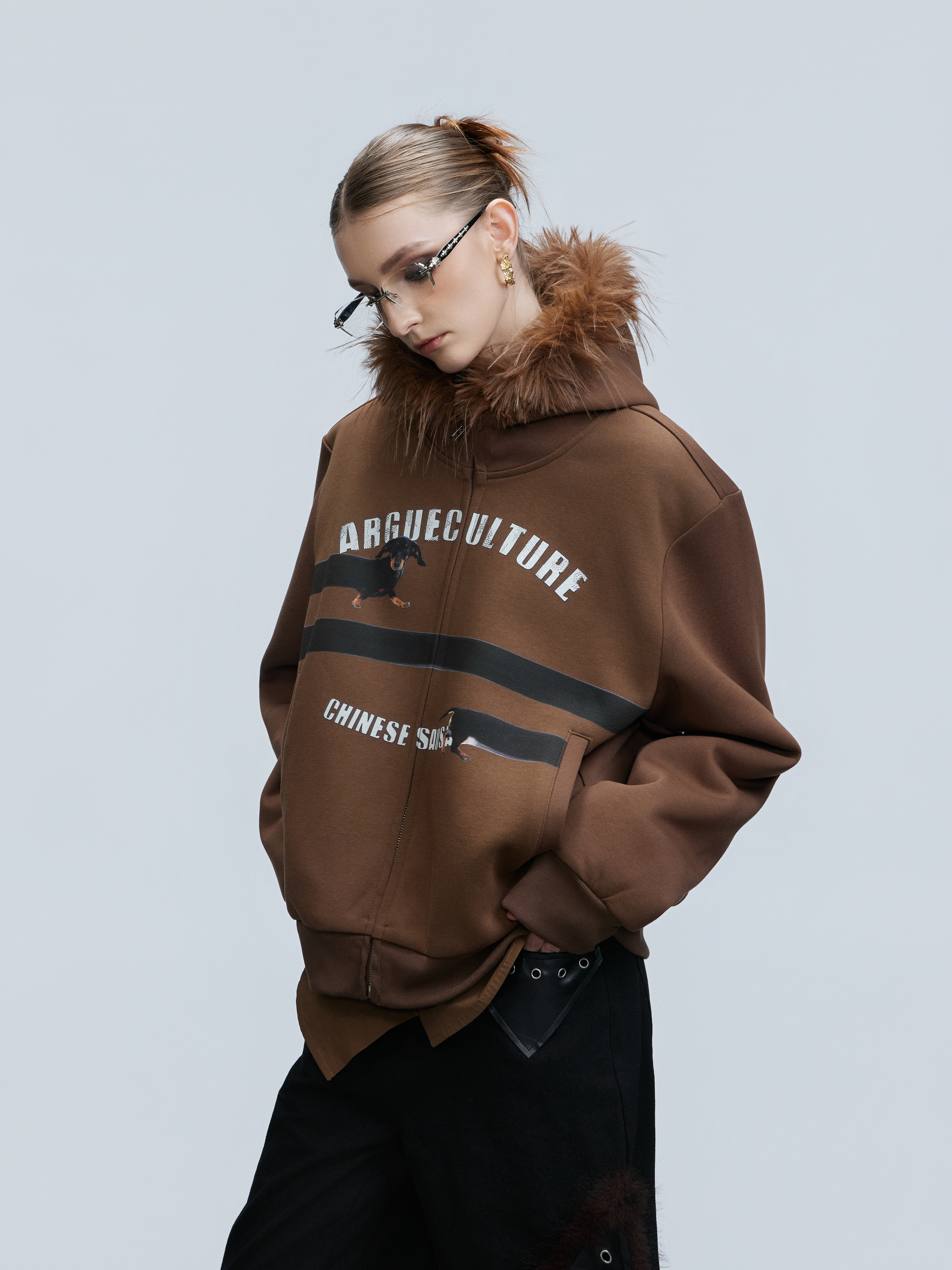 Fake Fur Collar Letter Print Zipper Hoodie WN21749