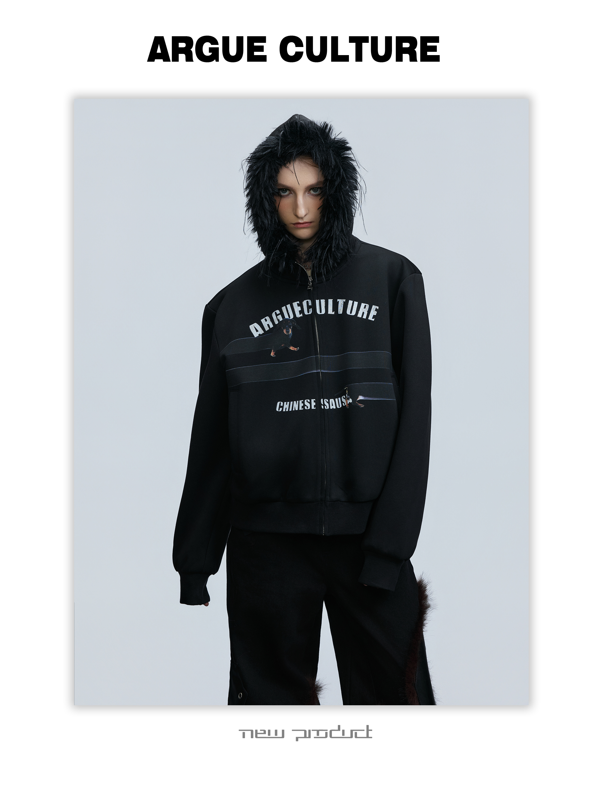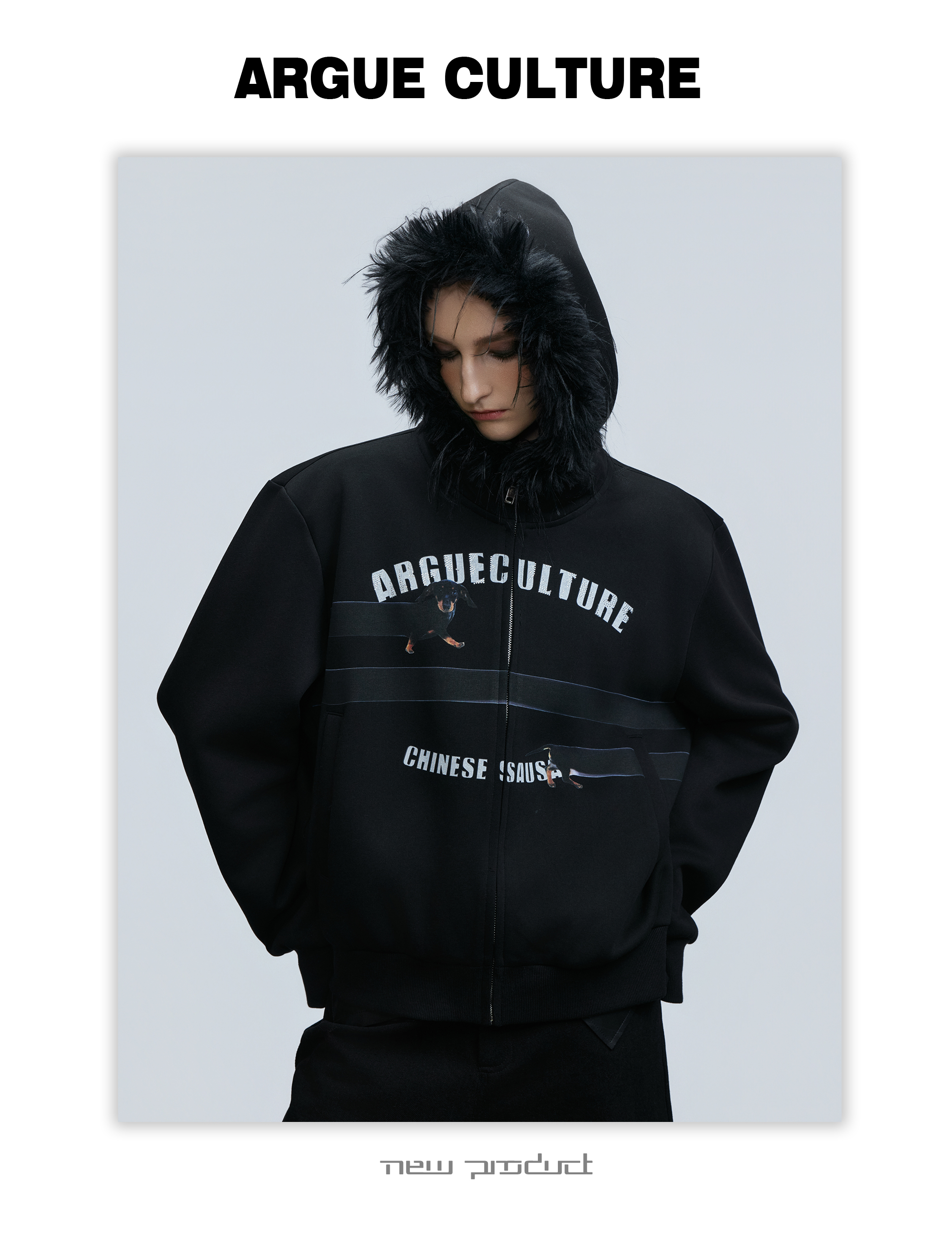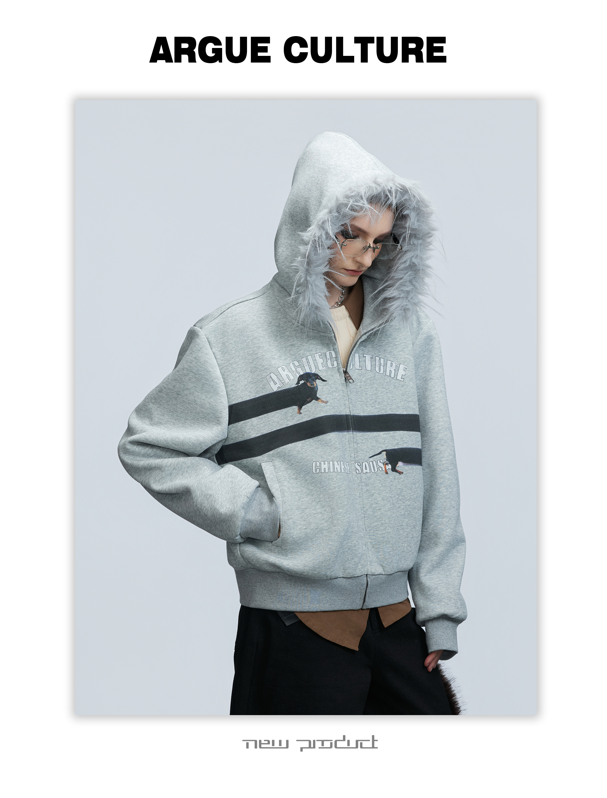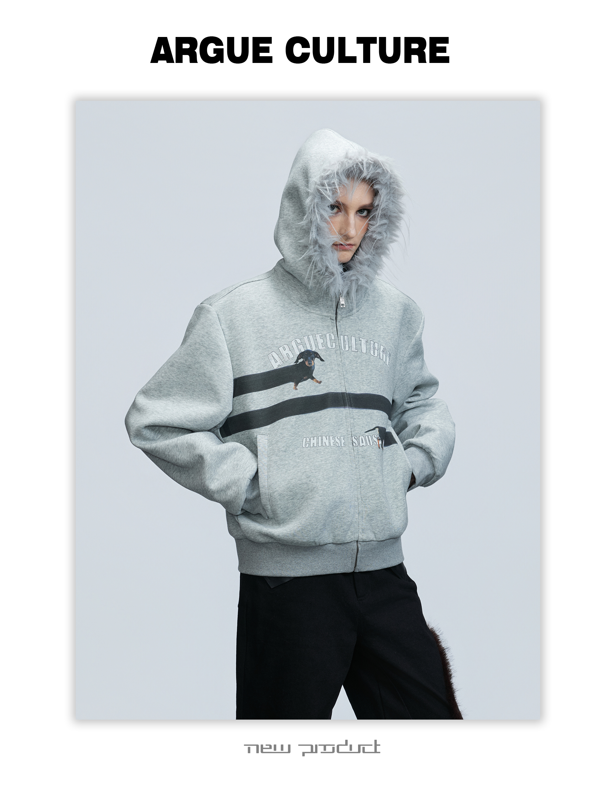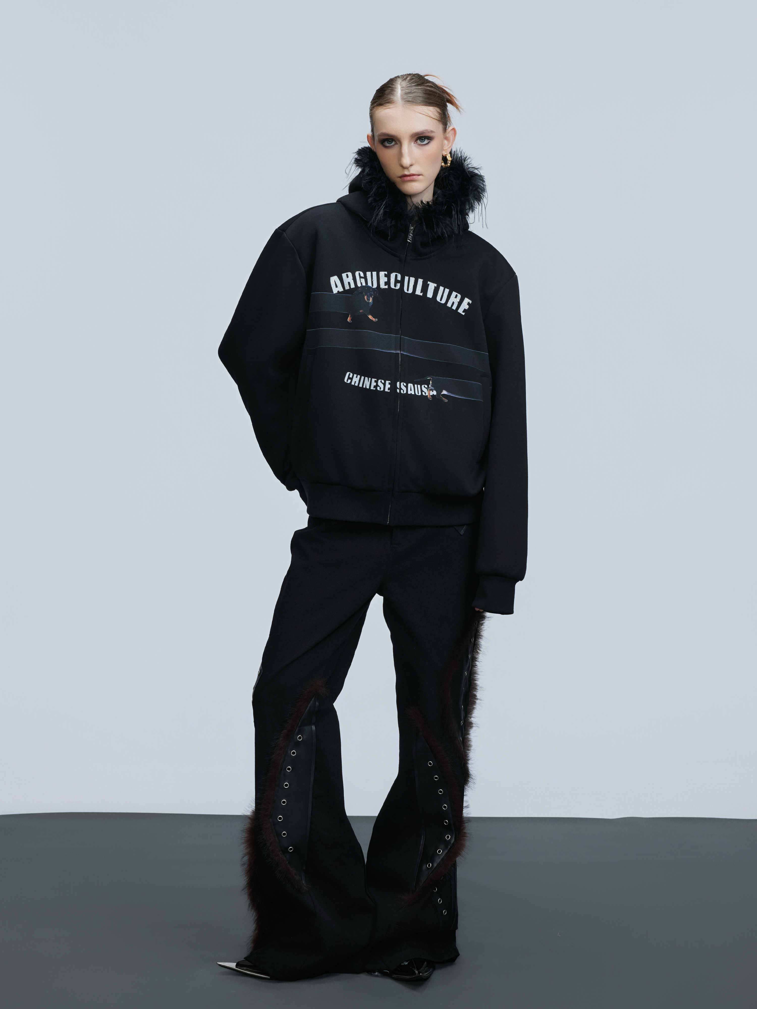 Fake Fur Collar Letter Print Zipper Hoodie WN21749