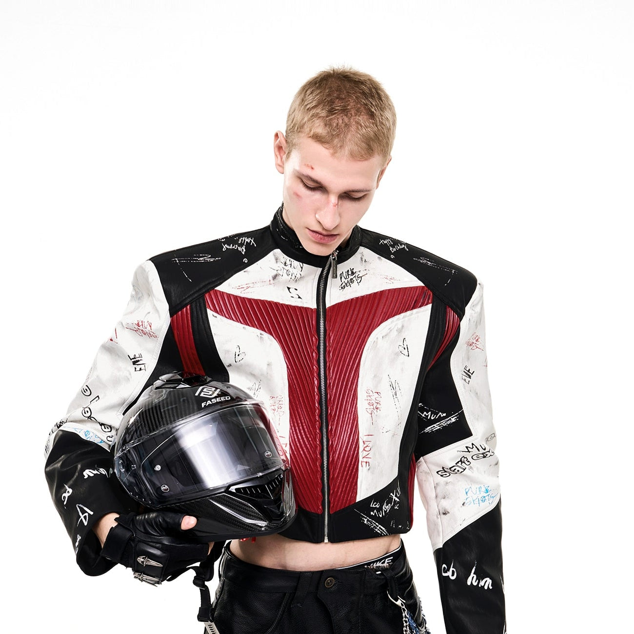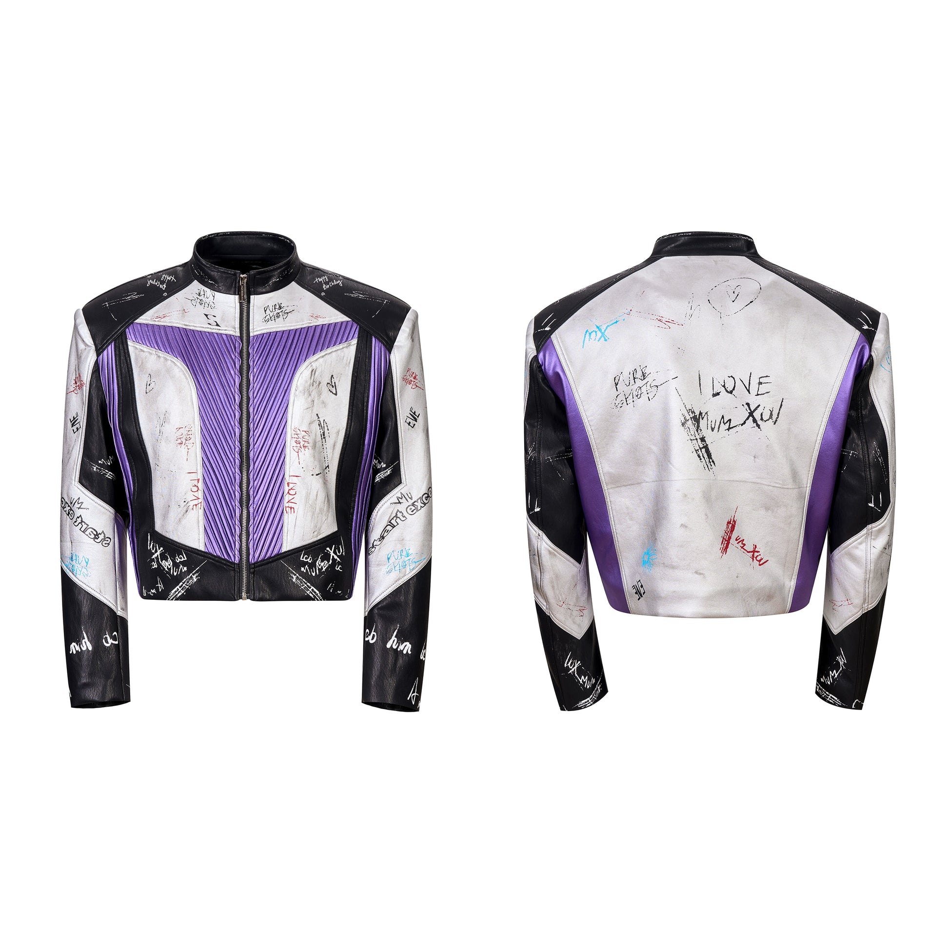 Graffiti Logo Print Stand Neck Patchwork PU Leather Short Jacket WN21808