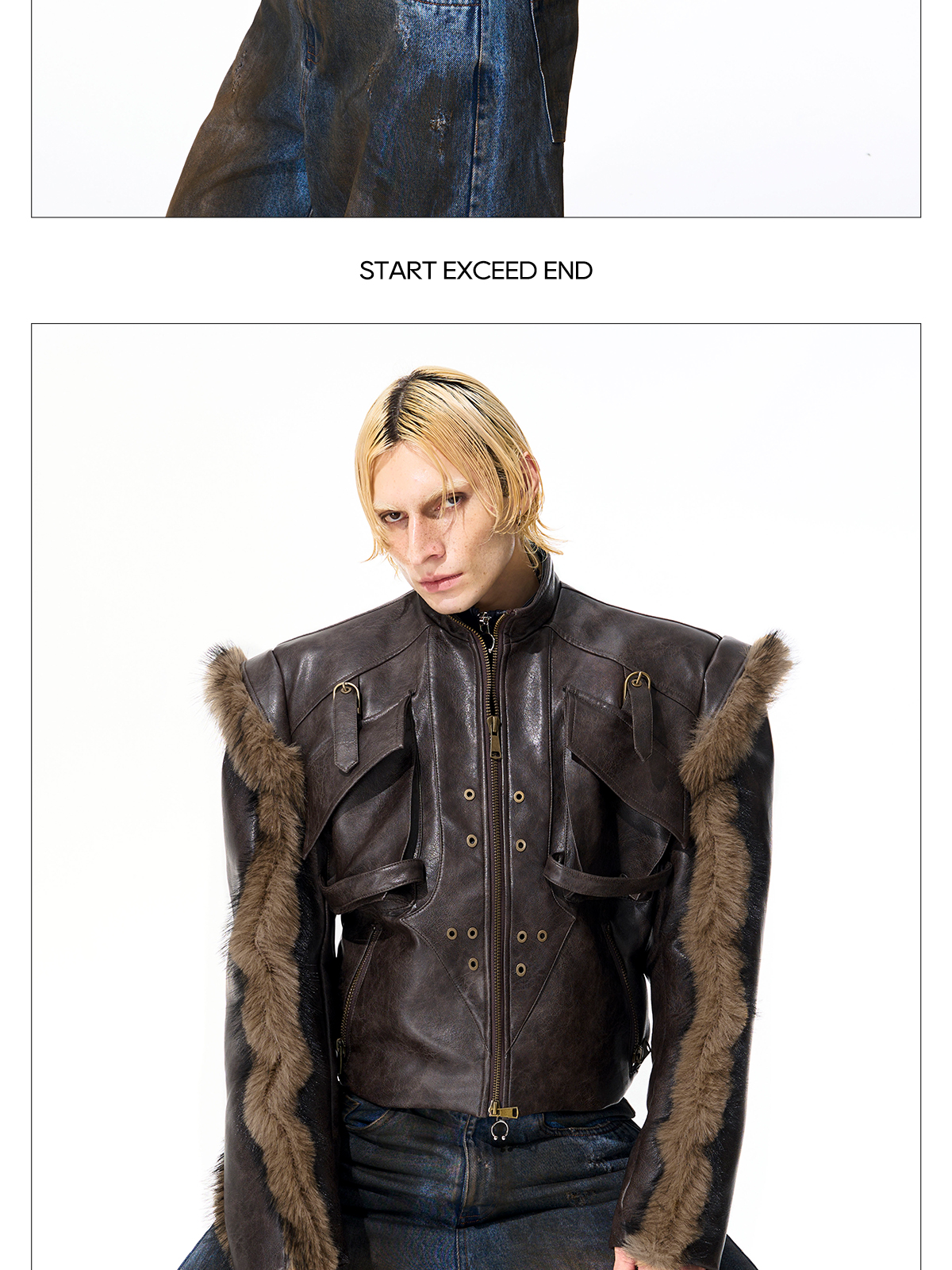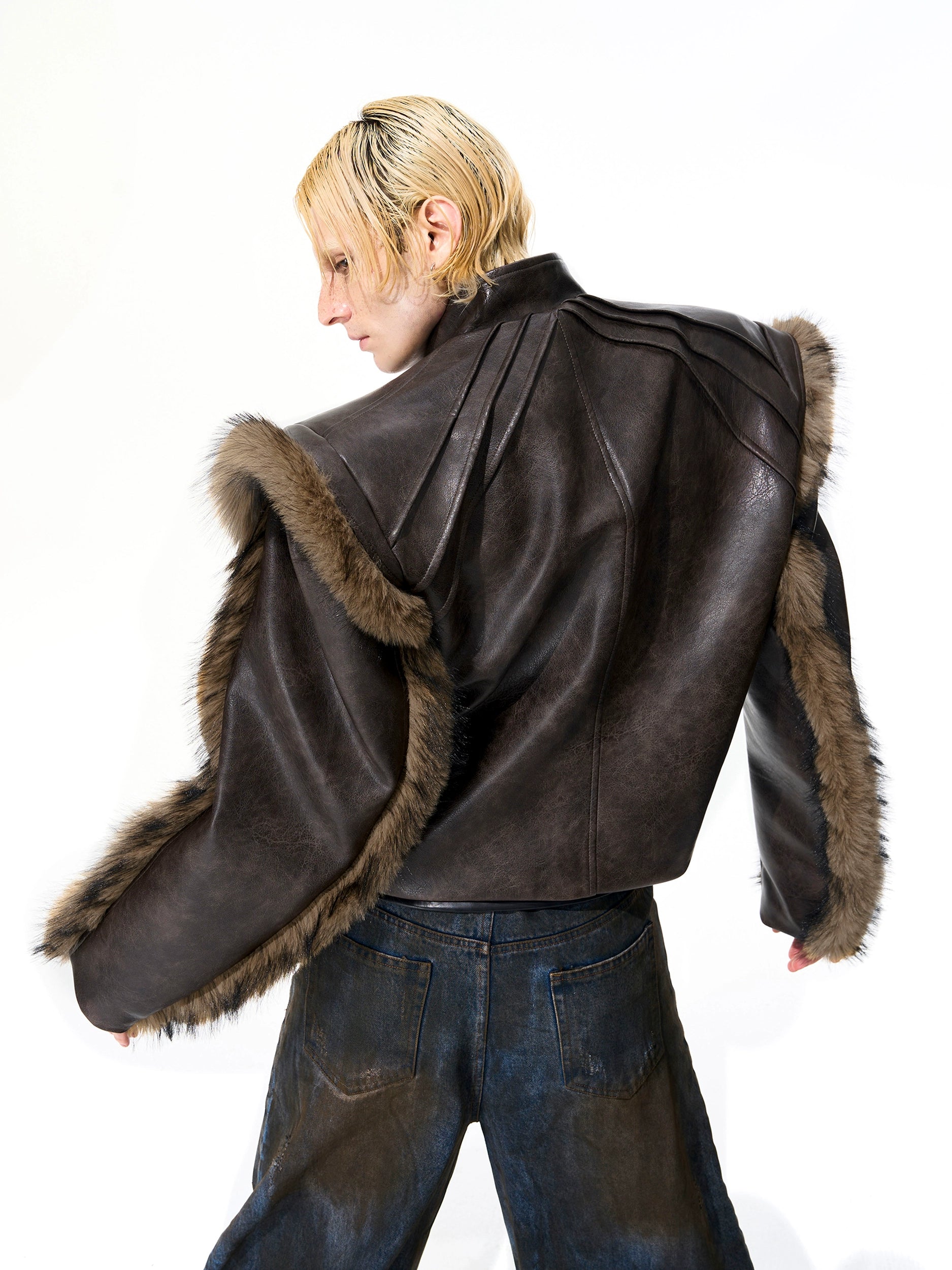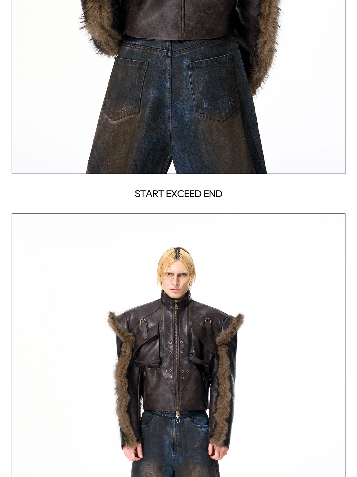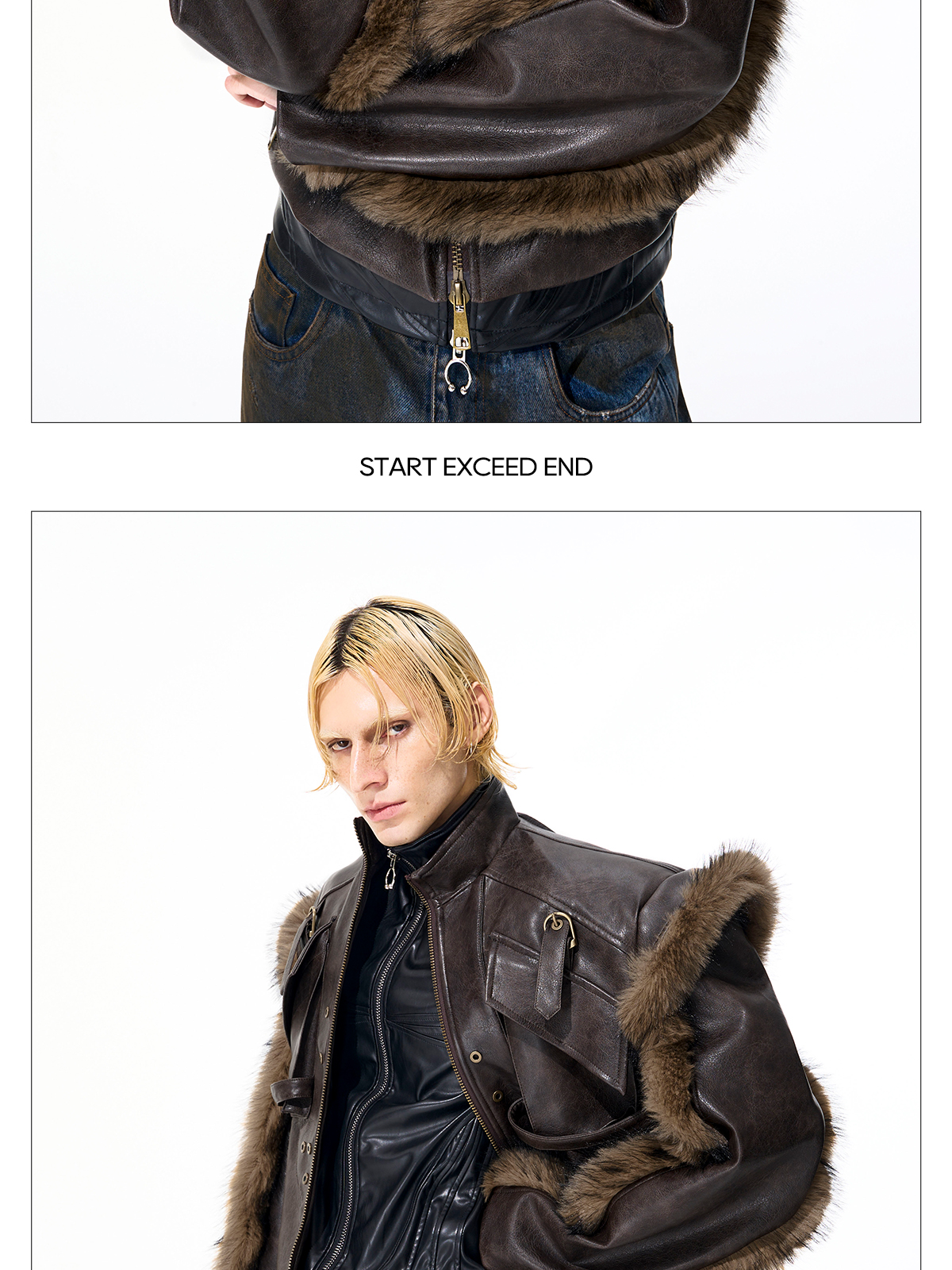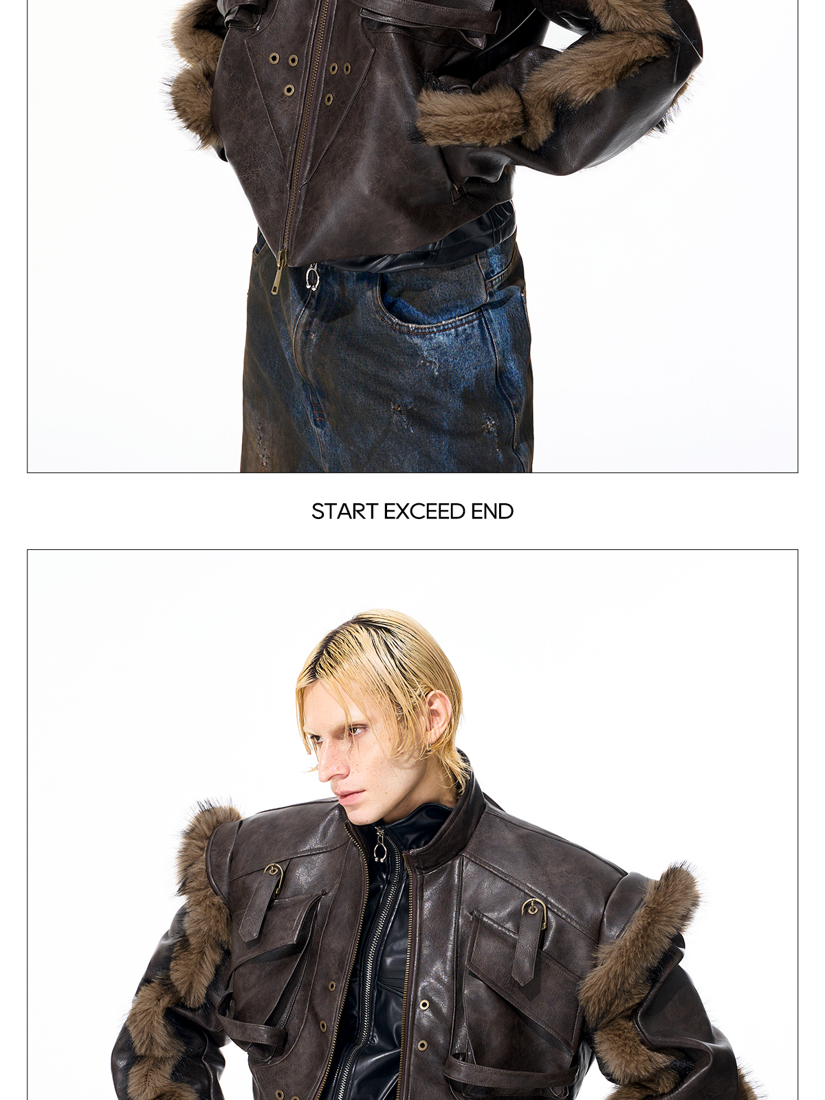 Washed Zipper Fake Fur Patchwork PU Leather Short Jacket WN21825