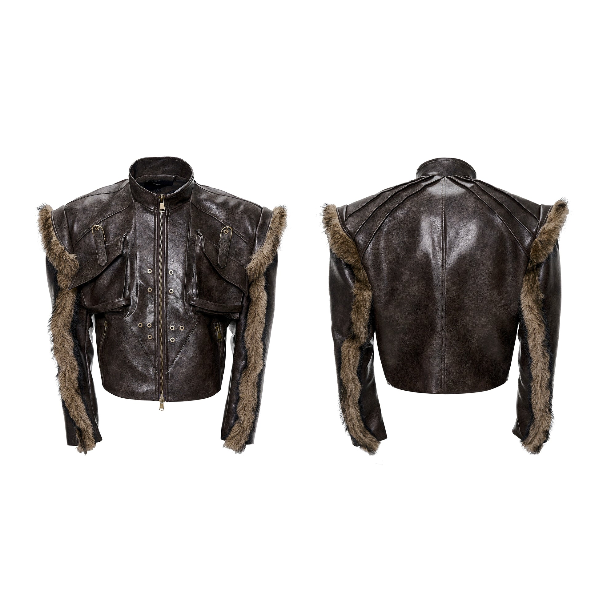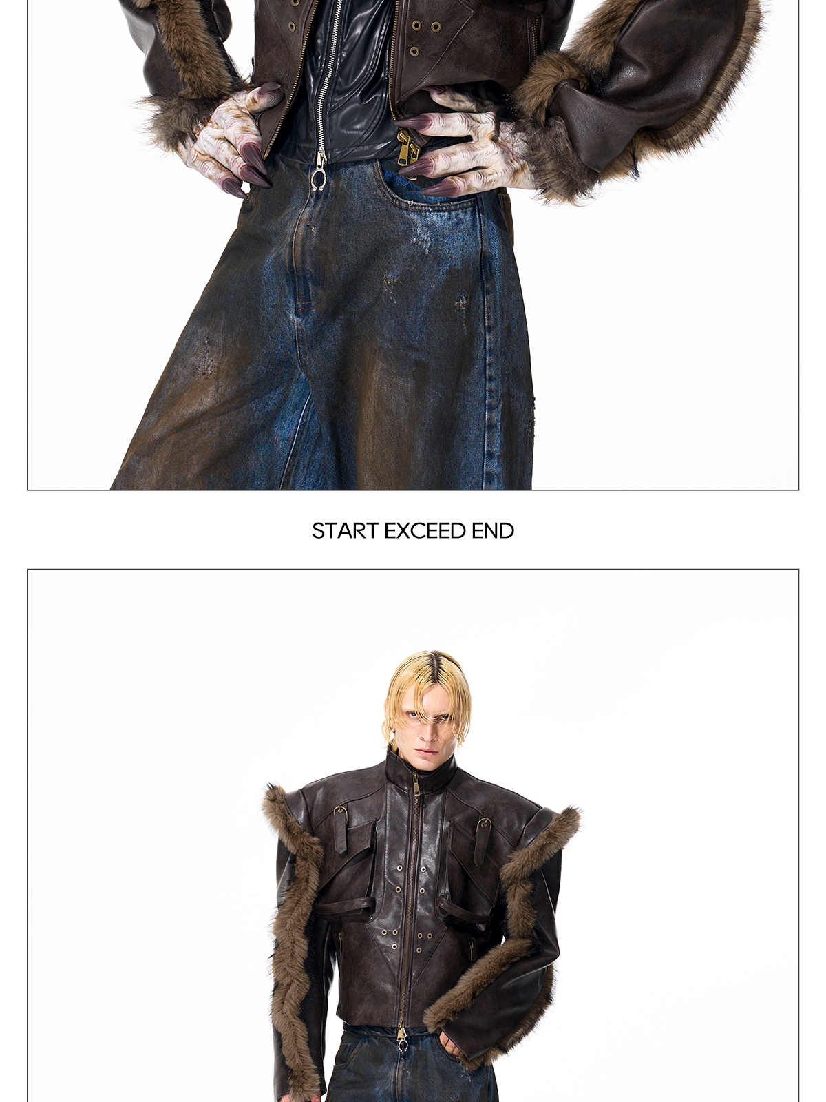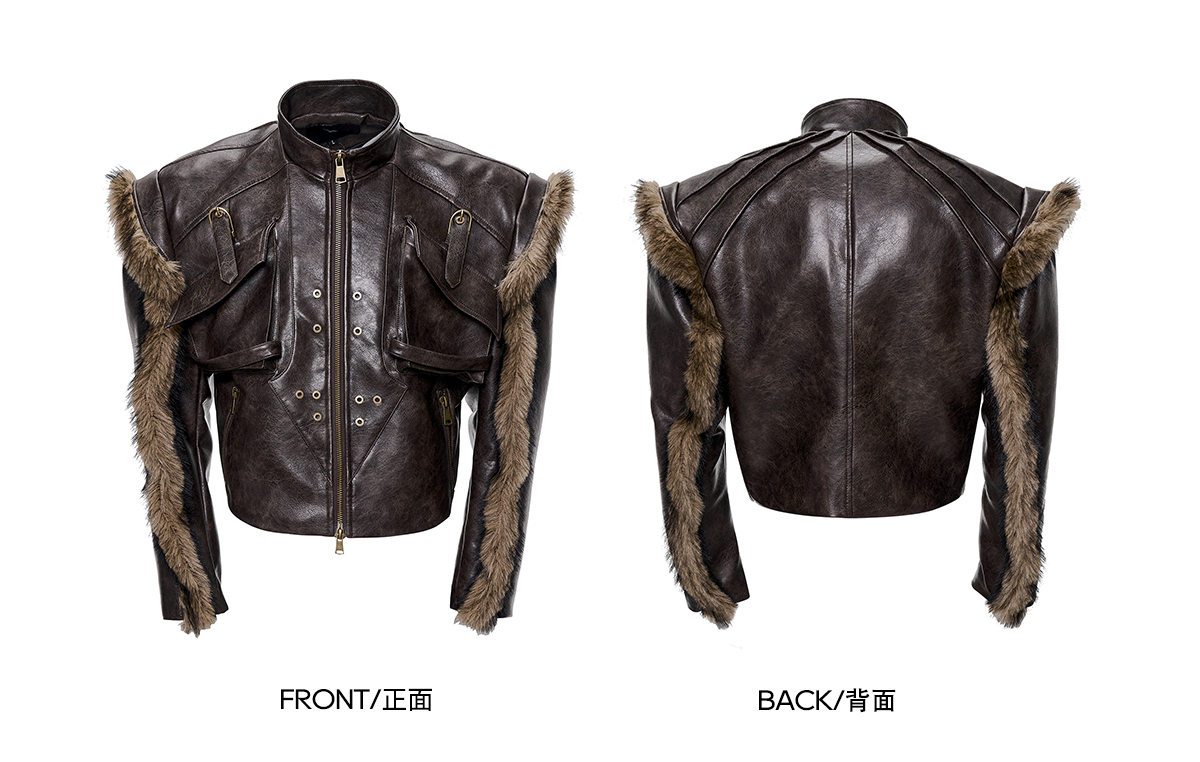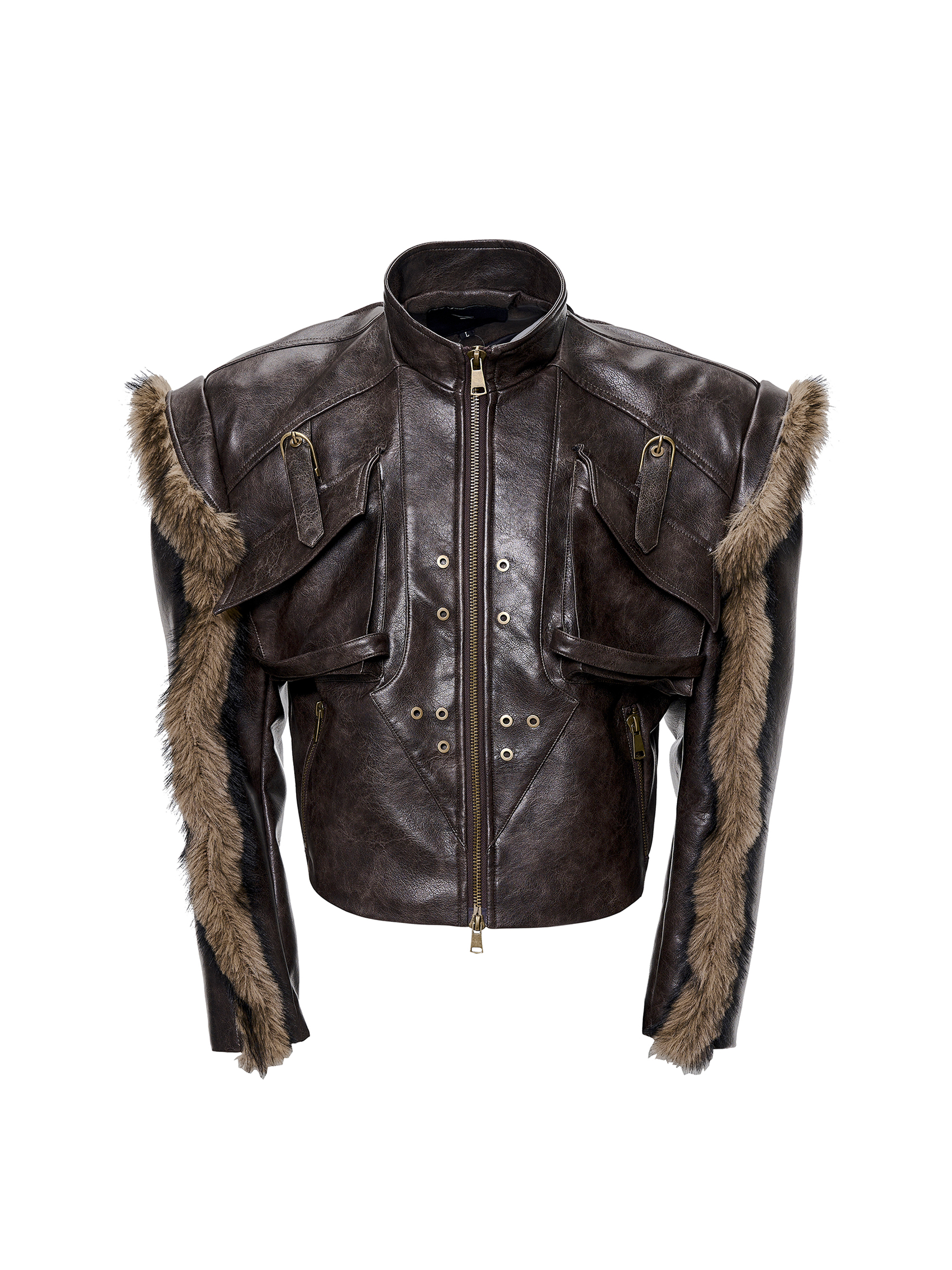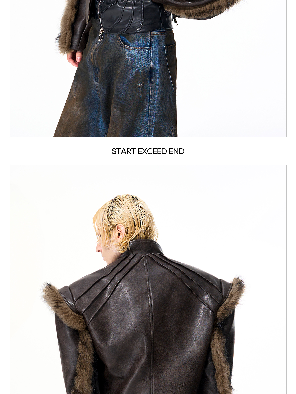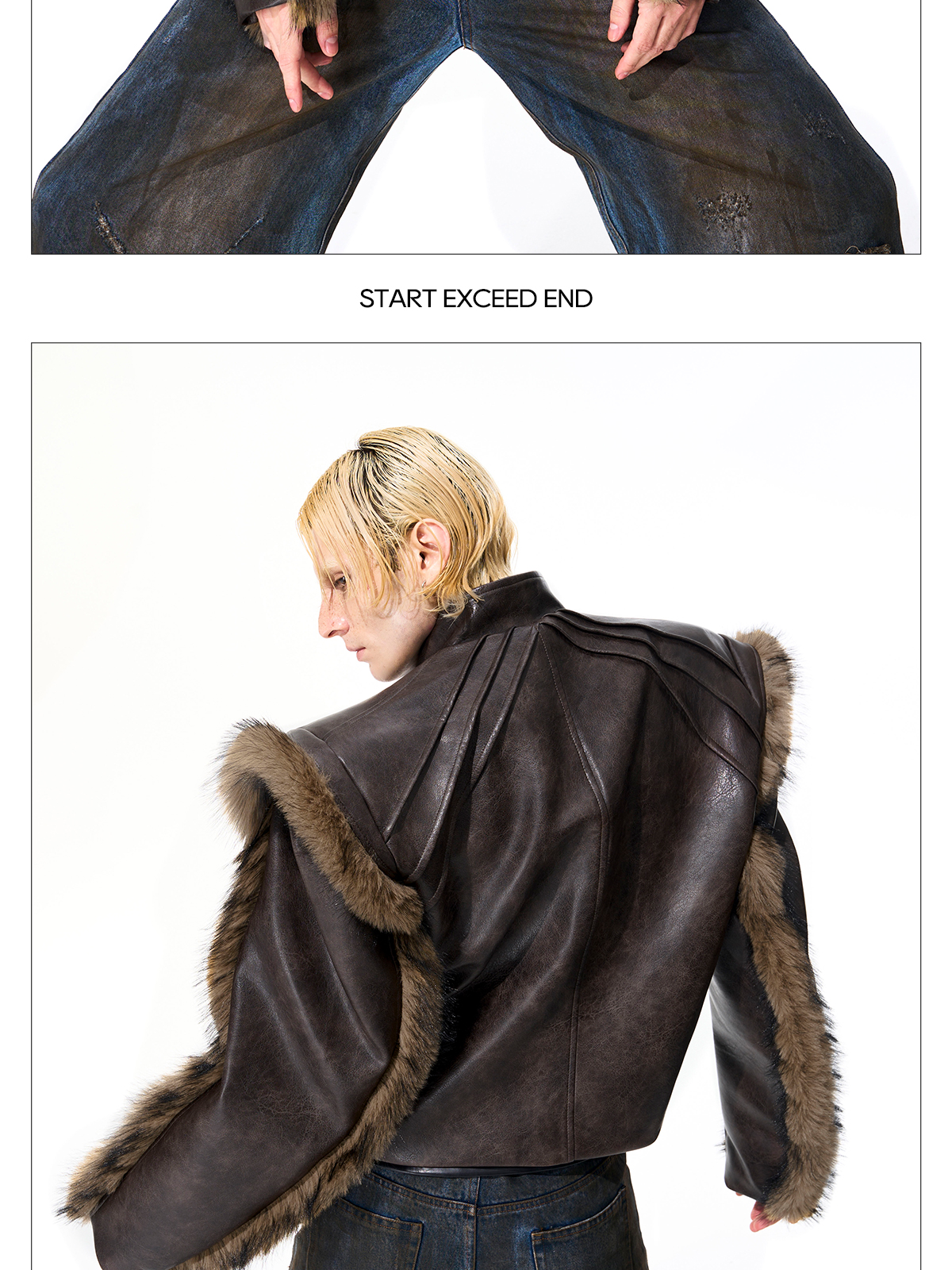 Washed Zipper Fake Fur Patchwork PU Leather Short Jacket WN21825