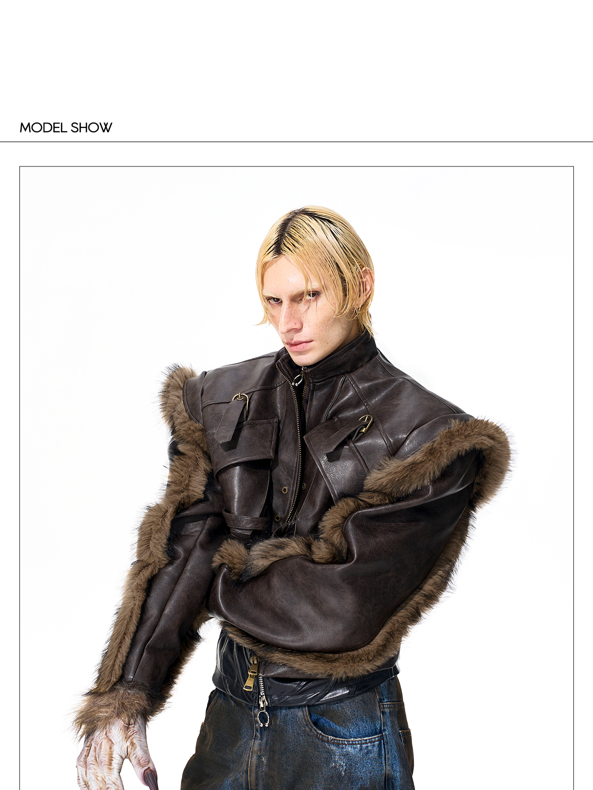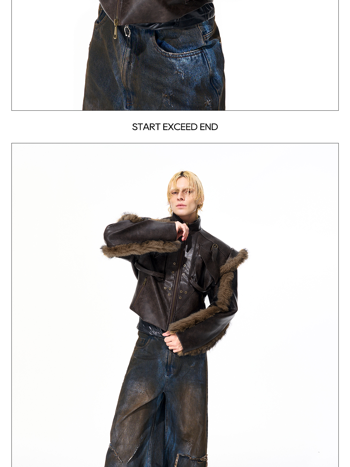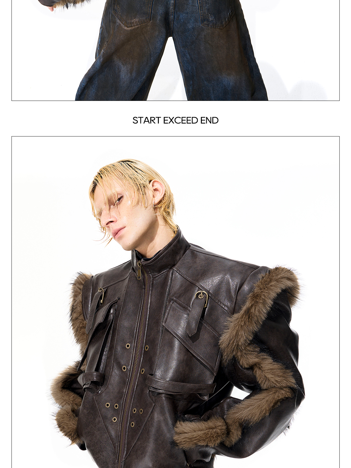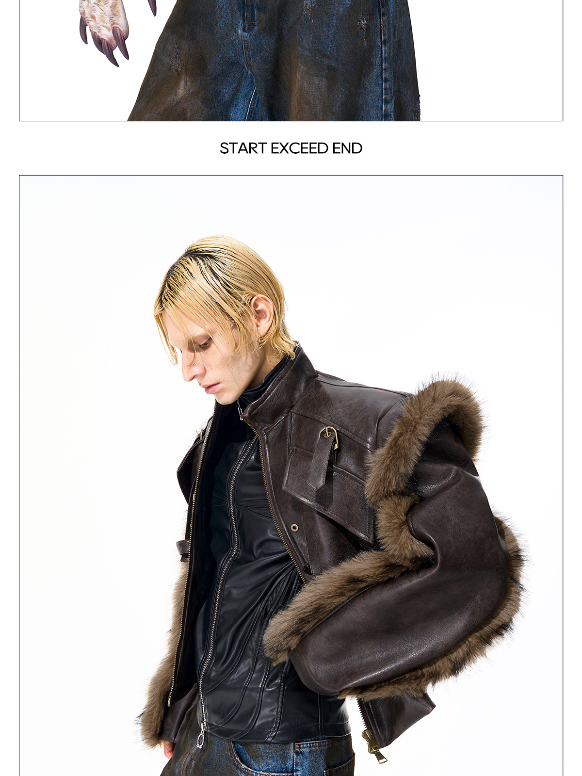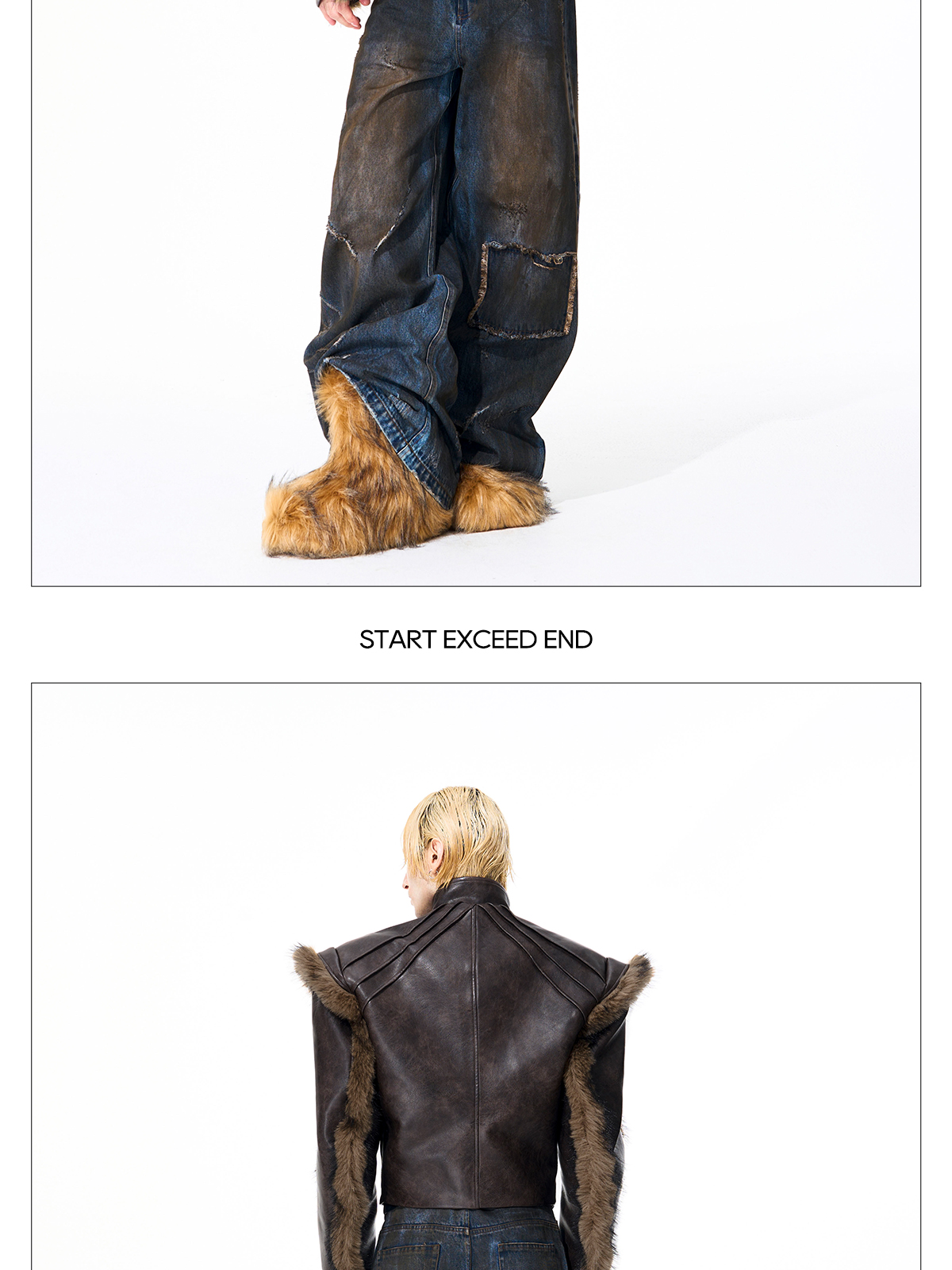 Washed Zipper Fake Fur Patchwork PU Leather Short Jacket WN21825