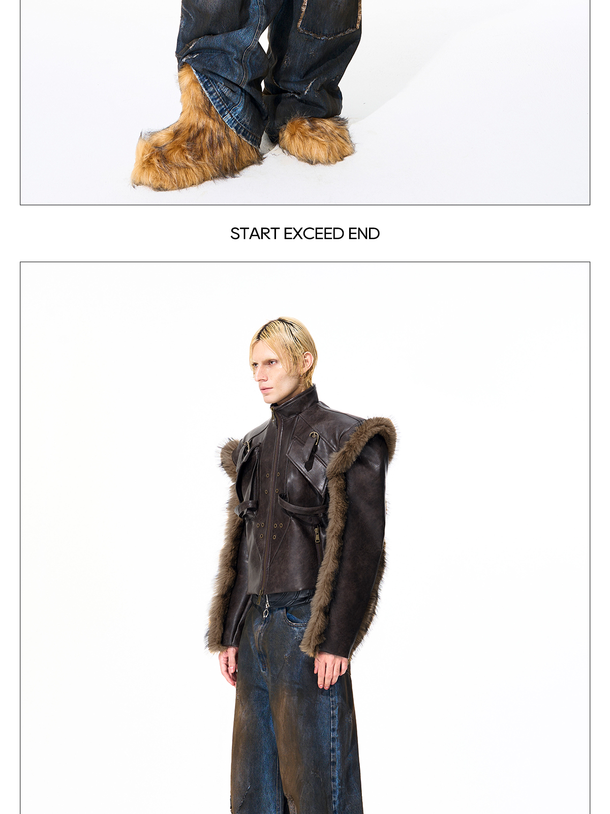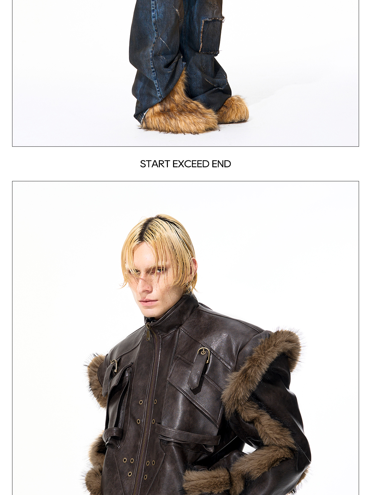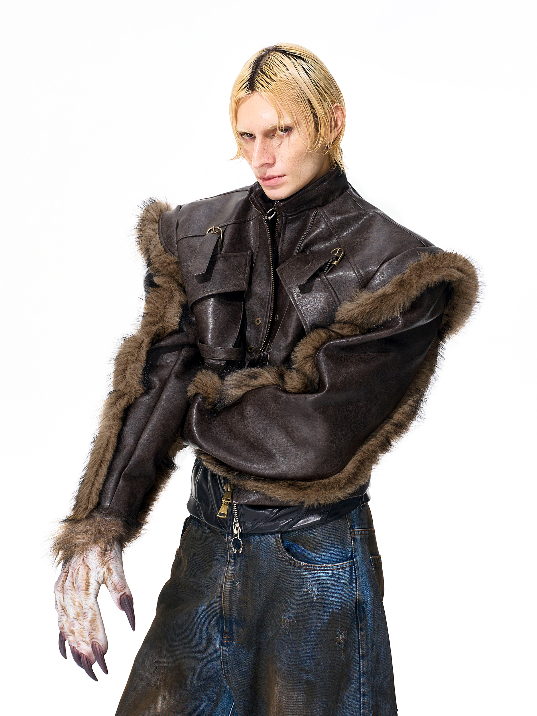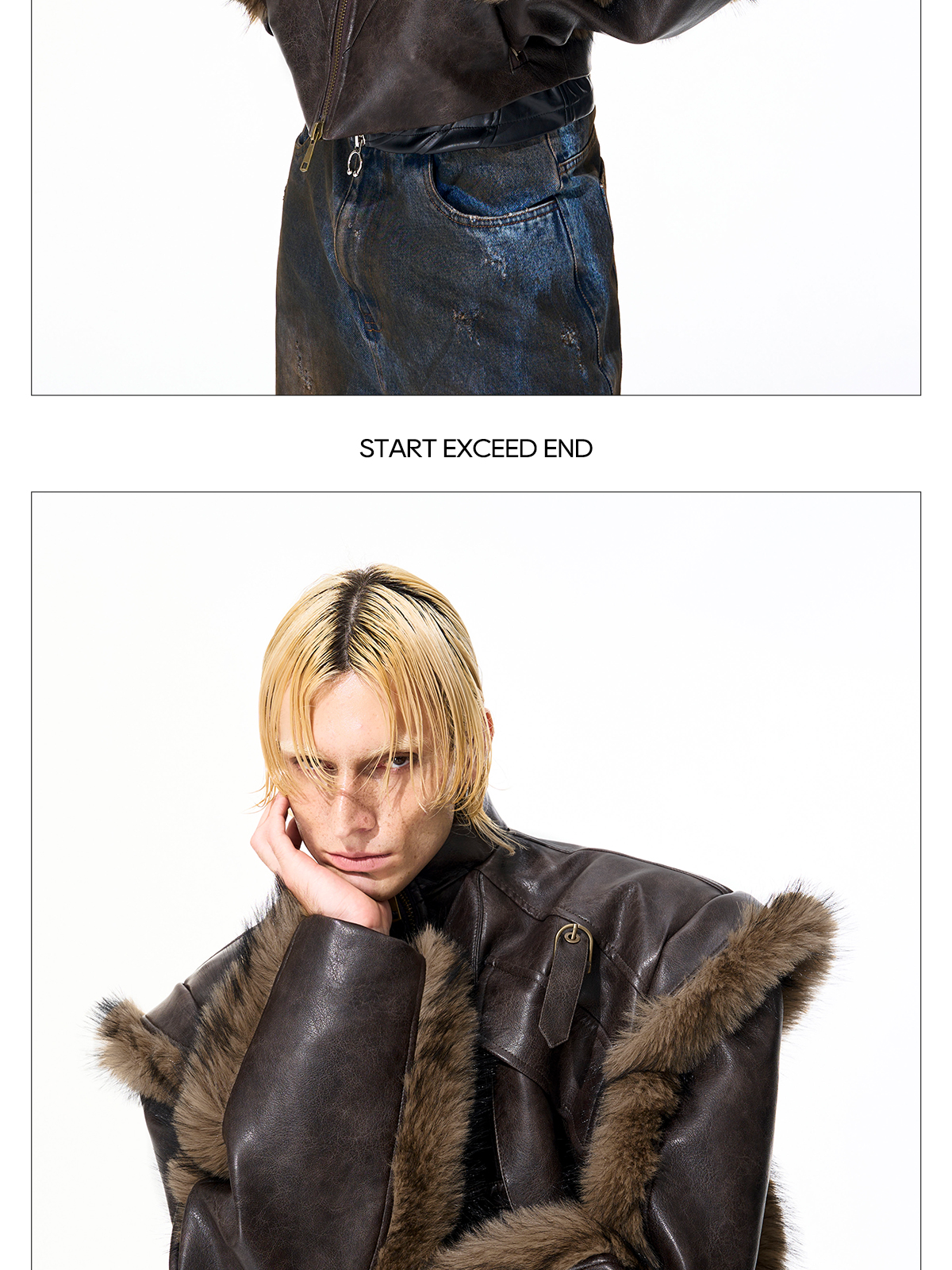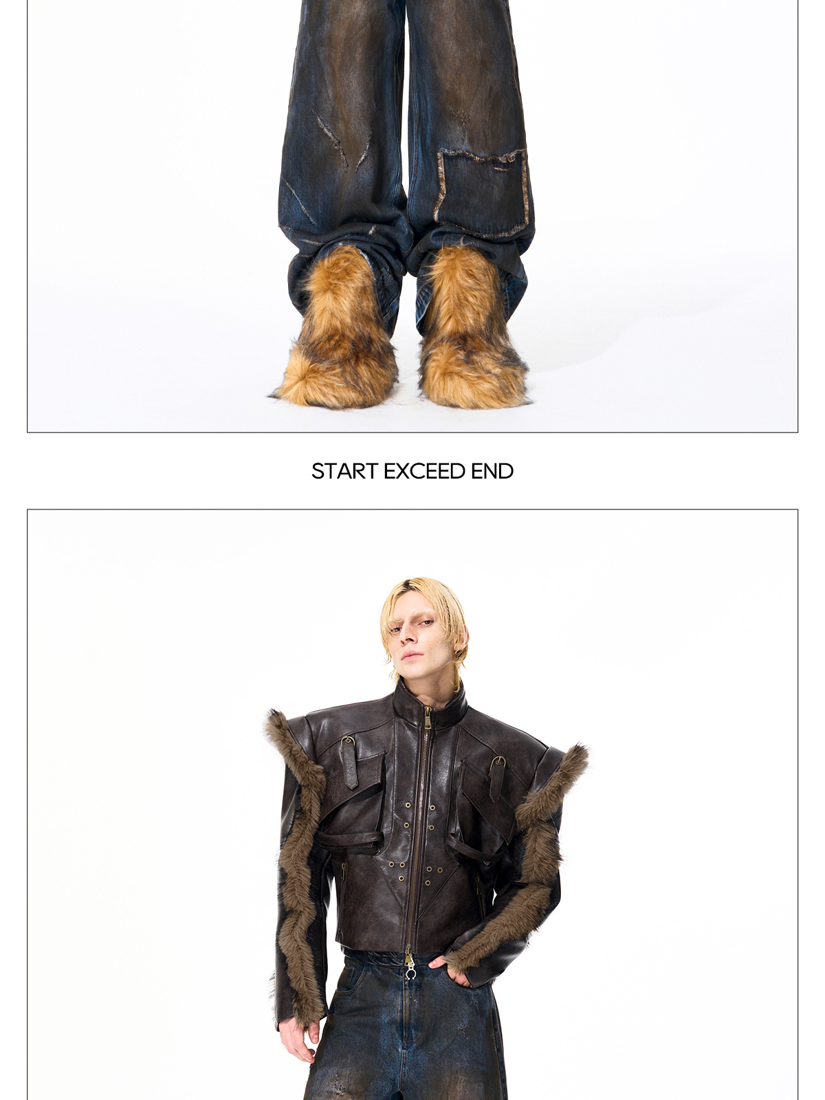 Washed Zipper Fake Fur Patchwork PU Leather Short Jacket WN21825