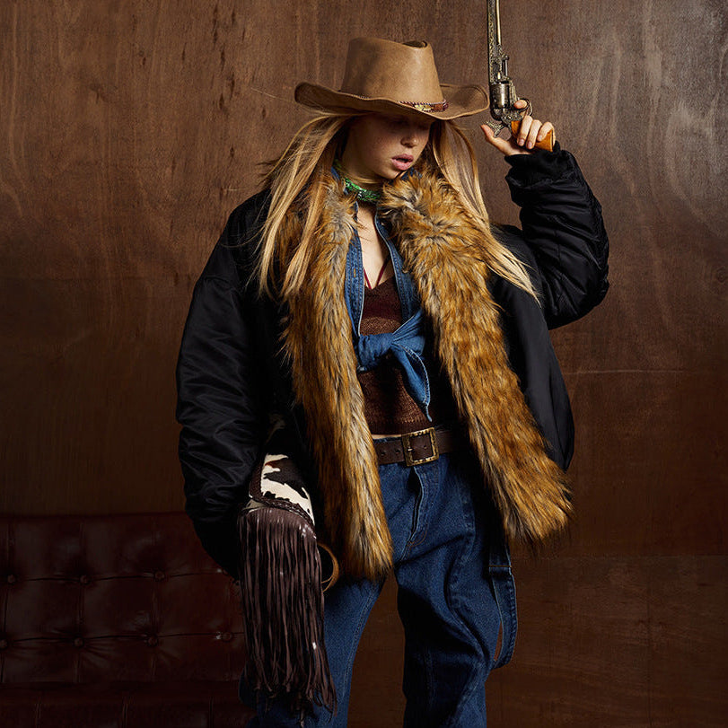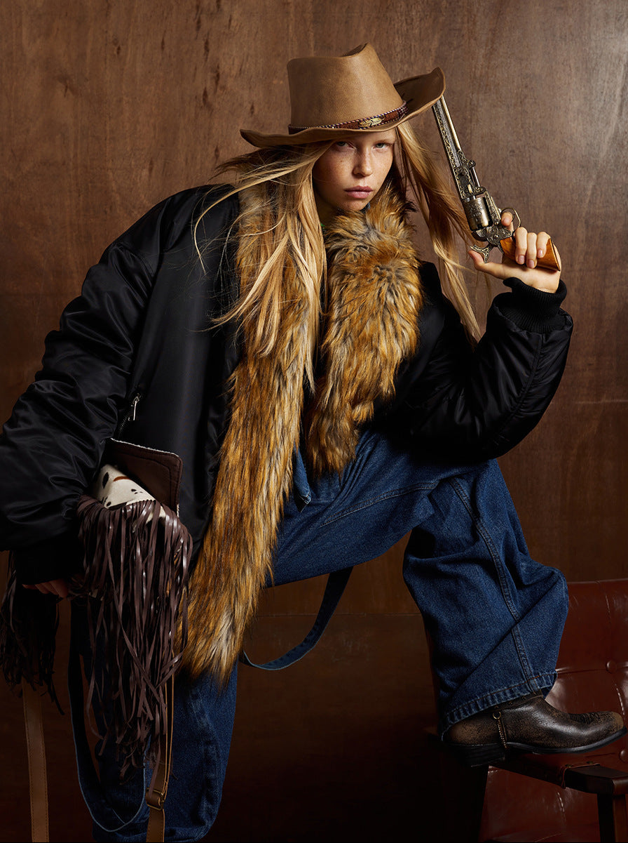 Zipper Pocket Fake Fur Collar Fleece Lining Puffer Jacket WN21890