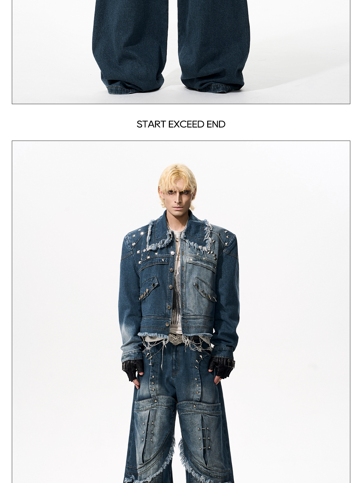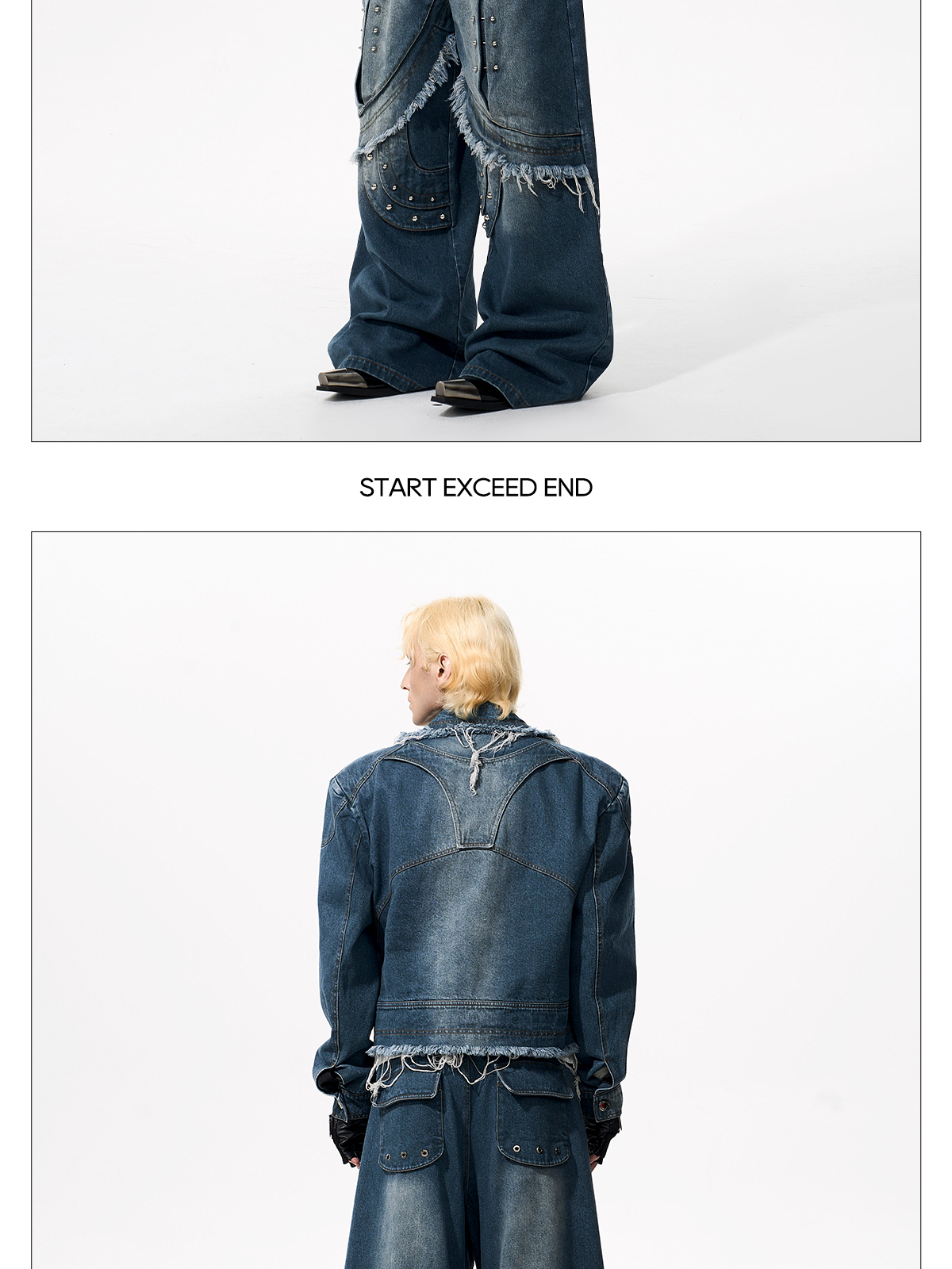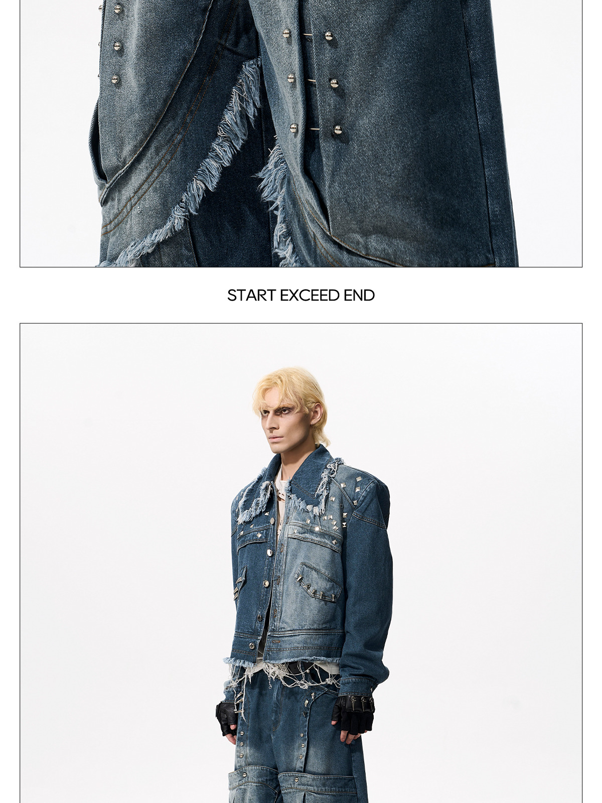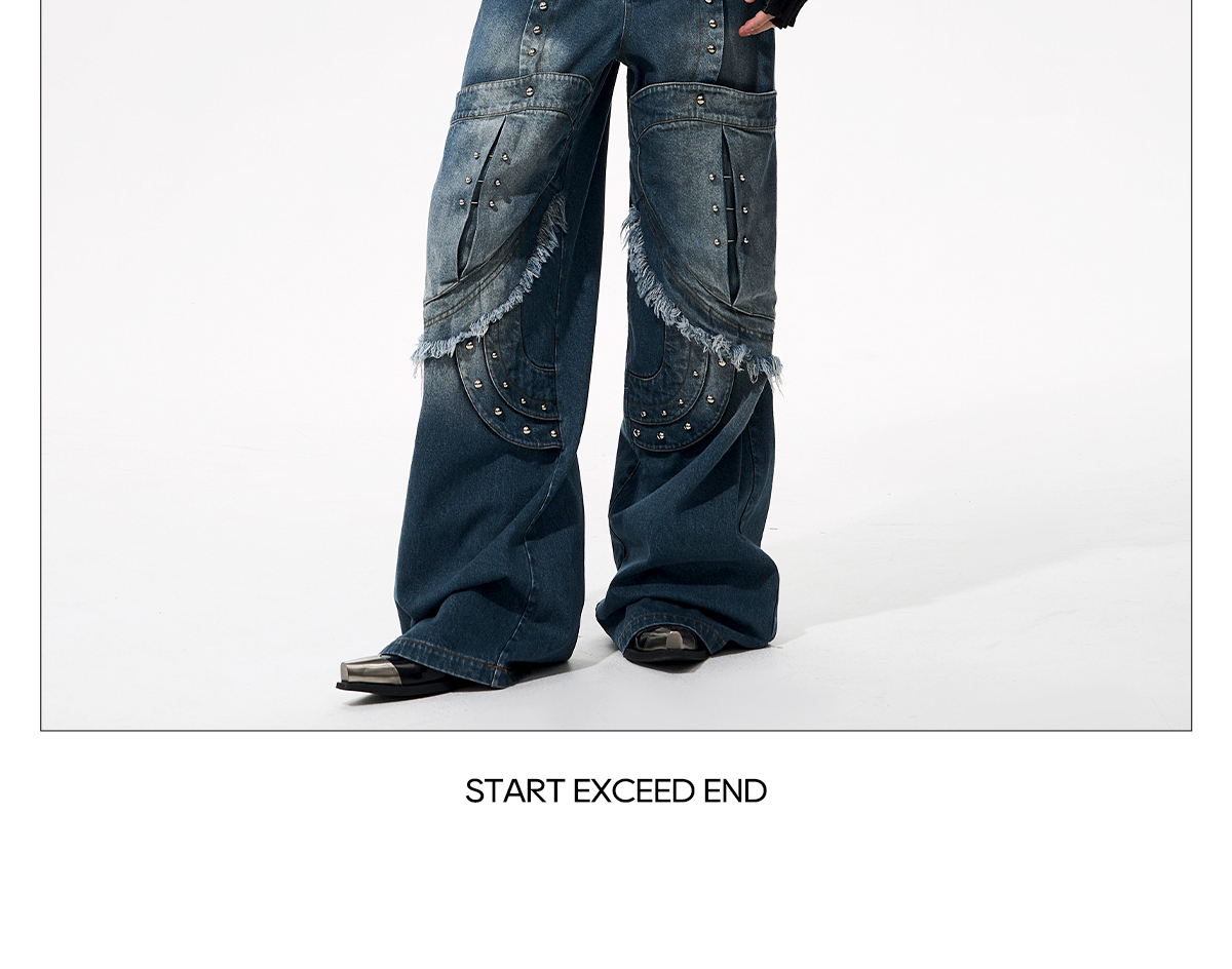 Deconstructed Metal Rivet Washed Damage Straight Denim Jeans & Denim Jacket Setup WN21968