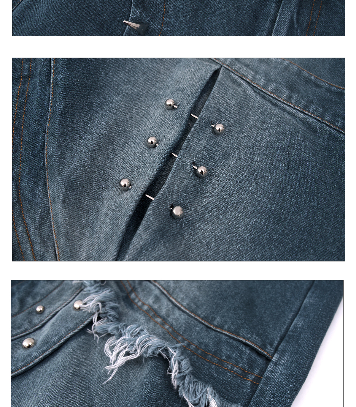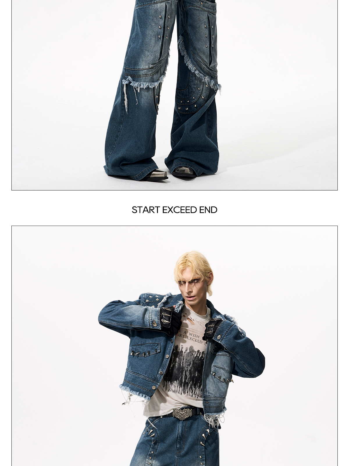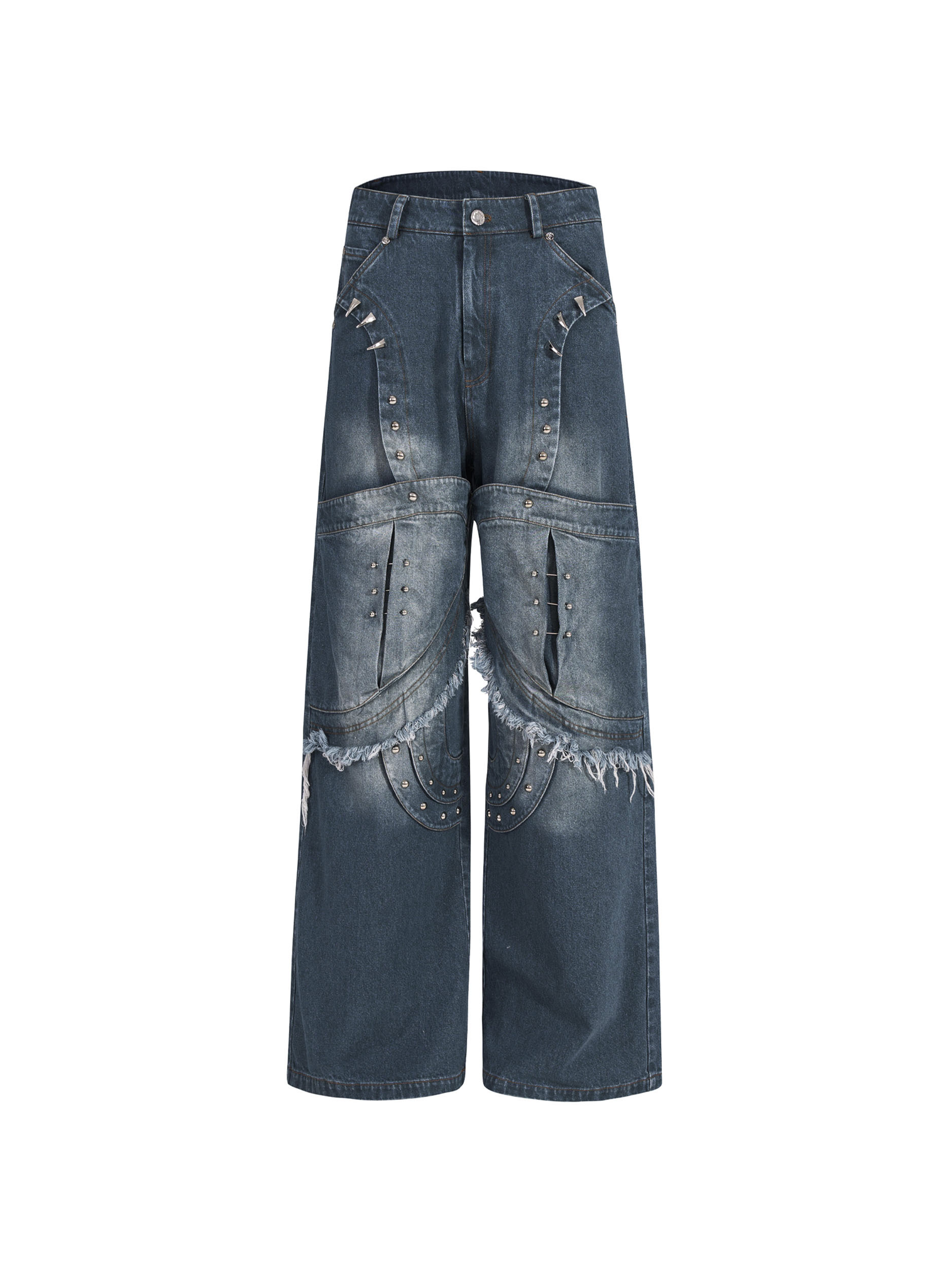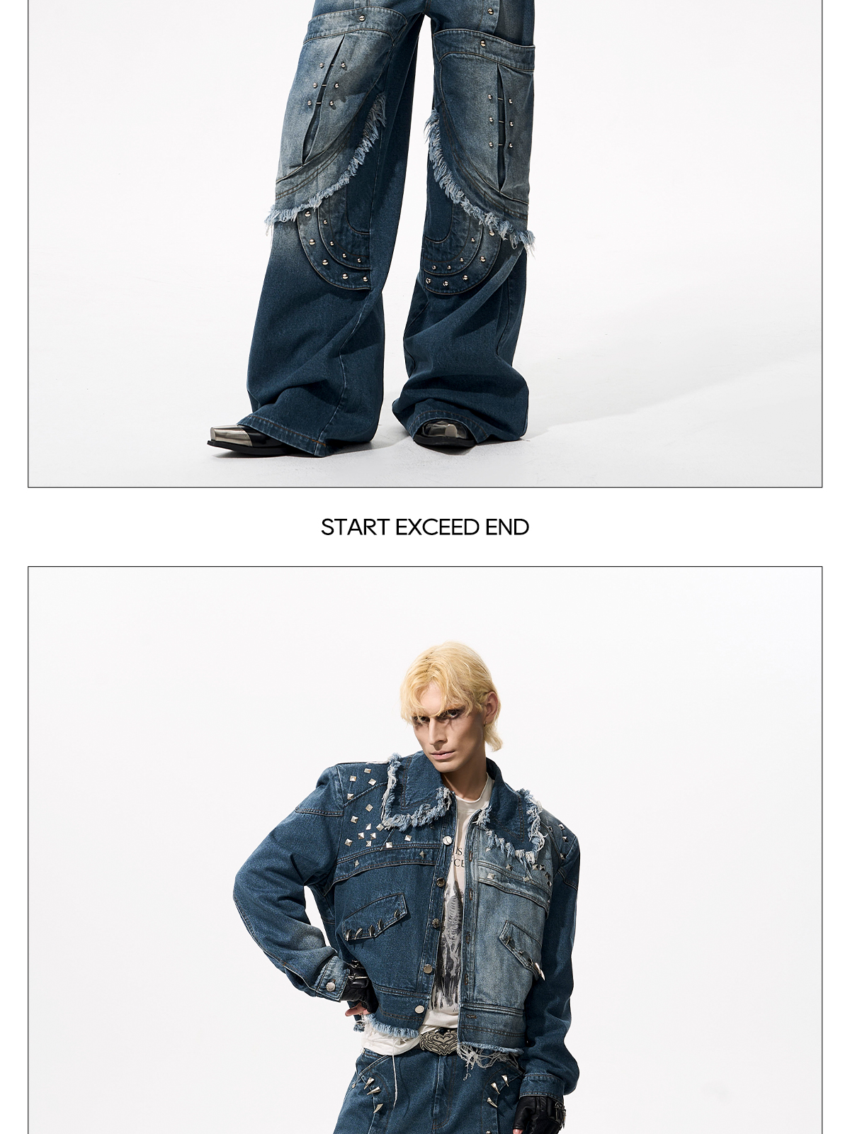 Deconstructed Metal Rivet Washed Damage Straight Denim Jeans & Denim Jacket Setup WN21968