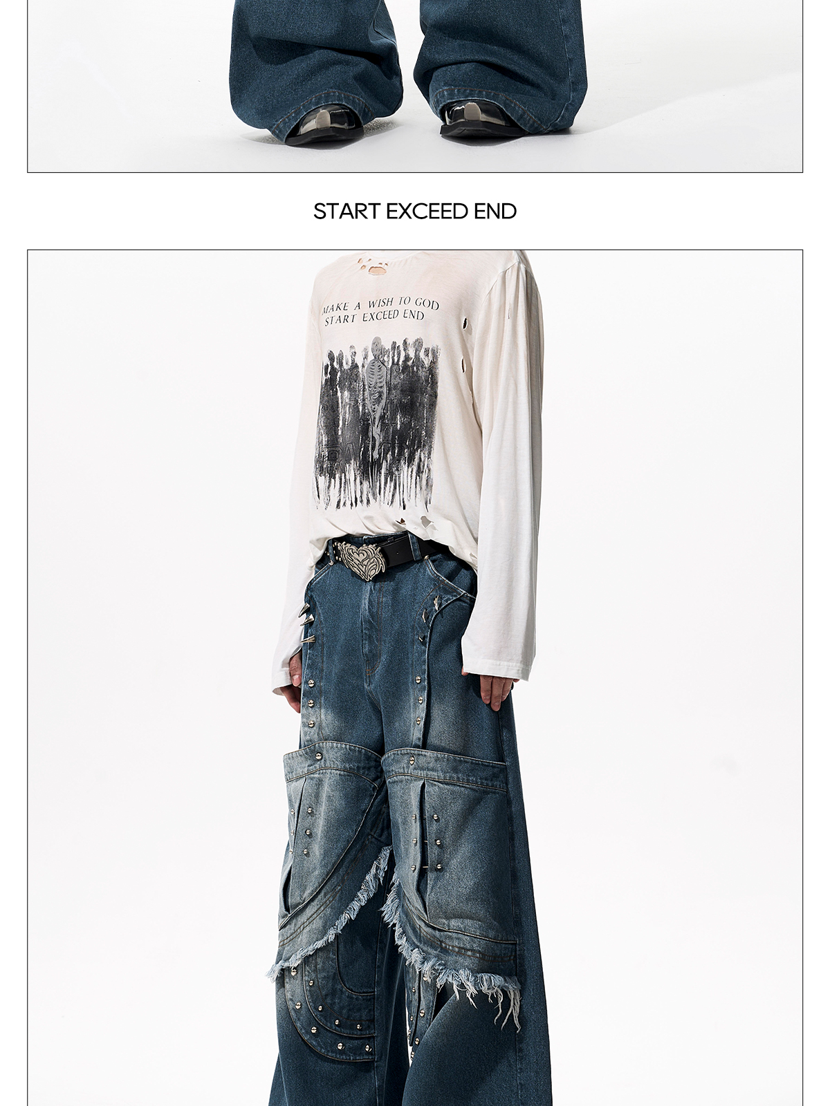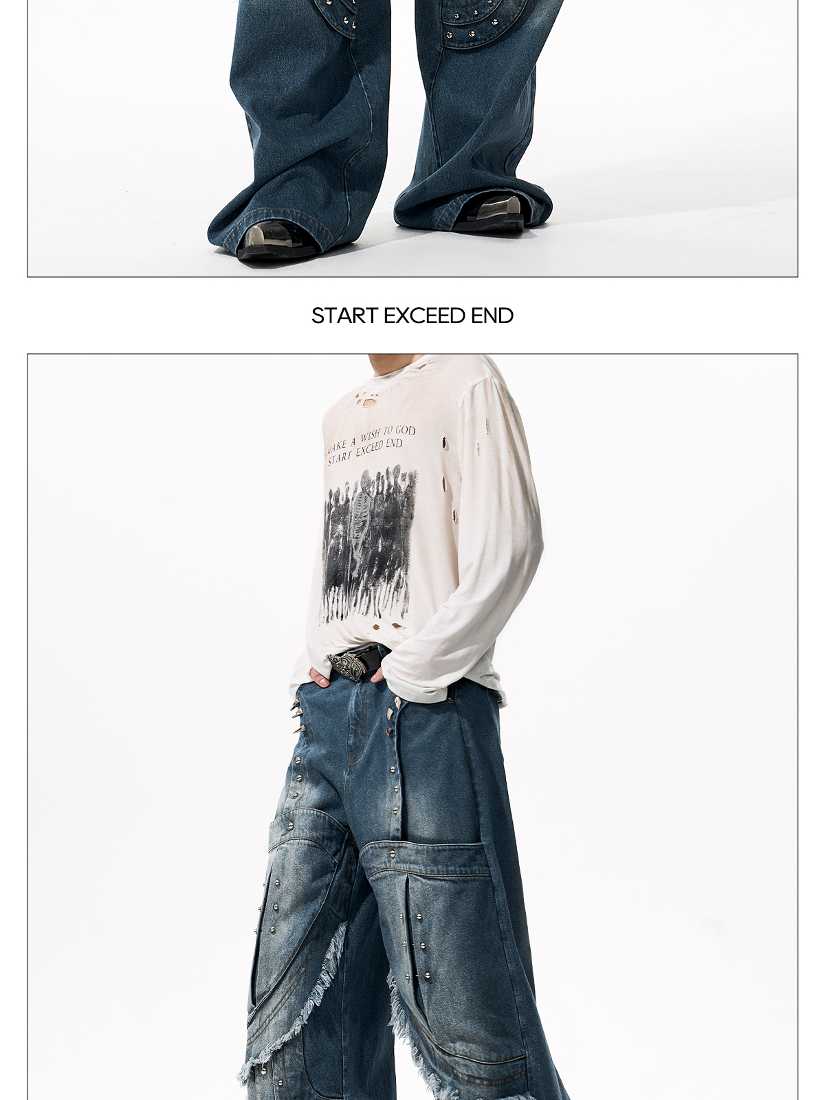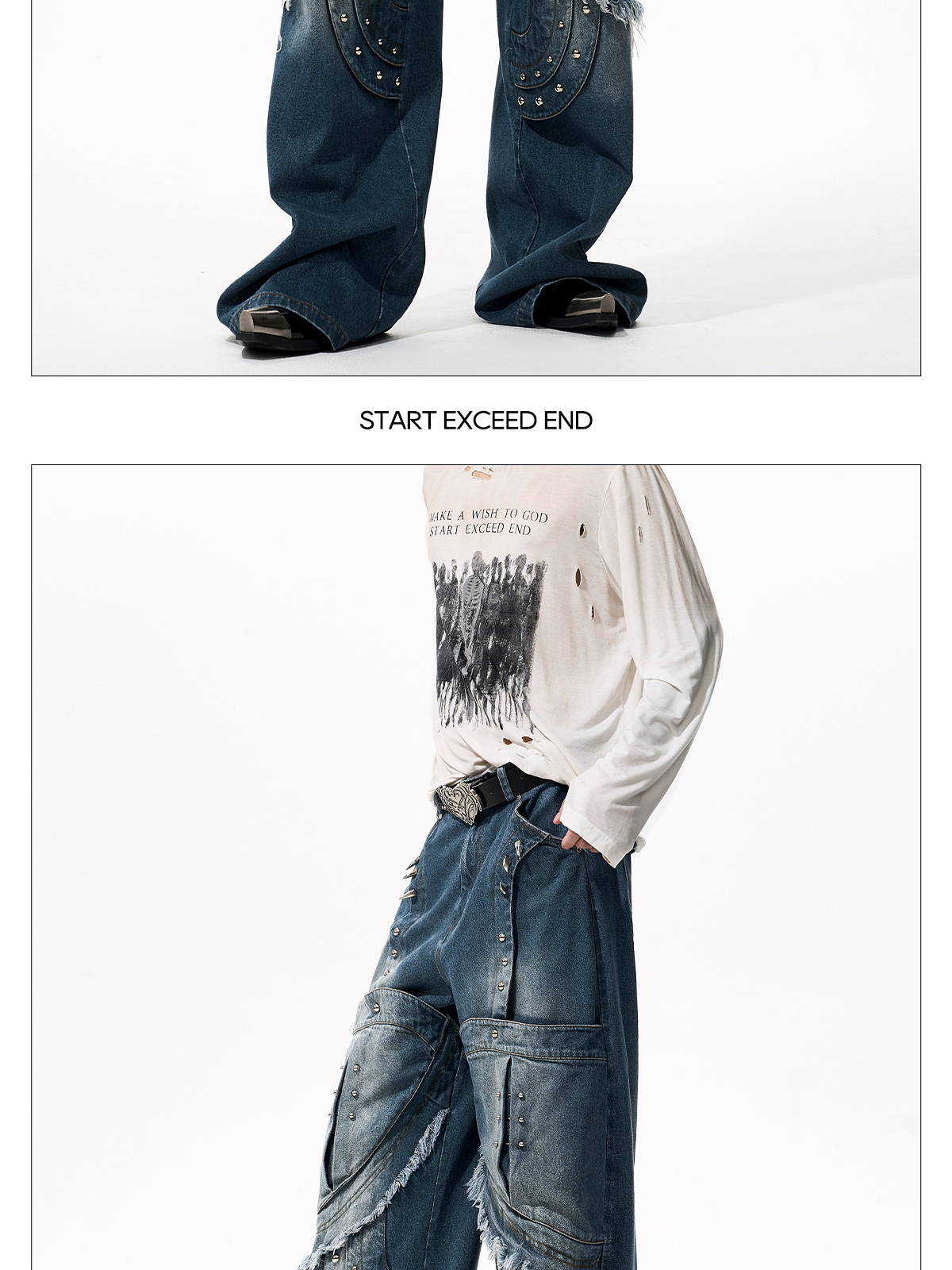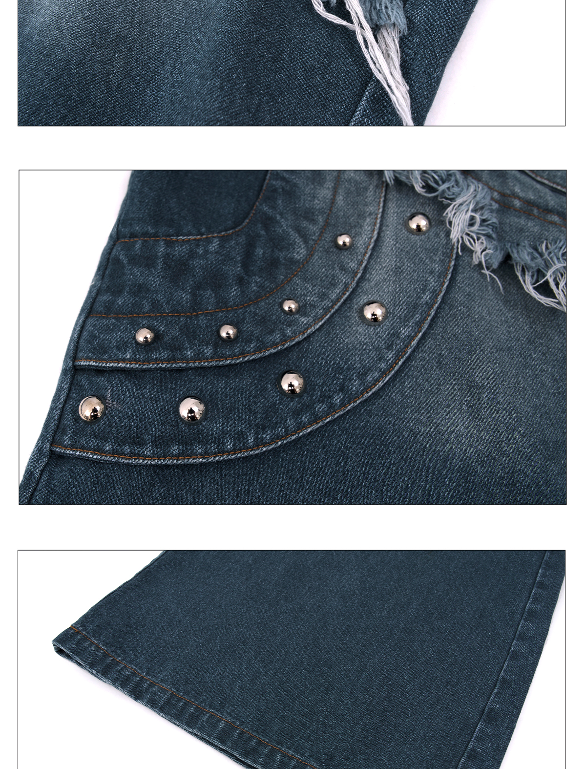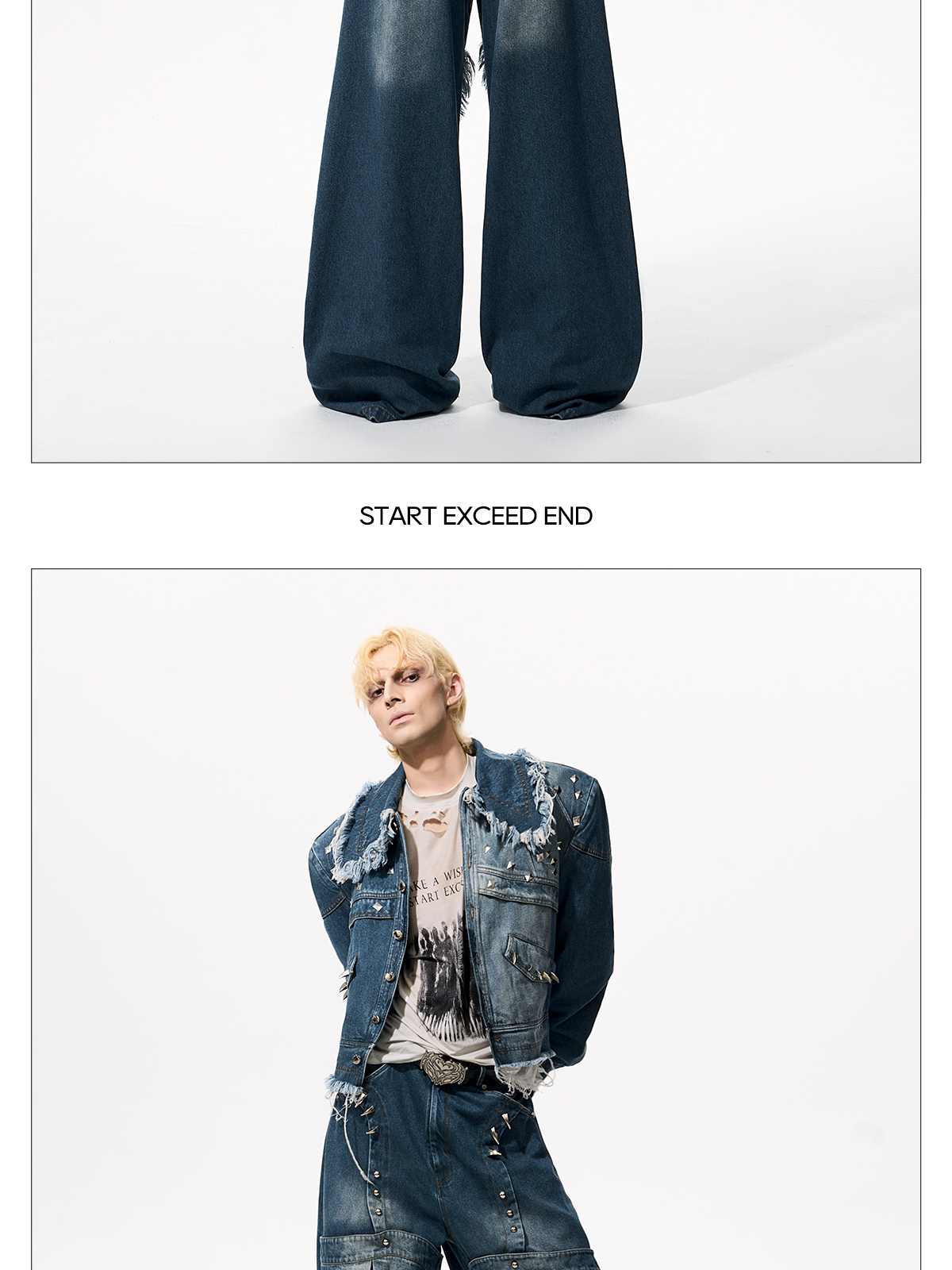Deconstructed Metal Rivet Washed Damage Straight Denim Jeans & Denim Jacket Setup WN21968