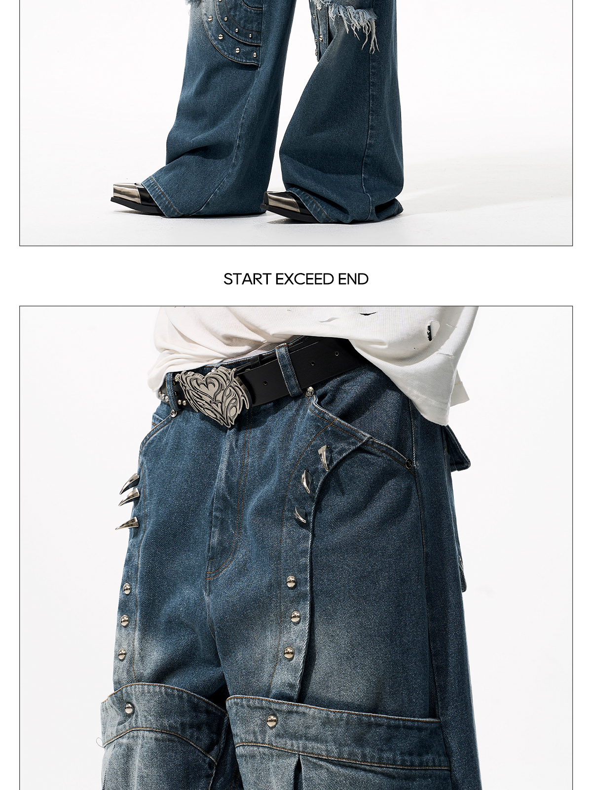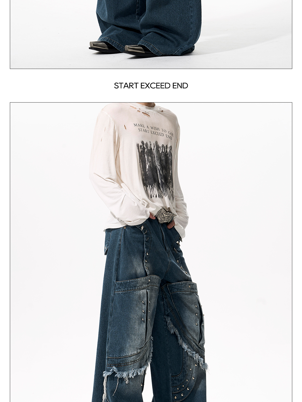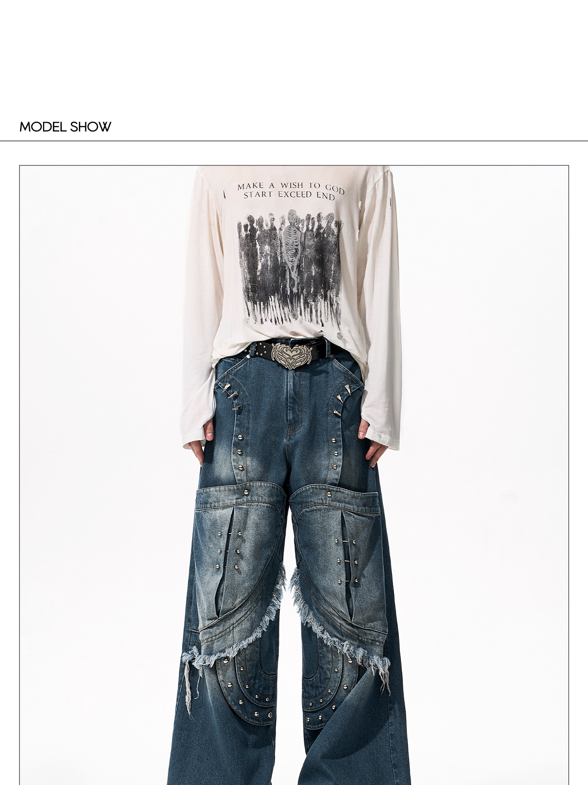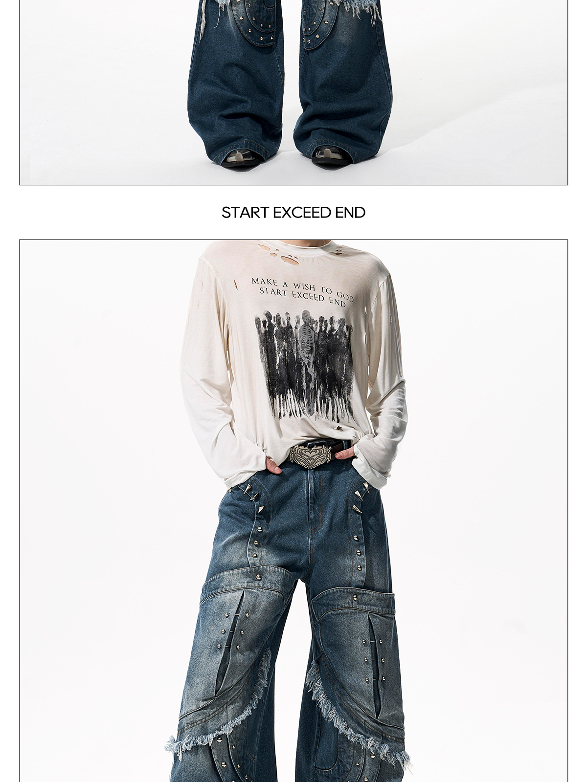 Deconstructed Metal Rivet Washed Damage Straight Denim Jeans & Denim Jacket Setup WN21968