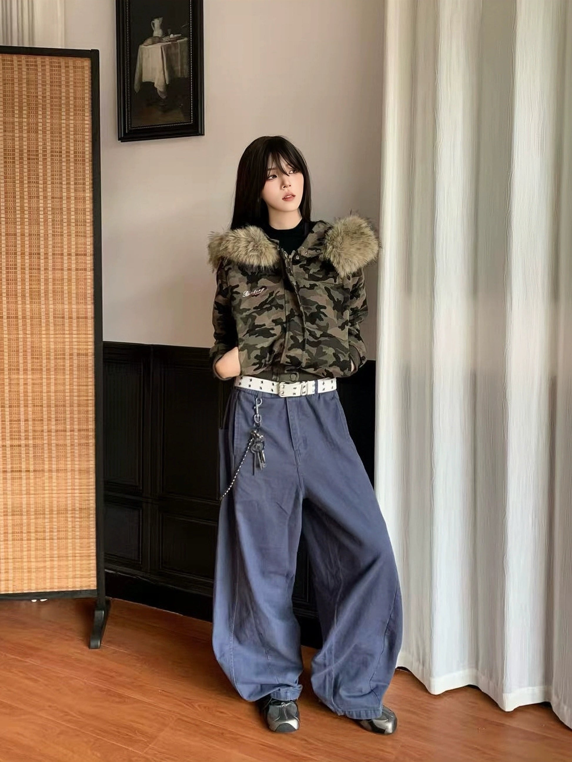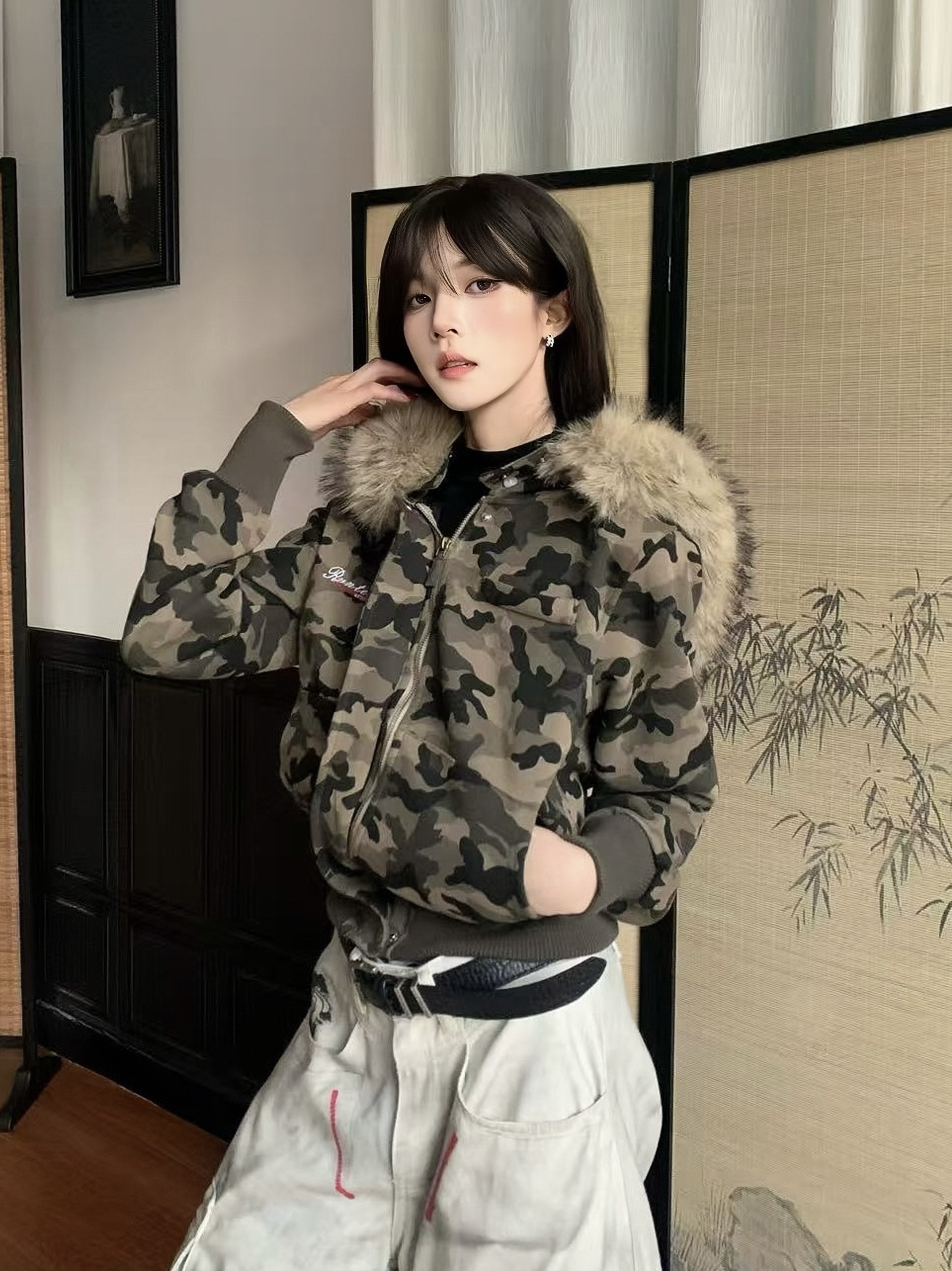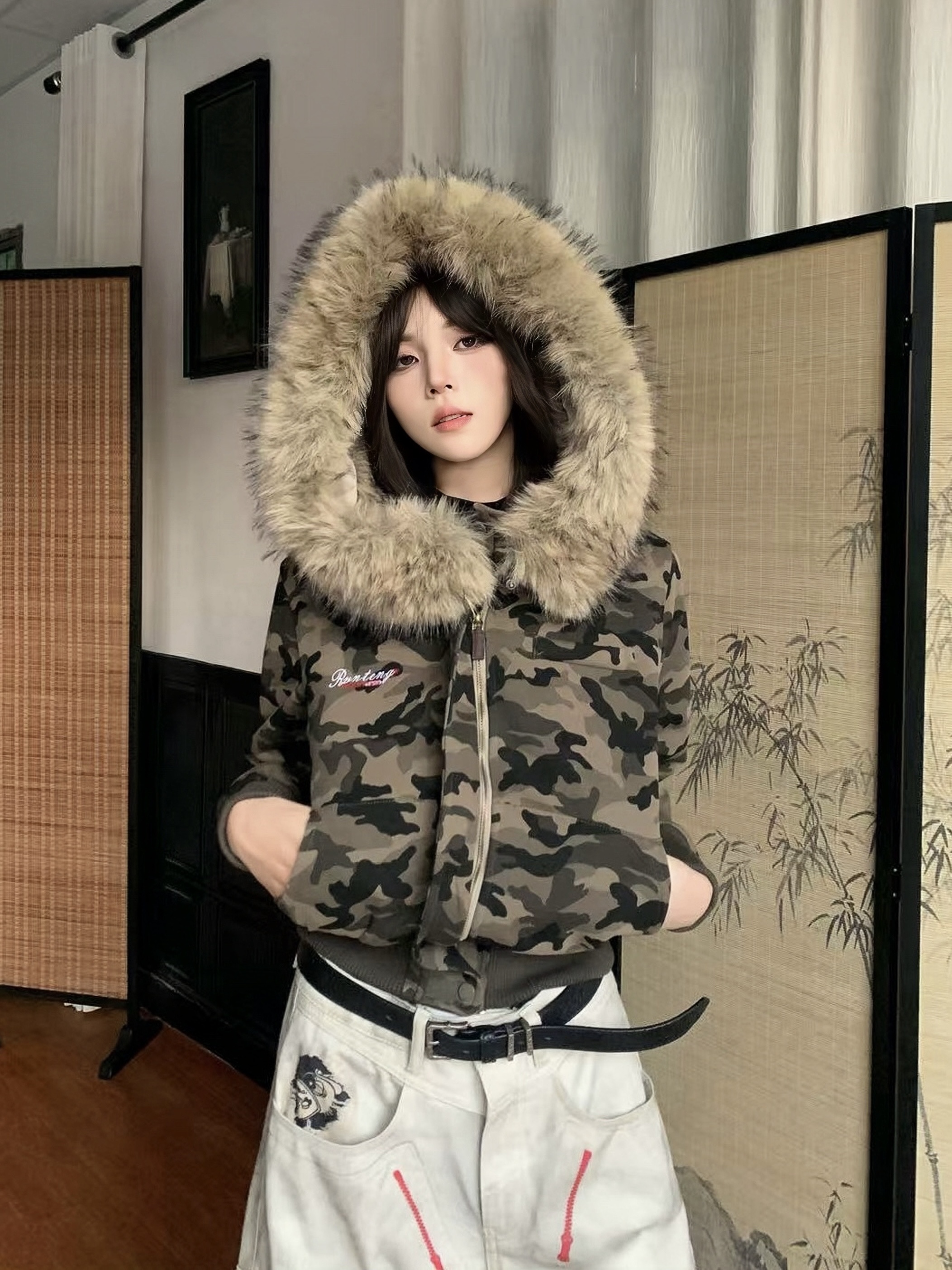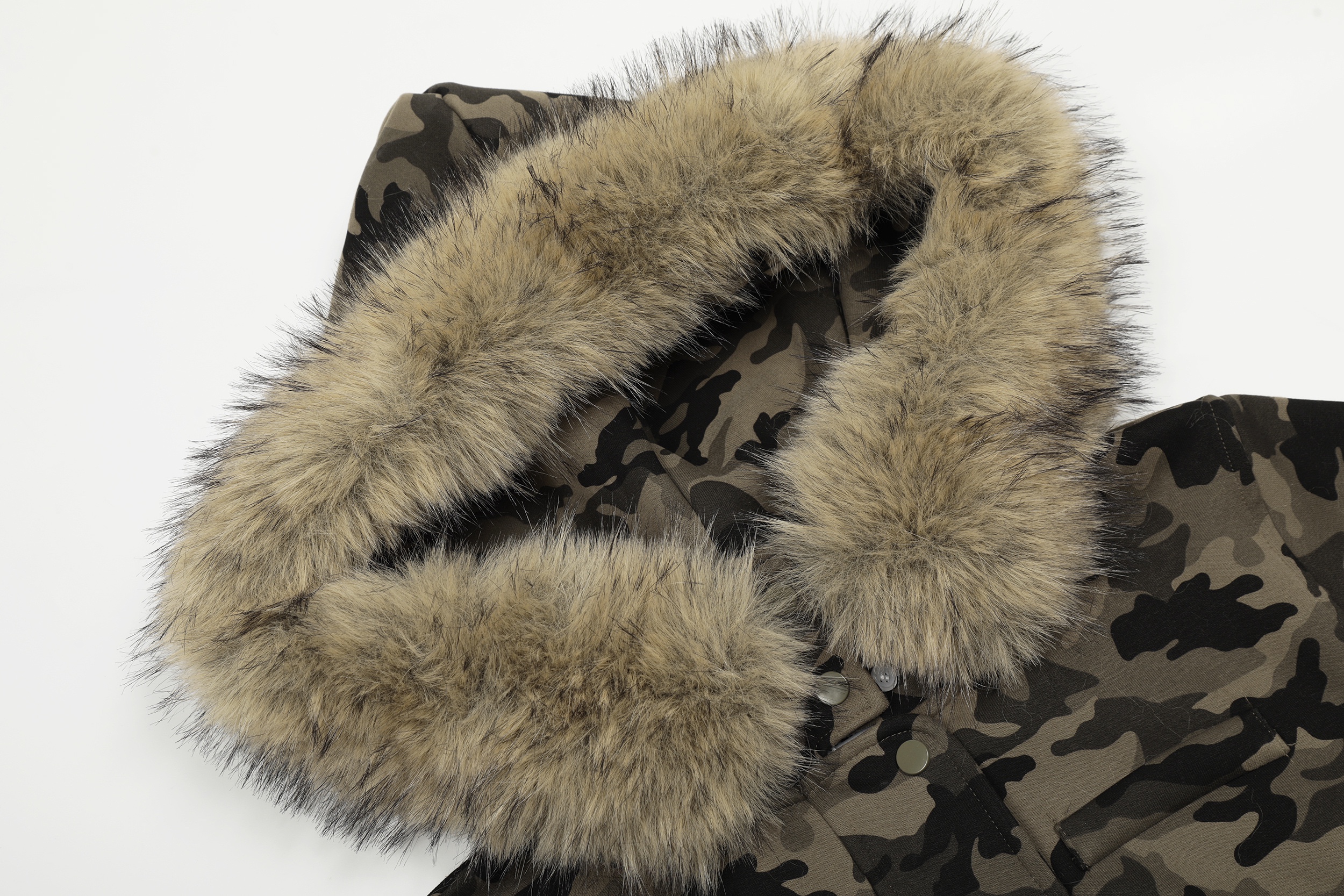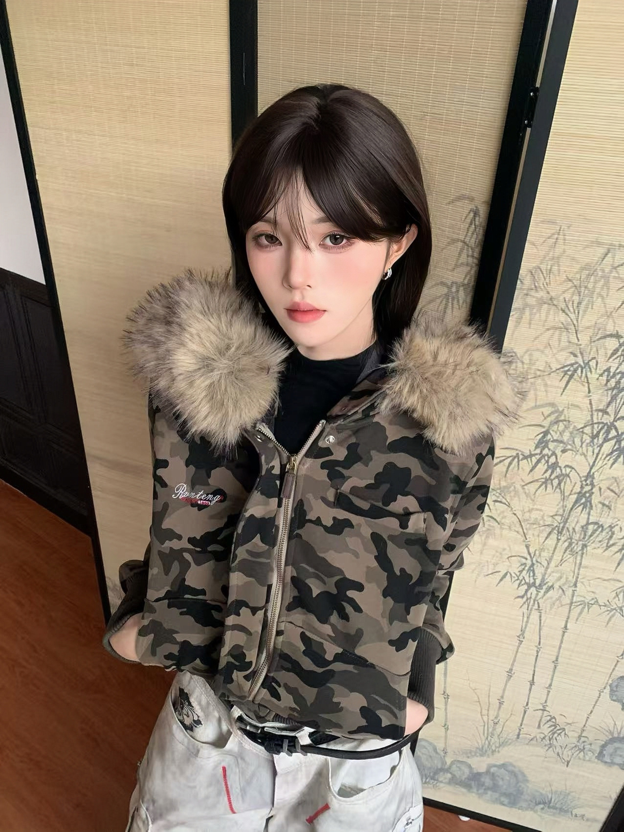 Camouflage Detachable Fake Fur-Collar Hooded Short Jacket WN22171
