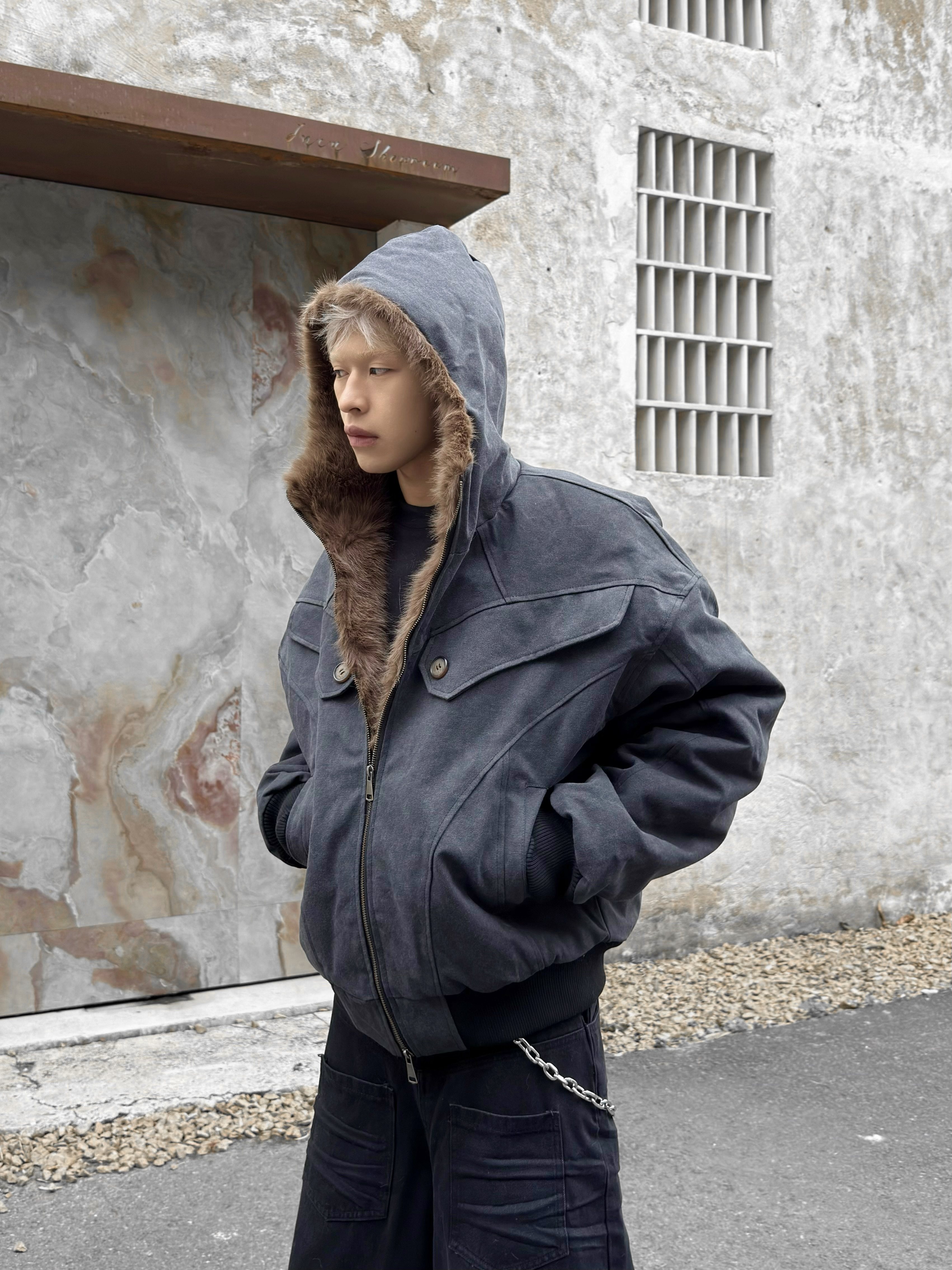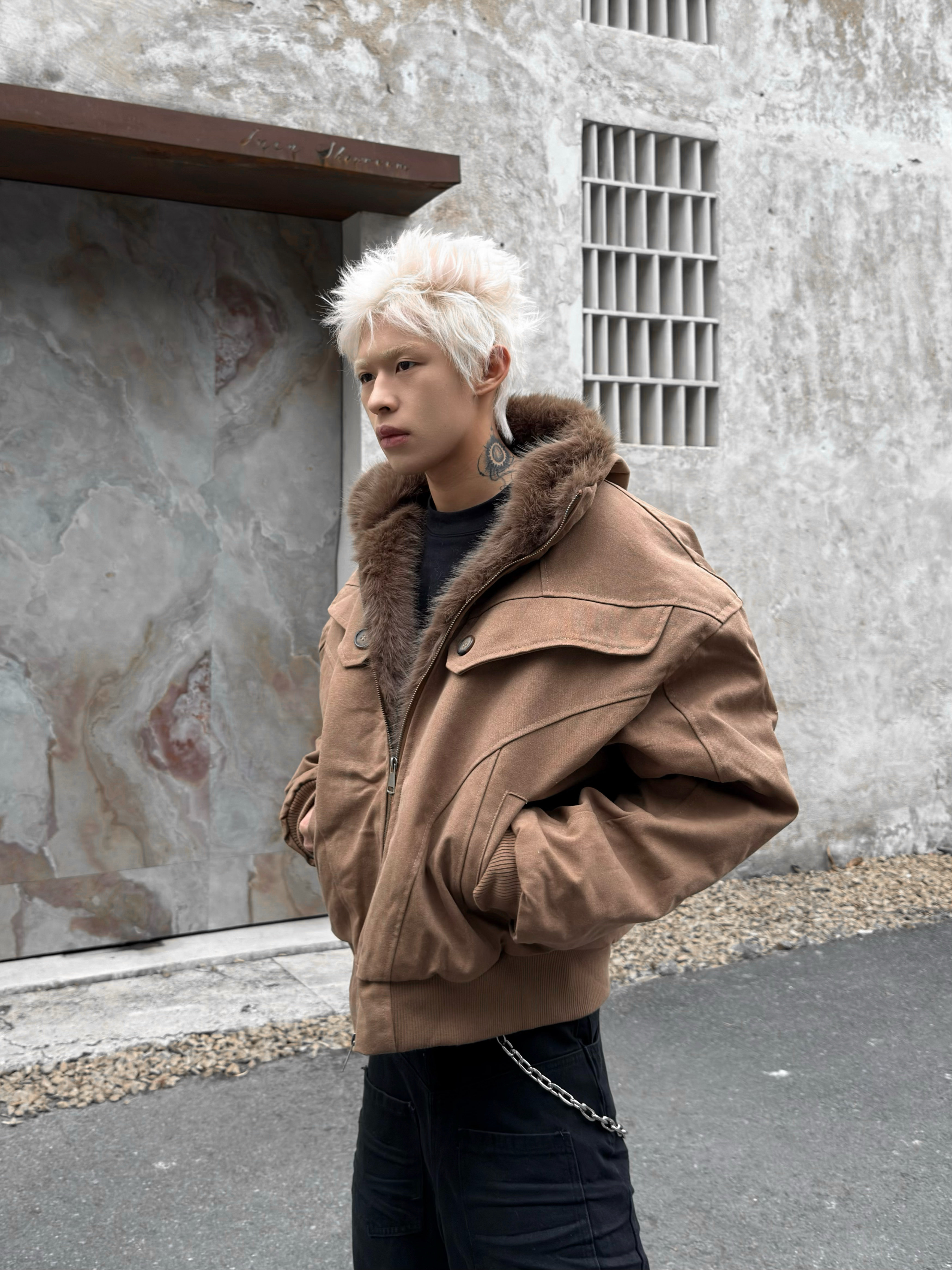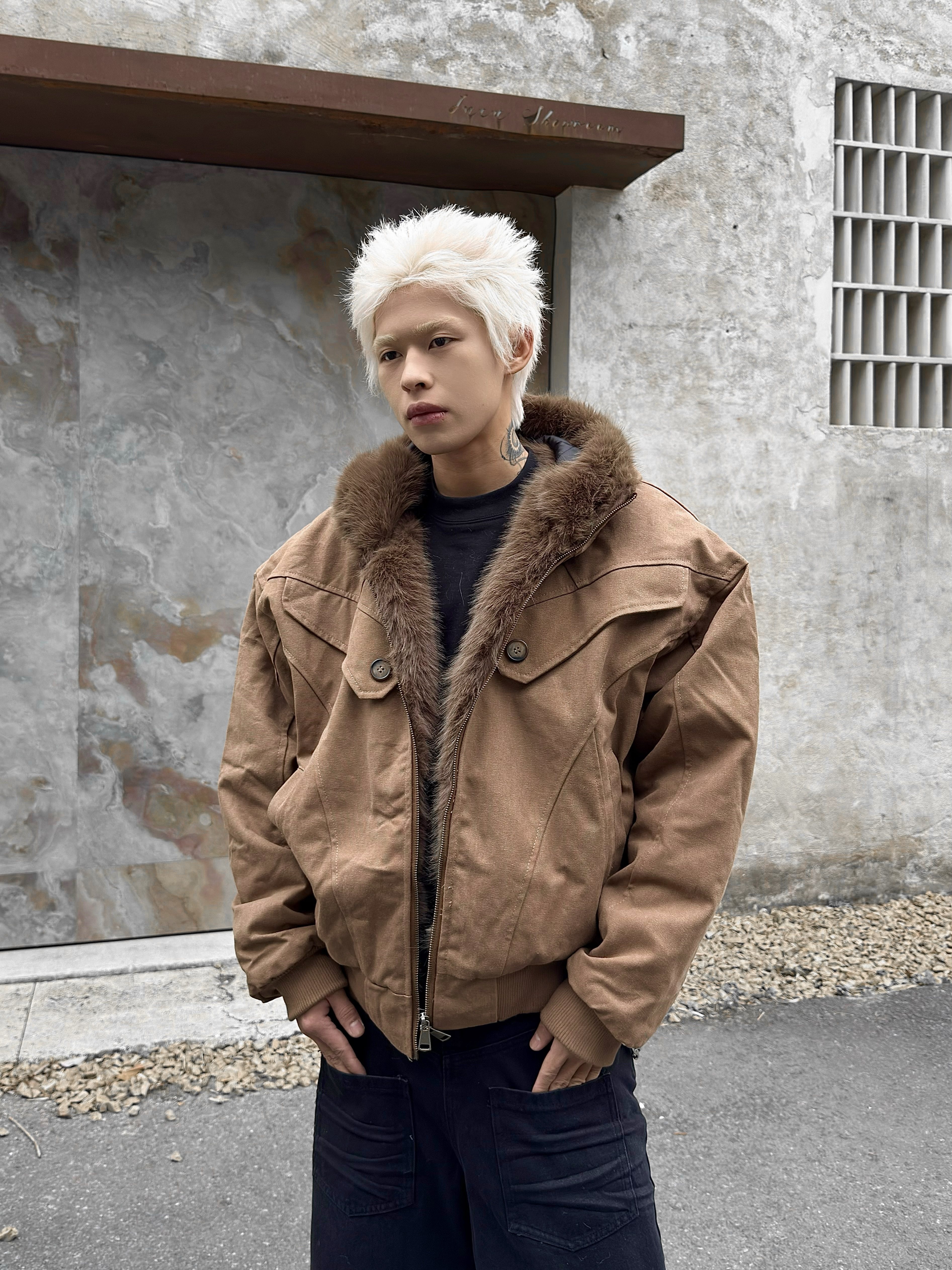 Armored Structured Hooded FakeFur-Collar Short Jacket WN22211