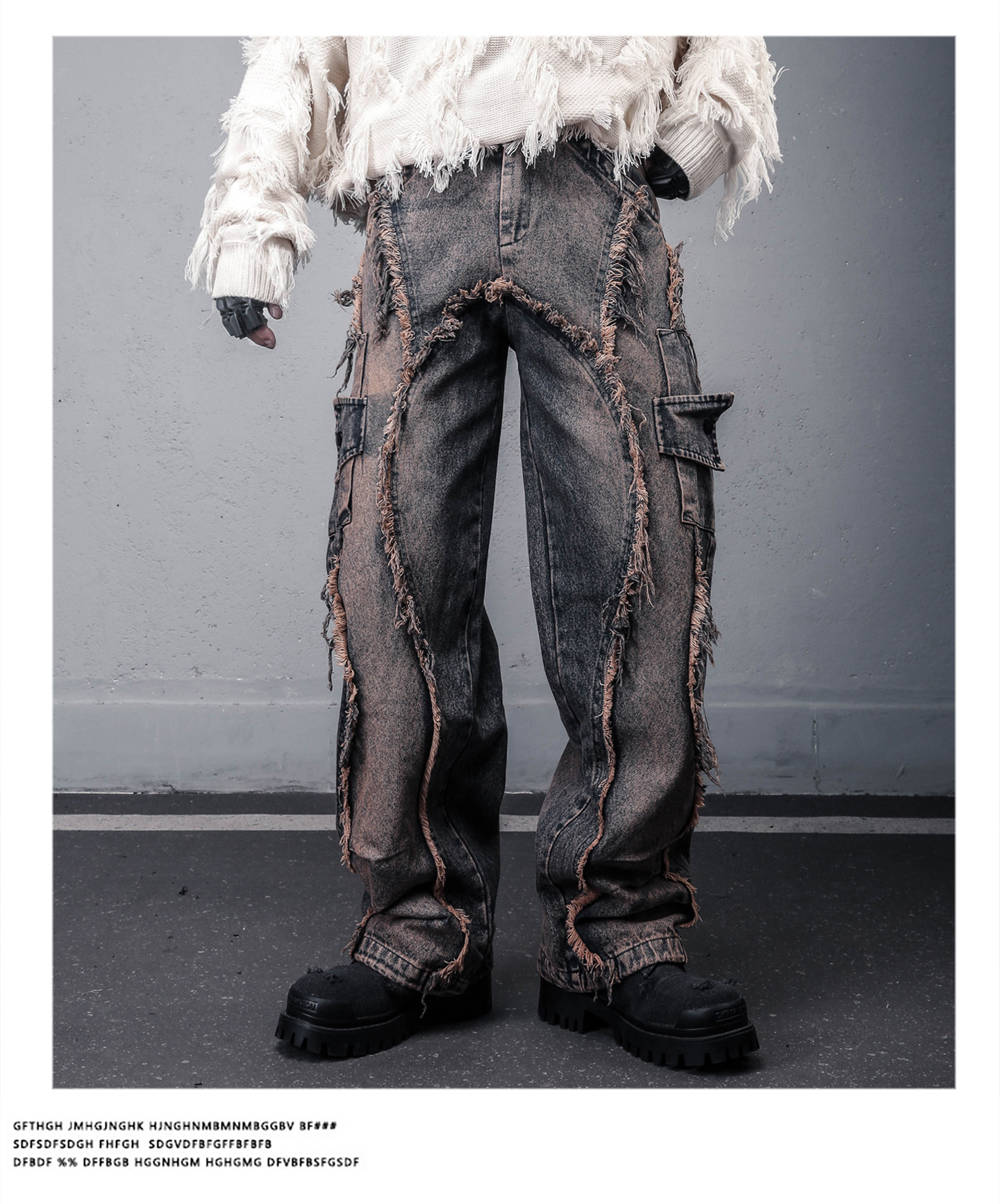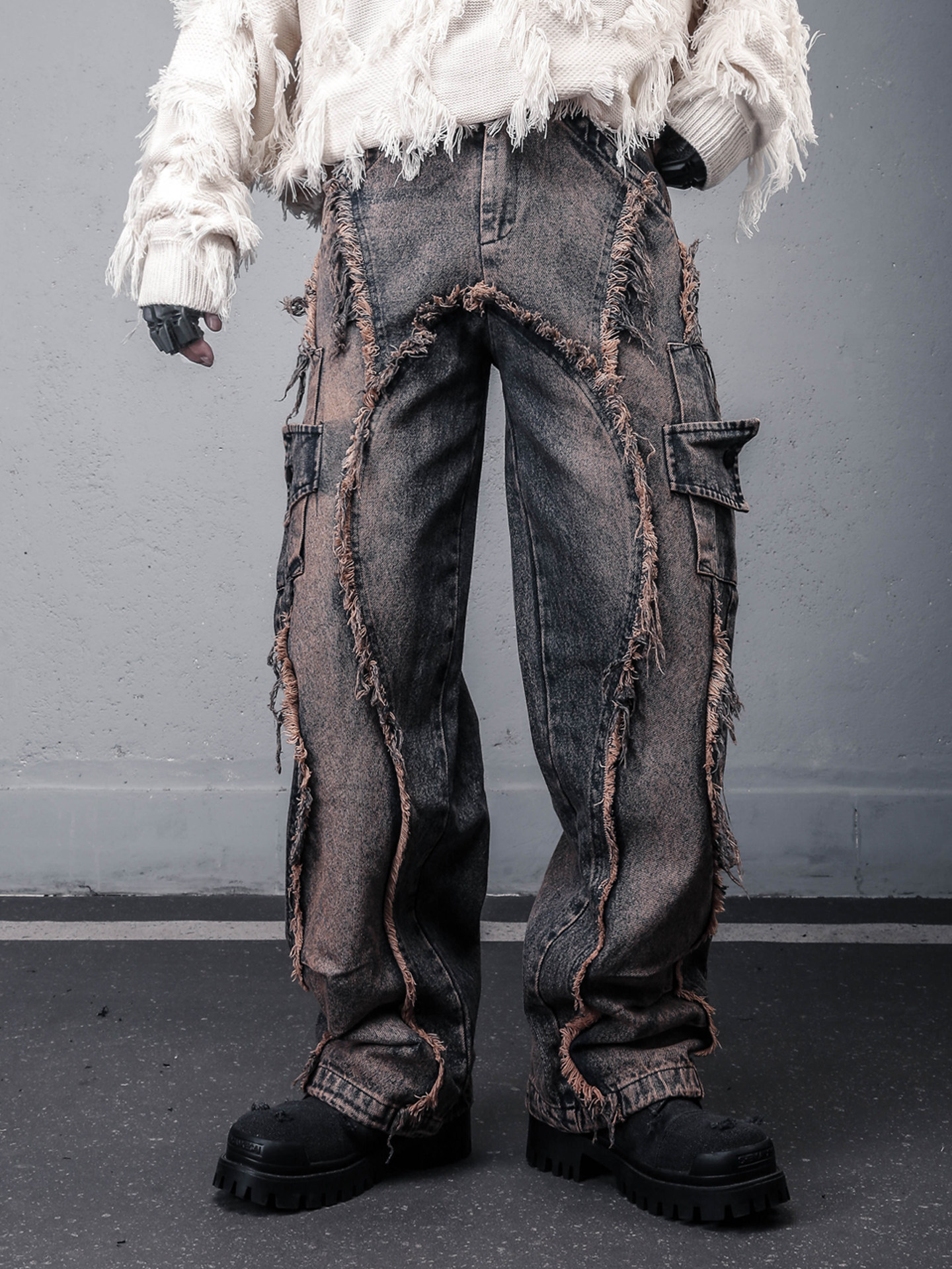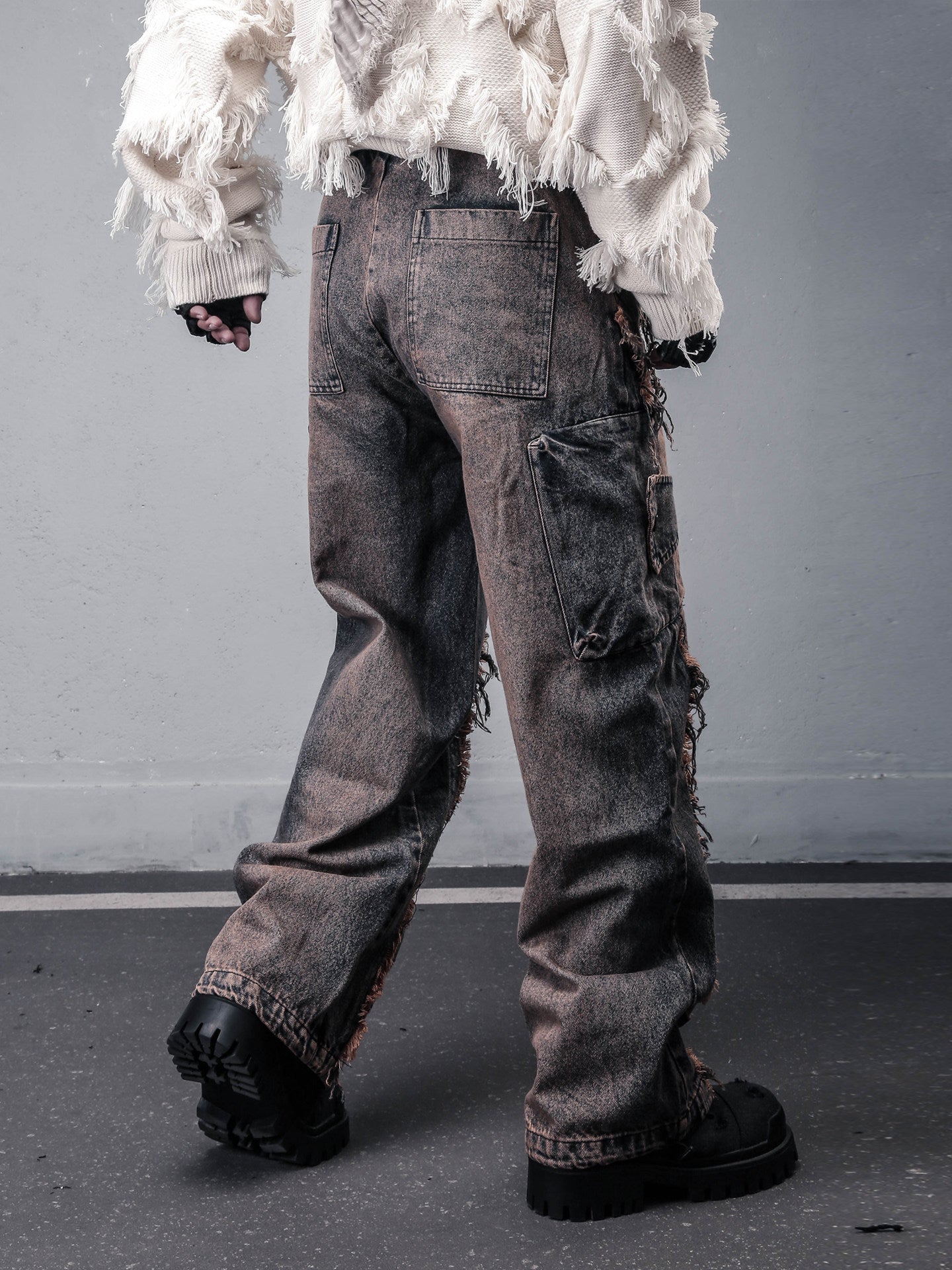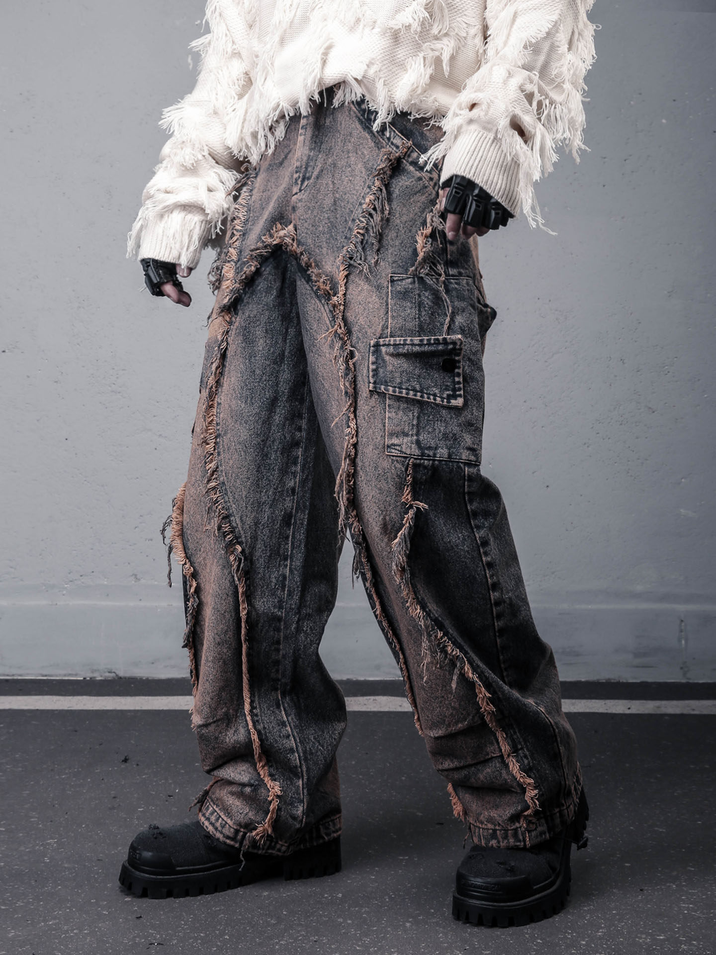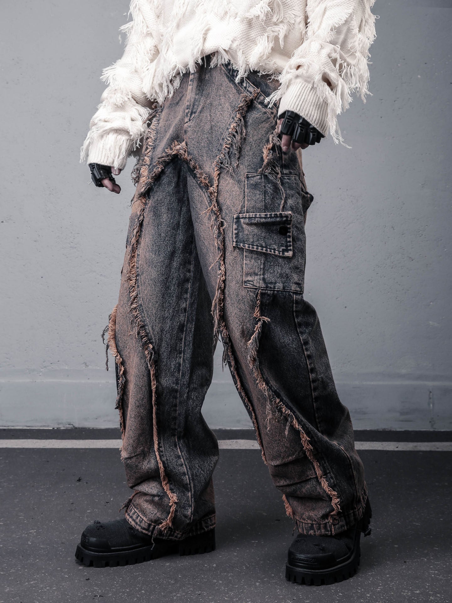 Damage Wash Mix Fringe Wide Leg Denim Jeans WN22503