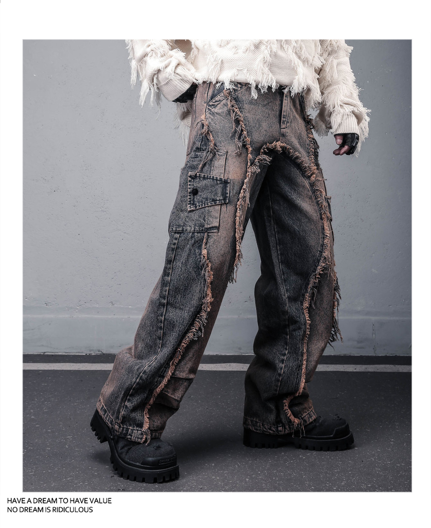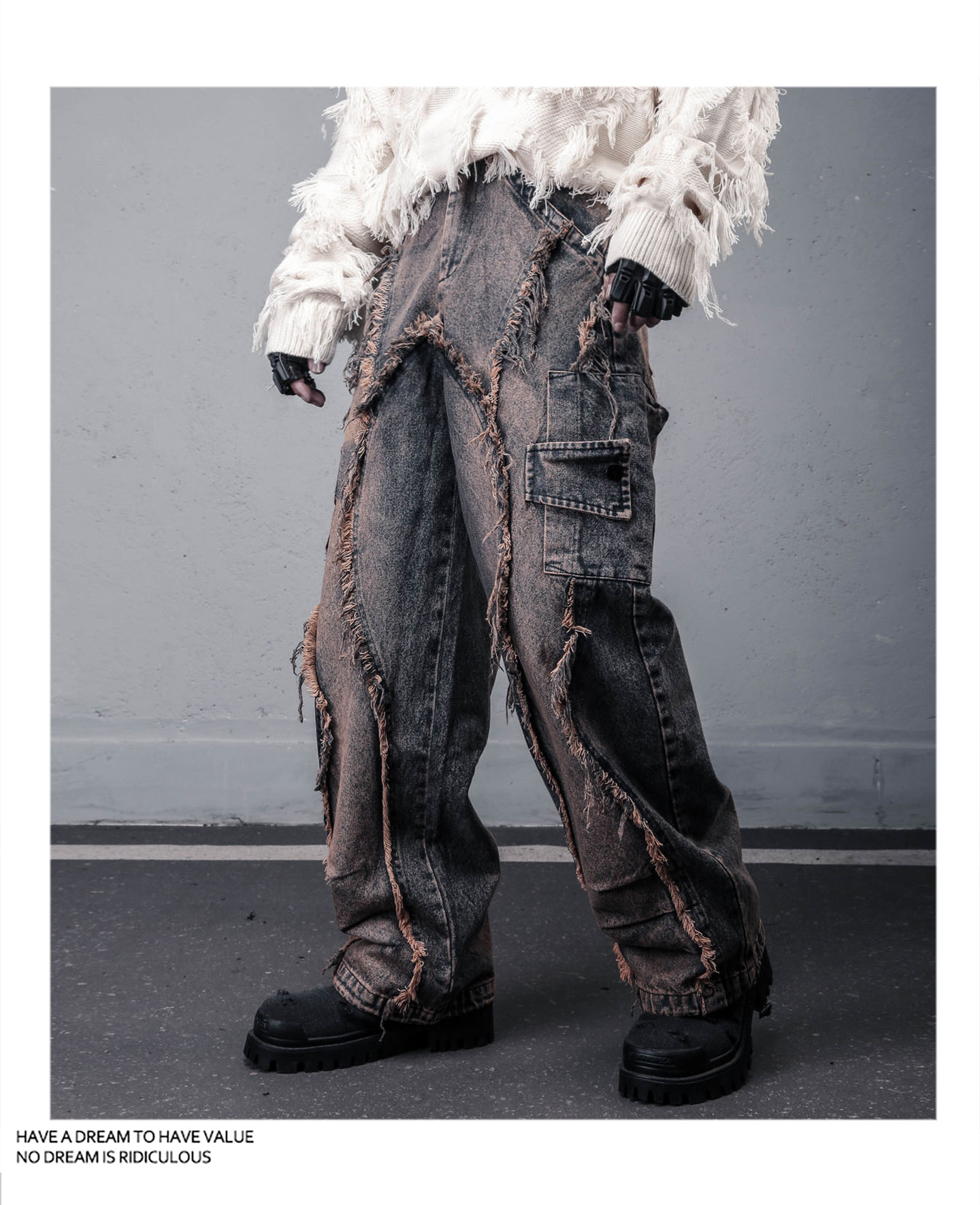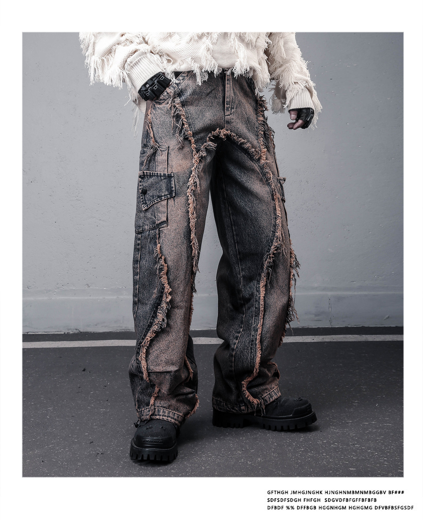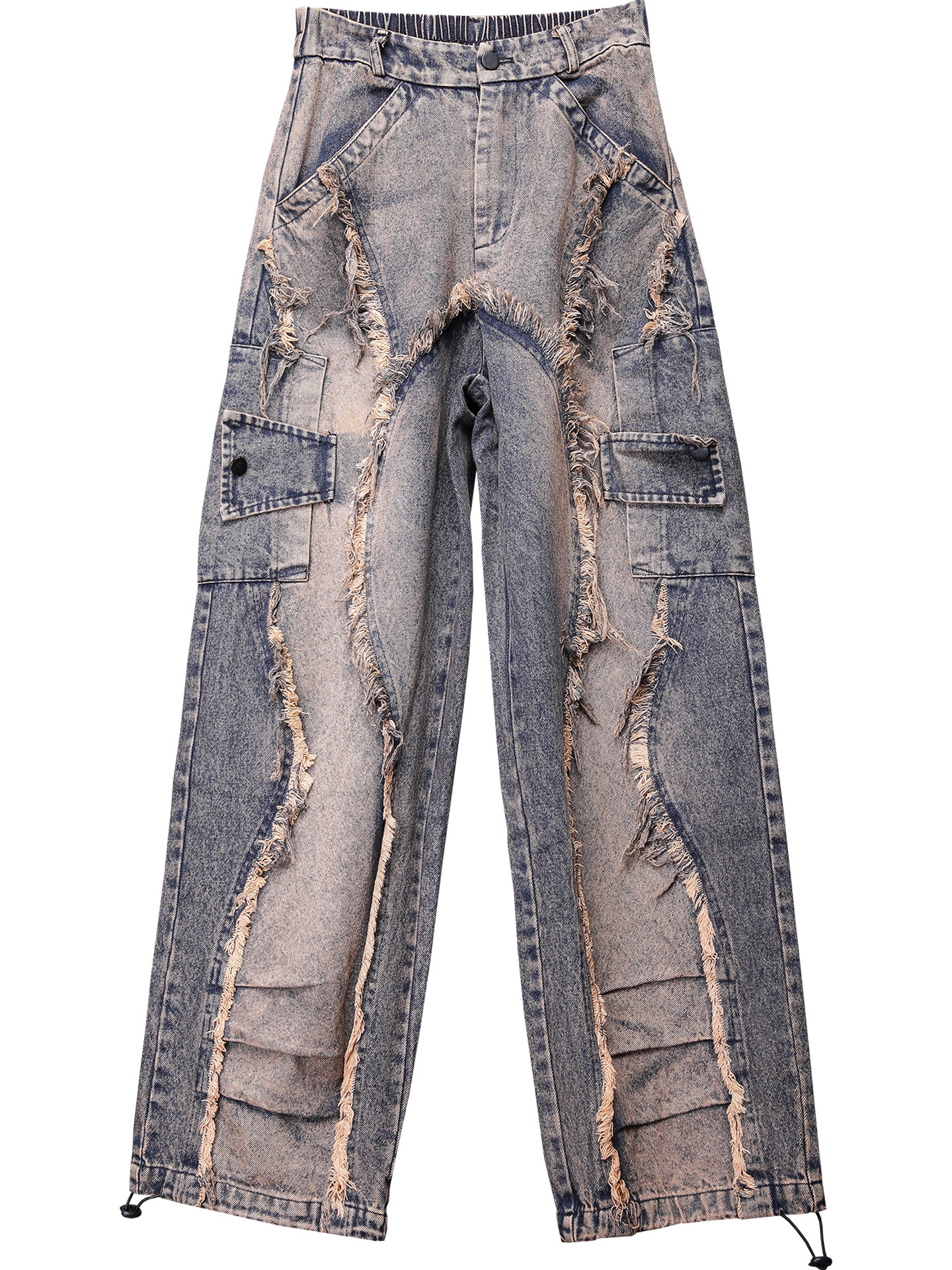 Damage Wash Mix Fringe Wide Leg Denim Jeans WN22503