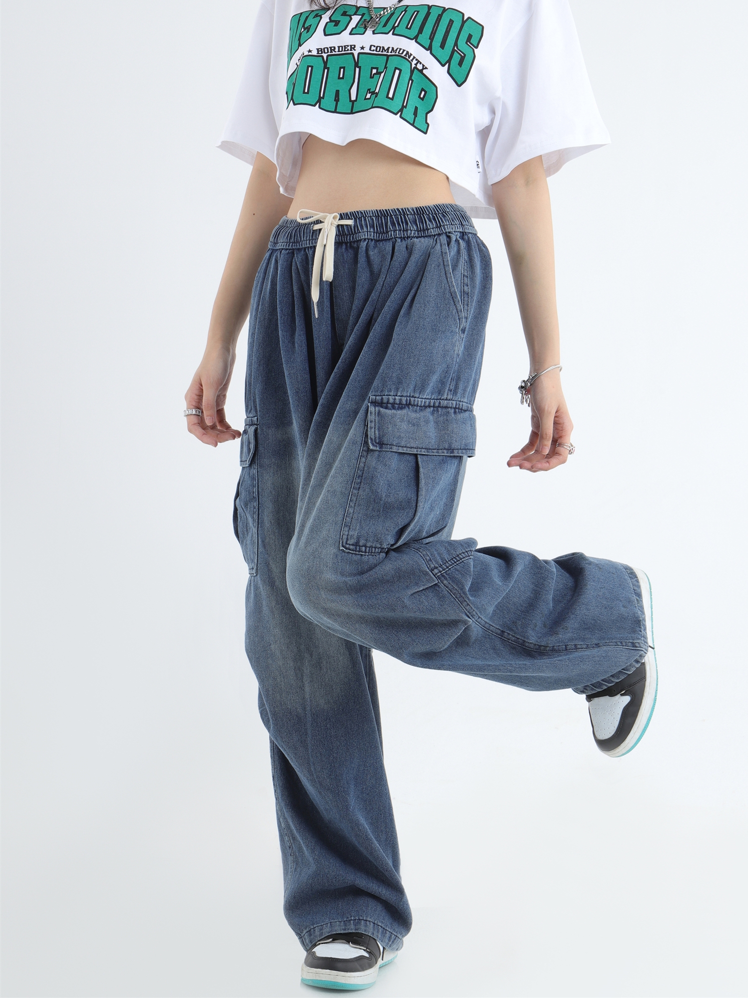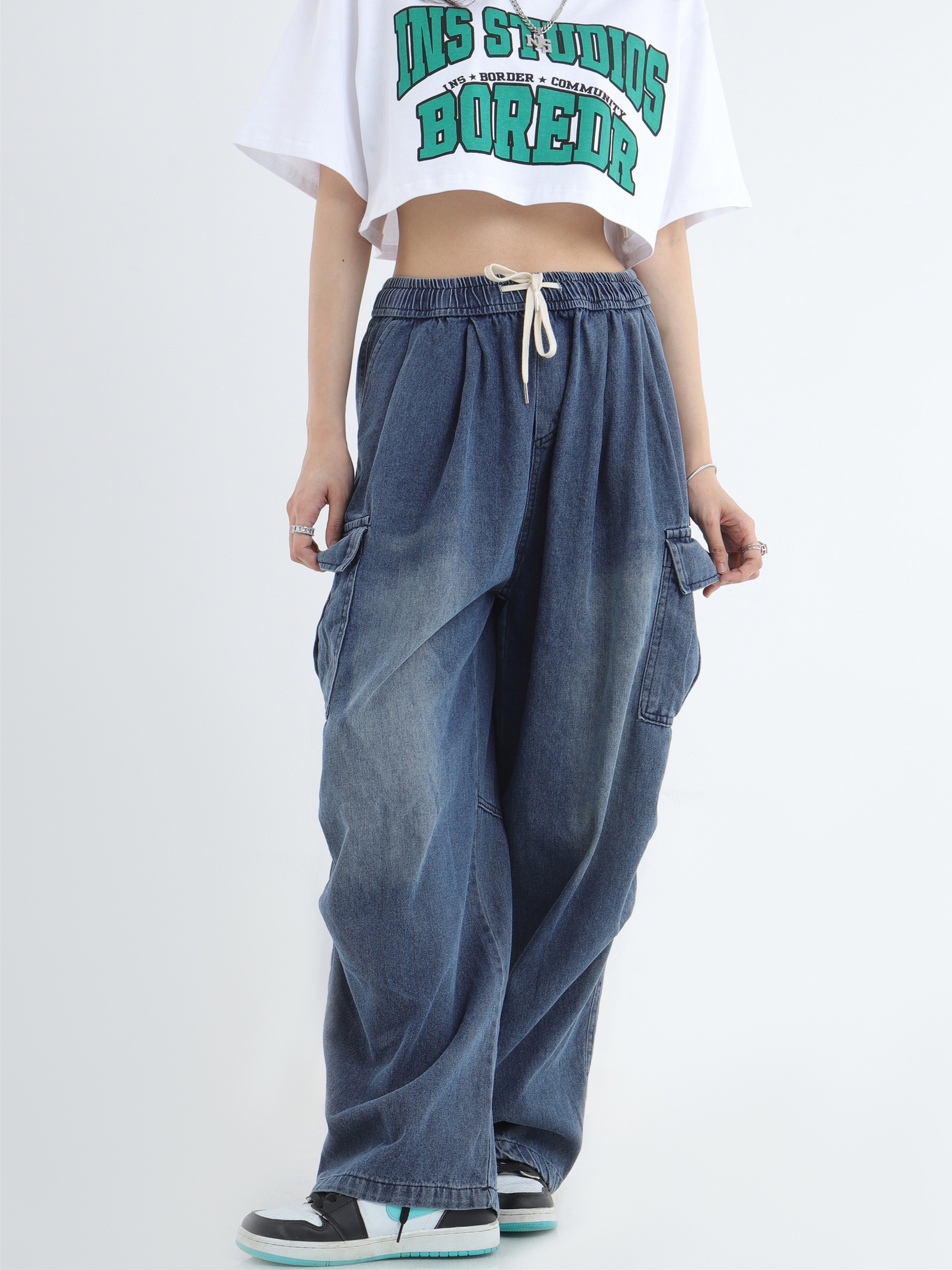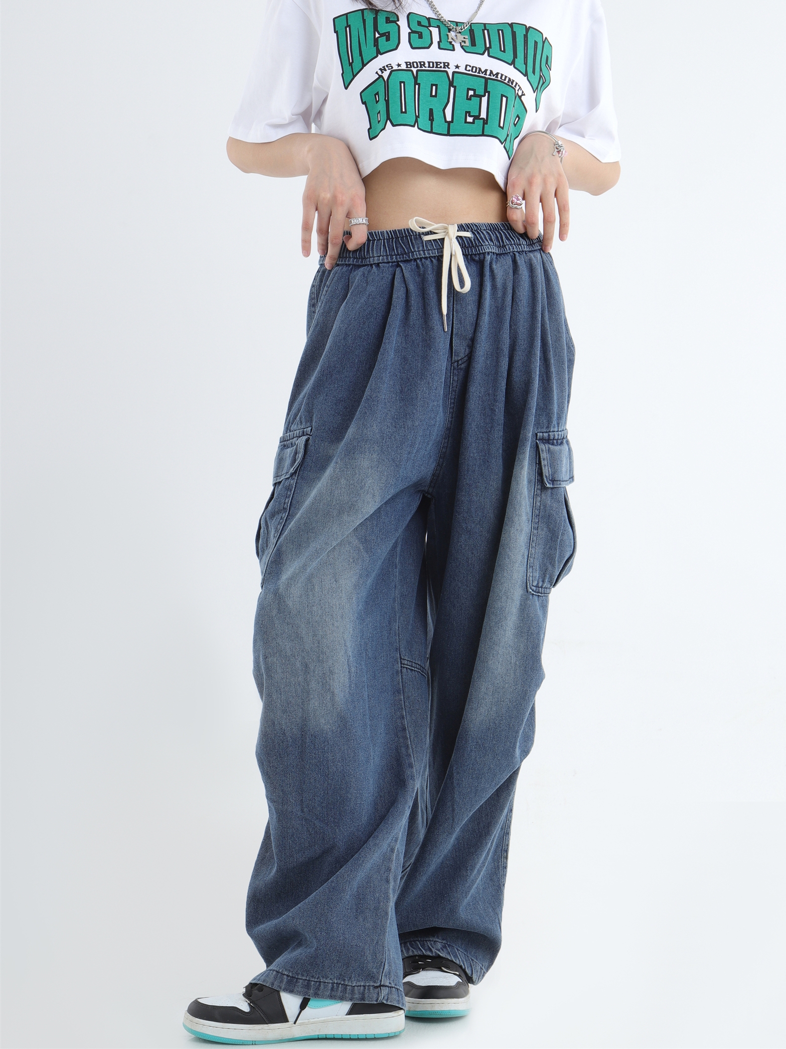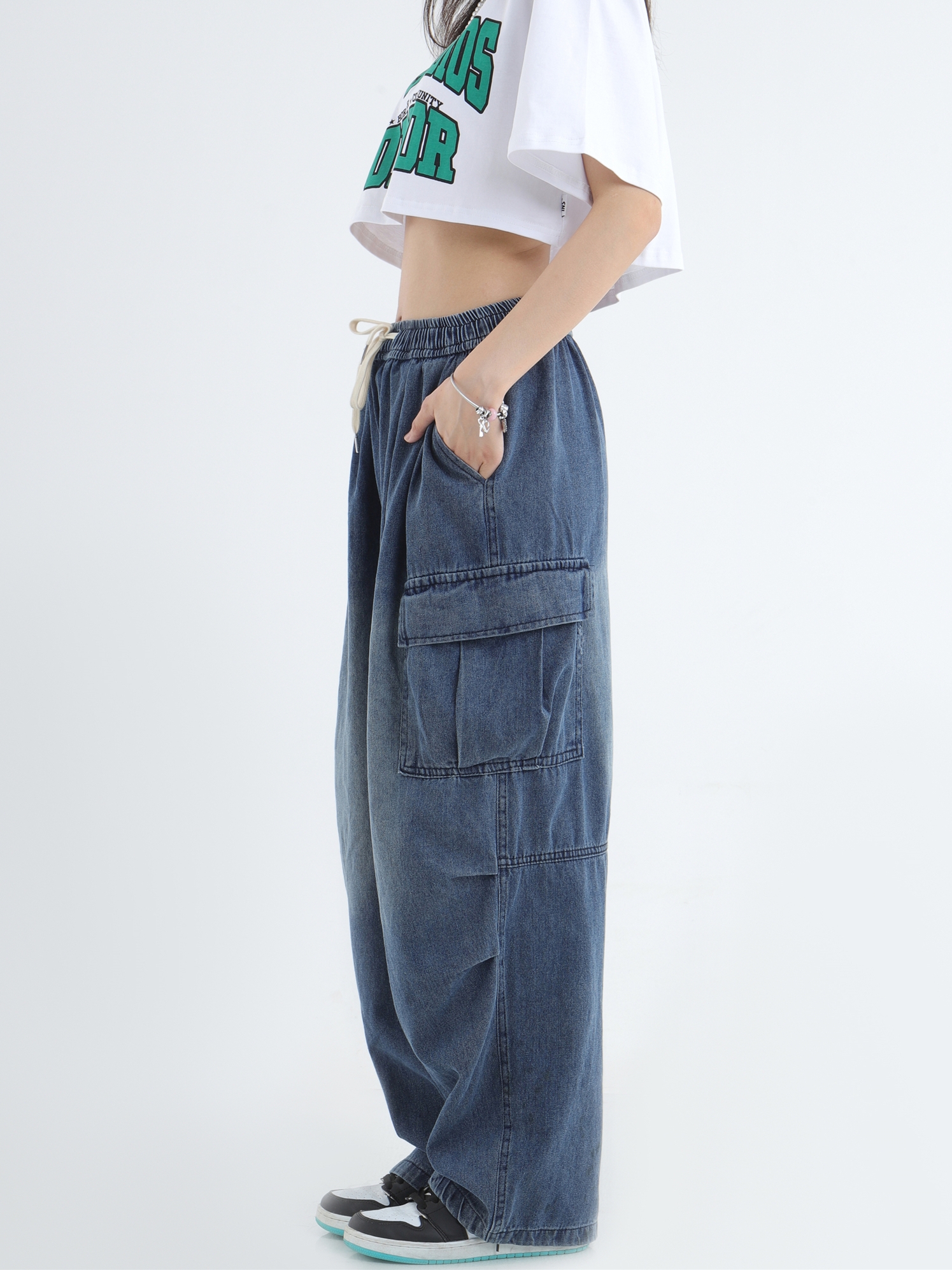 Draw Cord Wide-Leg Straight Cargo Denim Jeans WN7181