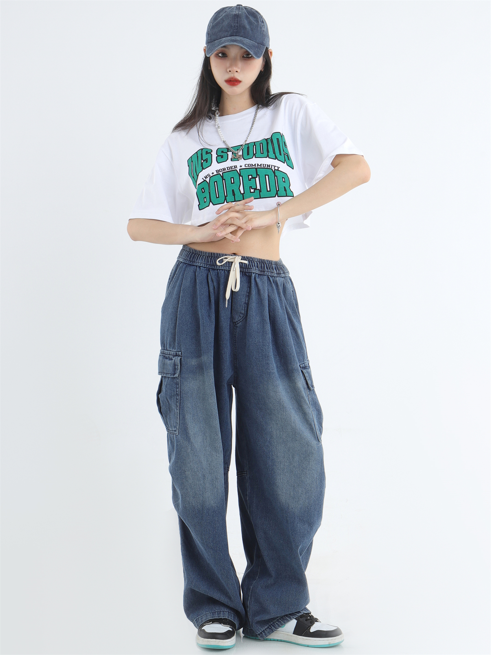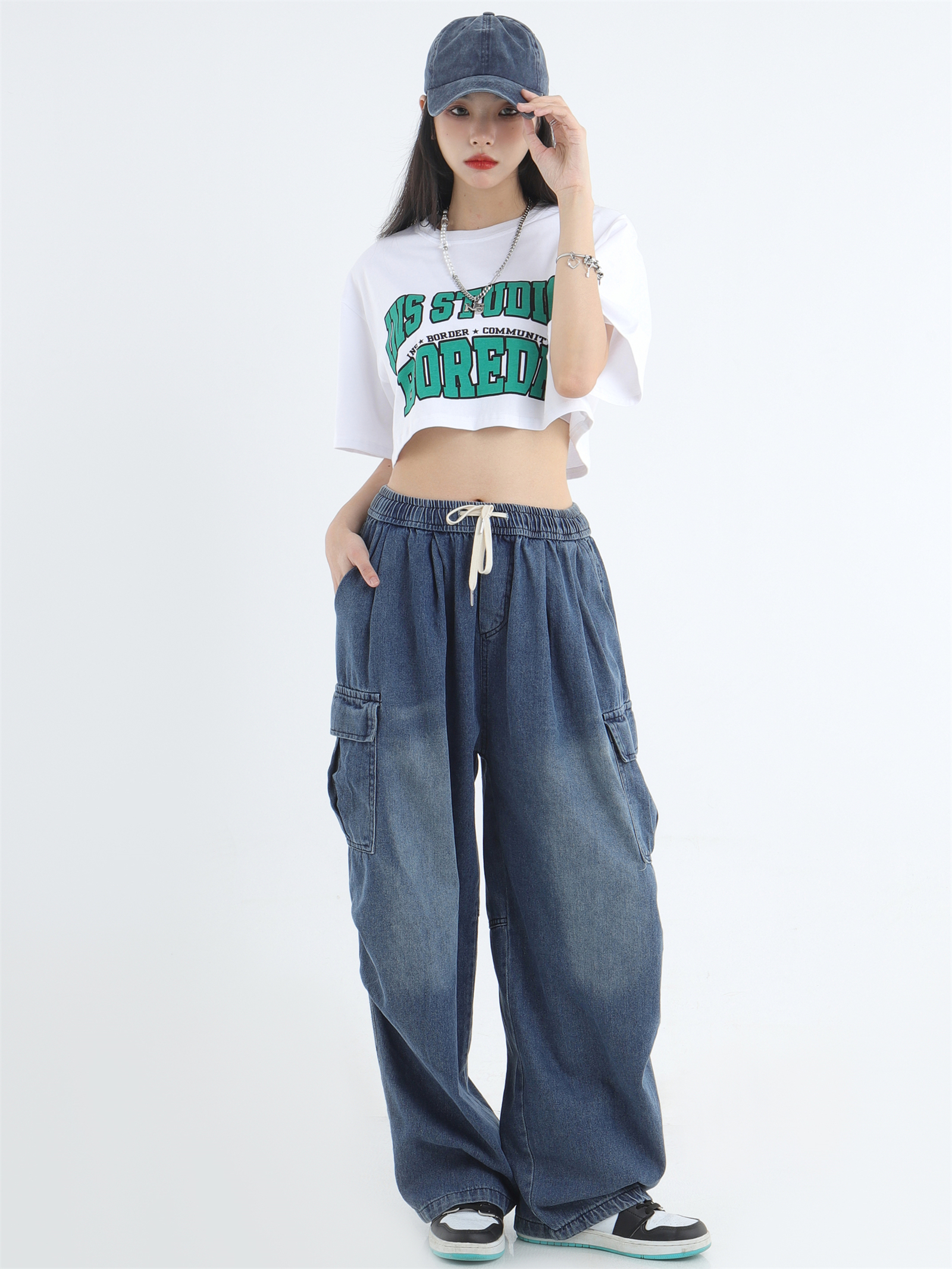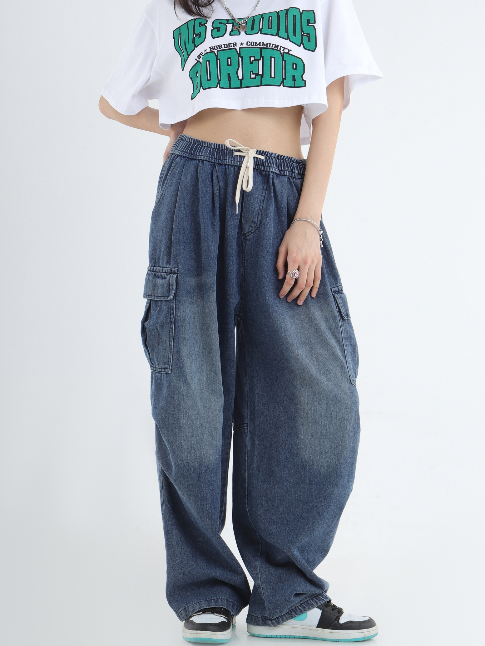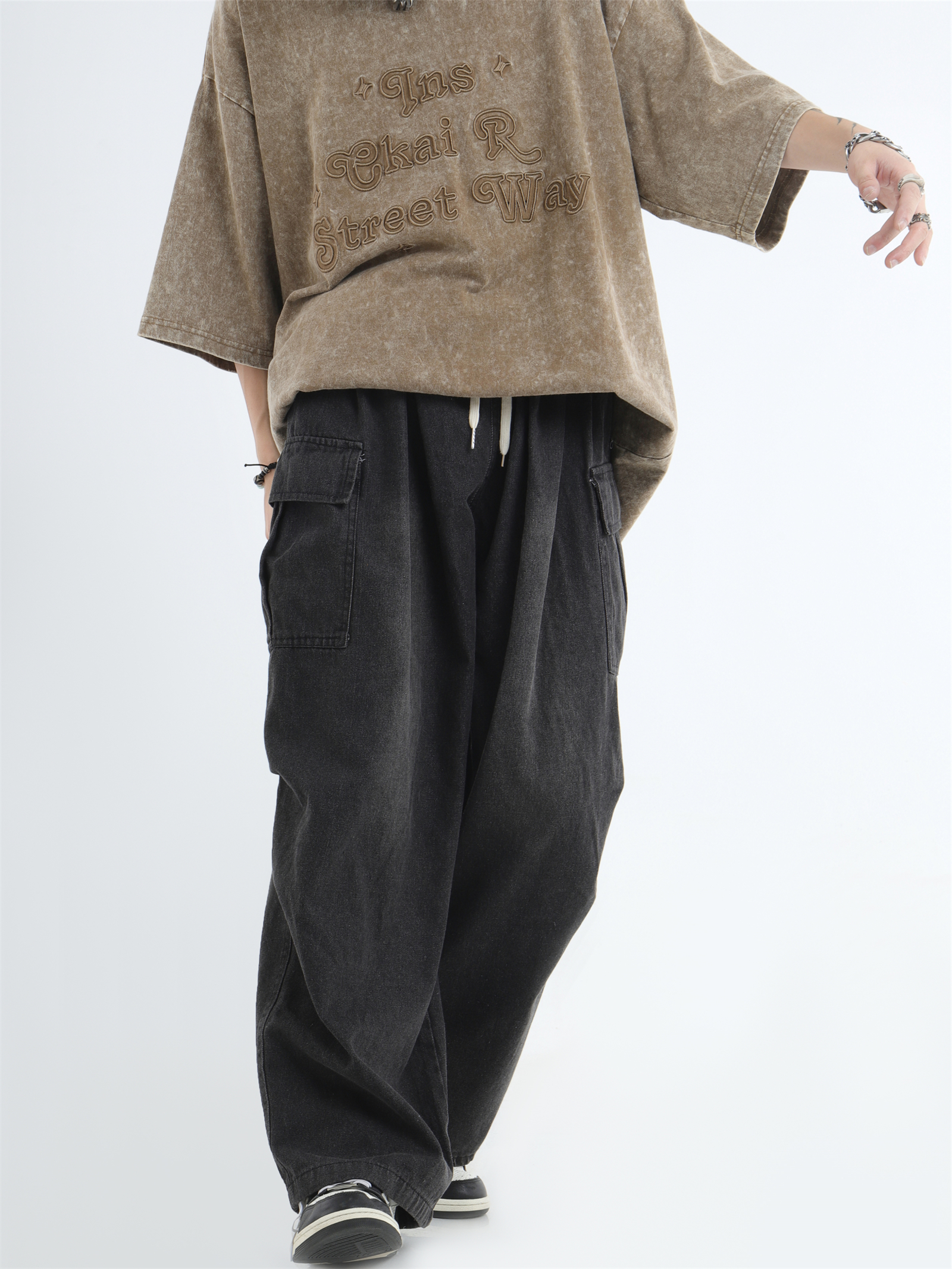 Draw Cord Wide-Leg Straight Cargo Denim Jeans WN7181