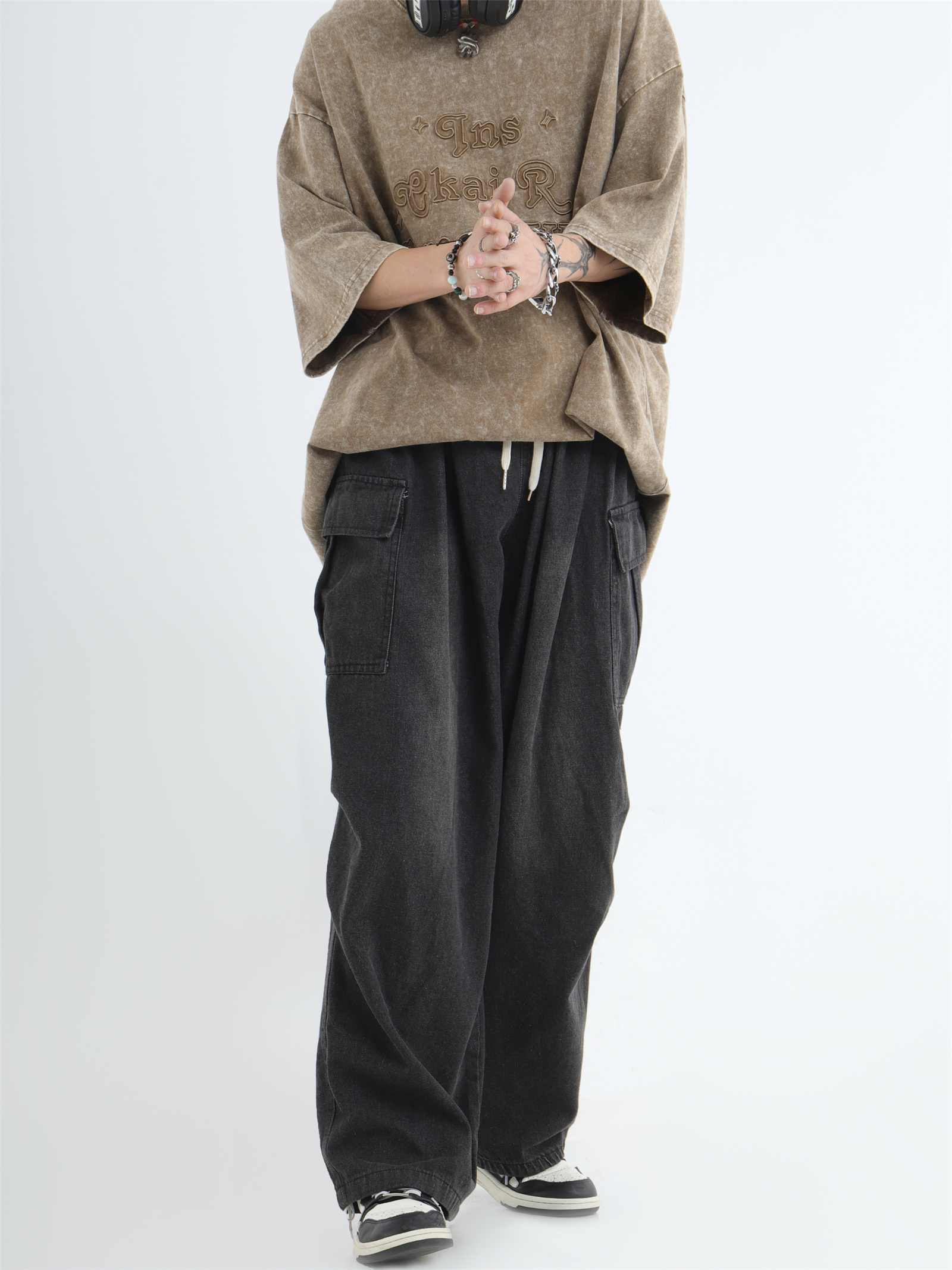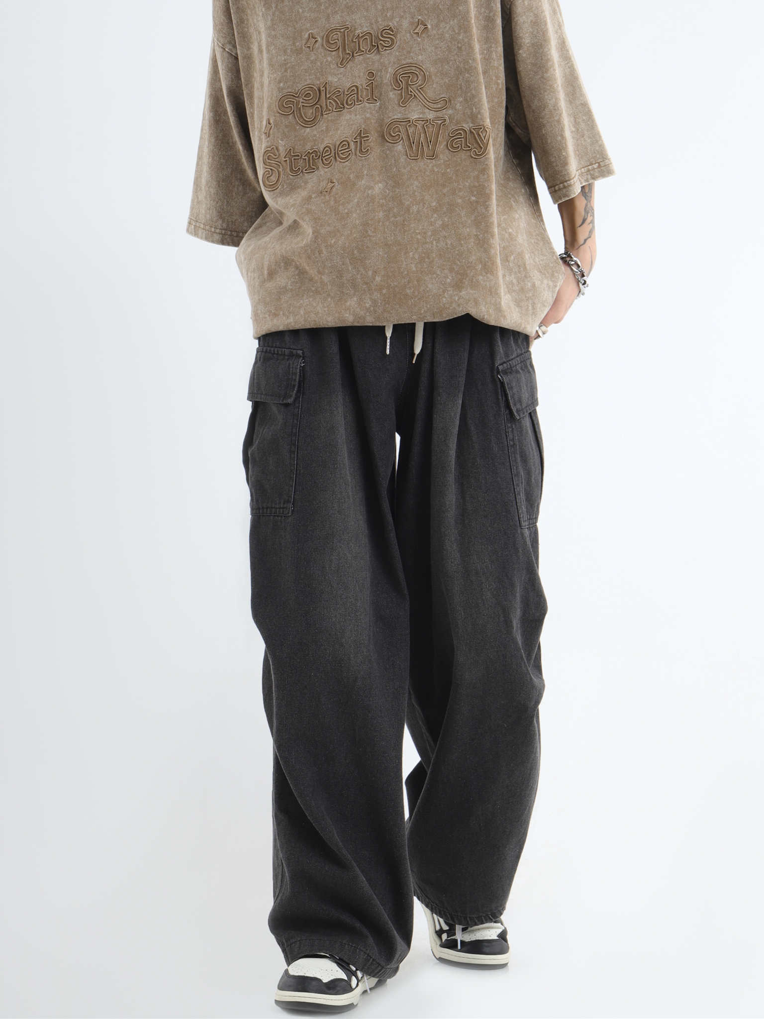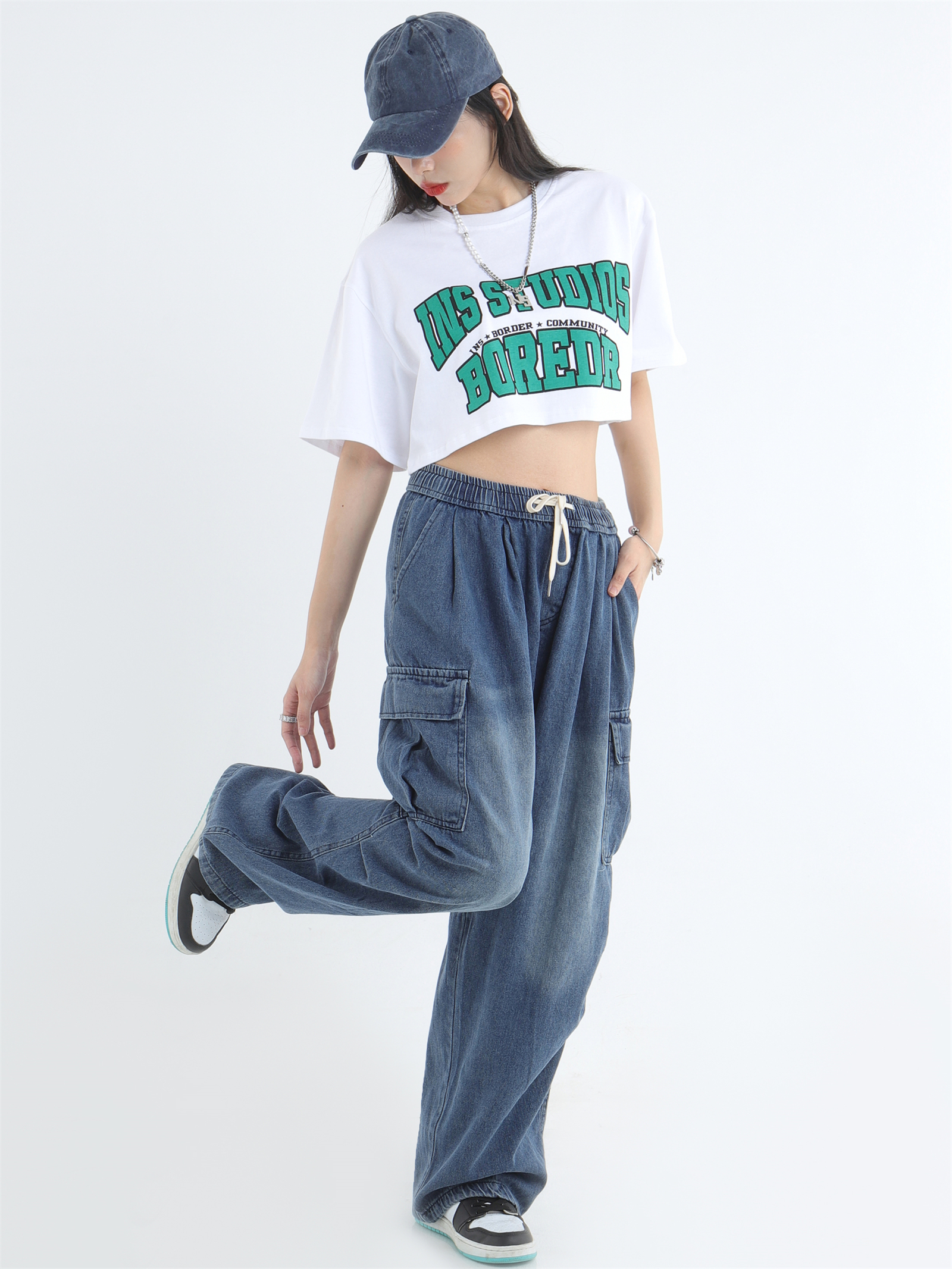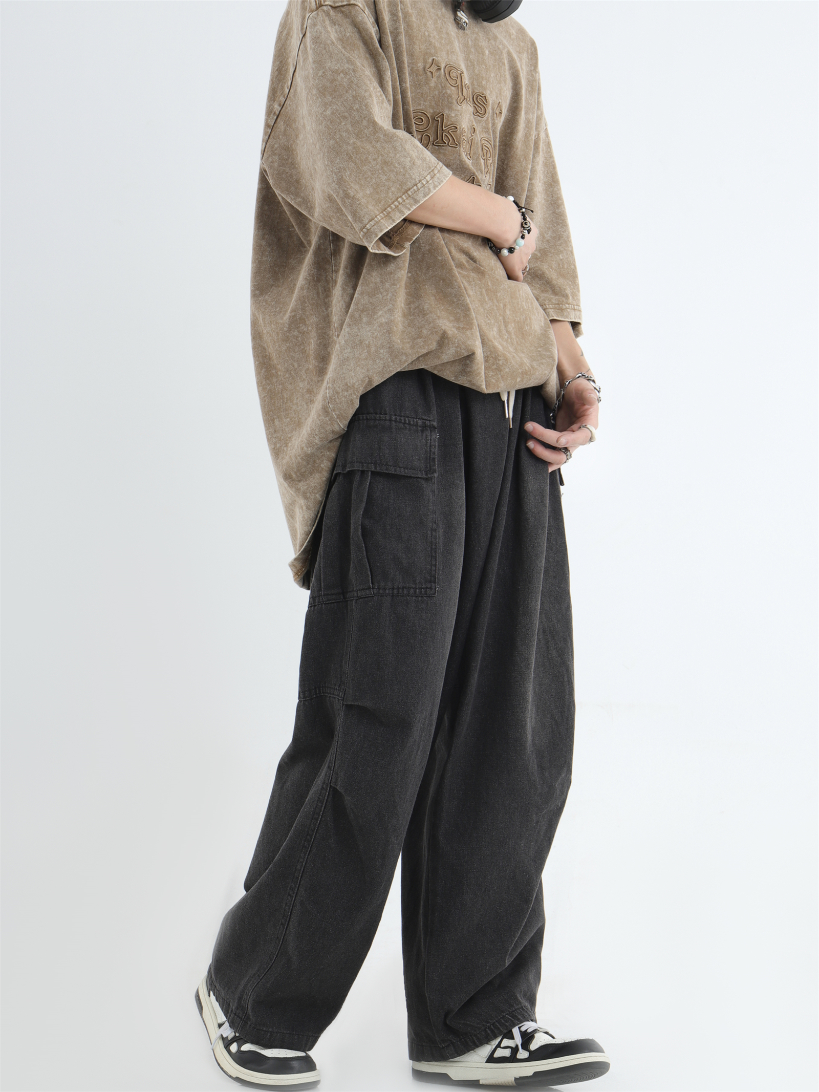 Draw Cord Wide-Leg Straight Cargo Denim Jeans WN7181