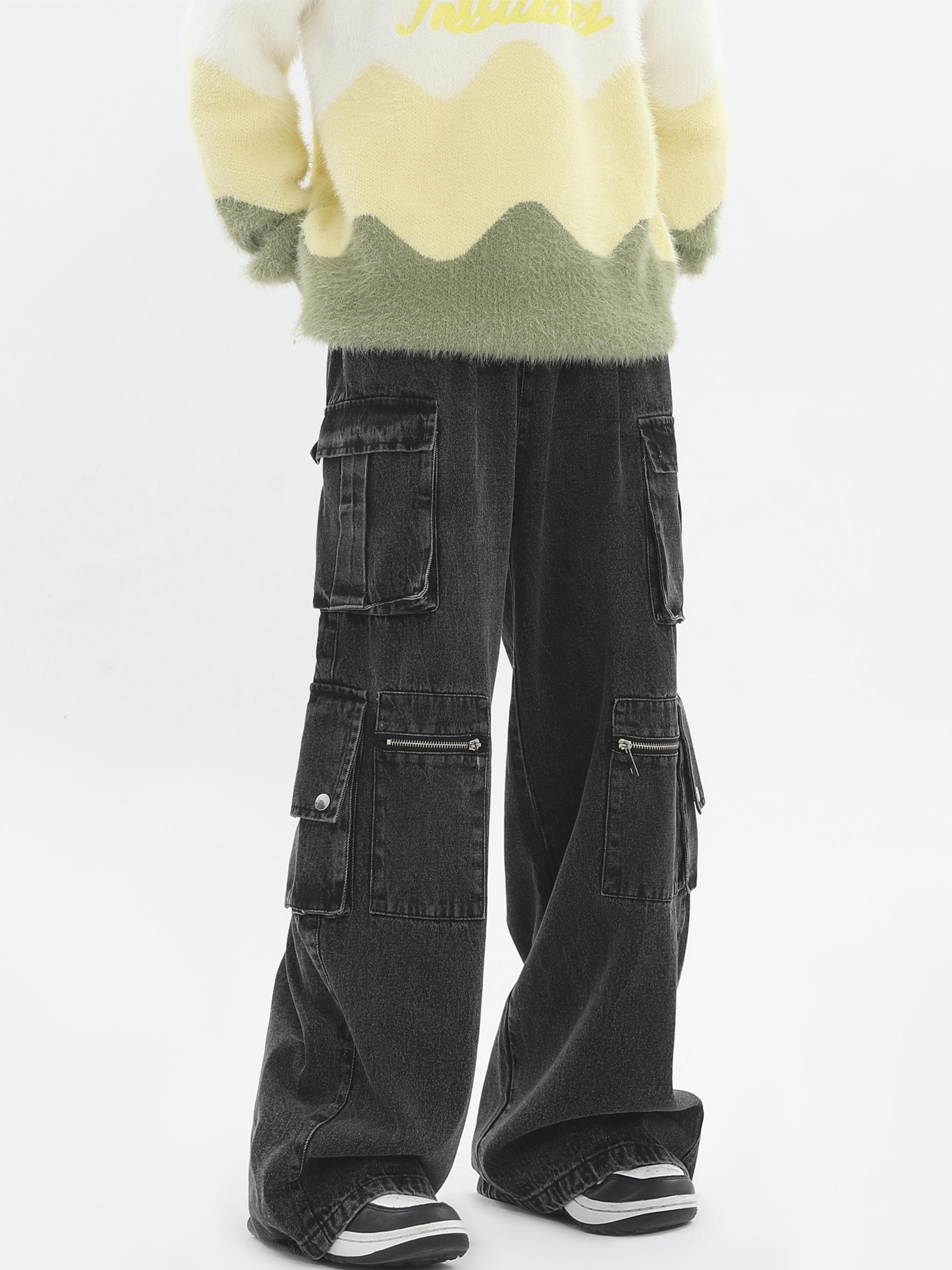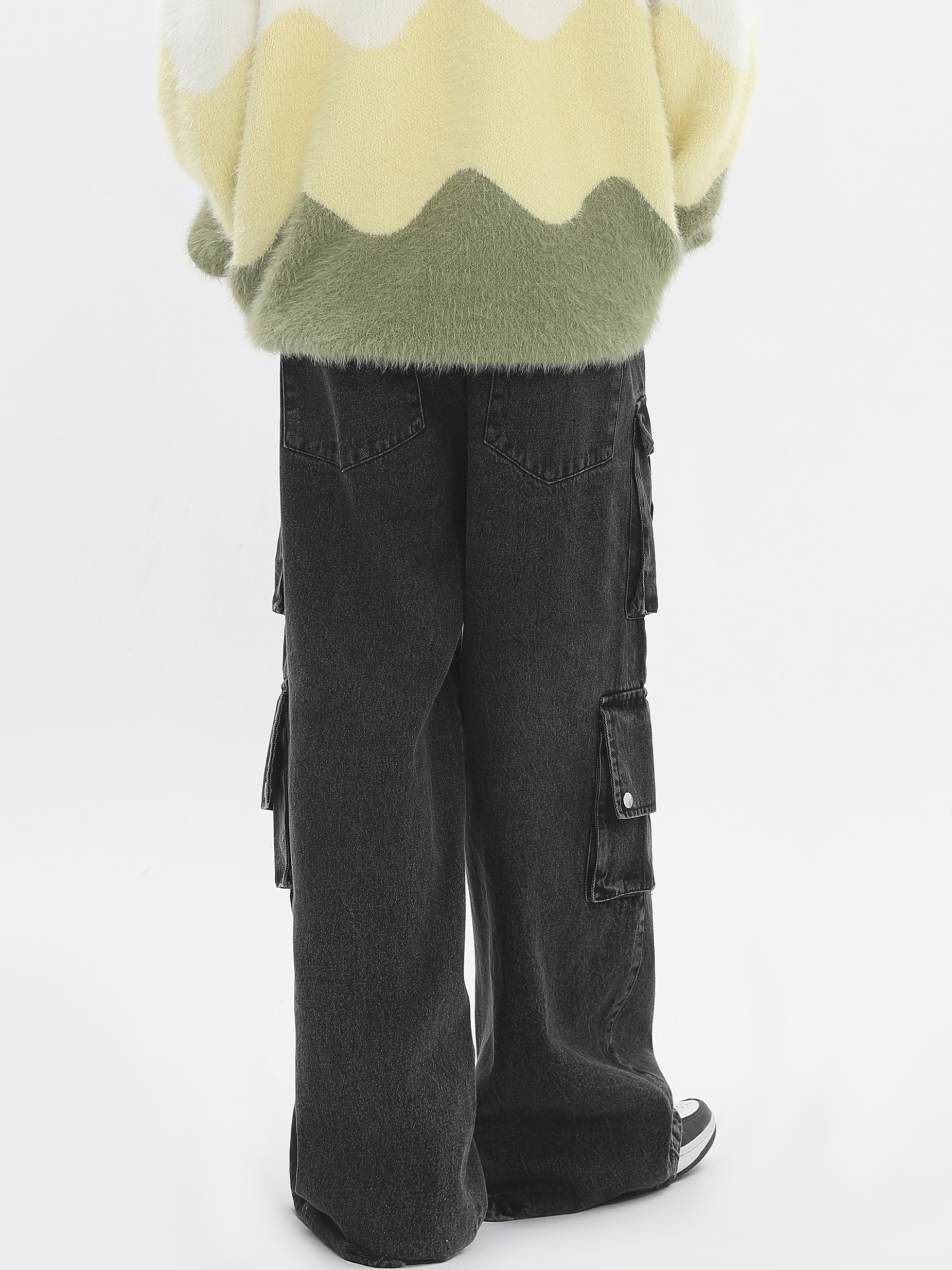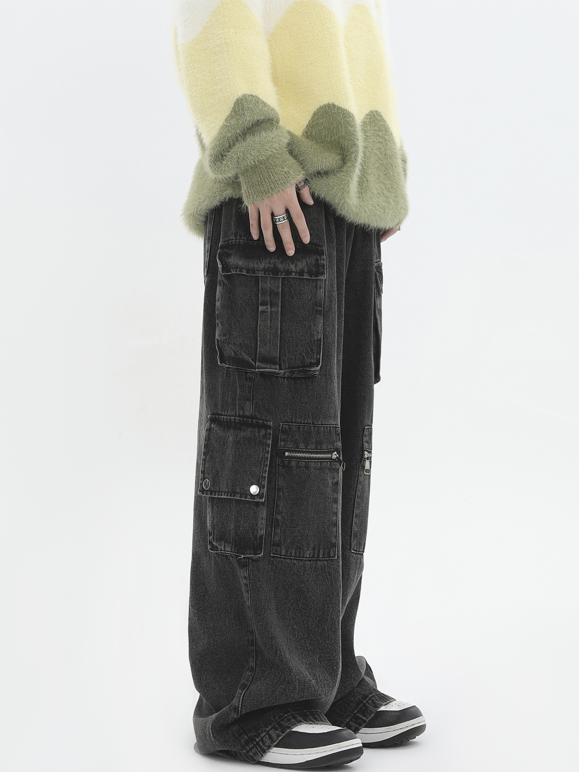 Multi Pocket Washed Wide-Leg Straight Cargo Denim Jeans WN7232
