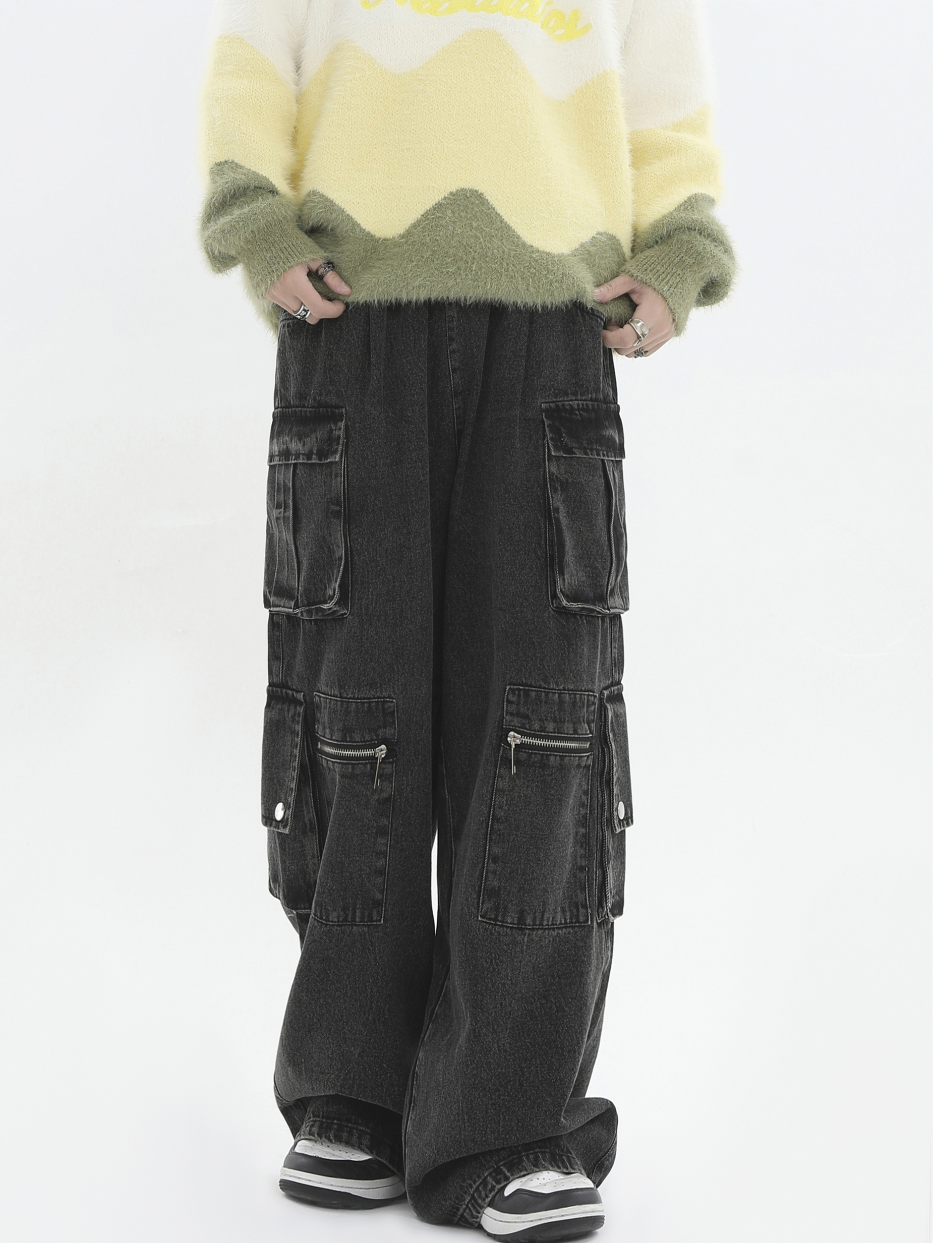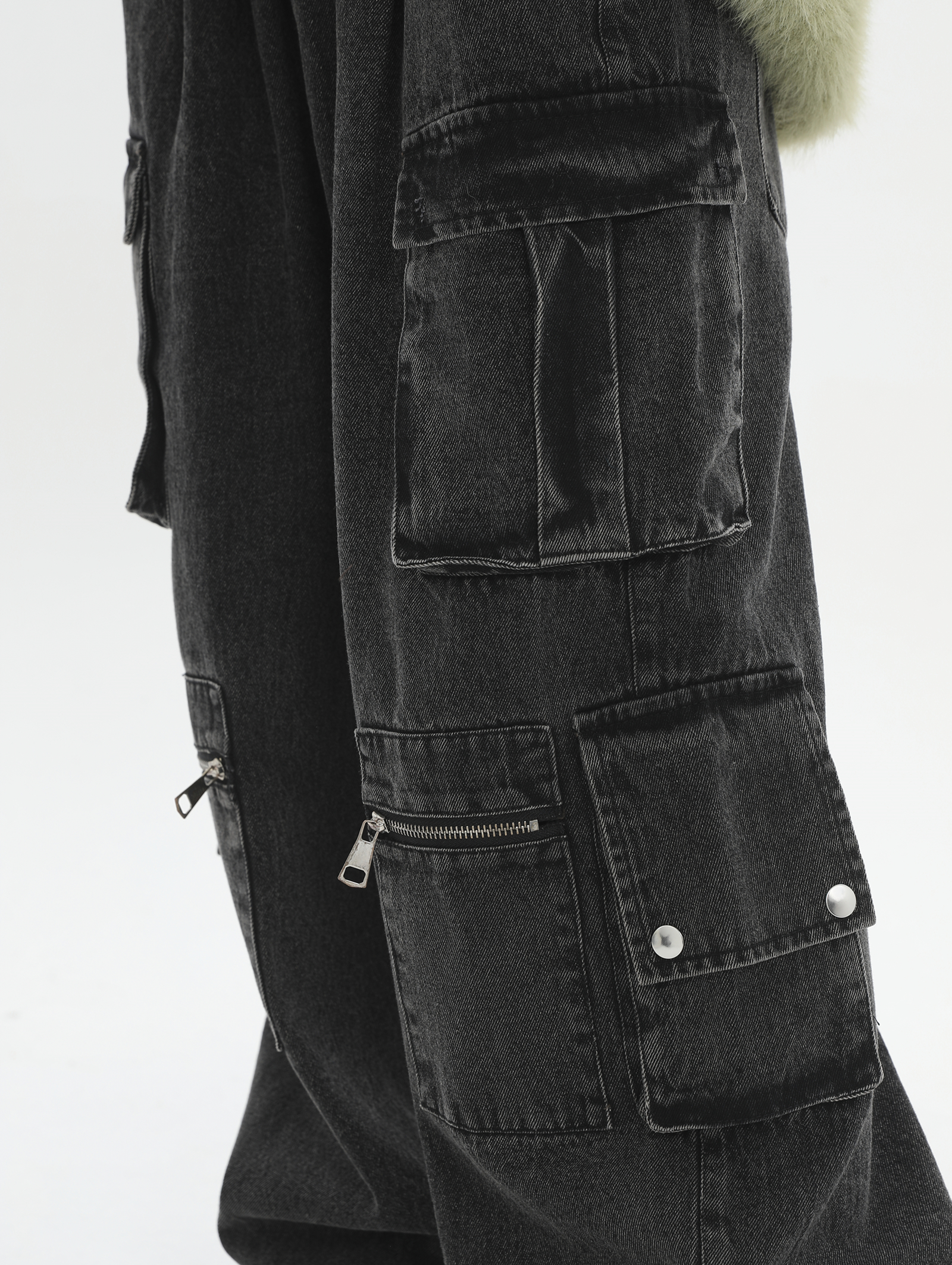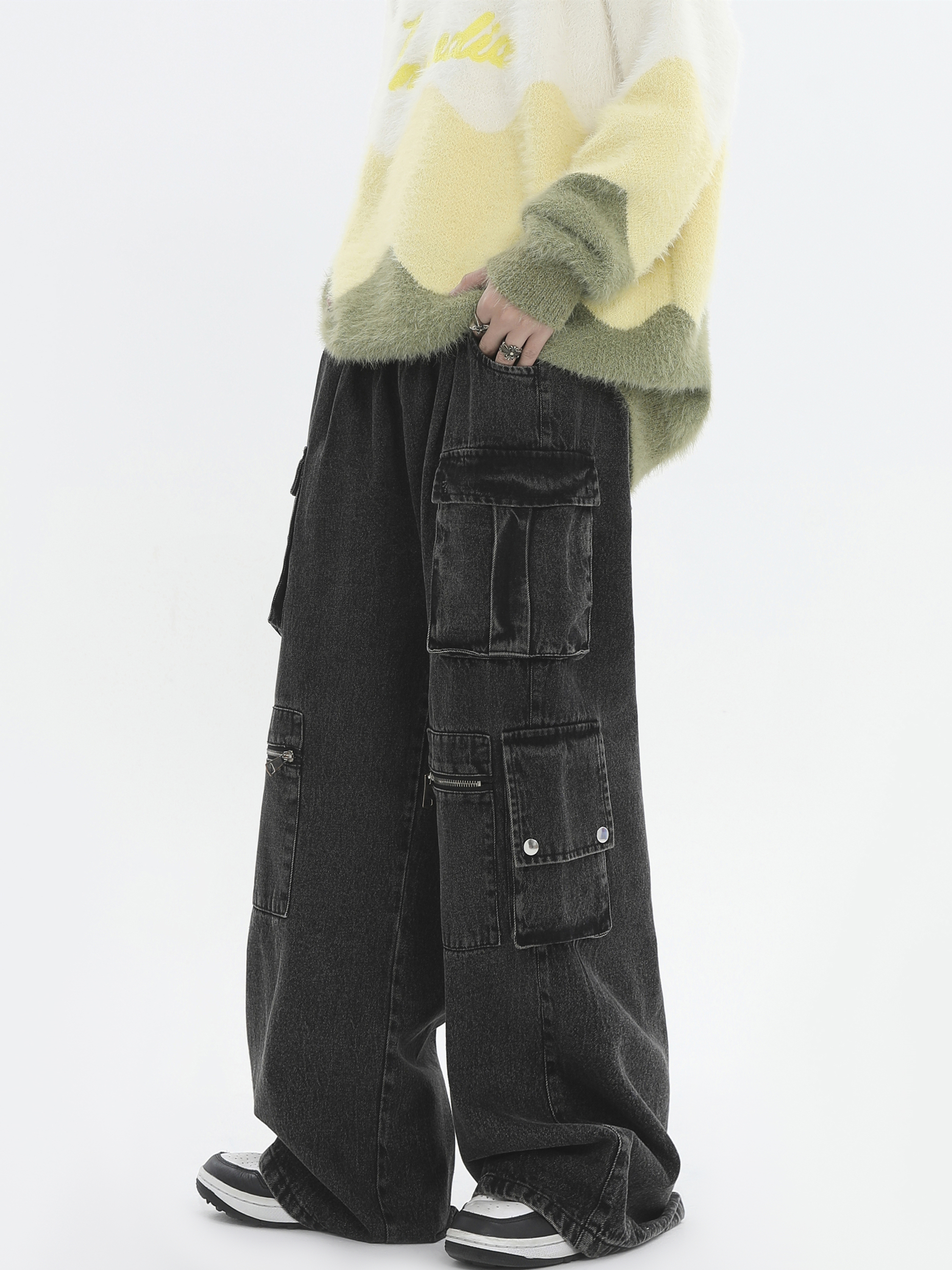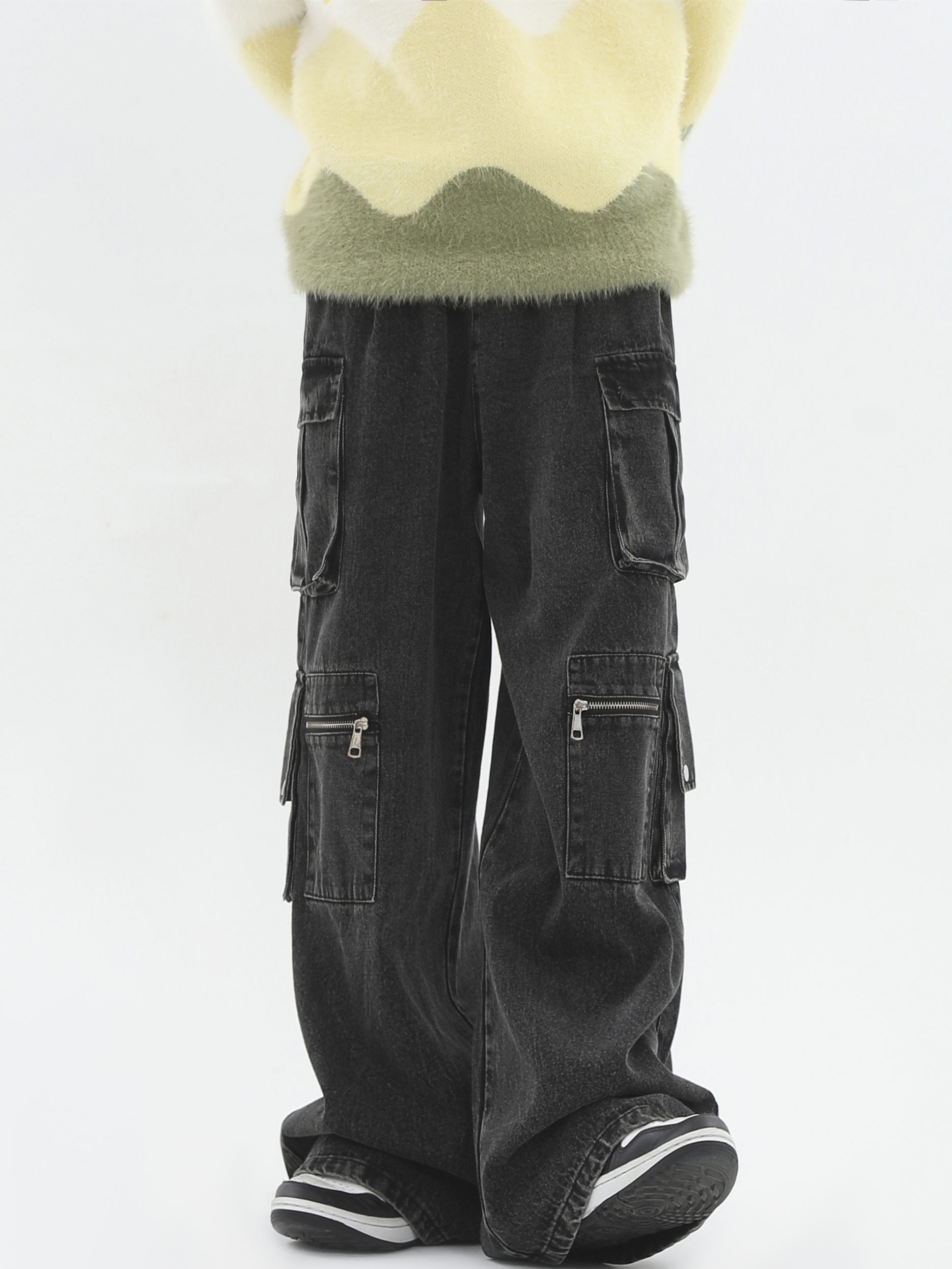Multi Pocket Washed Wide-Leg Straight Cargo Denim Jeans WN7232