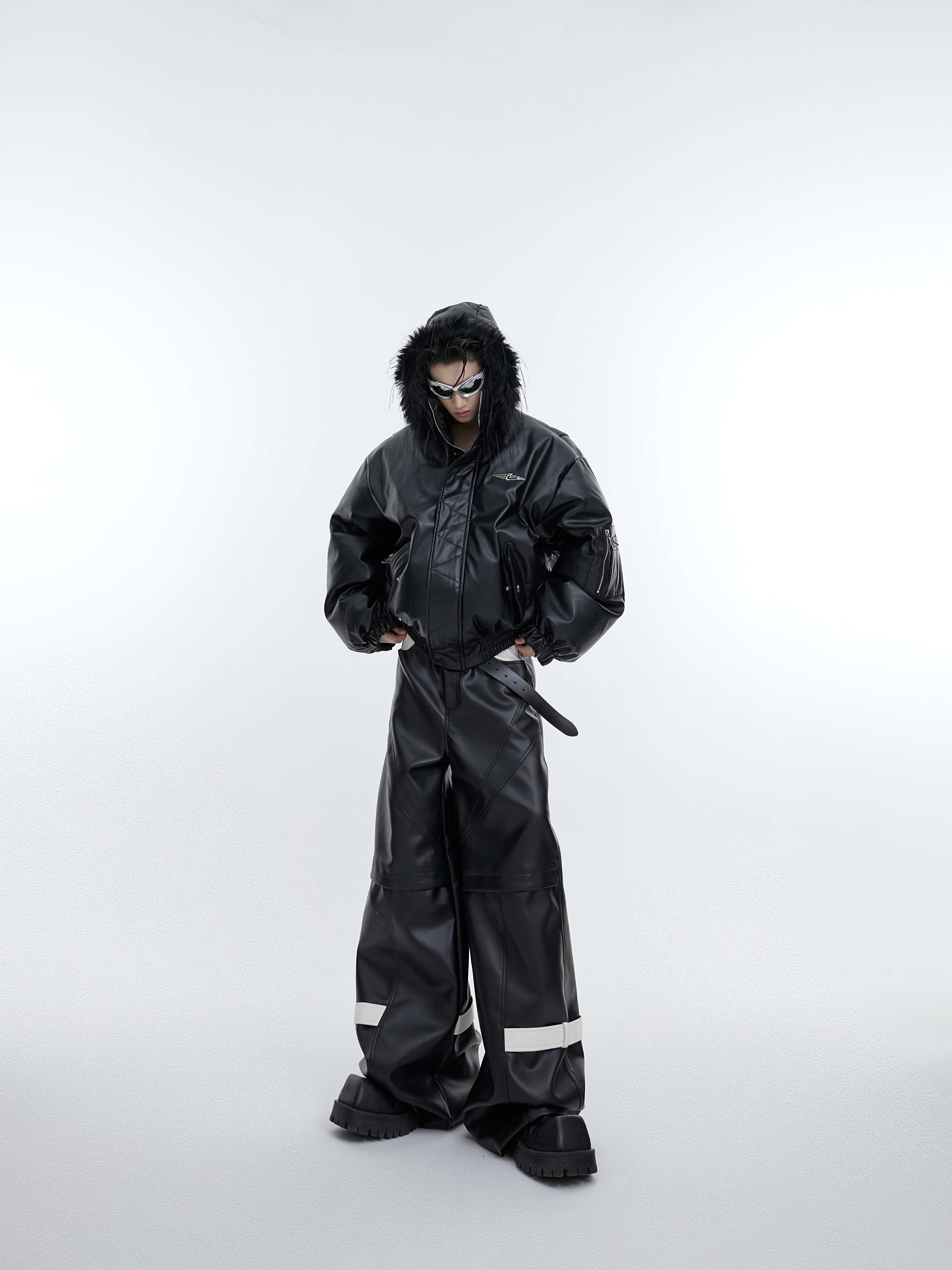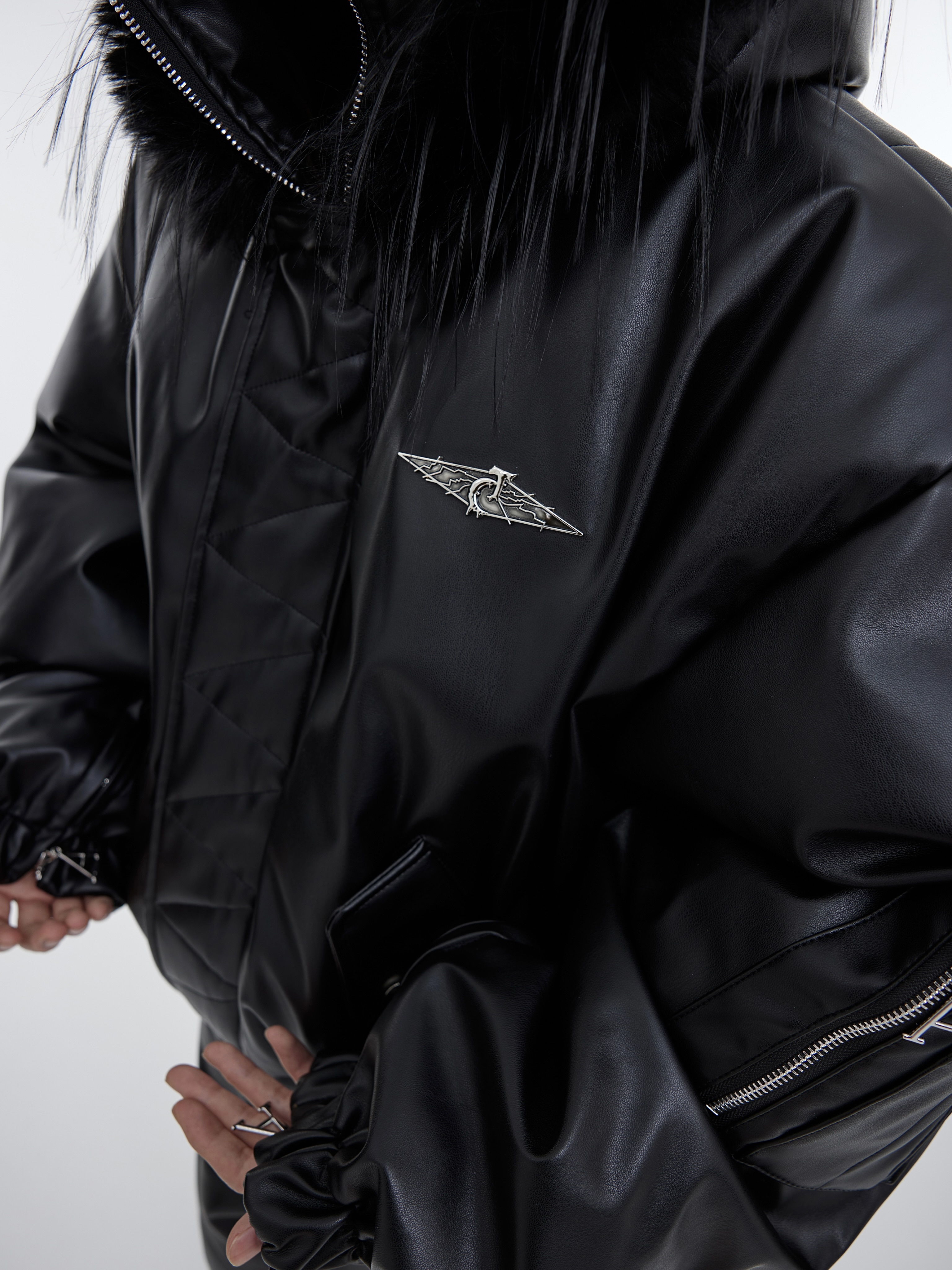 Faux Fur Patchwork PU Leather Hooded Short Puffer Jacket WN9852