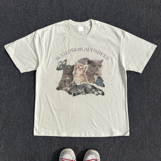 Cat Print Washed Short Sleeve T-Shirt WN15823