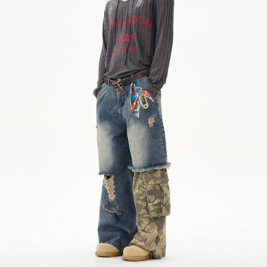 Camouflage Mix Damage Wide Leg Denim Jeans WN16353