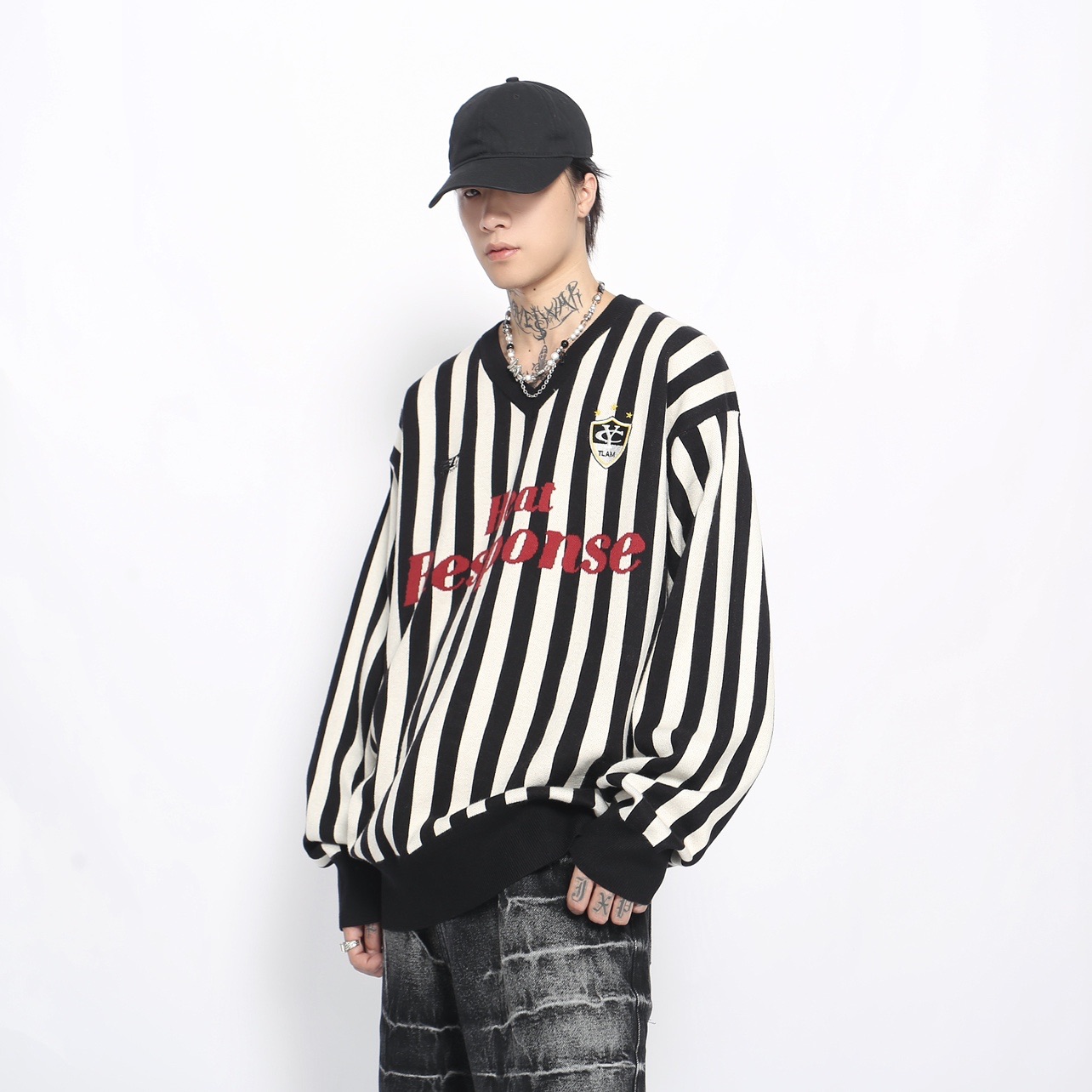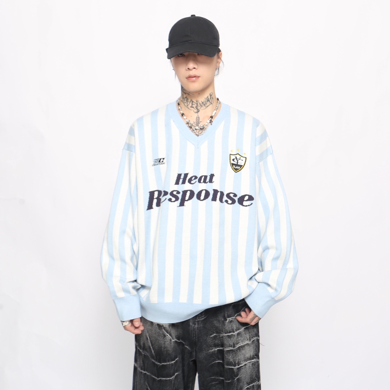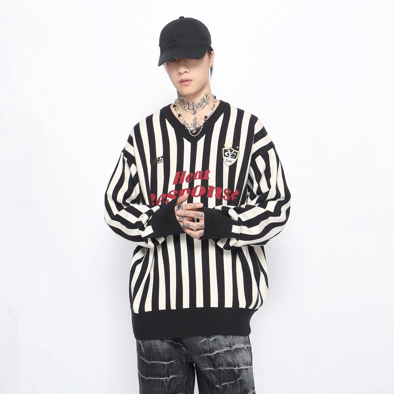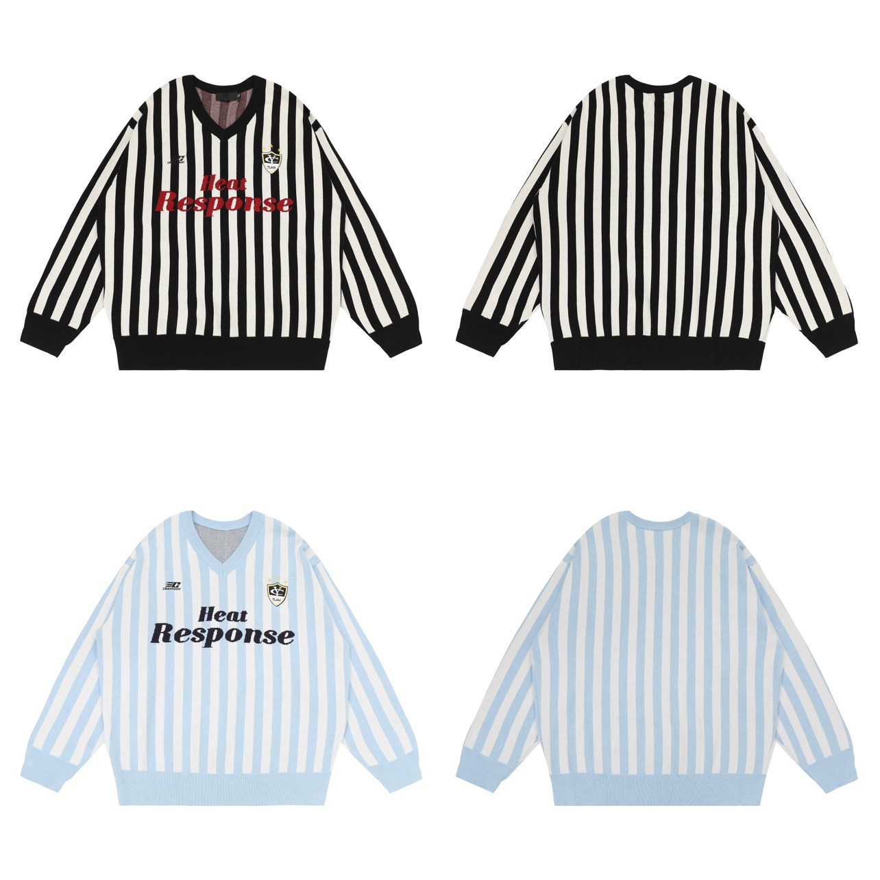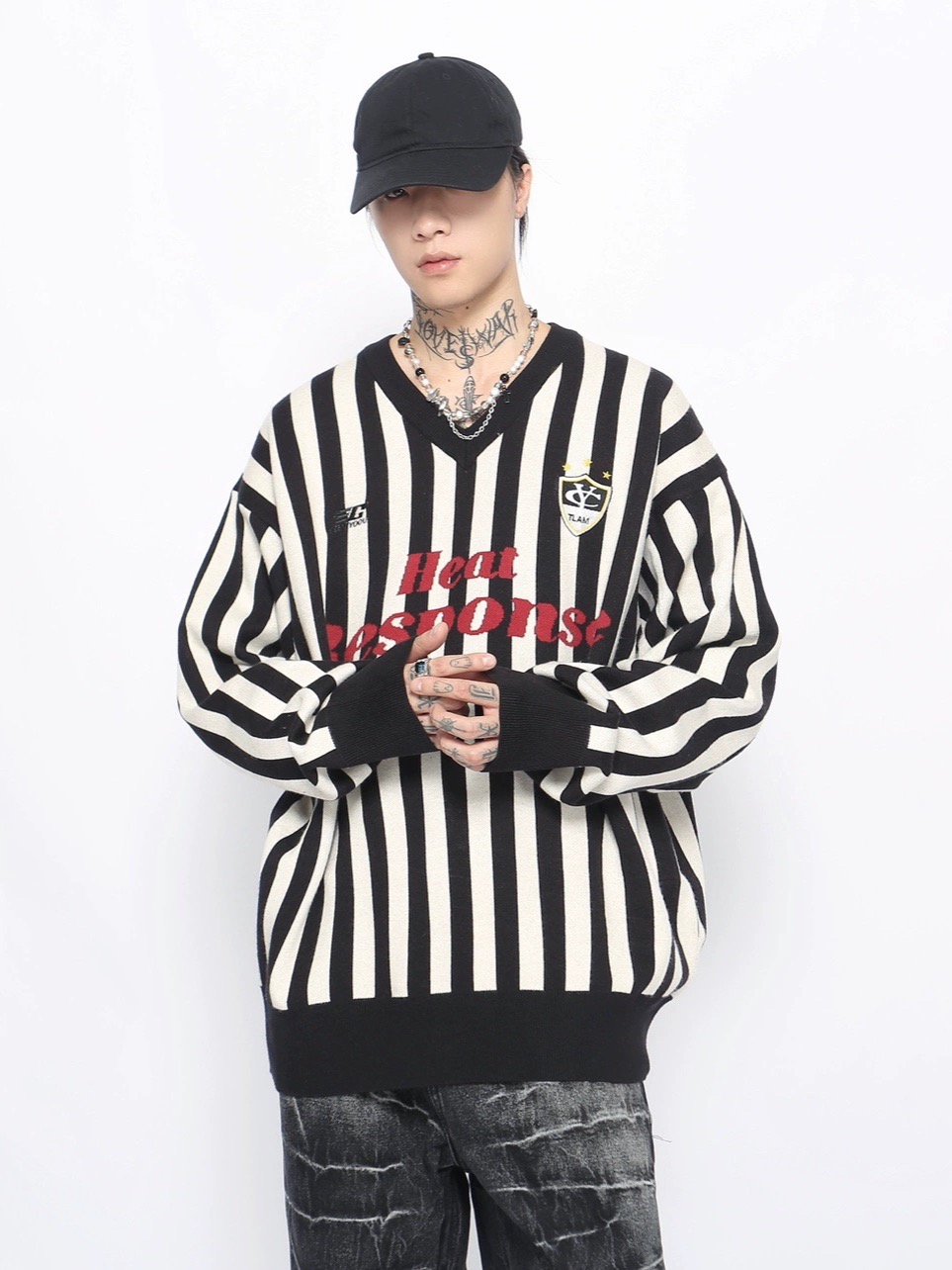 Badge Print Stripe V-Neck Knit Sweater WN10889