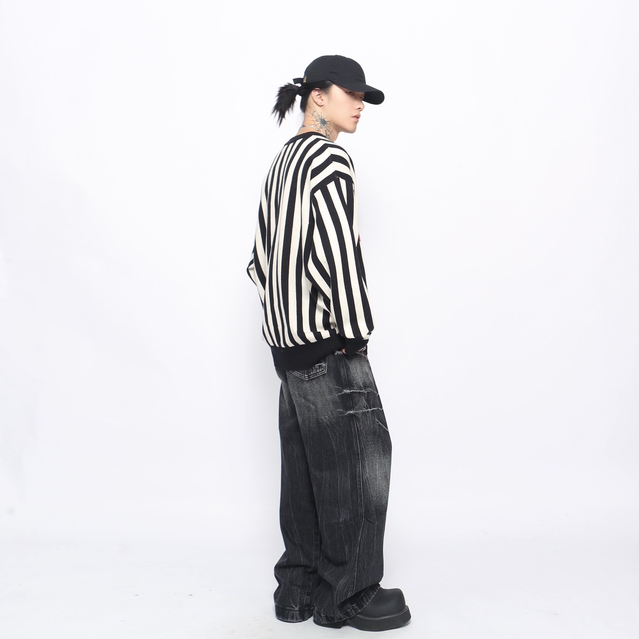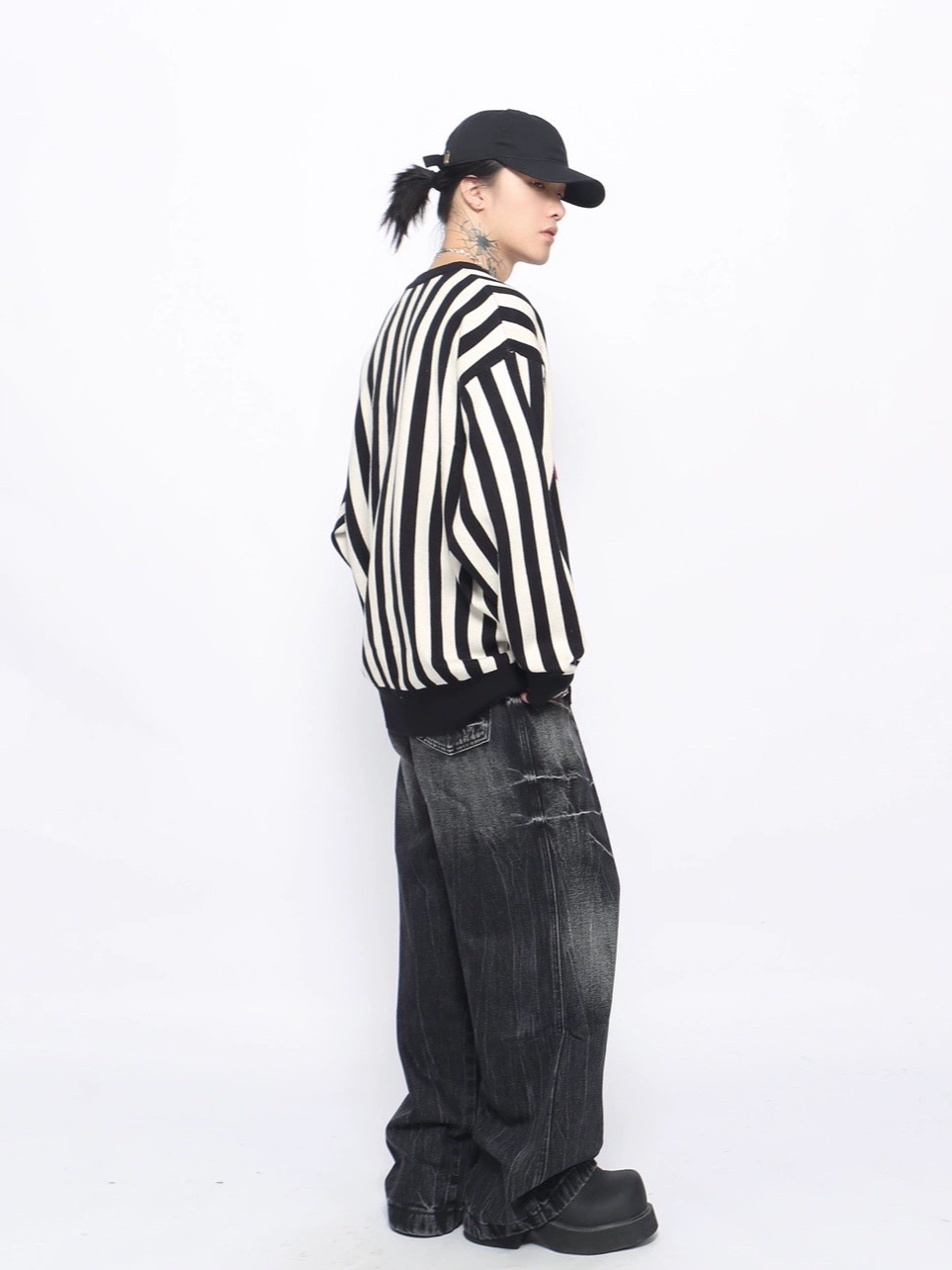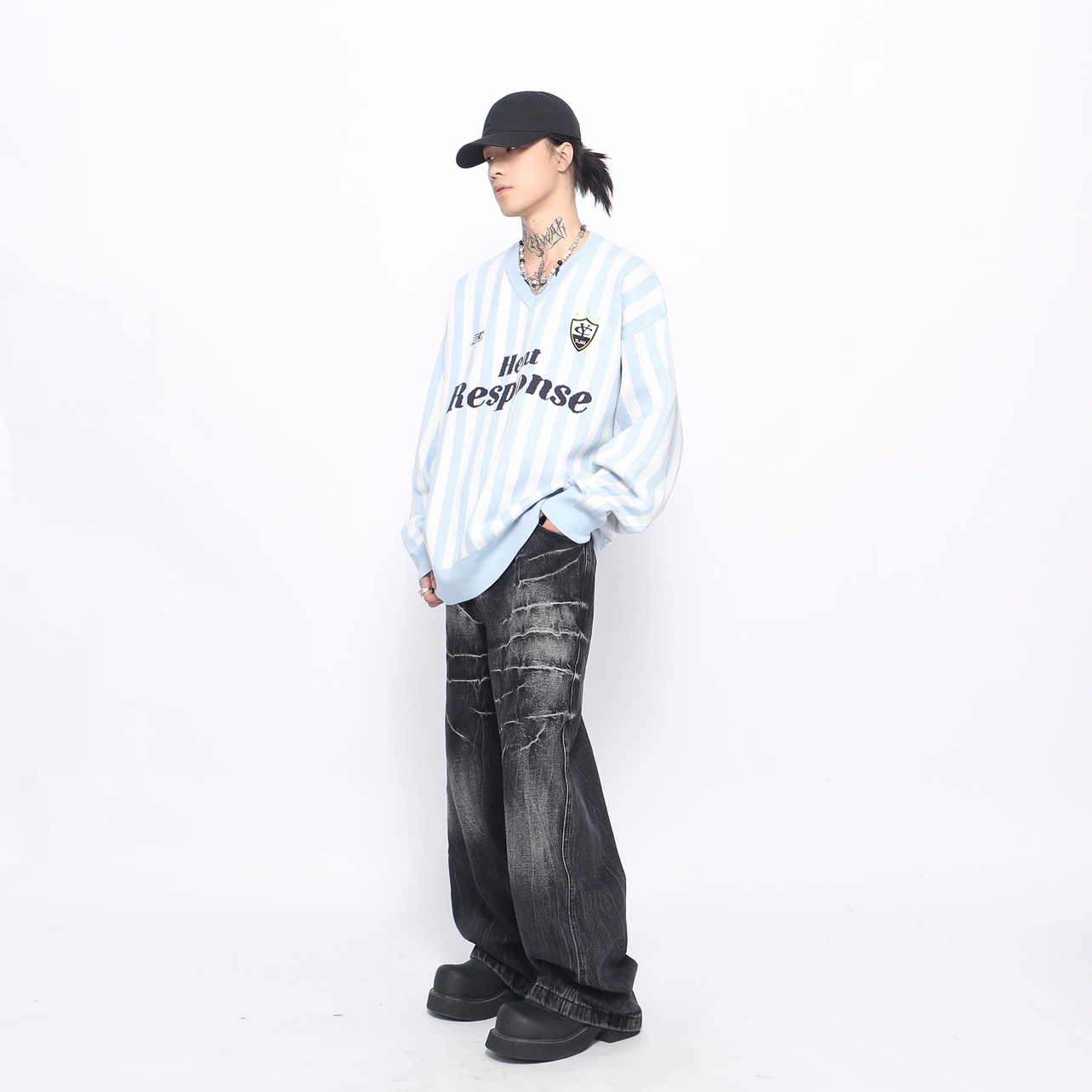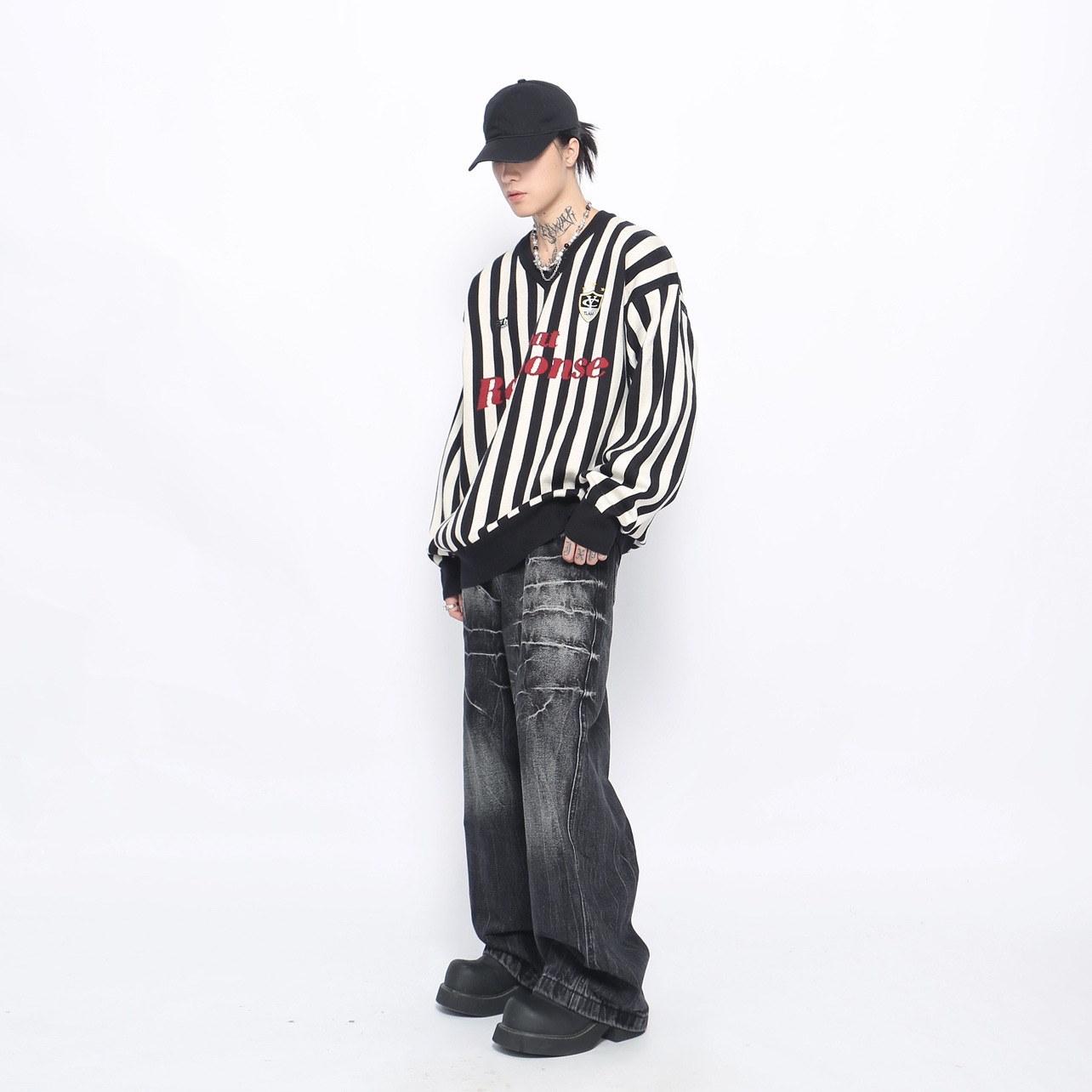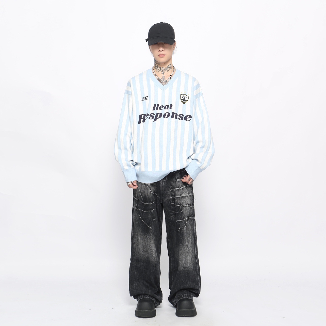 Badge Print Stripe V-Neck Knit Sweater WN10889