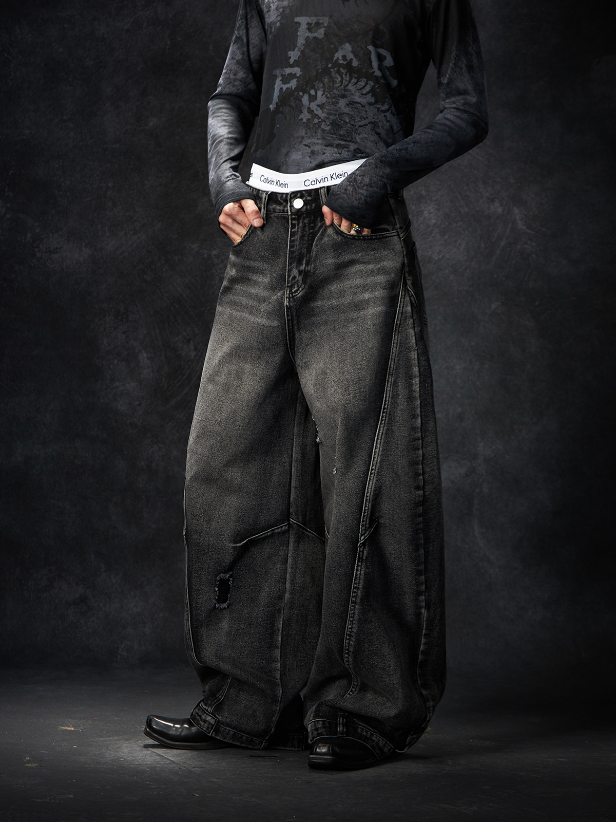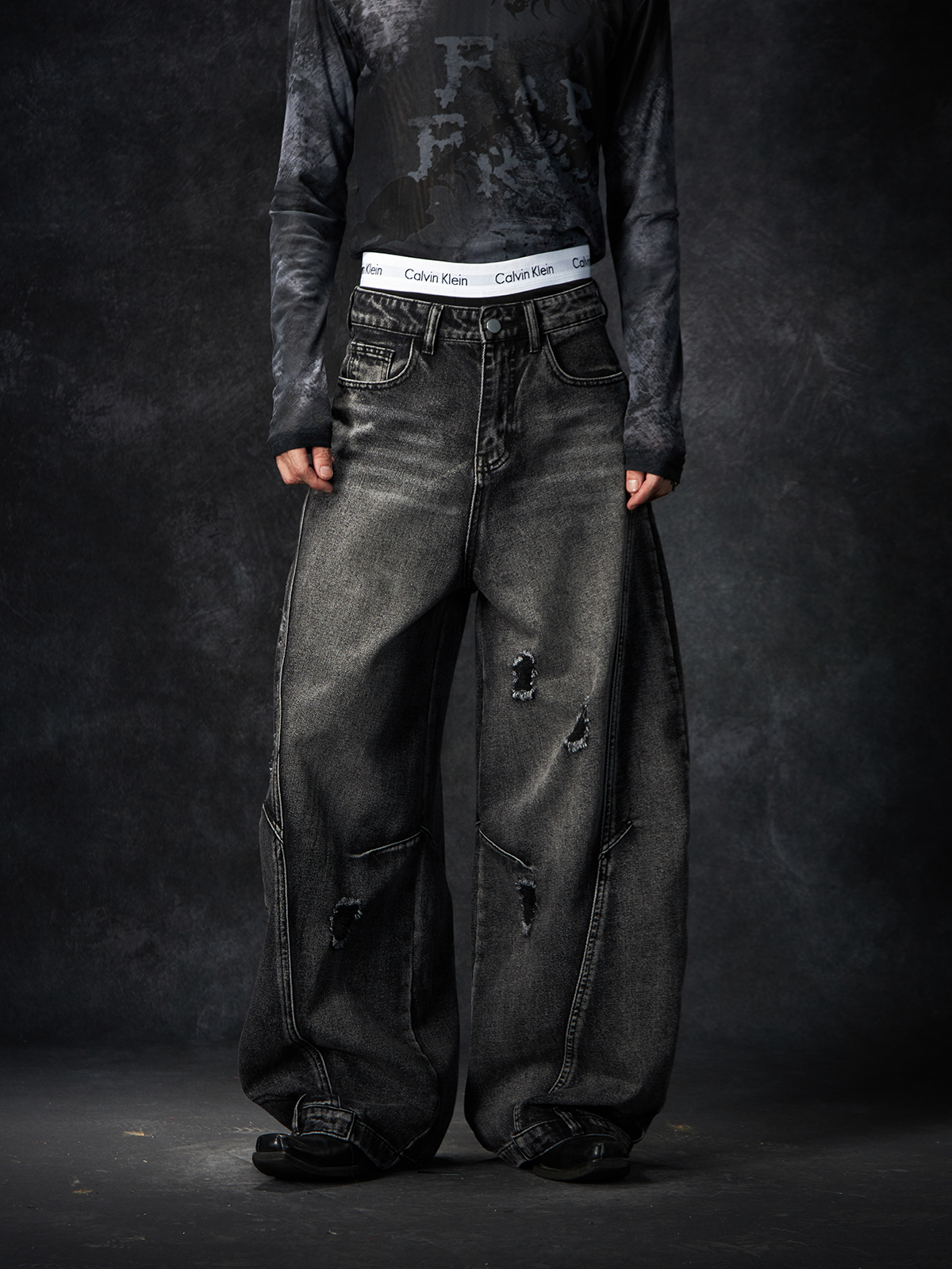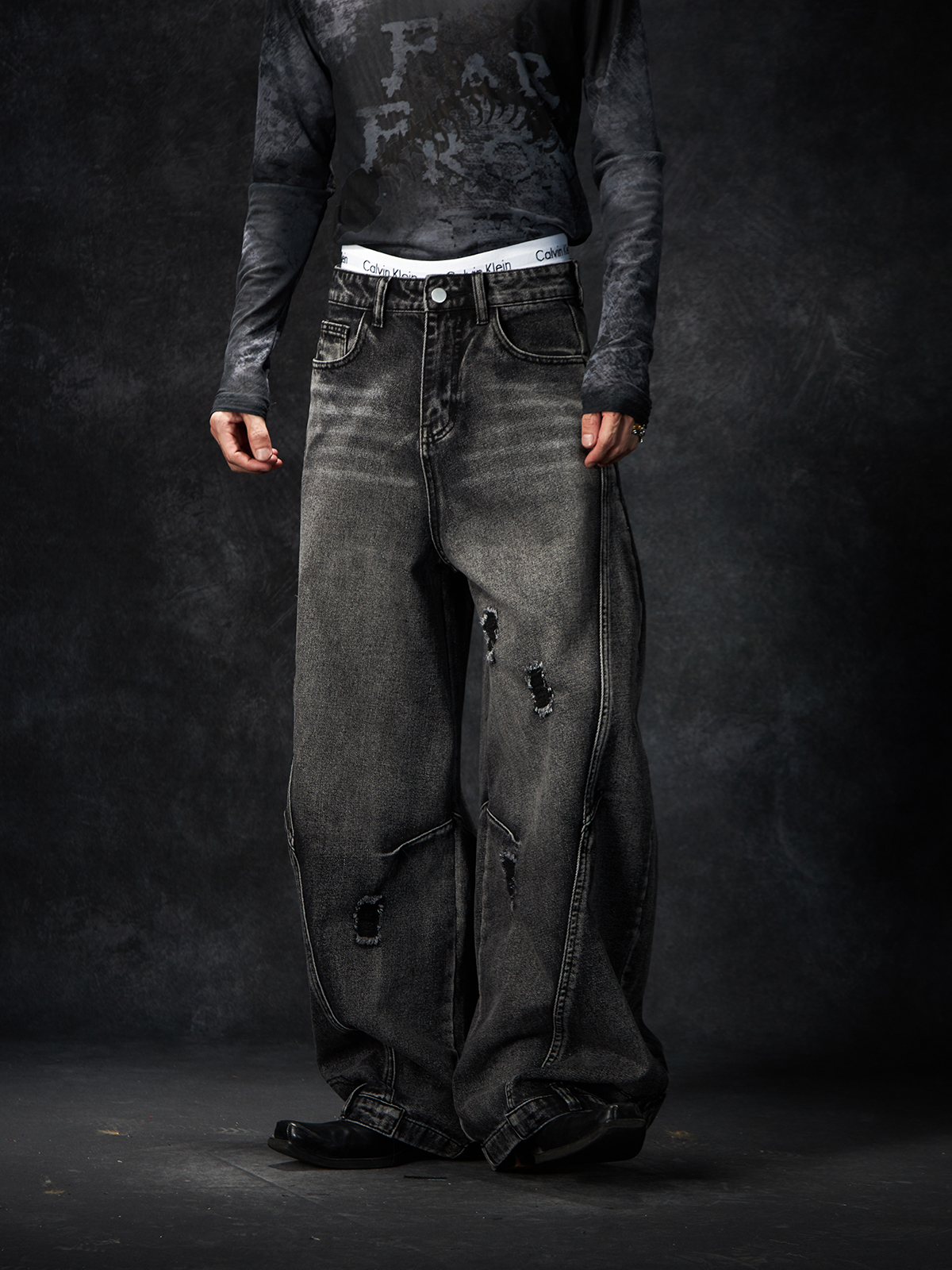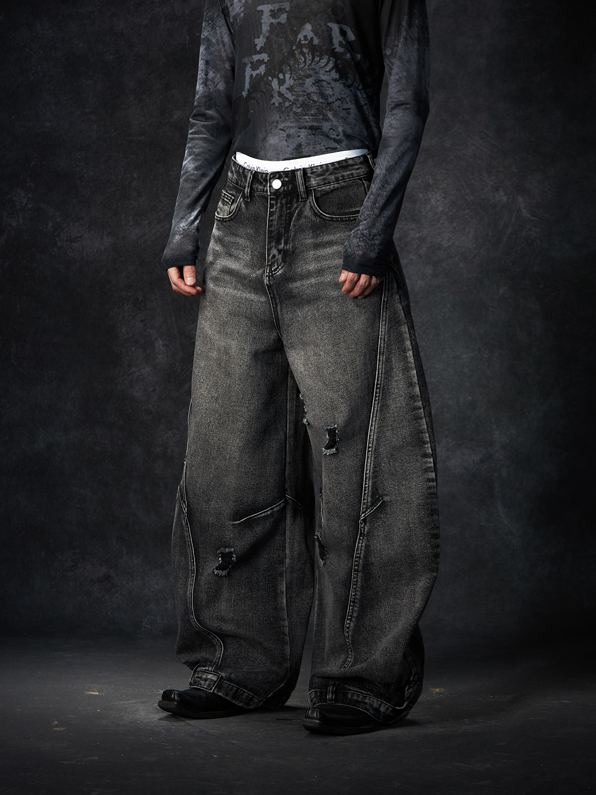 Slit Damage Washed Wide-leg Denim Jeans WN15244