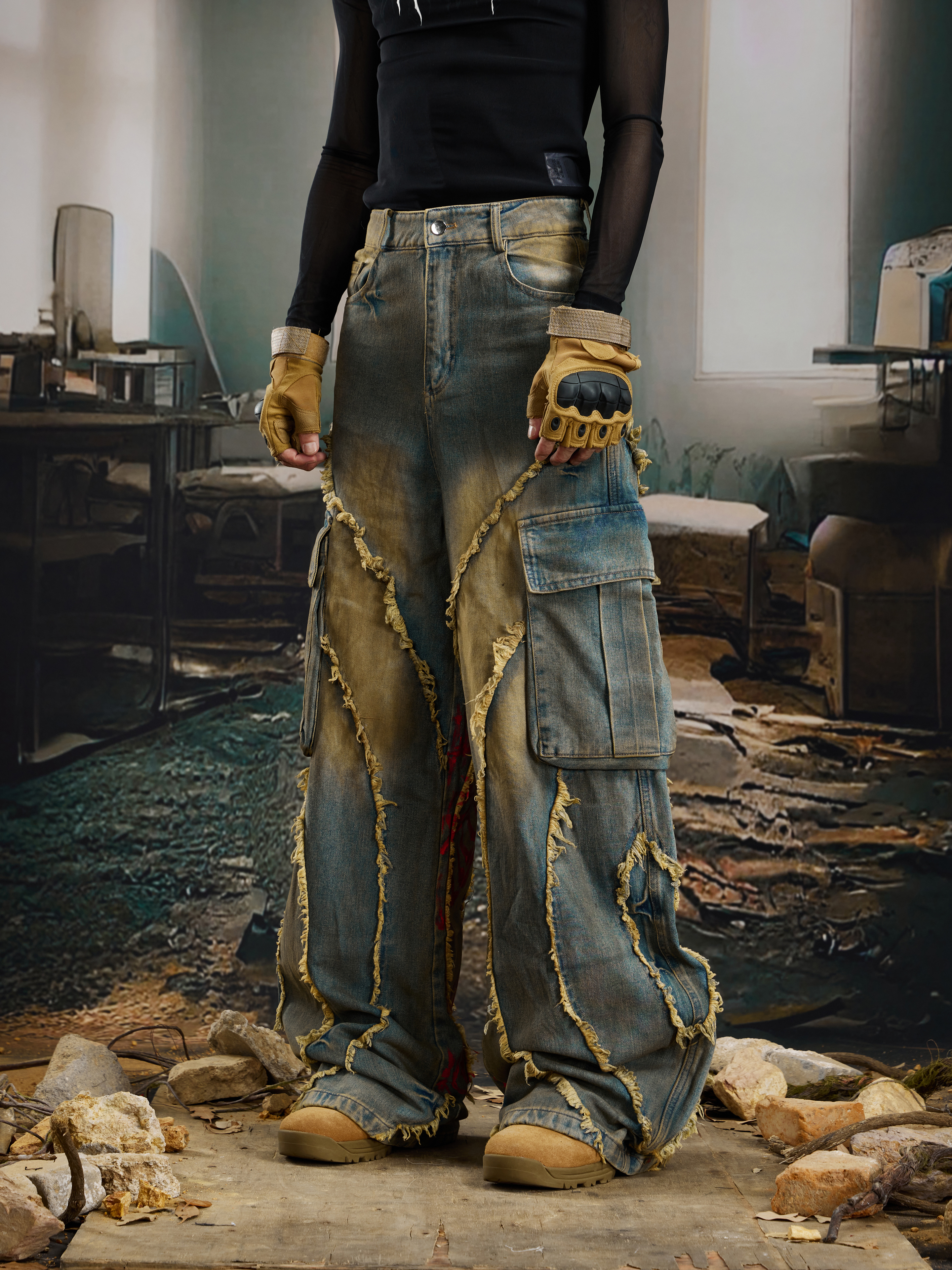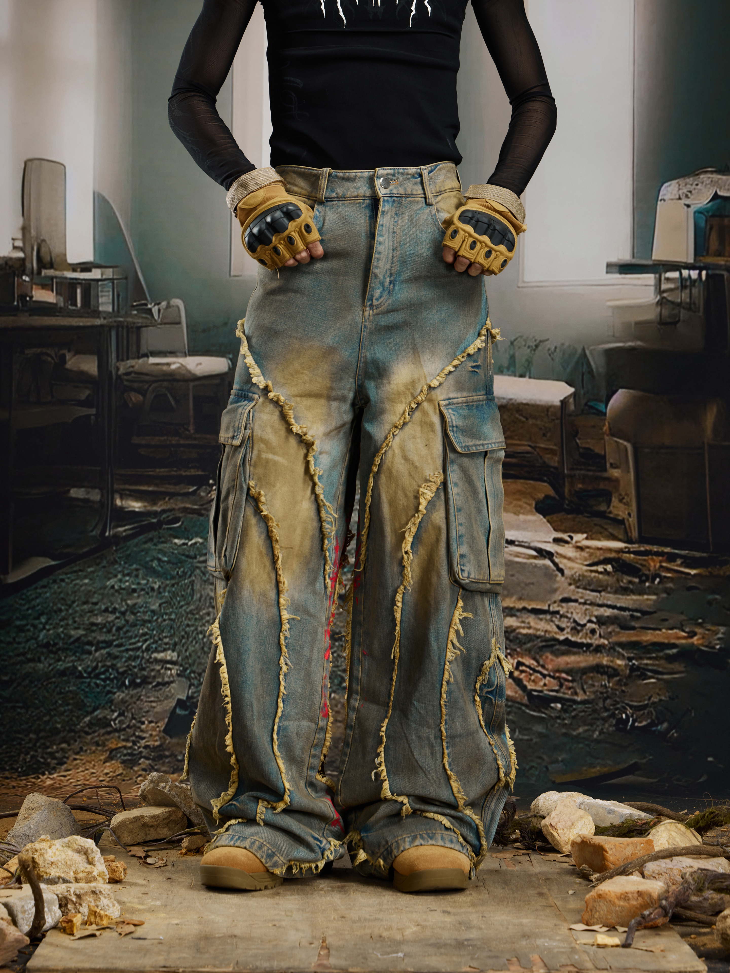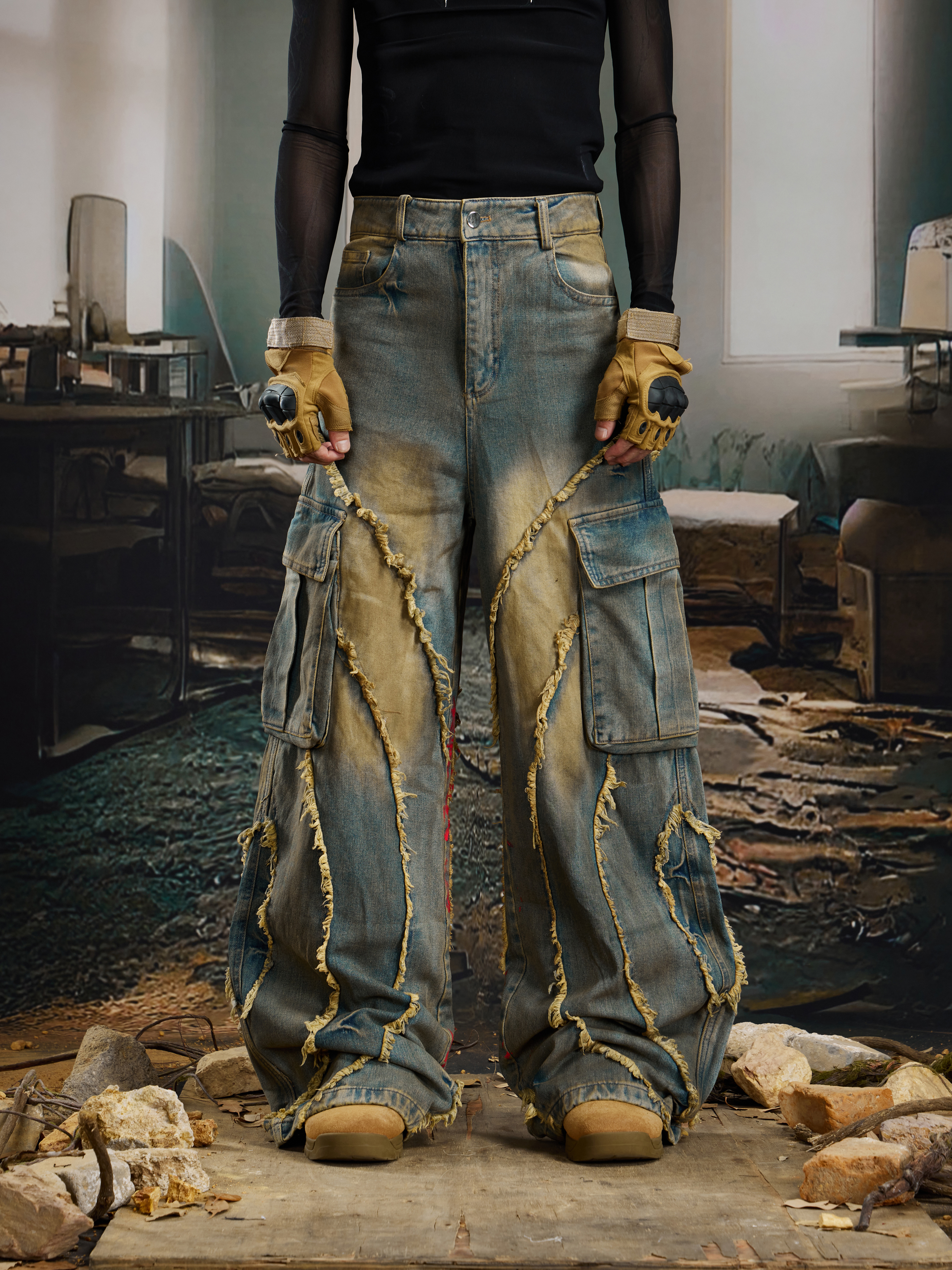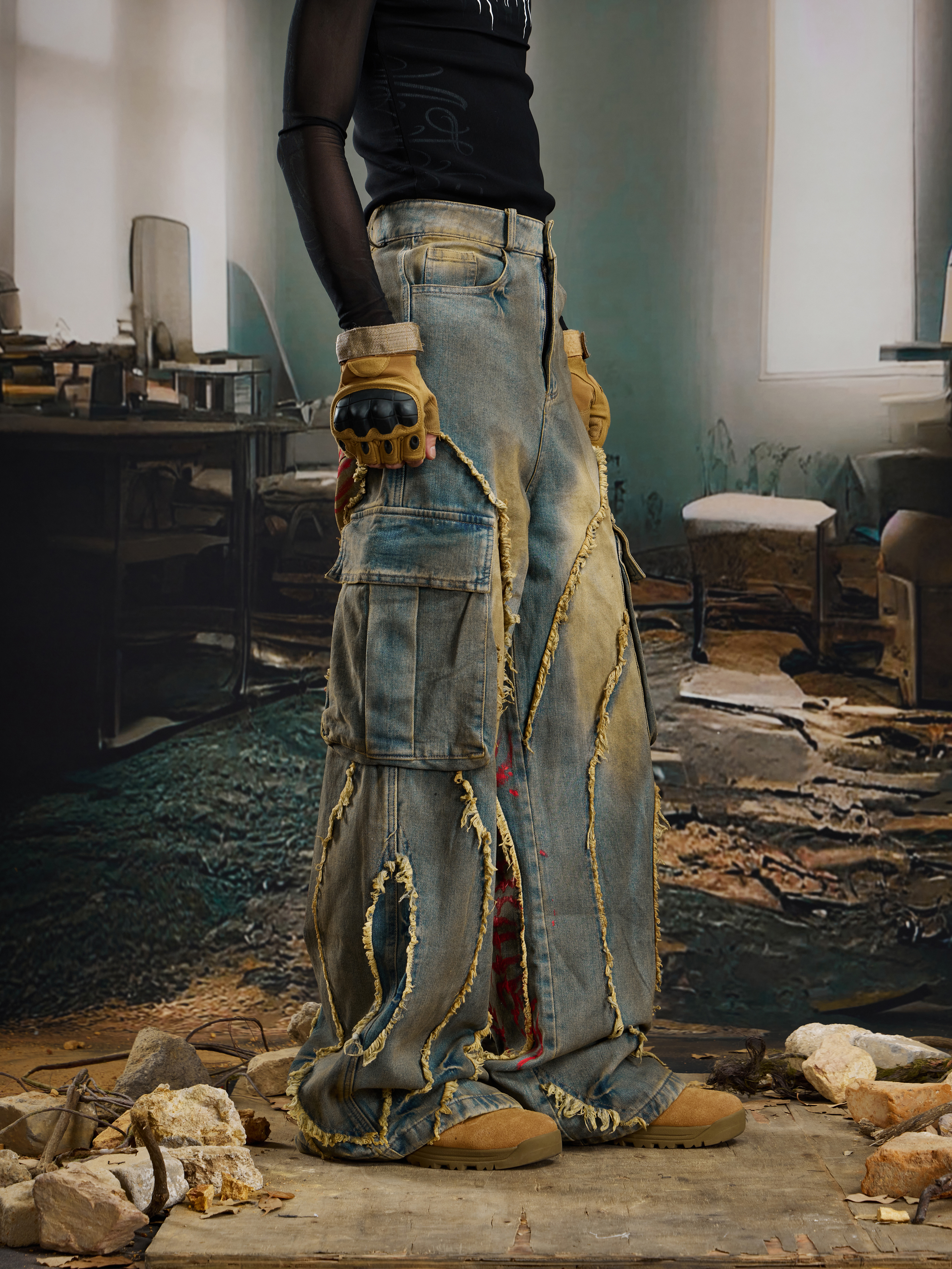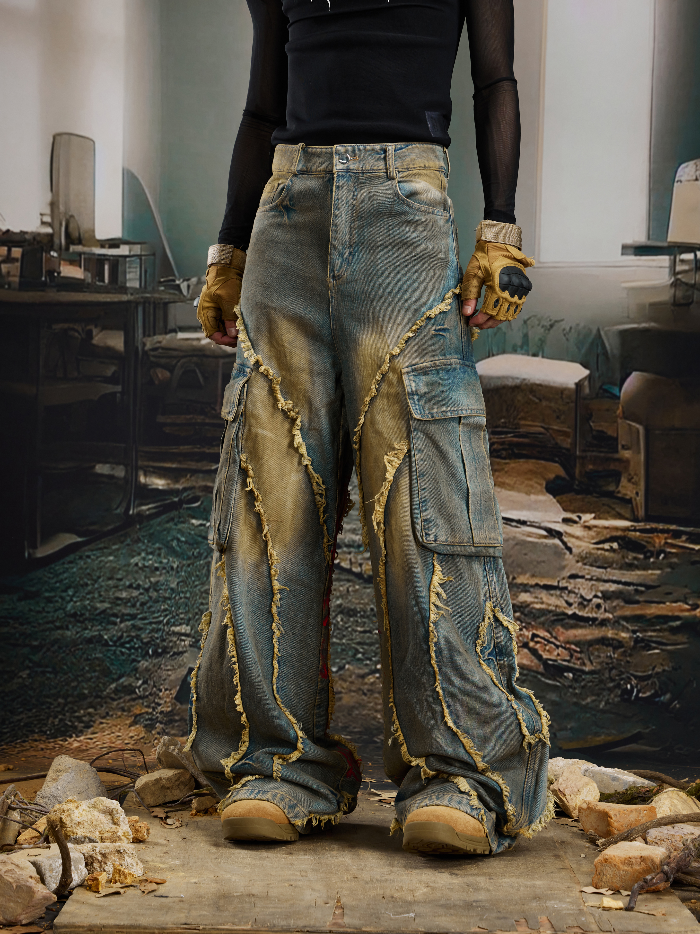 Washed Damage Fringe Pocket Paint Wide Leg Cargo Denim Jeans WN21382