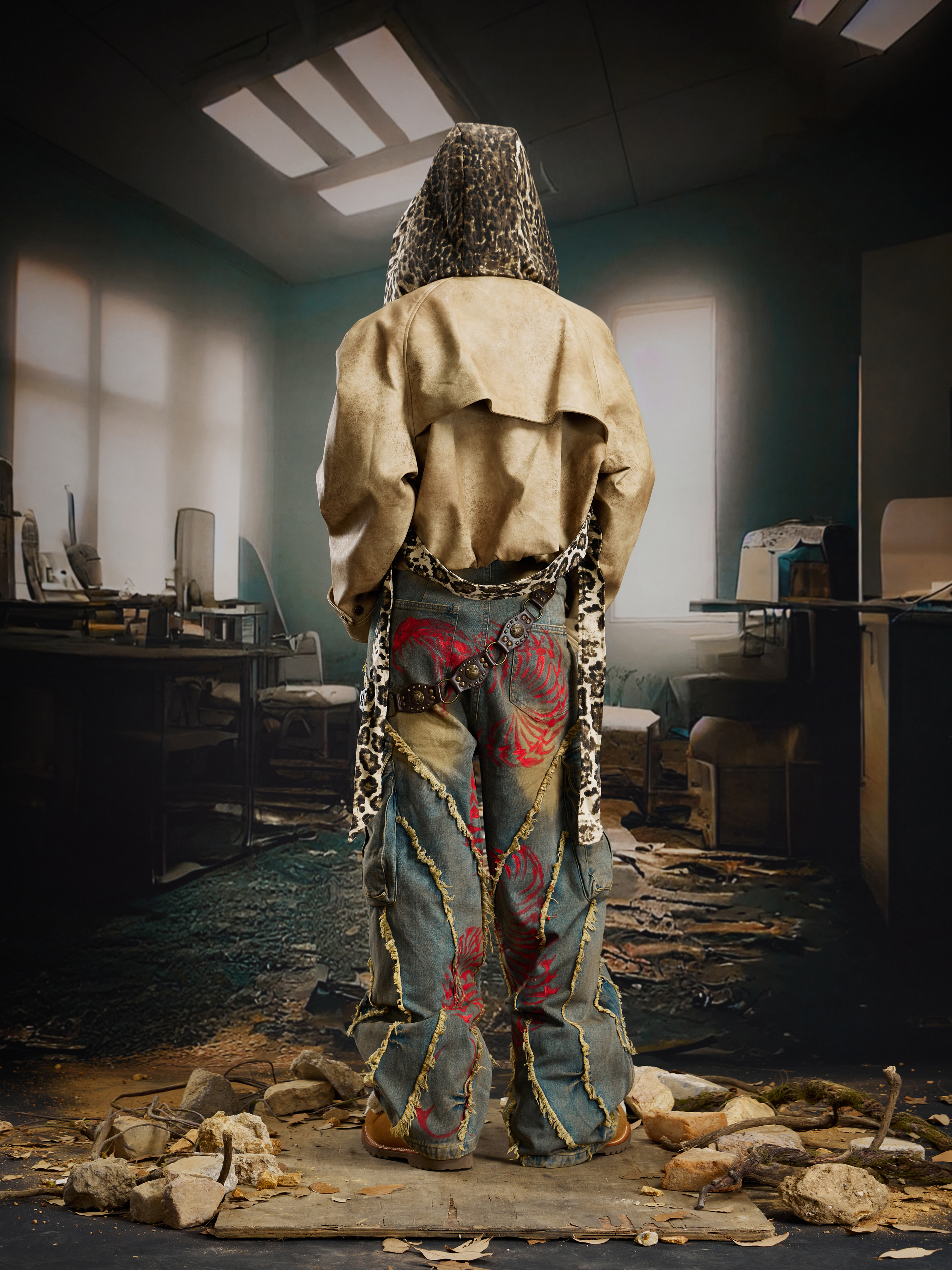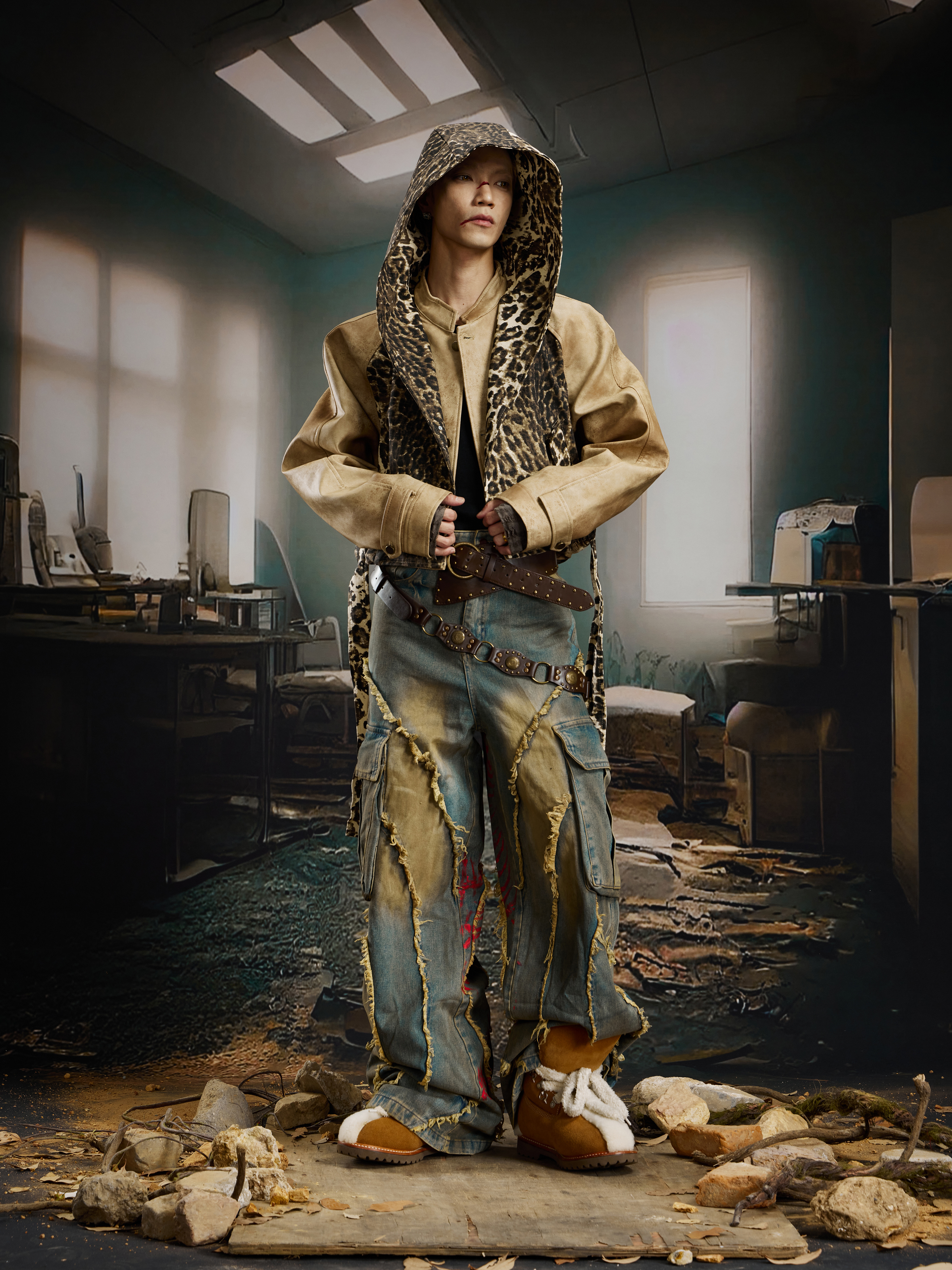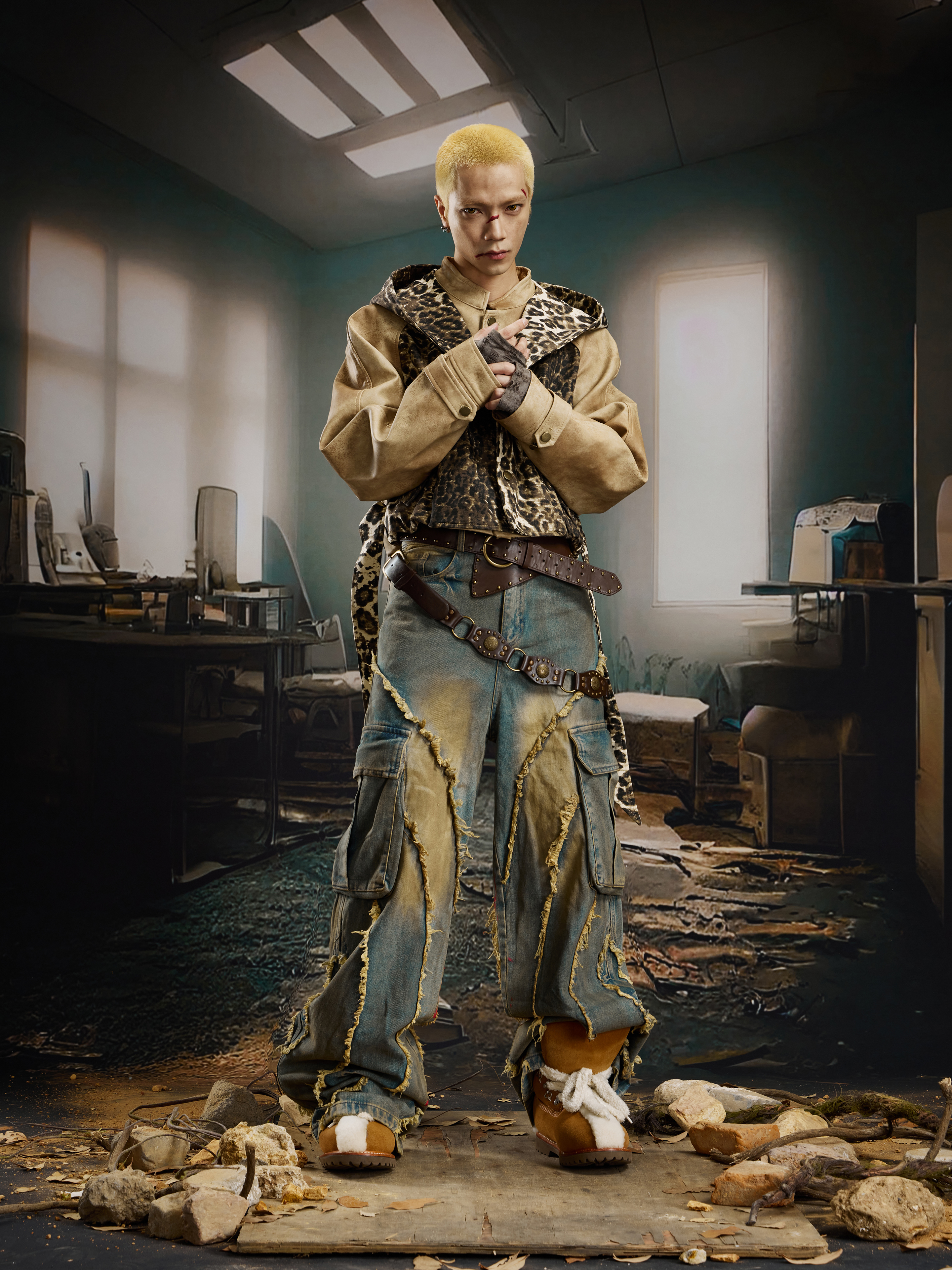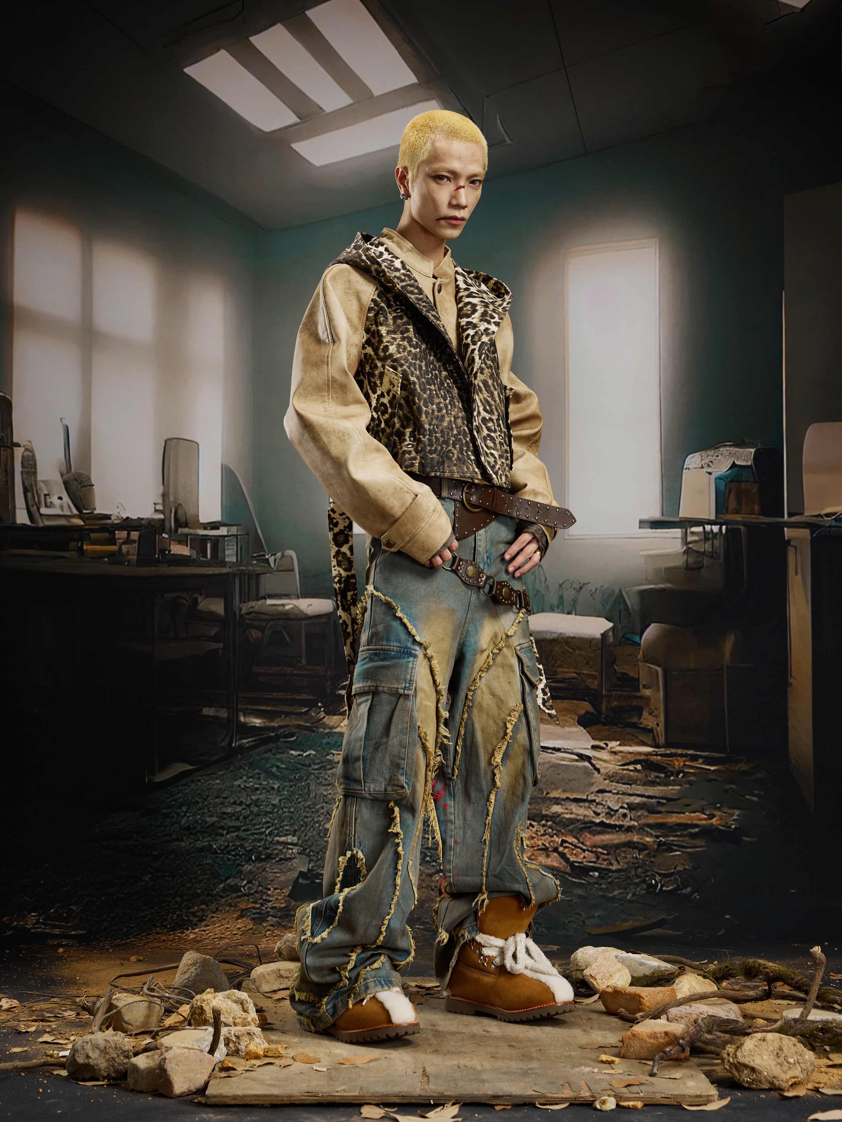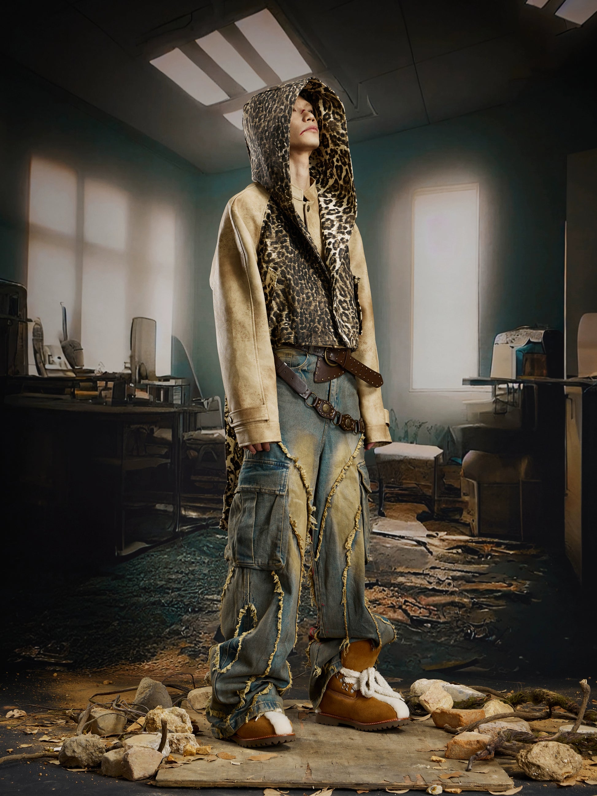 Washed Damage Fringe Pocket Paint Wide Leg Cargo Denim Jeans WN21382