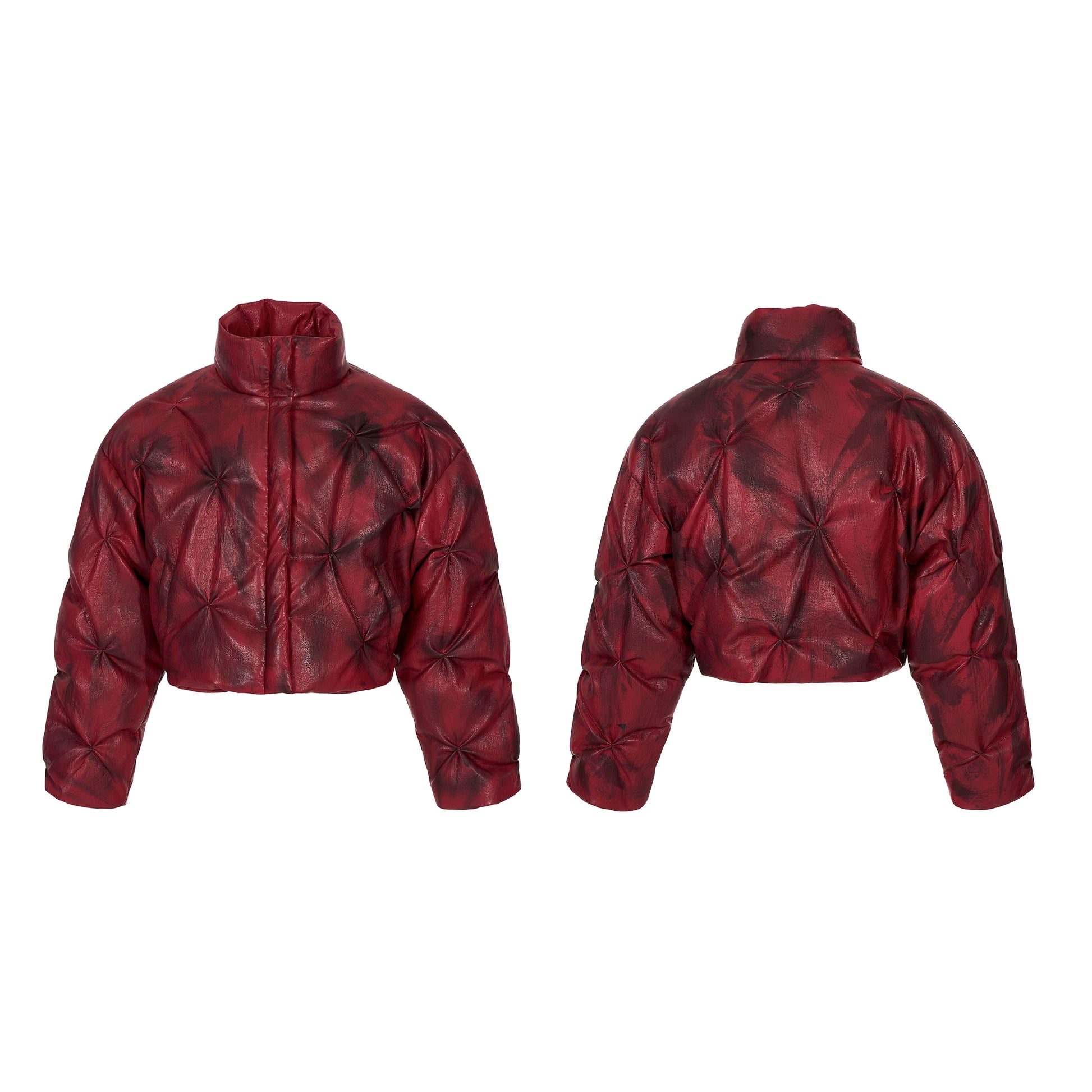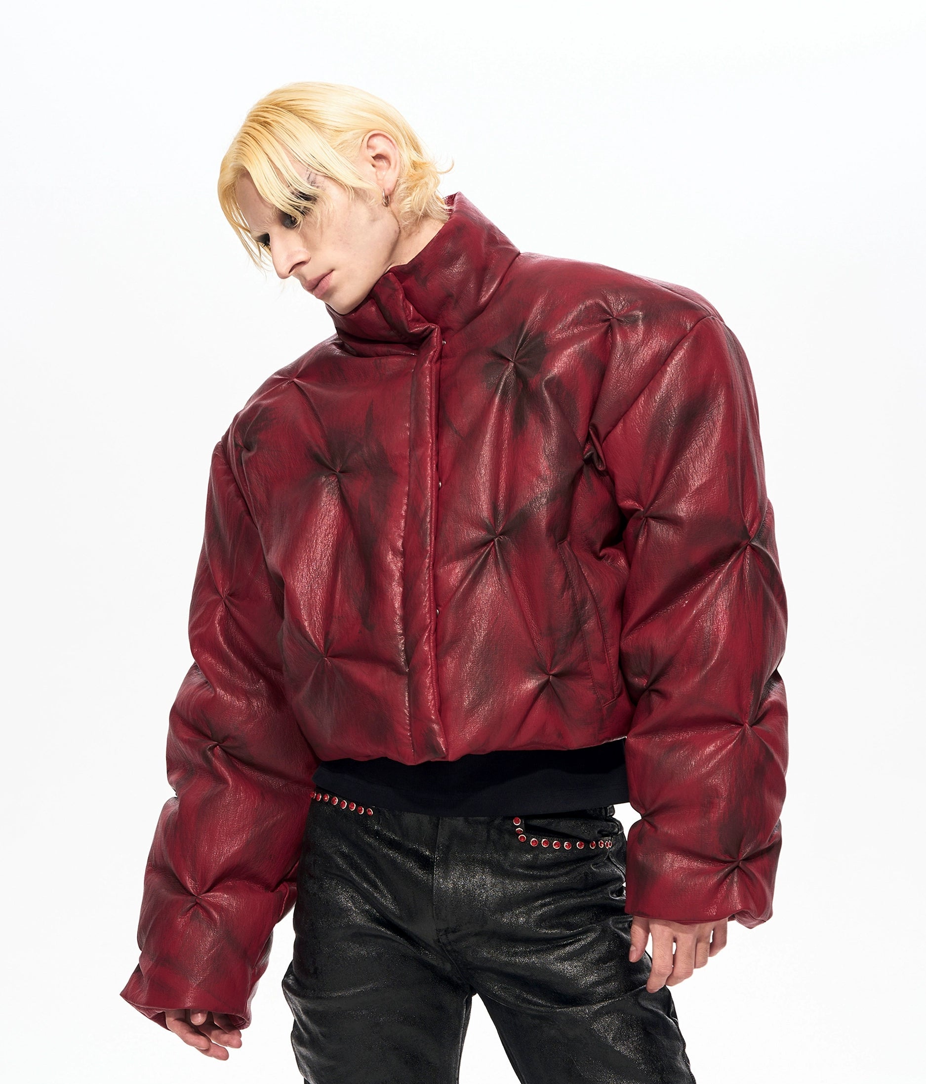 Stand Neck Pleats Washed Short PU Leather Puffer Jacket WN22133
