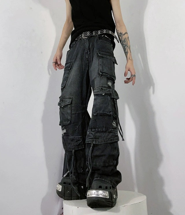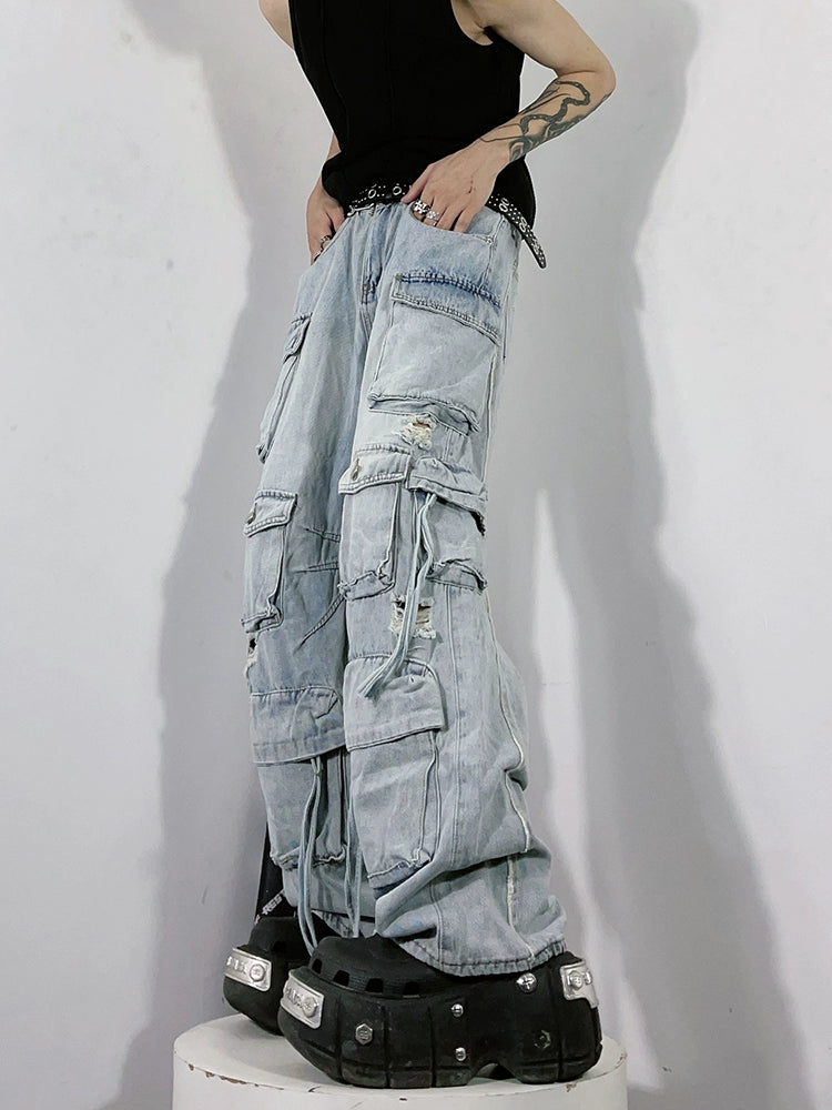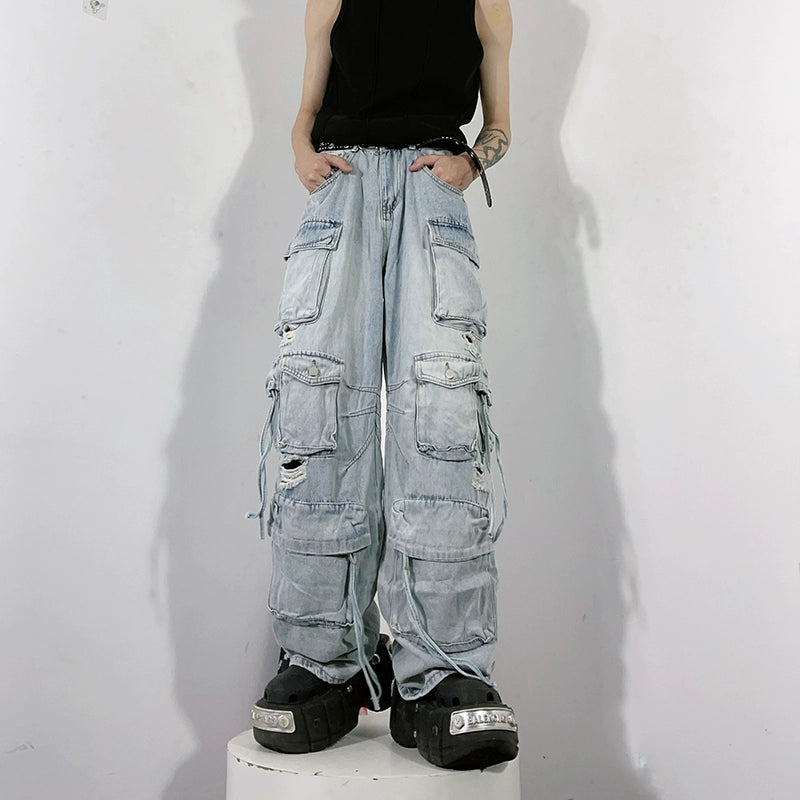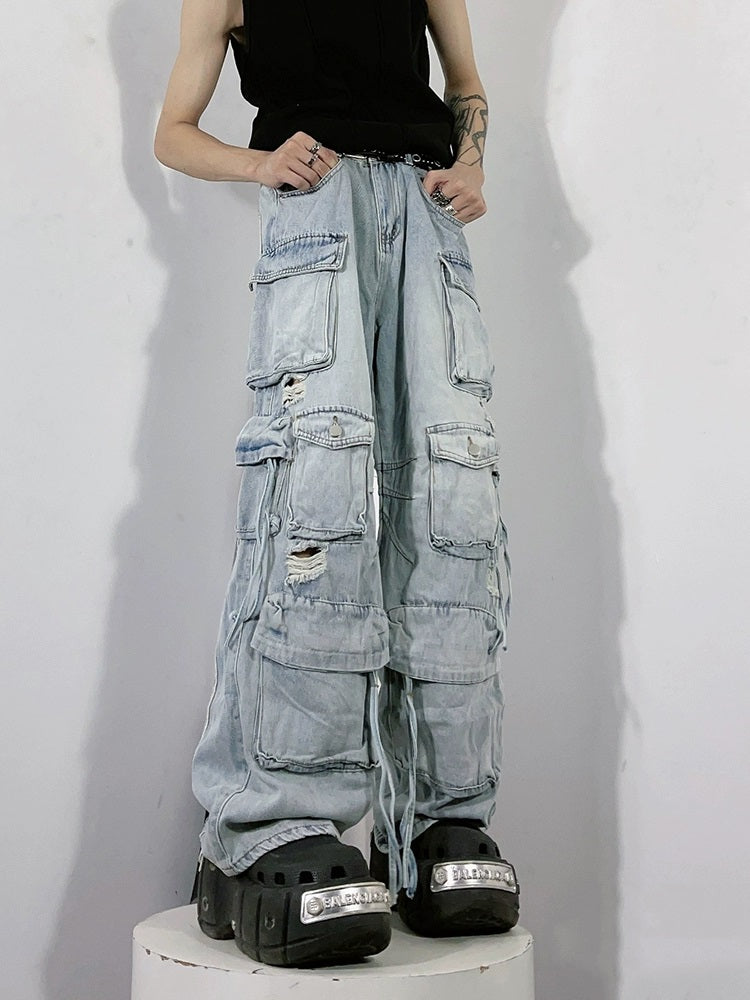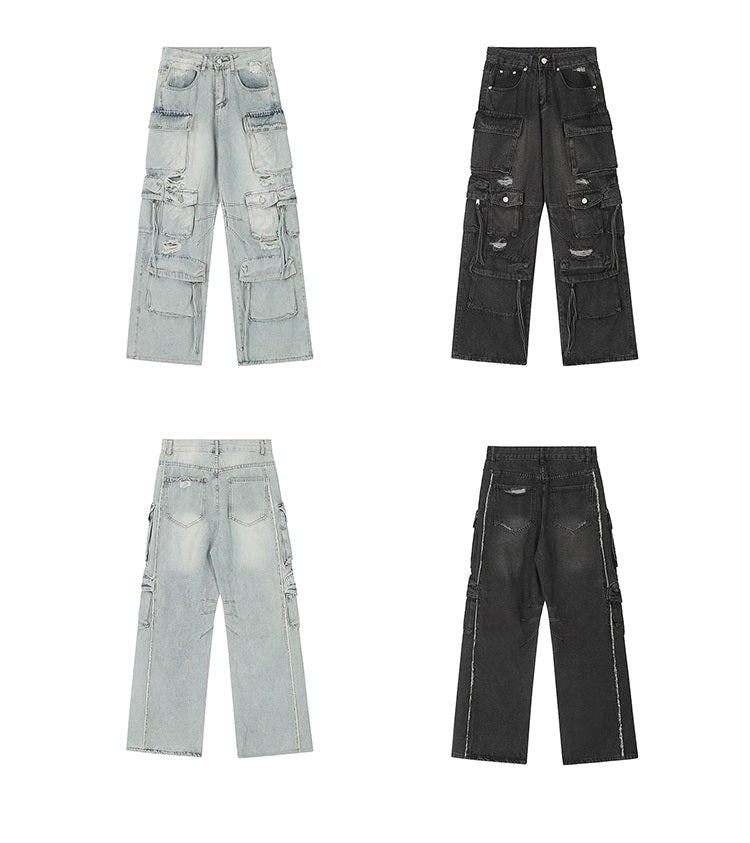 Wide-leg Multi-pocket Damage Denim Jeans WN3244