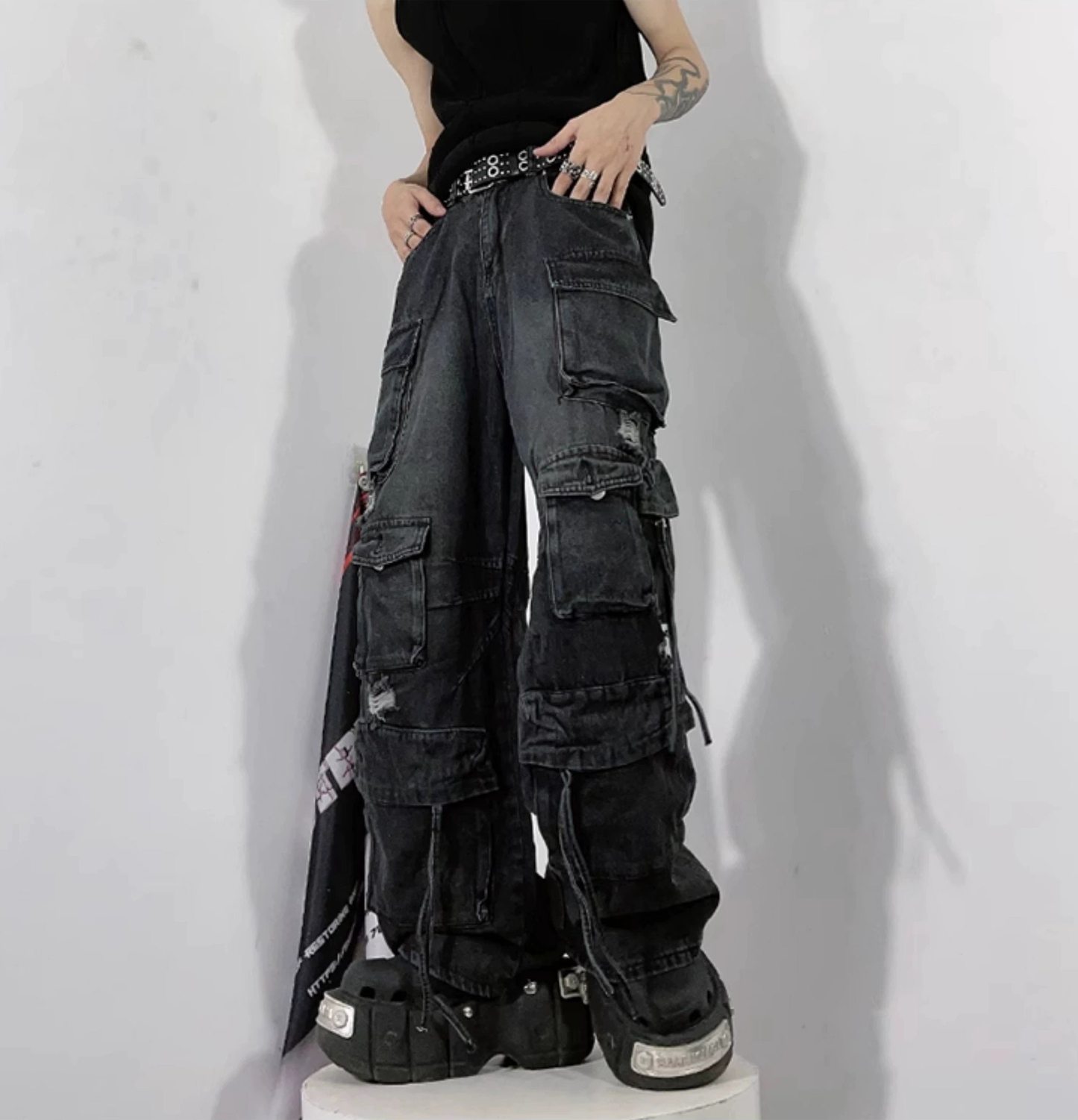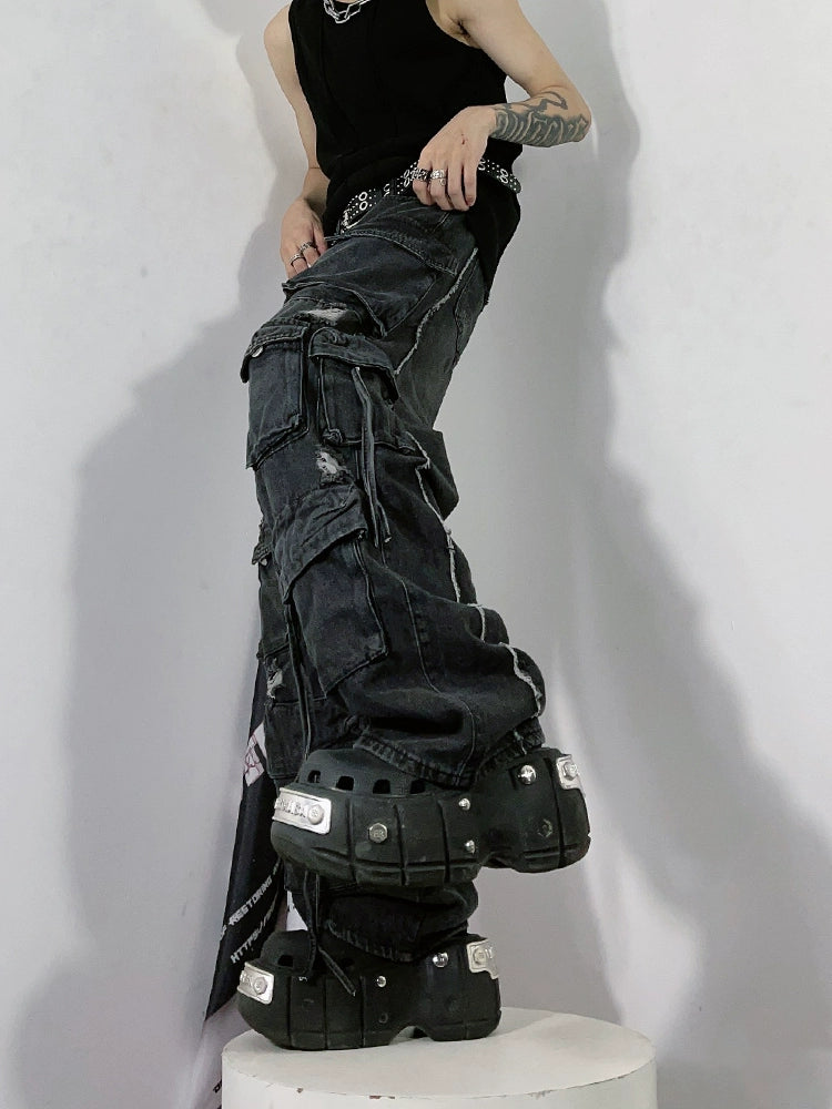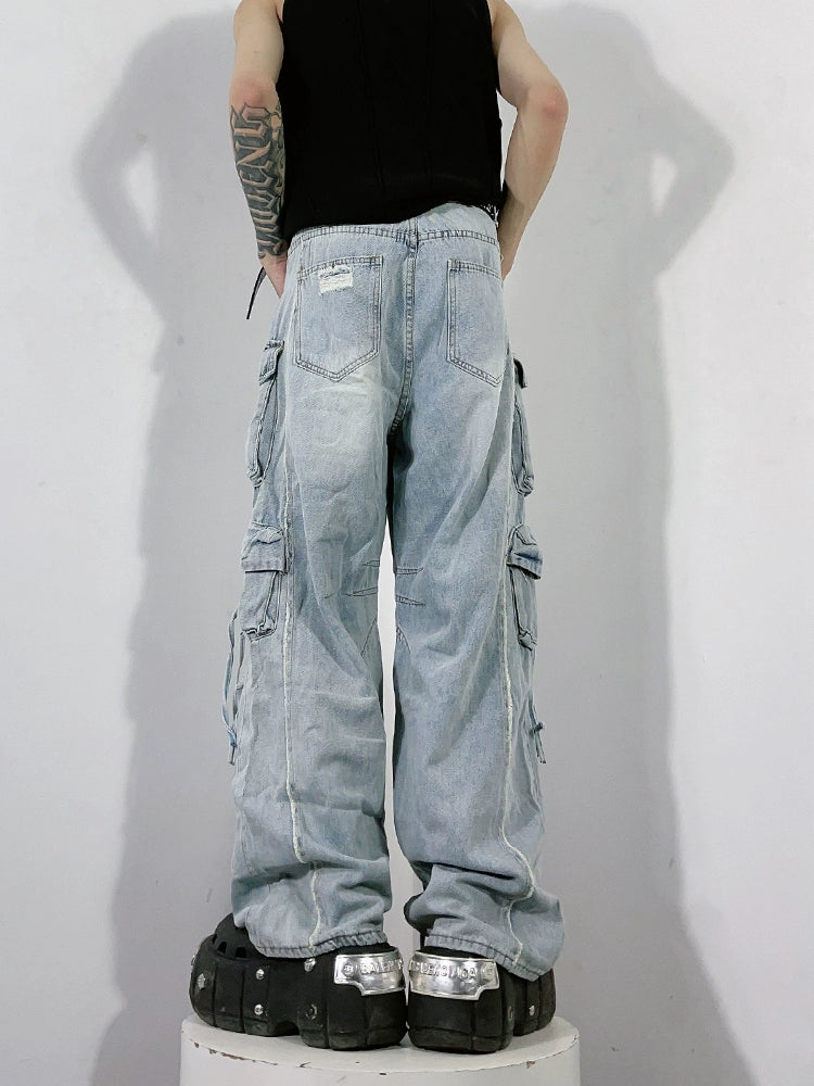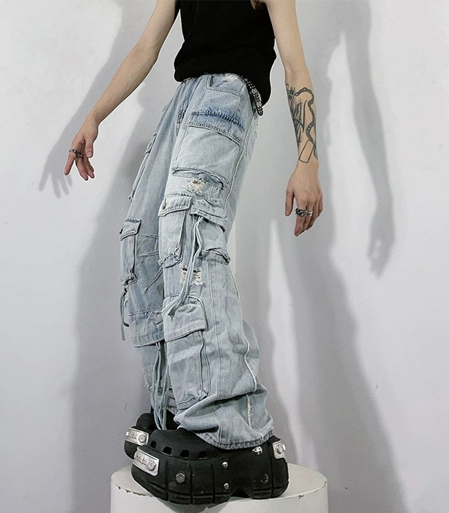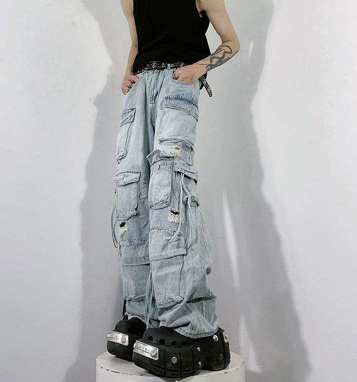 Wide-leg Multi-pocket Damage Denim Jeans WN3244