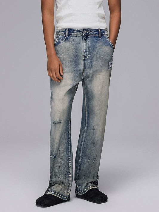 Wash Damage Embroidery Wide Leg Denim Jeans WN22359