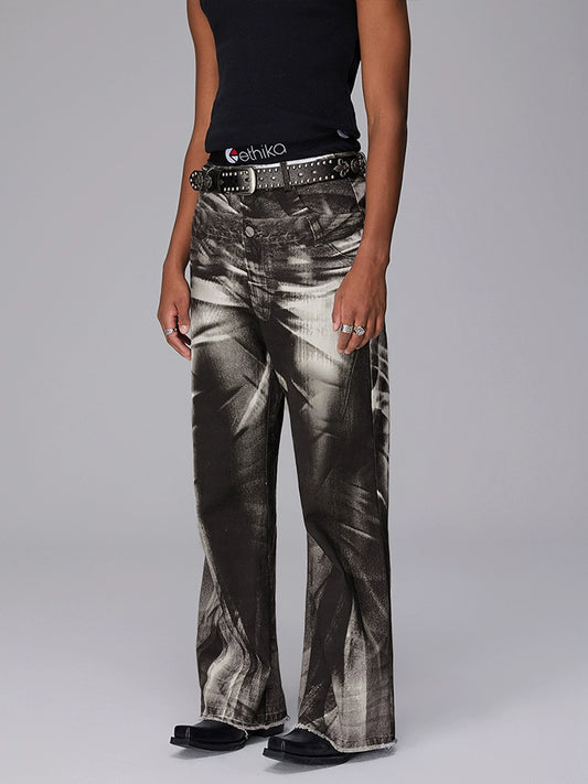 Cross Print Damage Wide Leg Denim Jeans WN22227