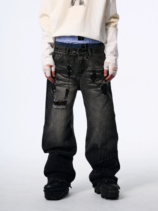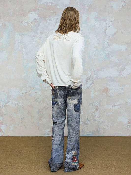 Damage Wash Mix Patch Deconstruct Wide Leg Denim Jeans WN22413