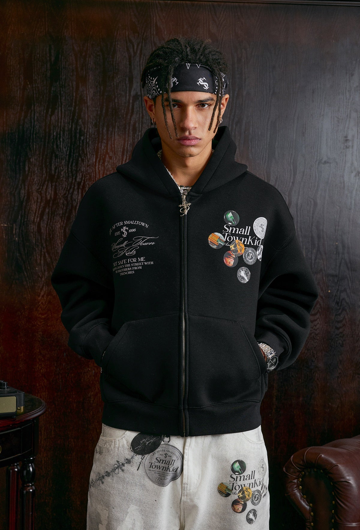 Badge Print Zipper Hoodie WN12038
