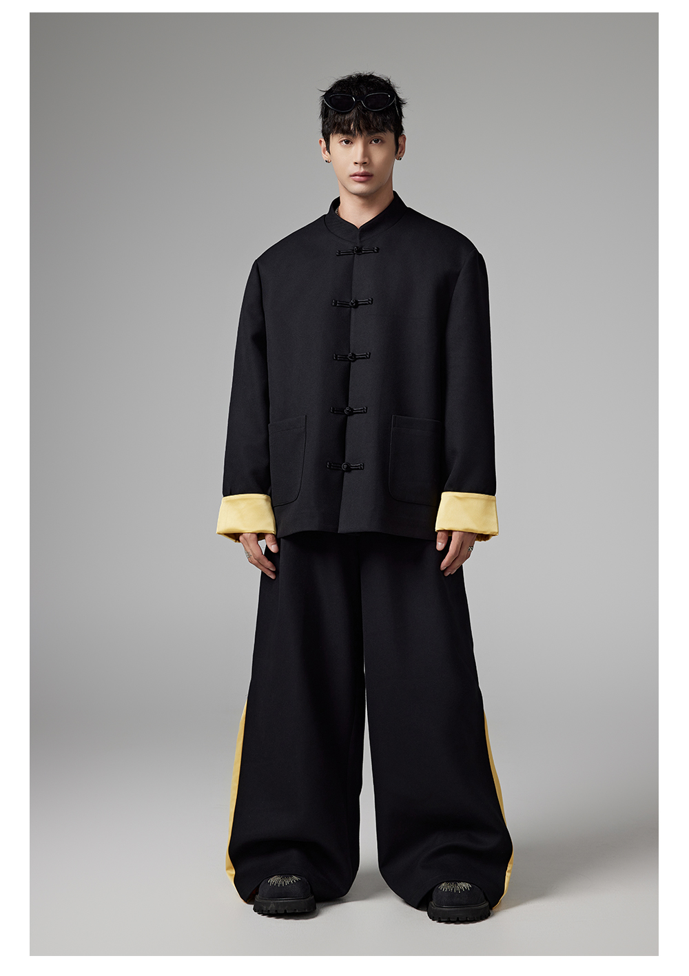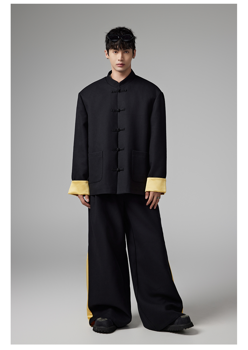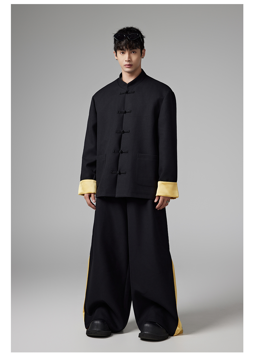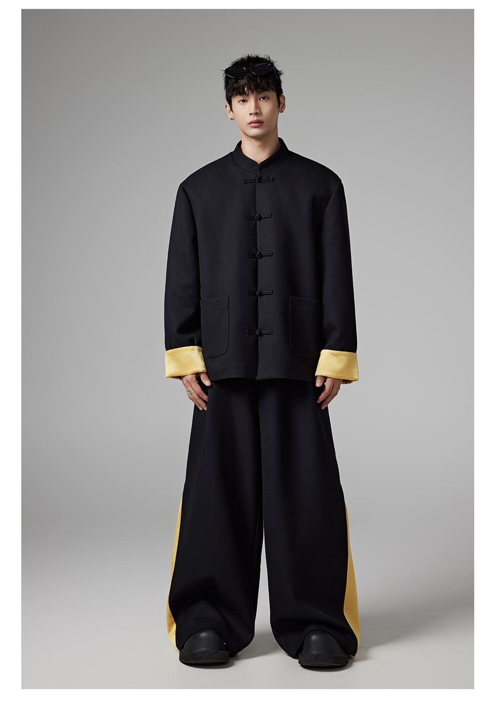 Patchwork Chinese-Style Oversize Jacket & Line Design Trousers Setup WN13322
