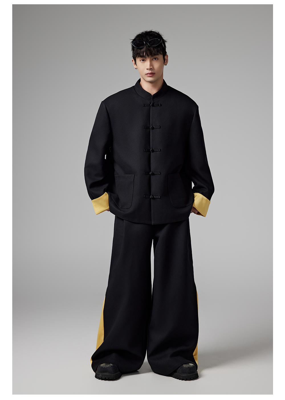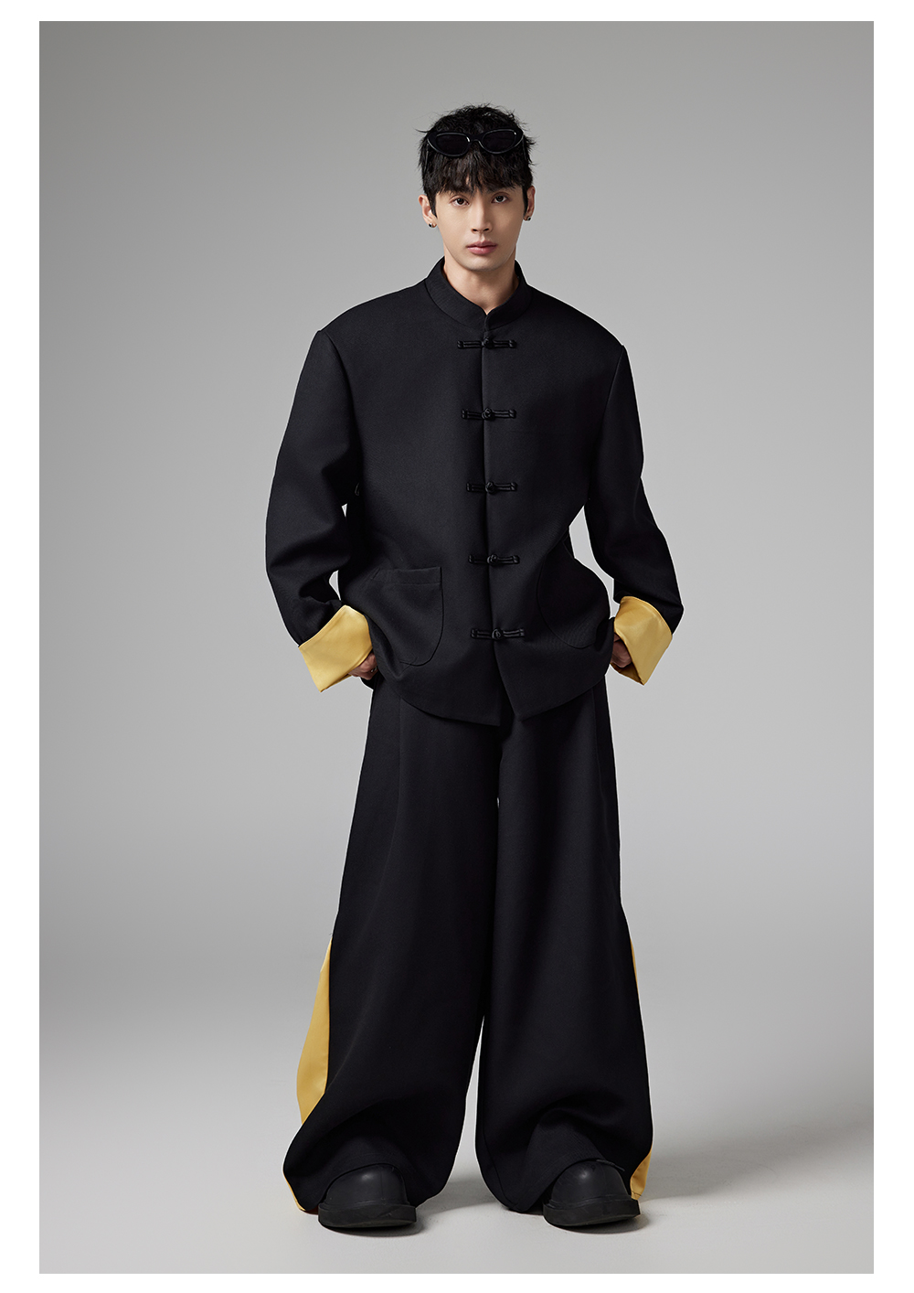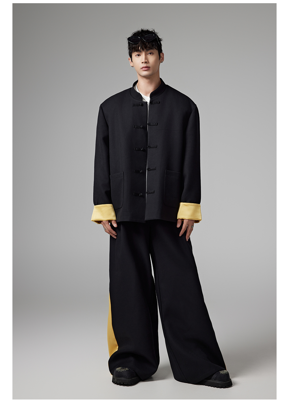 Patchwork Chinese-Style Oversize Jacket & Line Design Trousers Setup WN13322