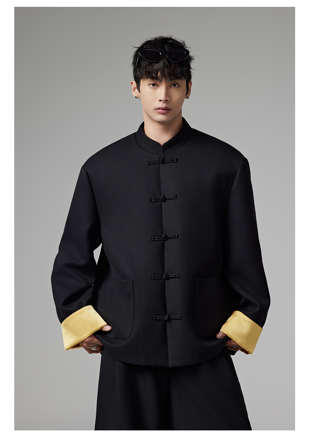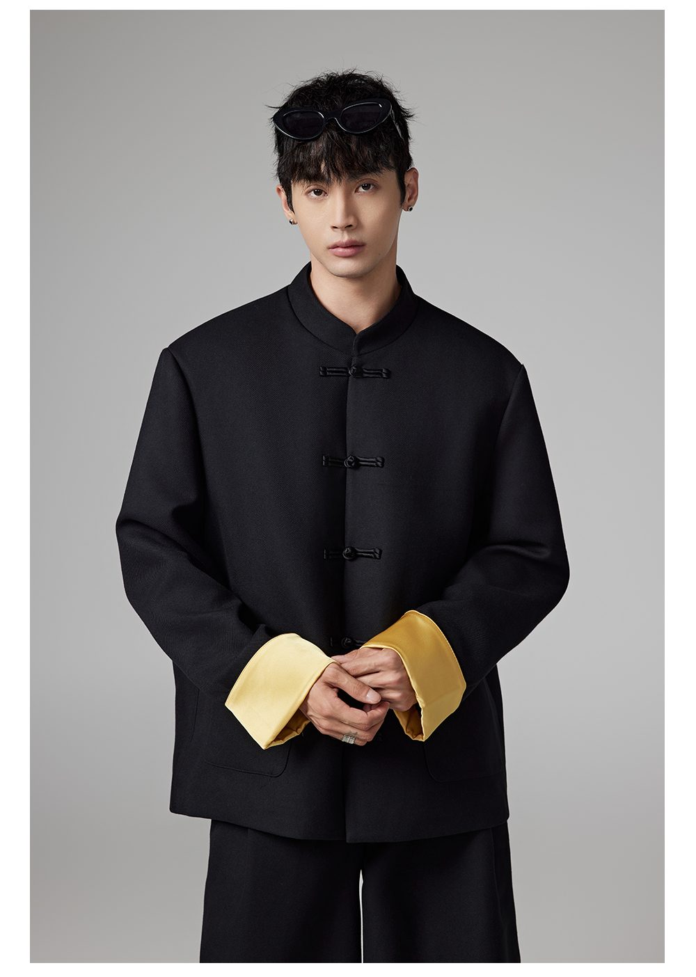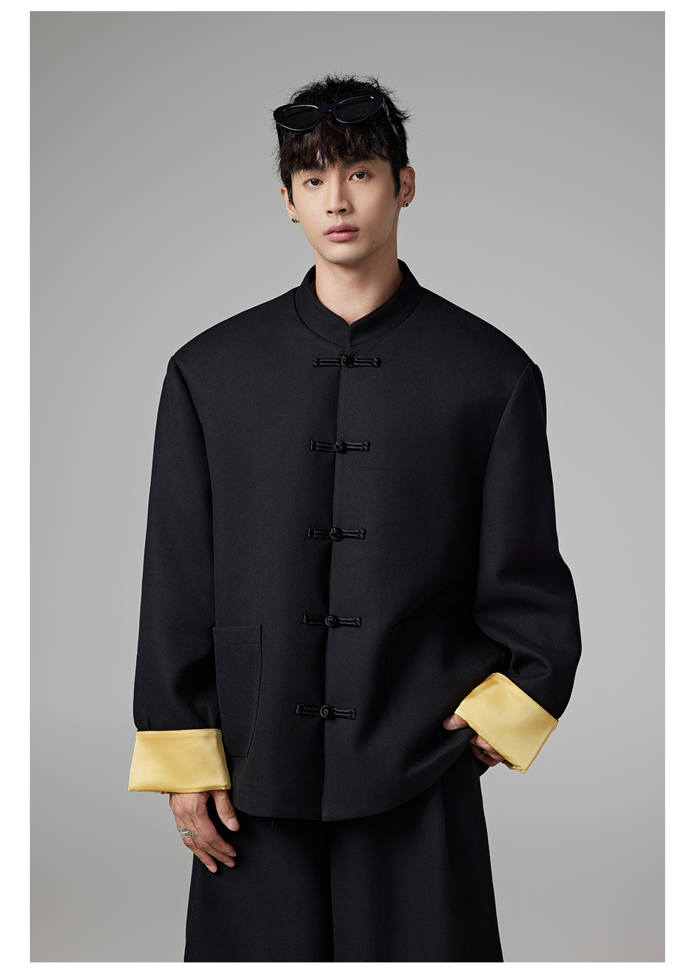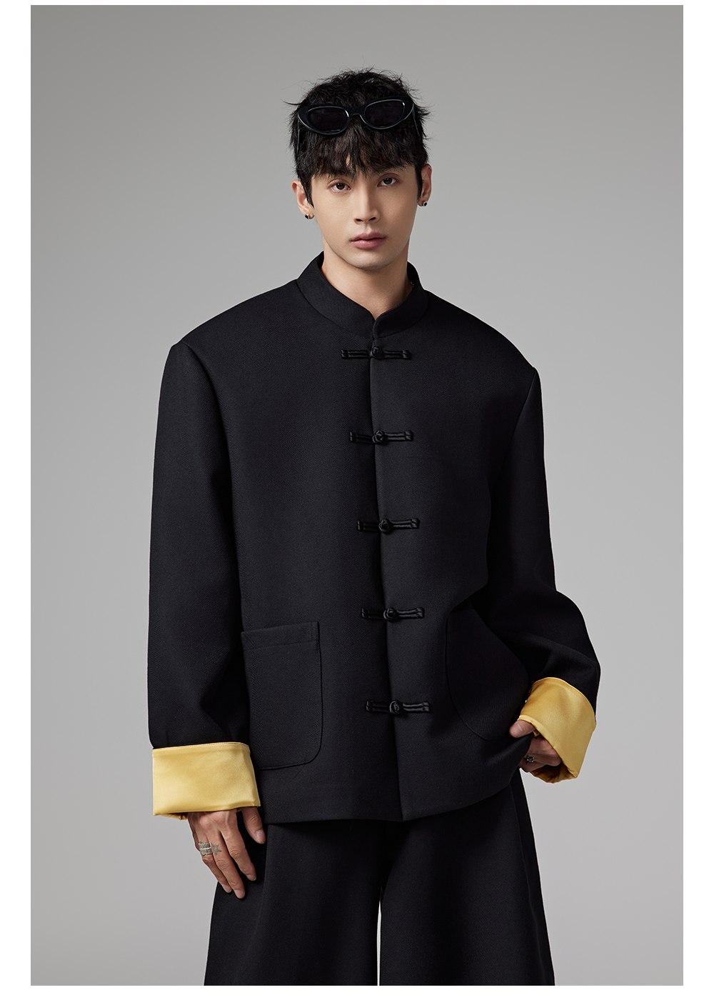 Patchwork Chinese-Style Oversize Jacket & Line Design Trousers Setup WN13322