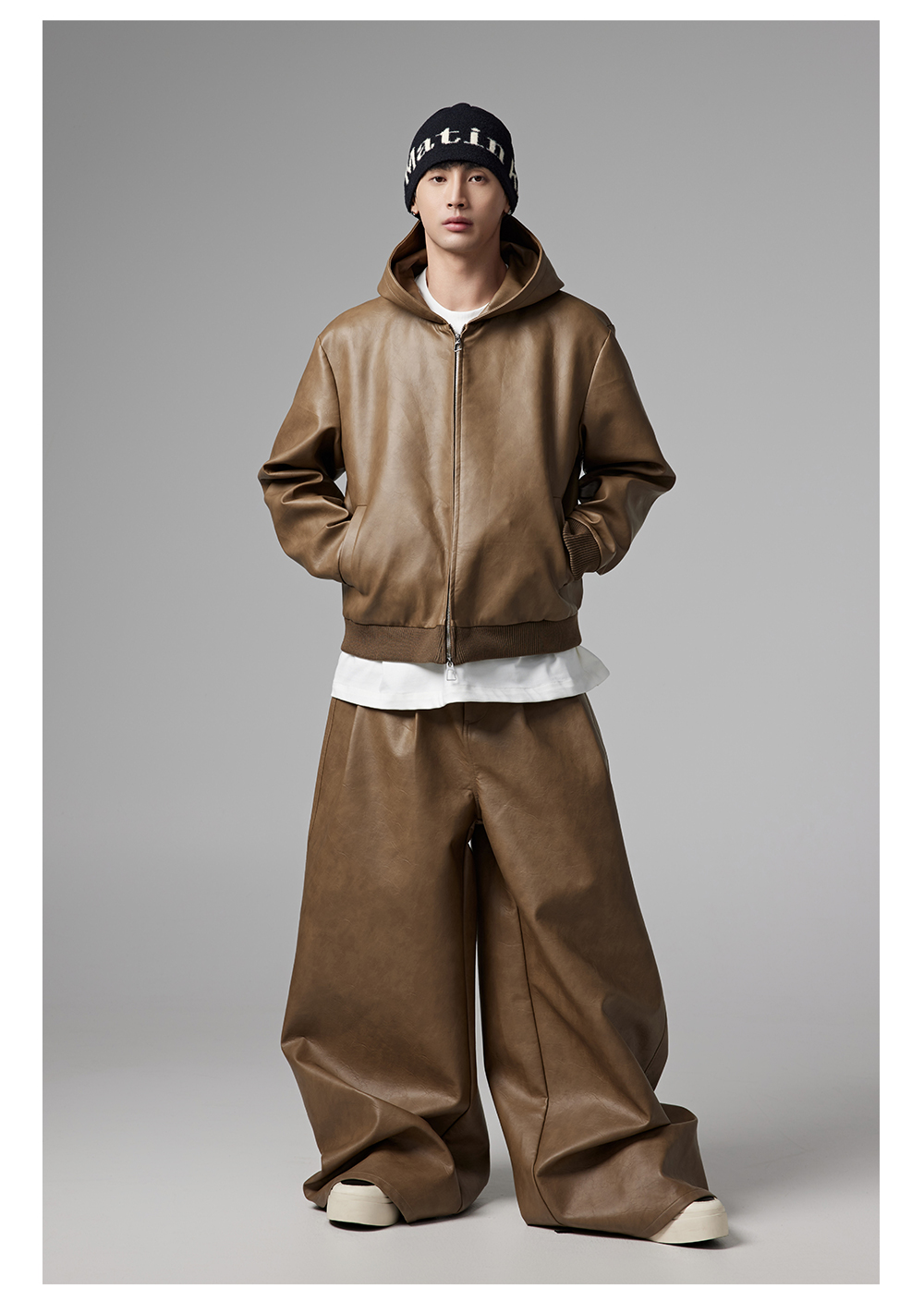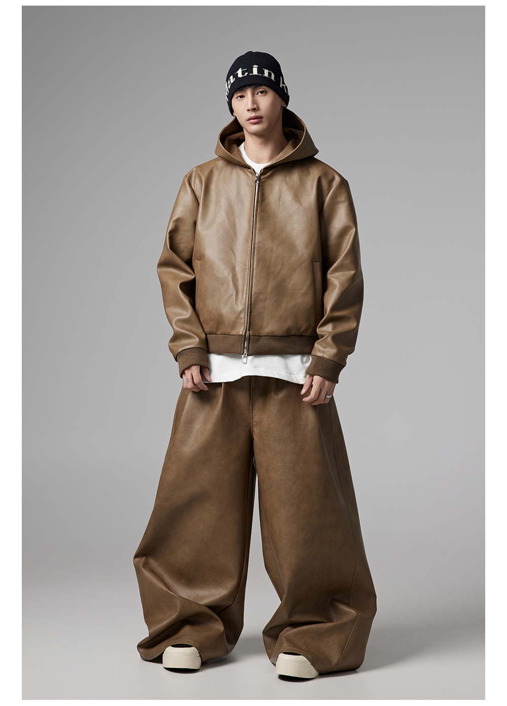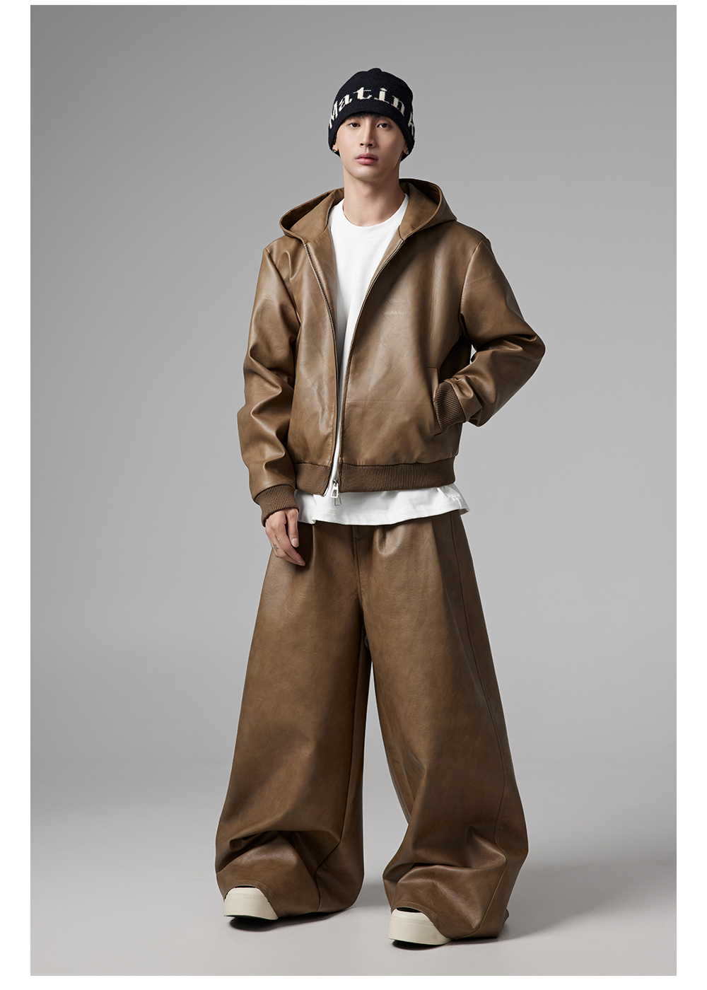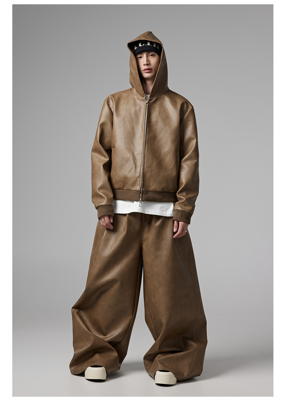 Short PU Leather Hooded Jacket & Wide-Leg PU Leather Pants Setup WN13341
